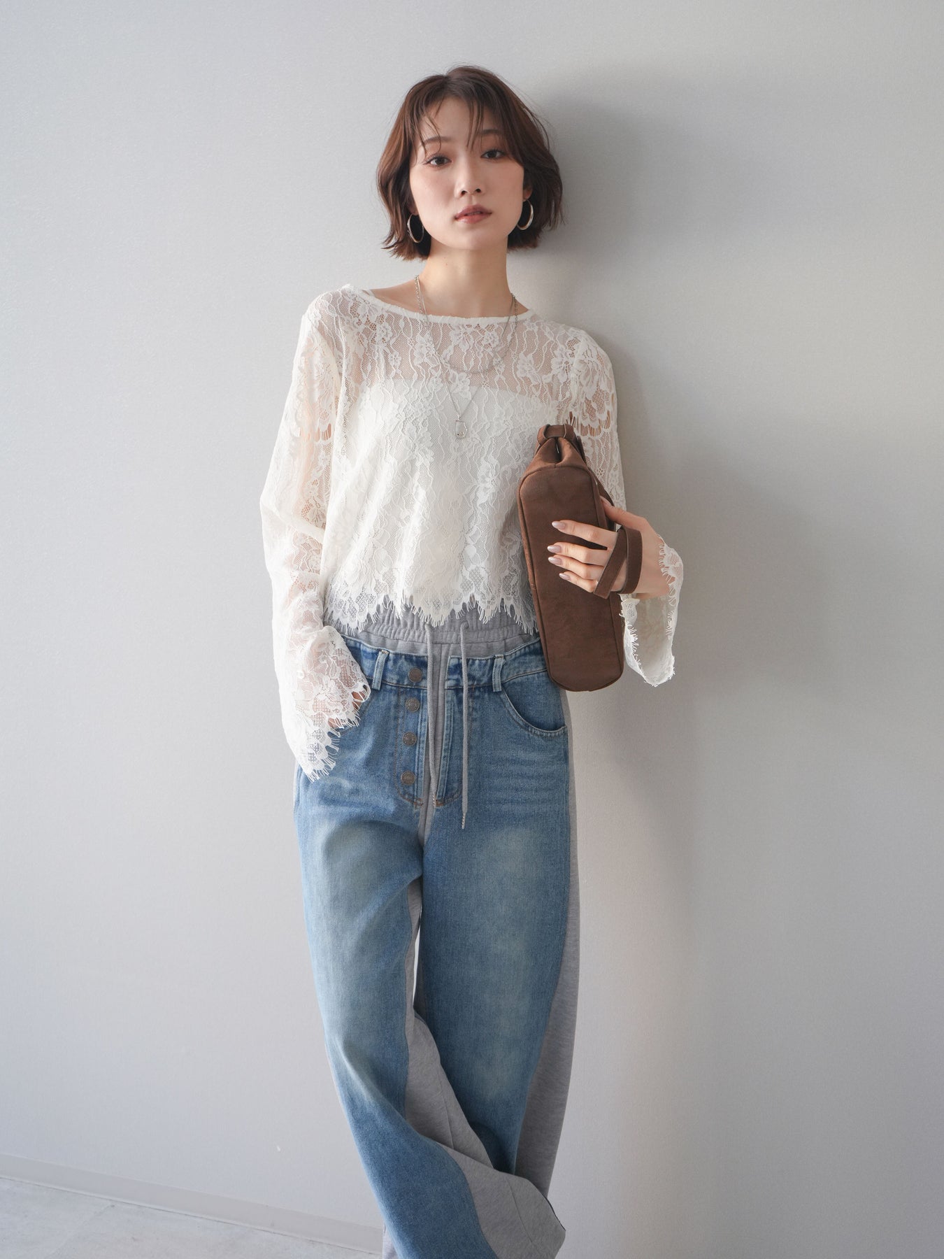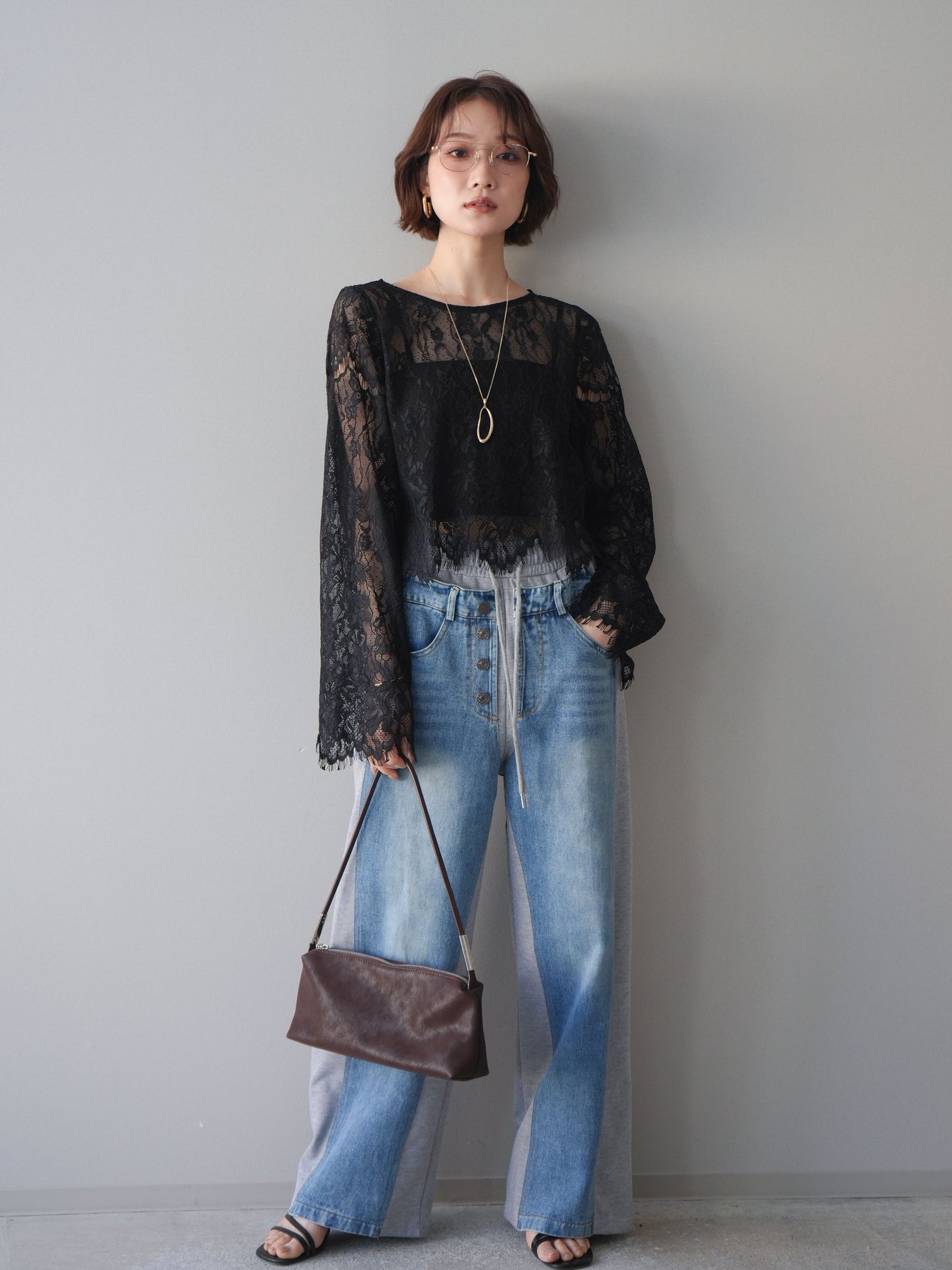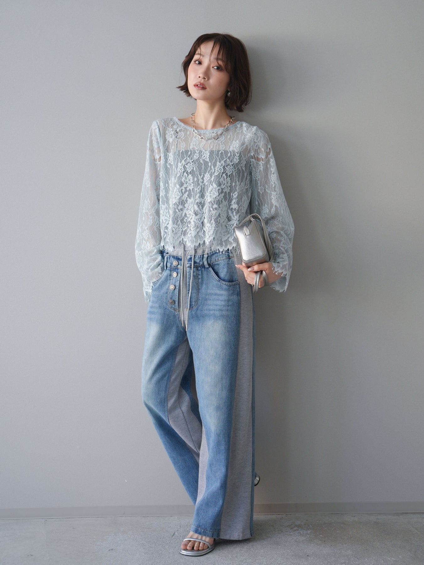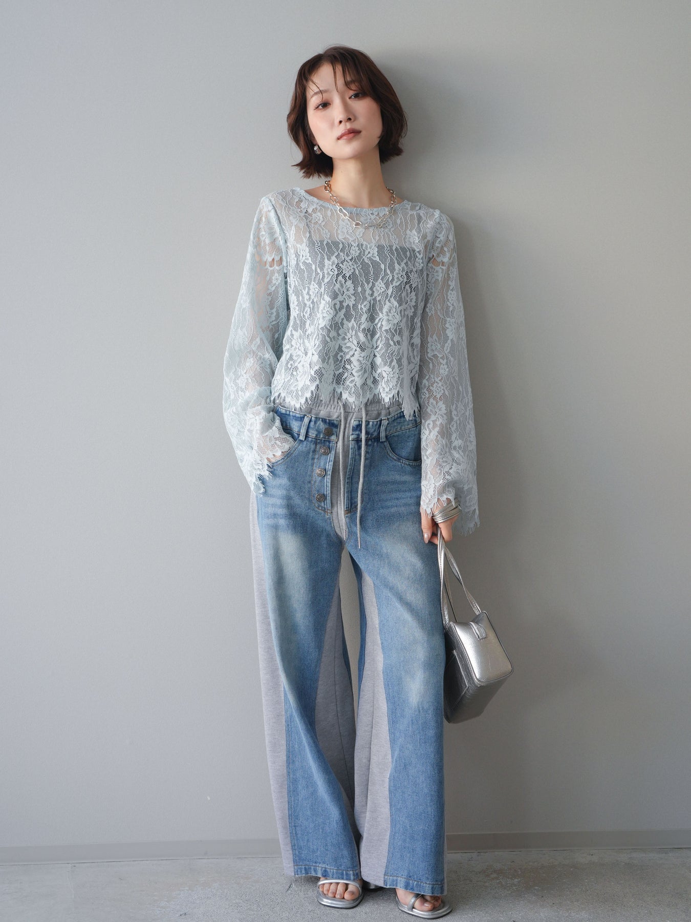 [SET]2WAYスリーブレーストップス+デニム切替スウェットパンツ(2set)