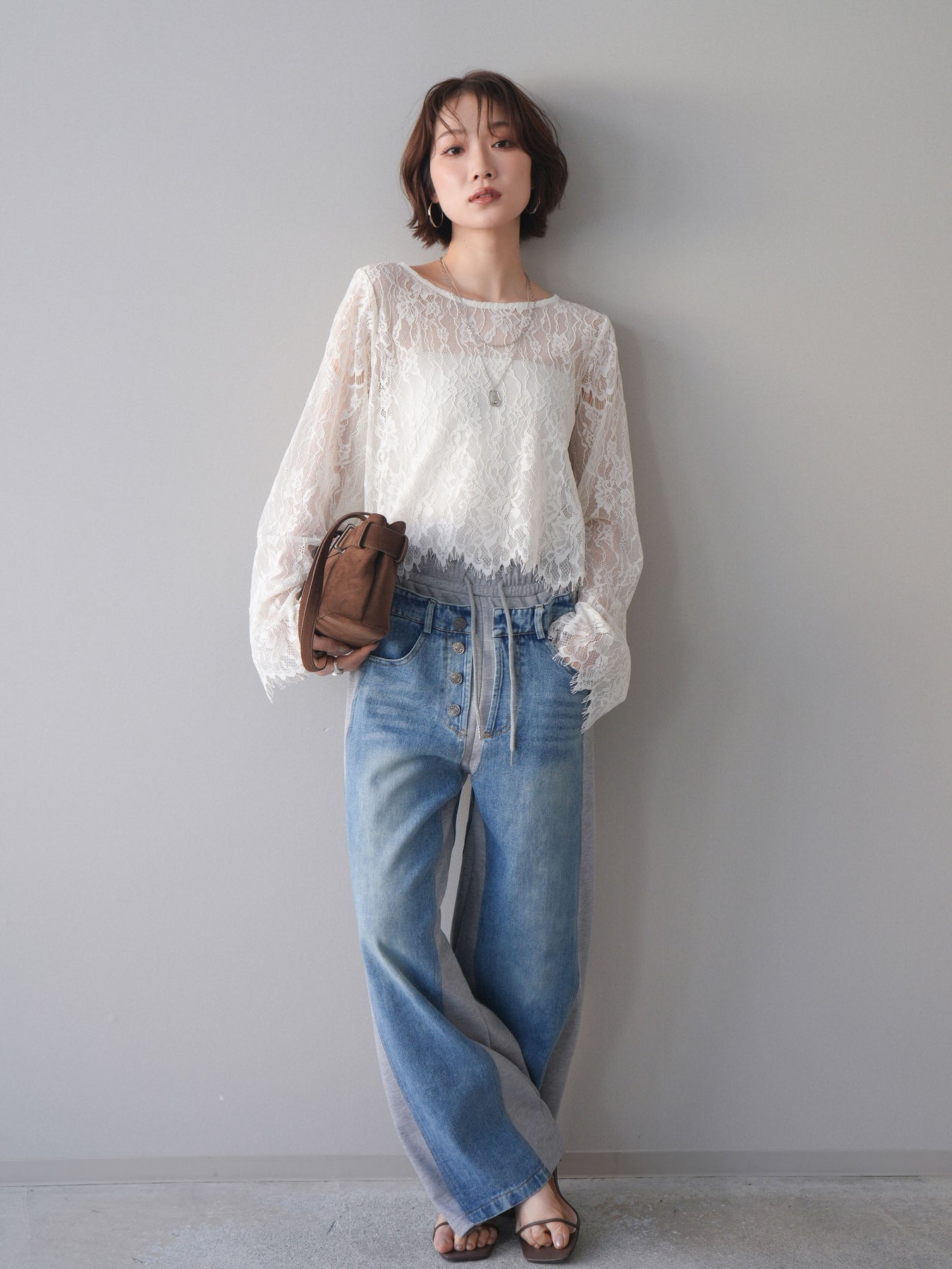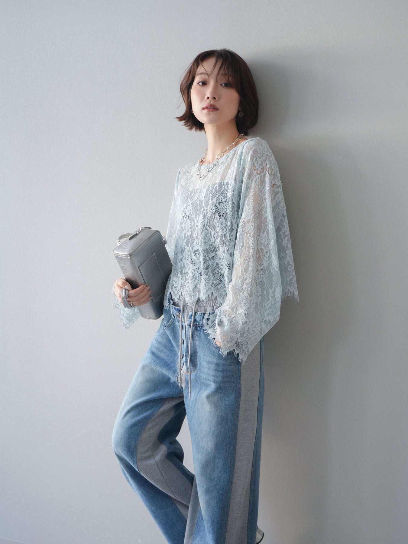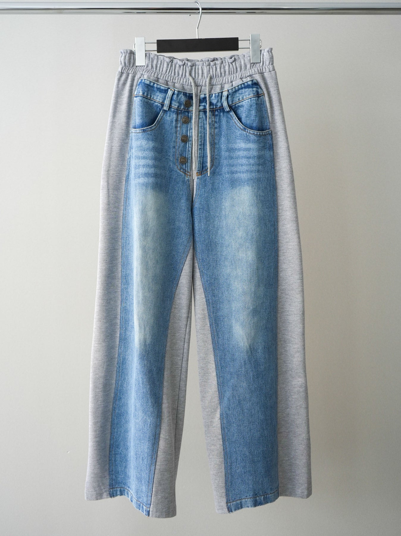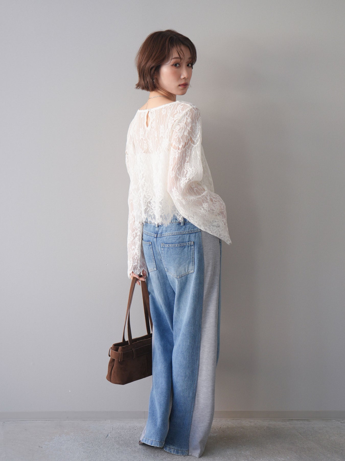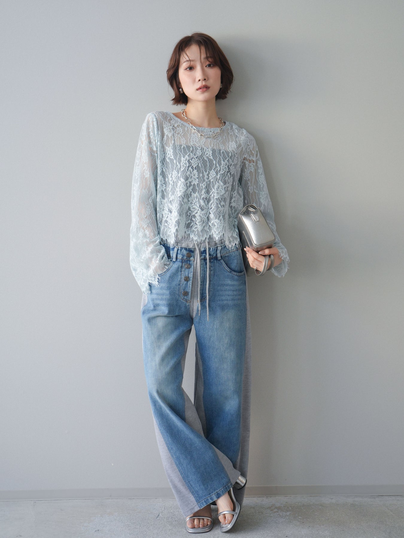 [SET]2WAYスリーブレーストップス+デニム切替スウェットパンツ(2set)