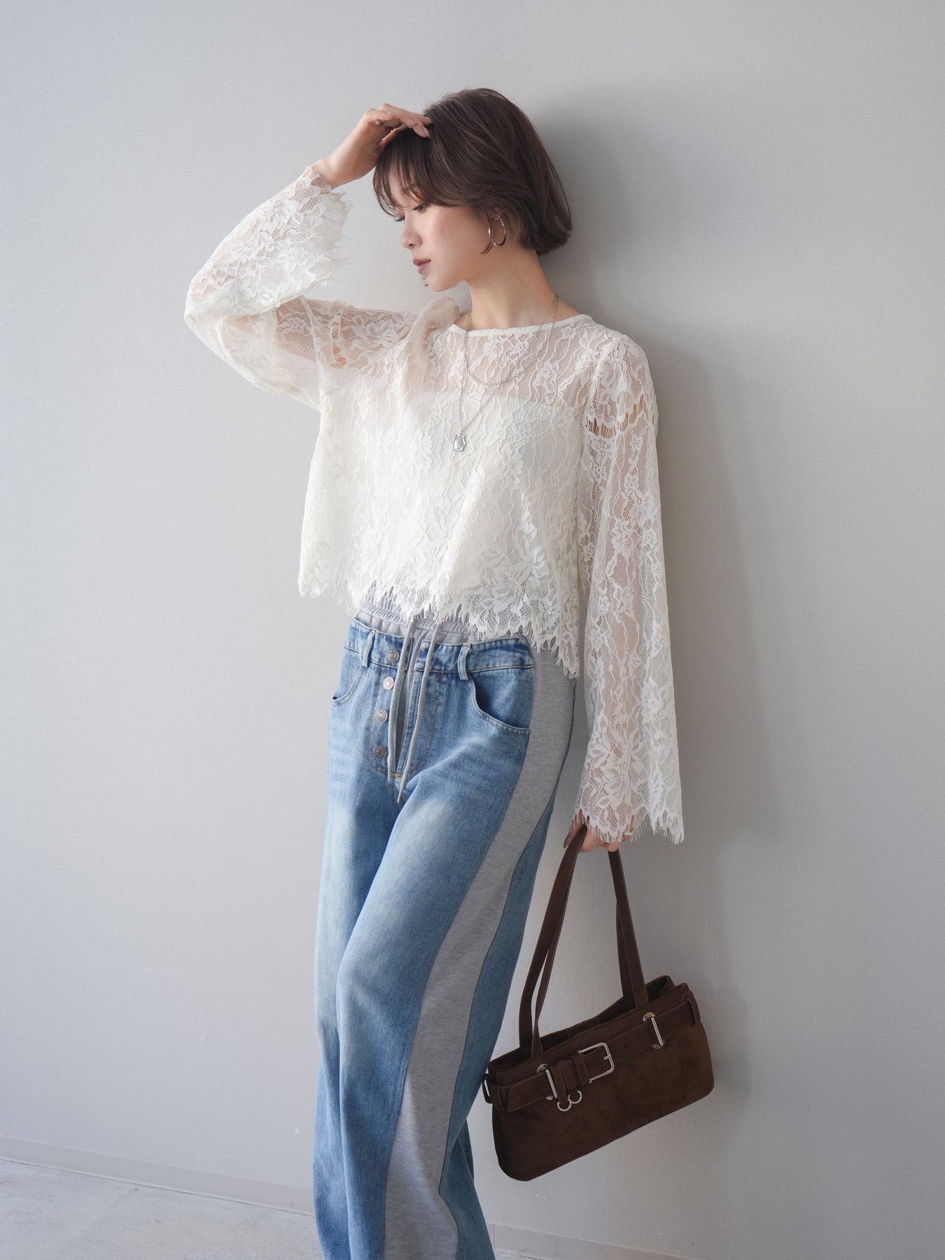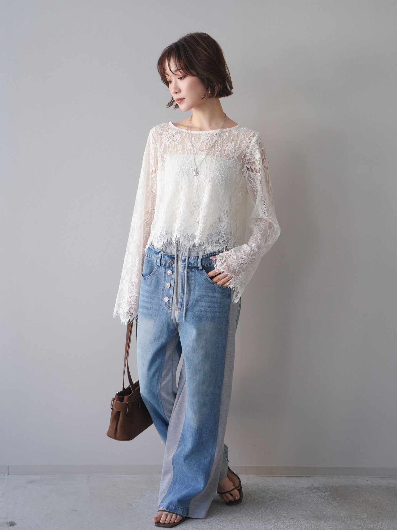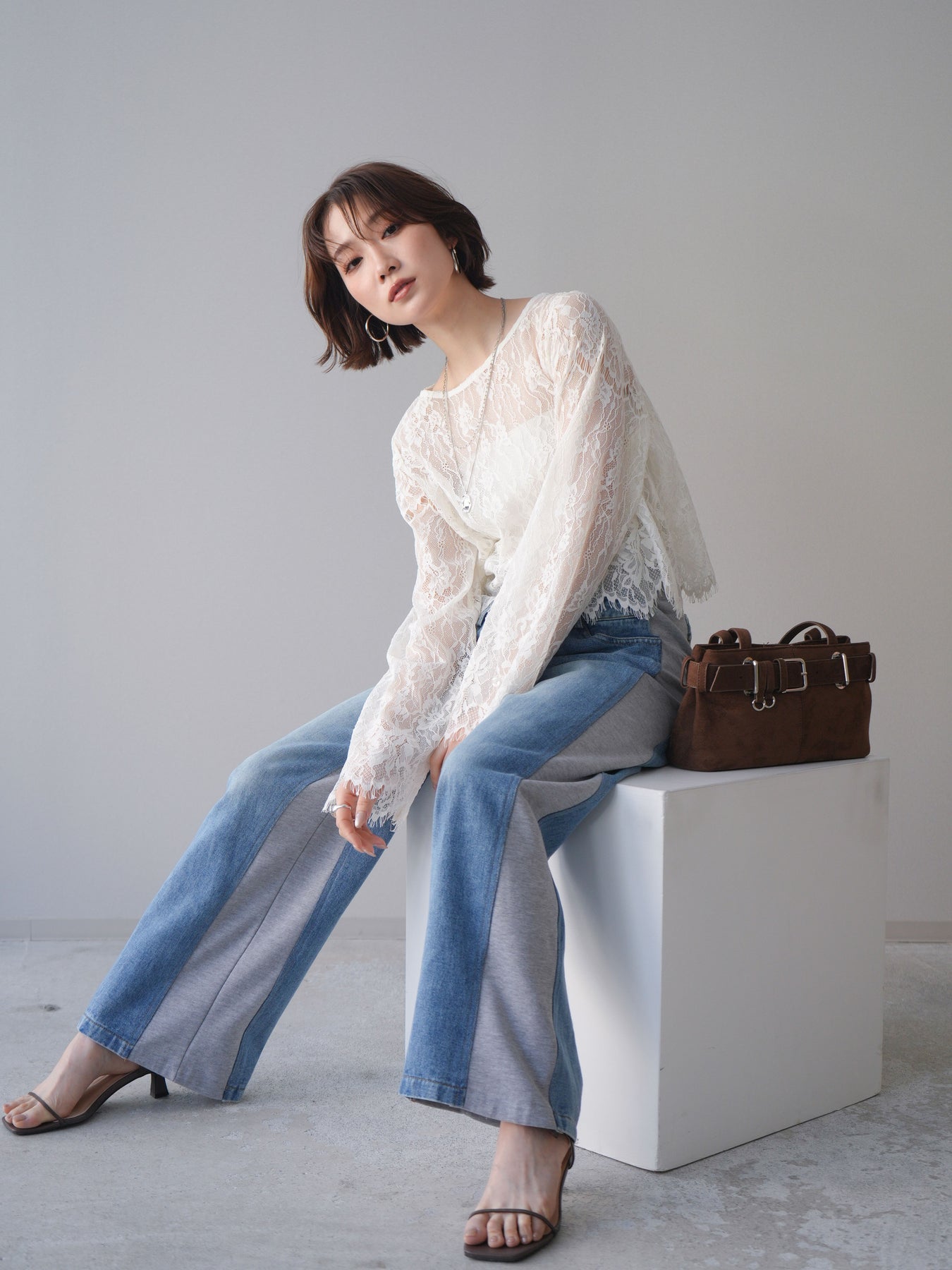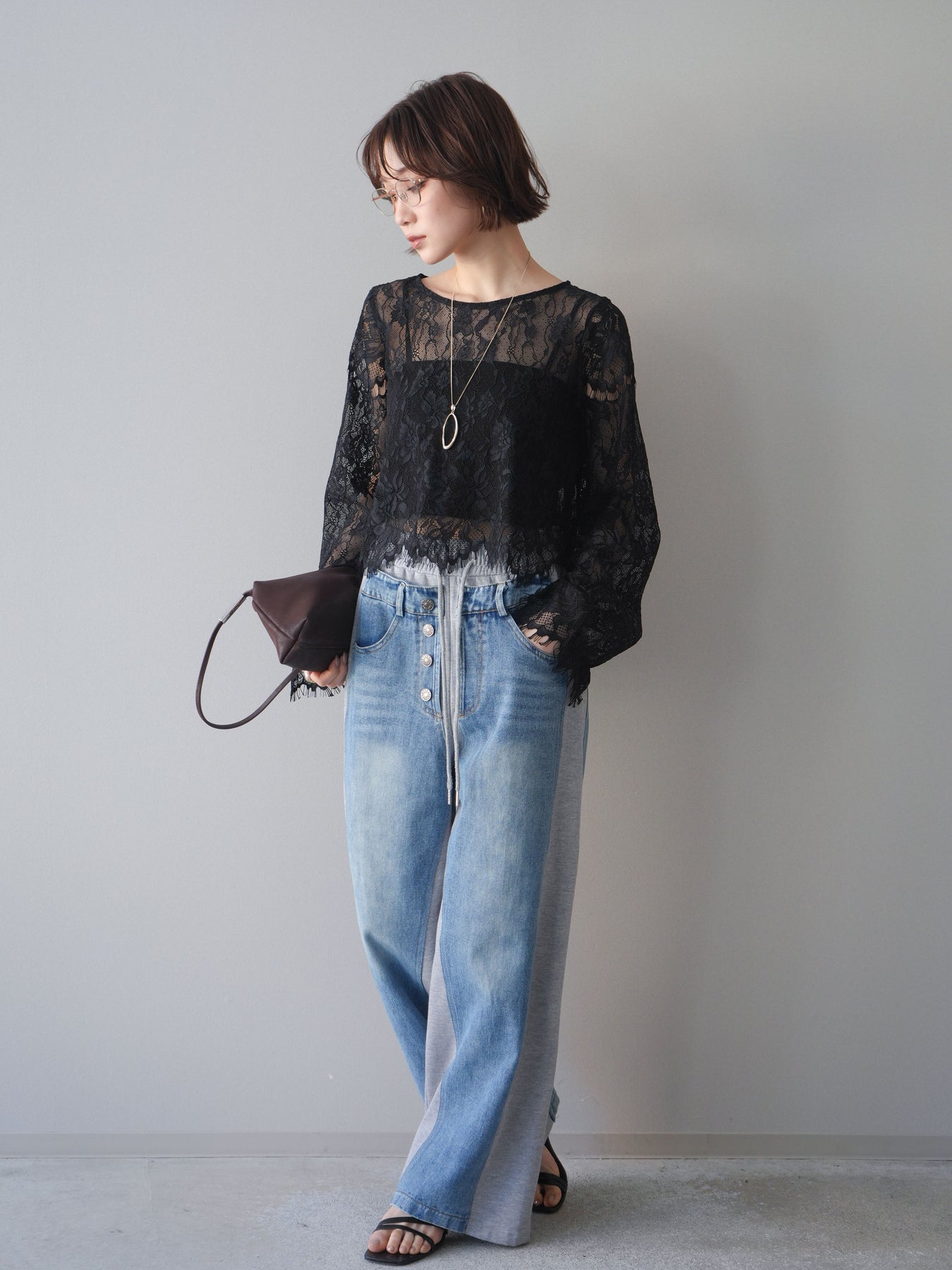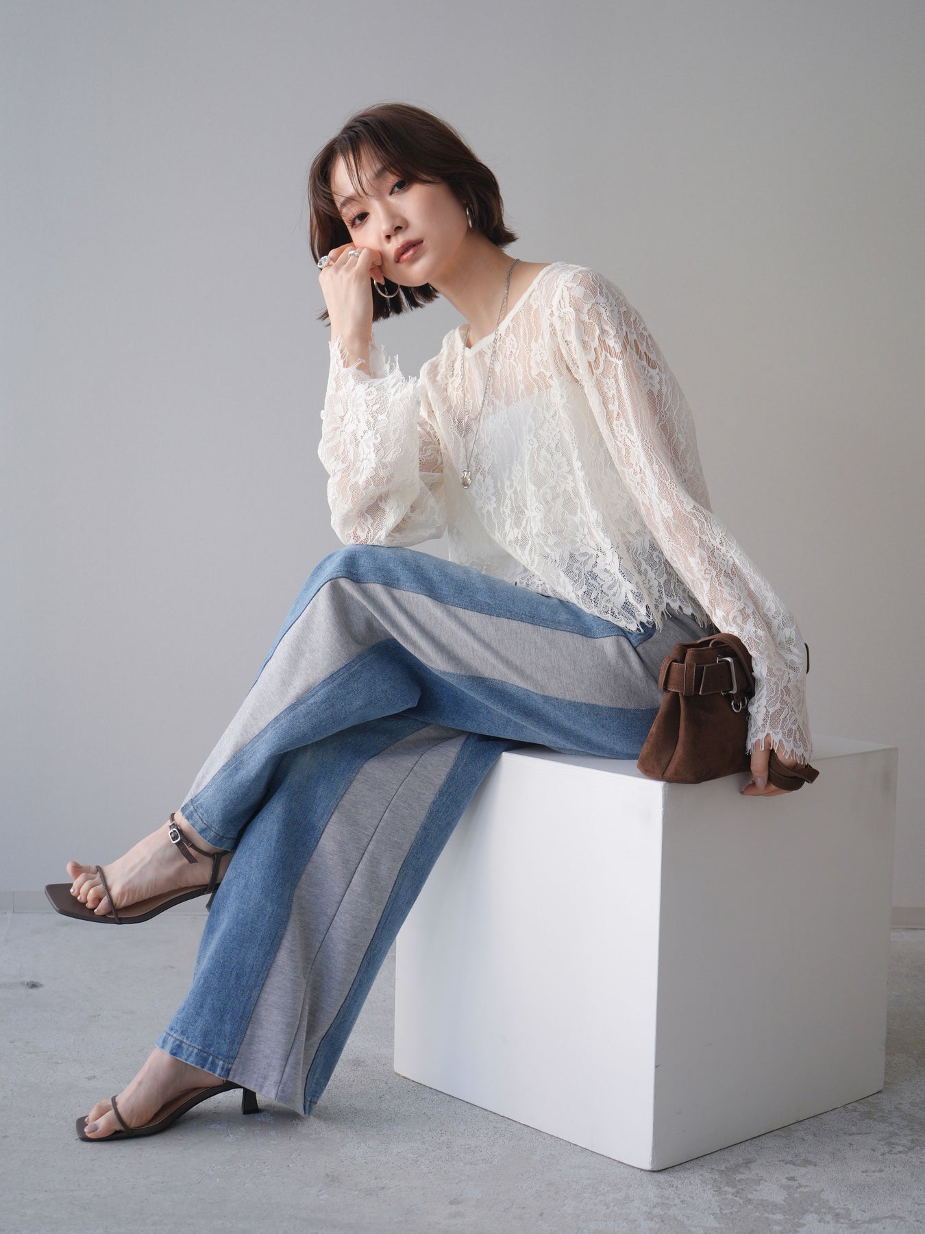 [SET]2WAYスリーブレーストップス+デニム切替スウェットパンツ(2set)