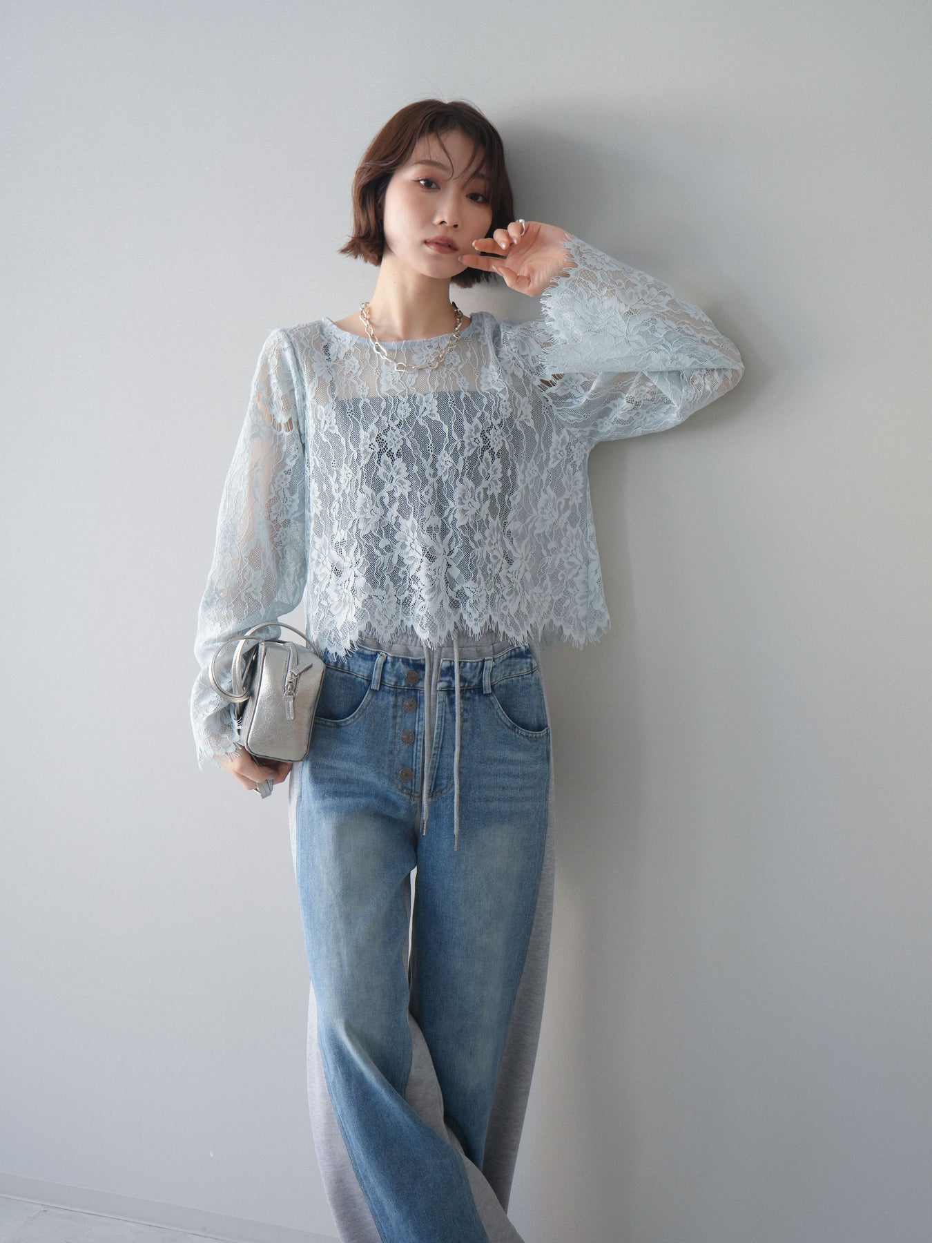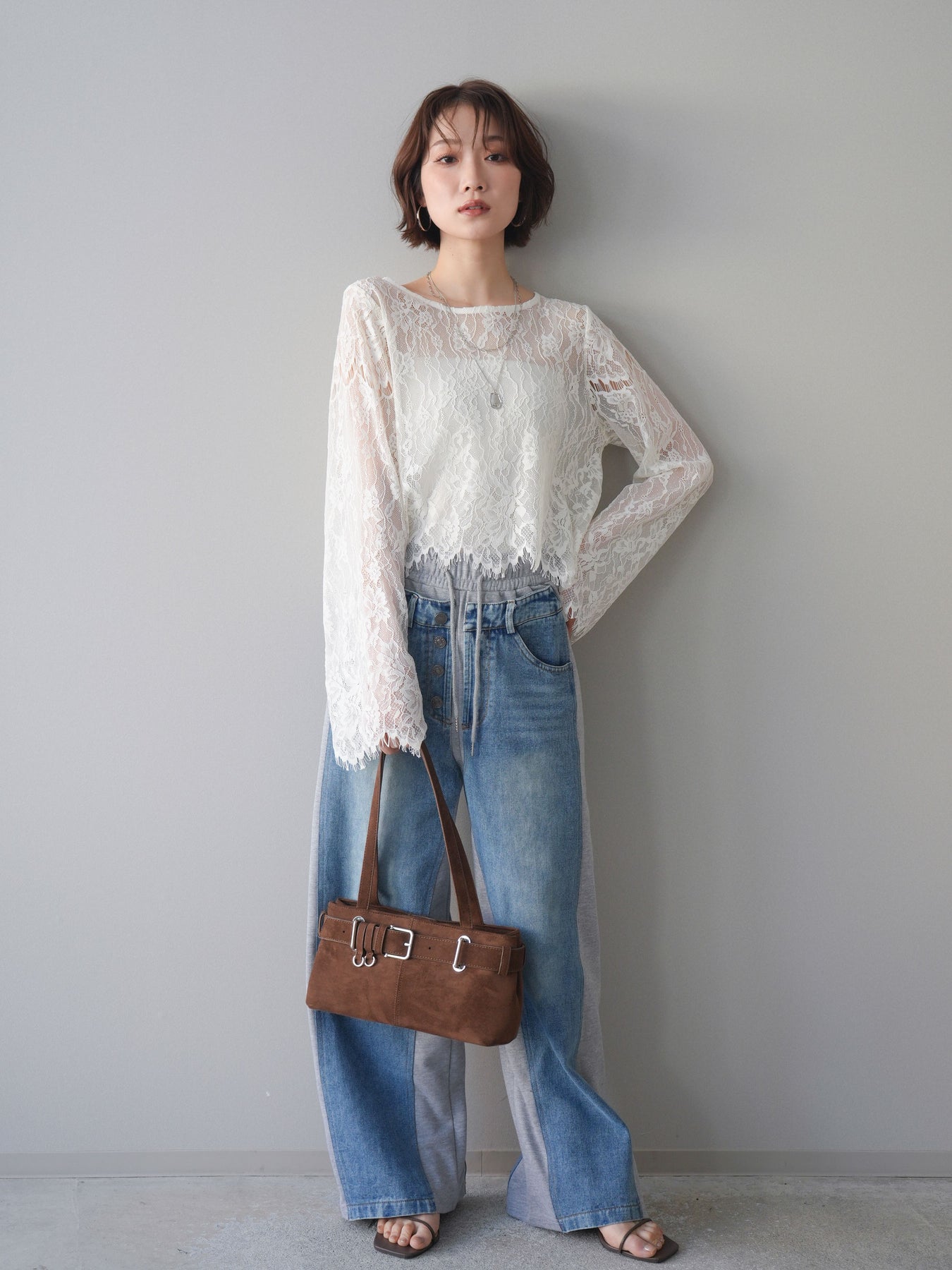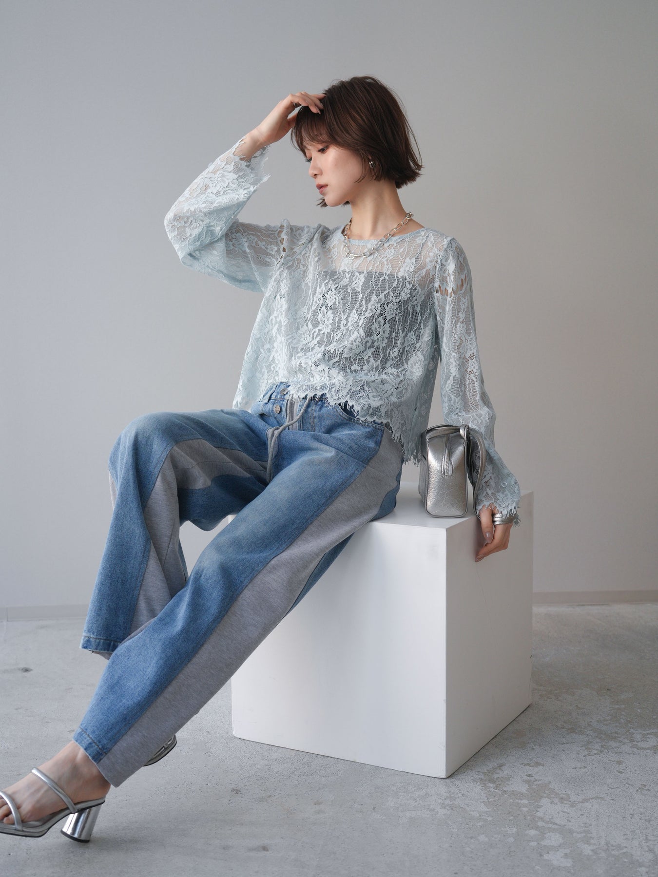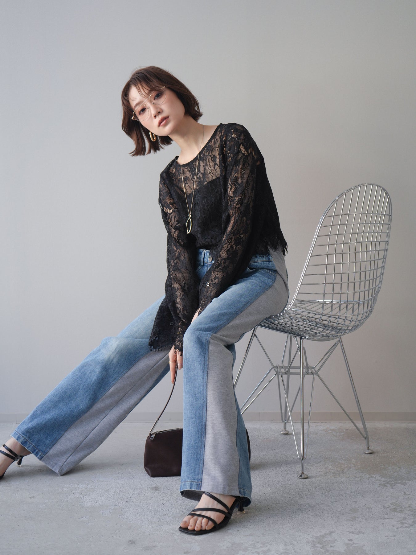 [SET]2WAYスリーブレーストップス+デニム切替スウェットパンツ(2set)