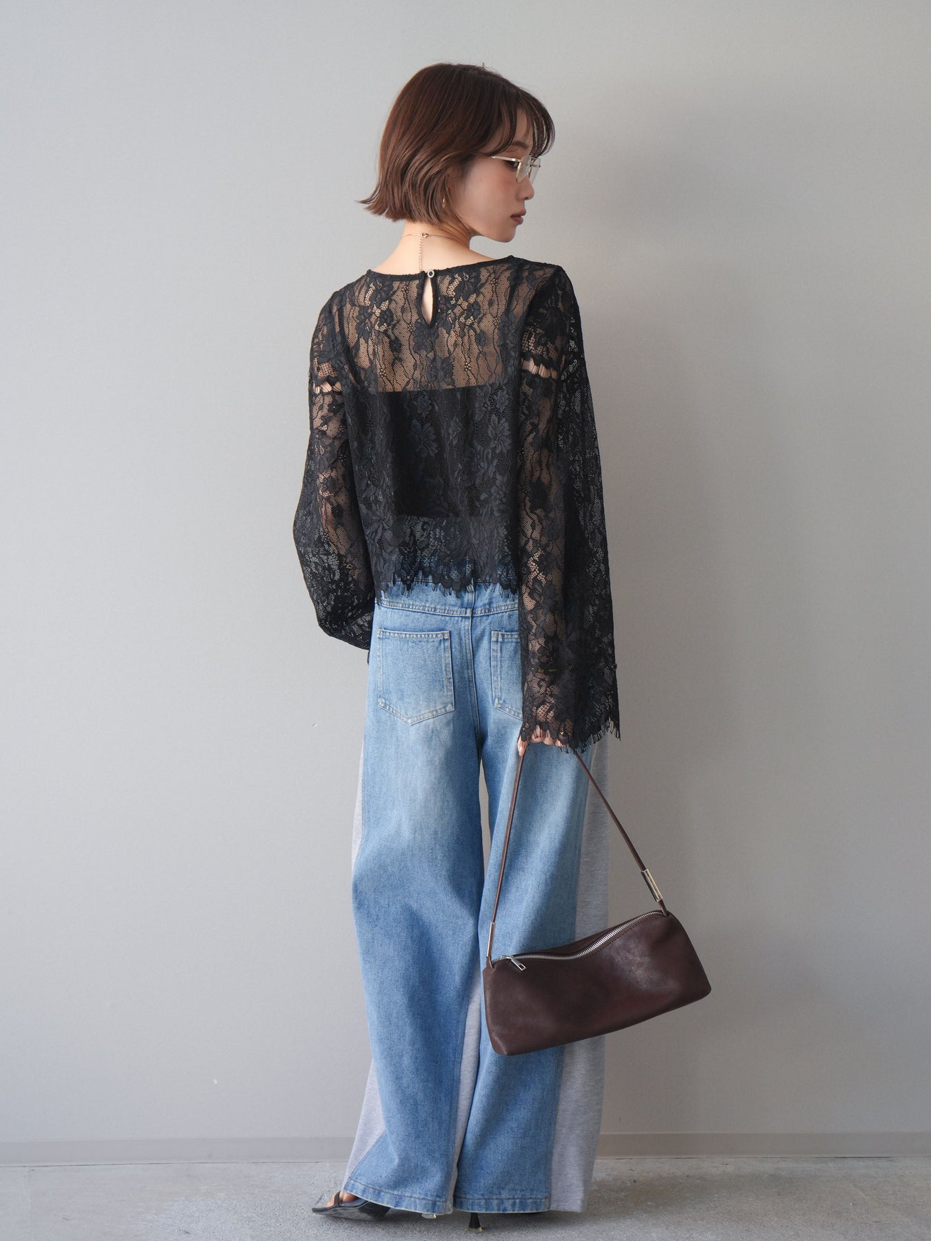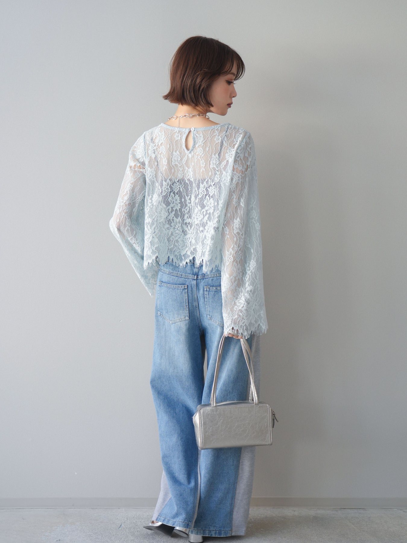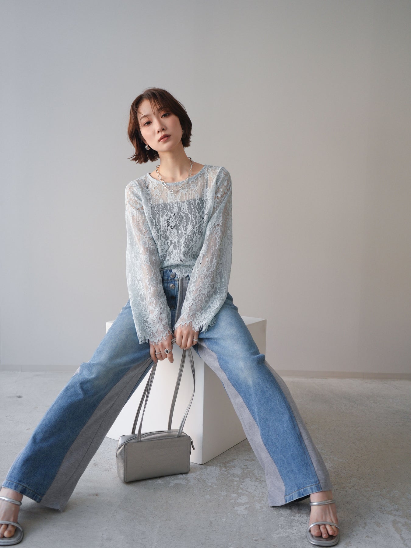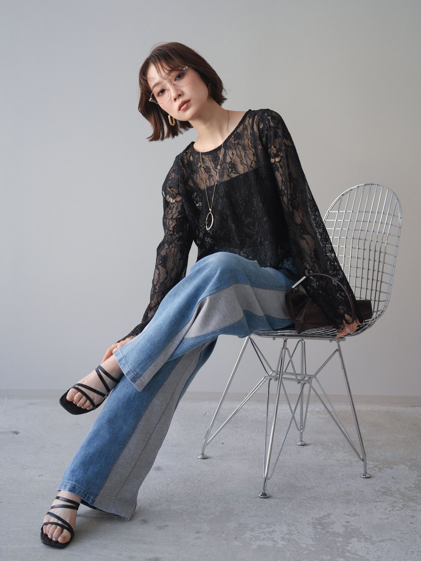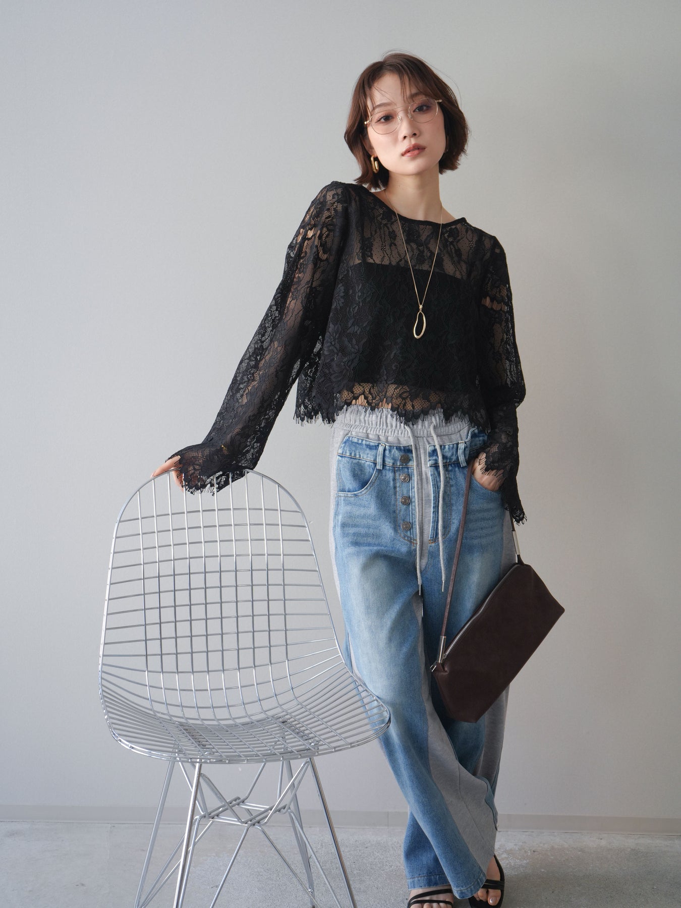 [SET]2WAYスリーブレーストップス+デニム切替スウェットパンツ(2set)