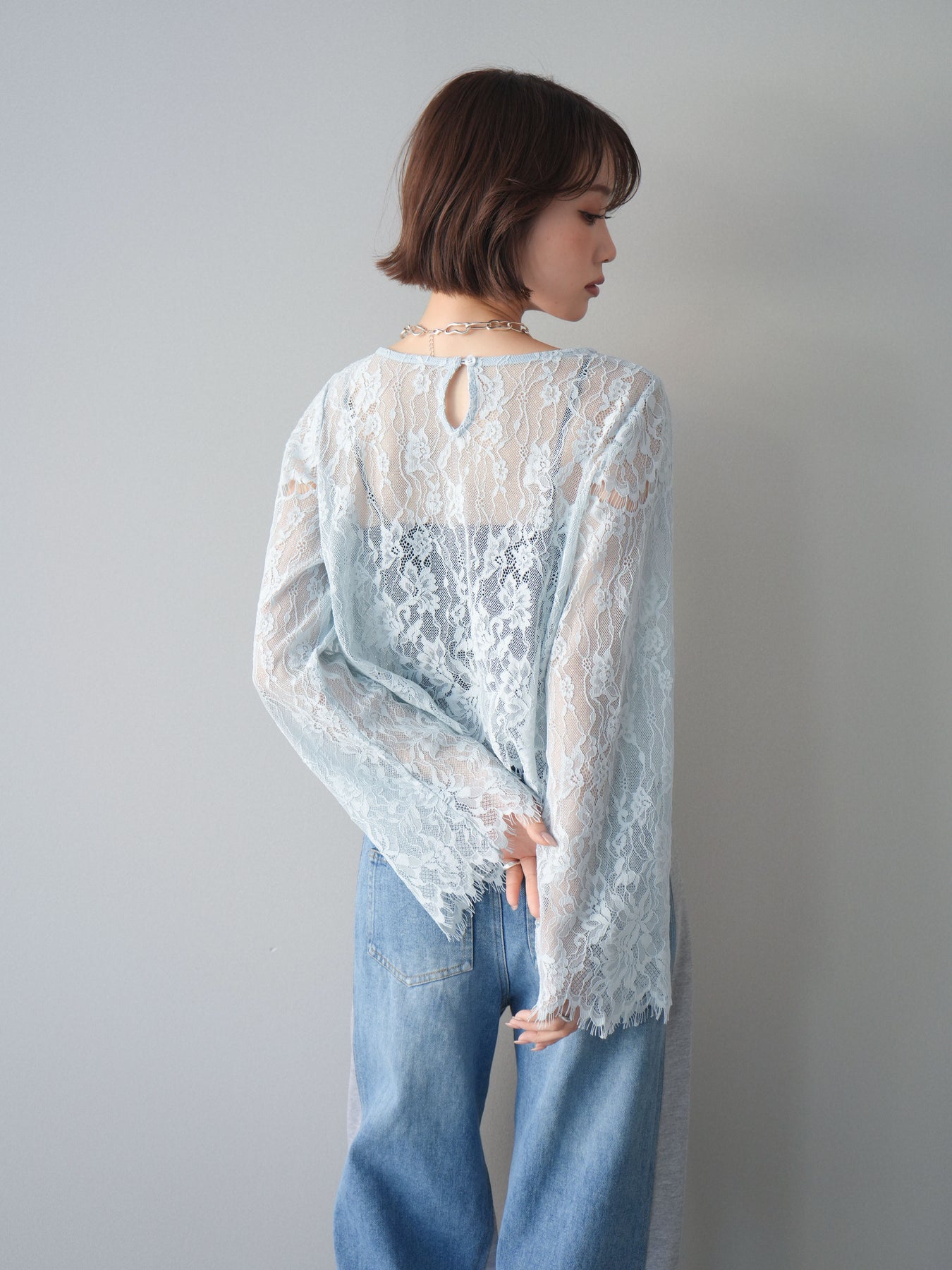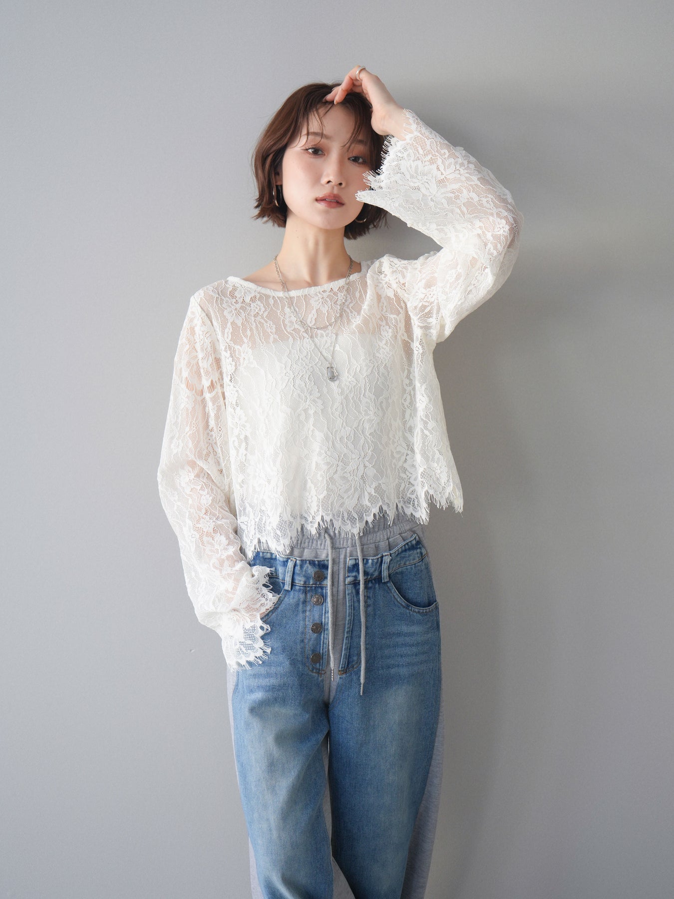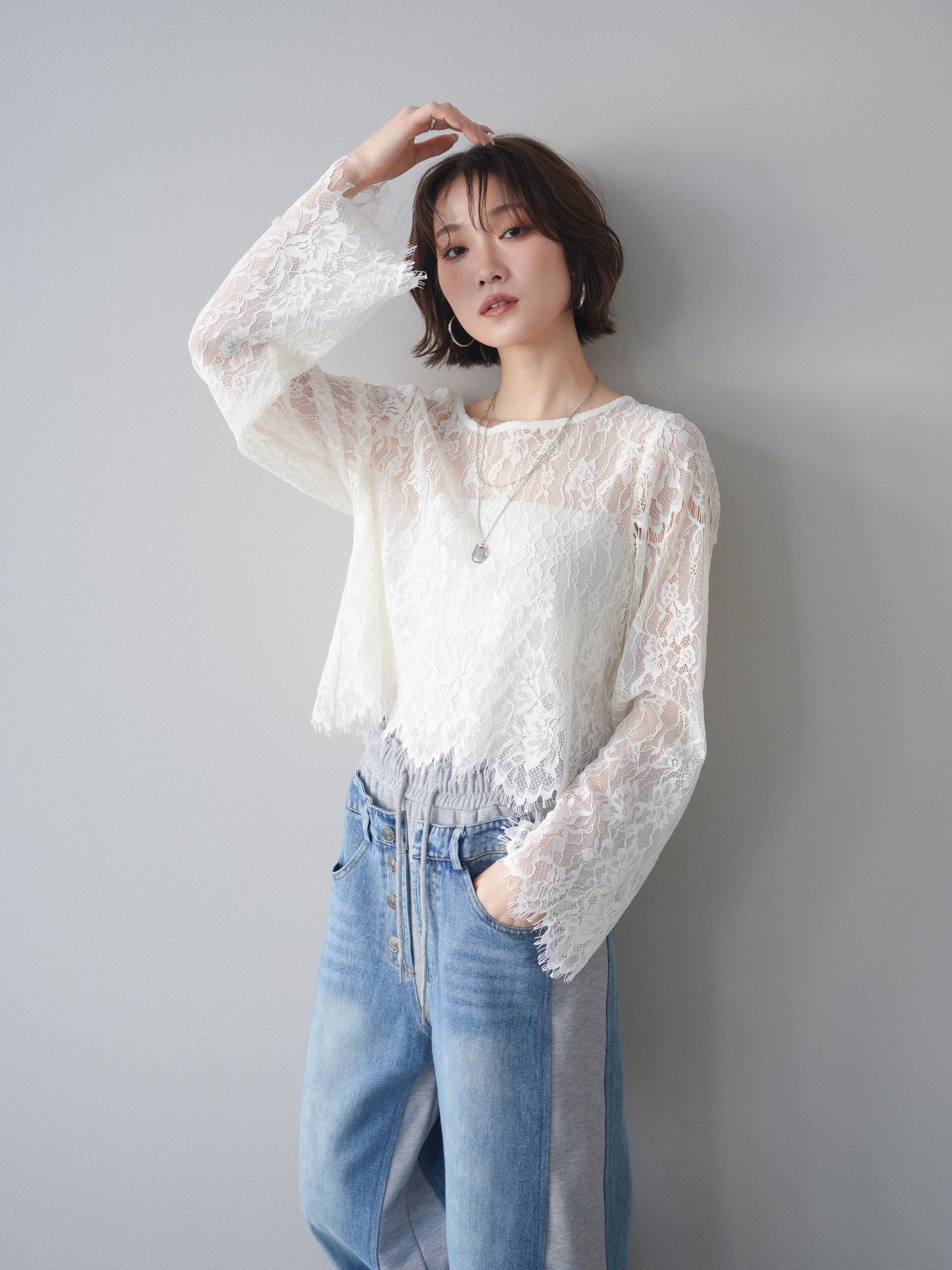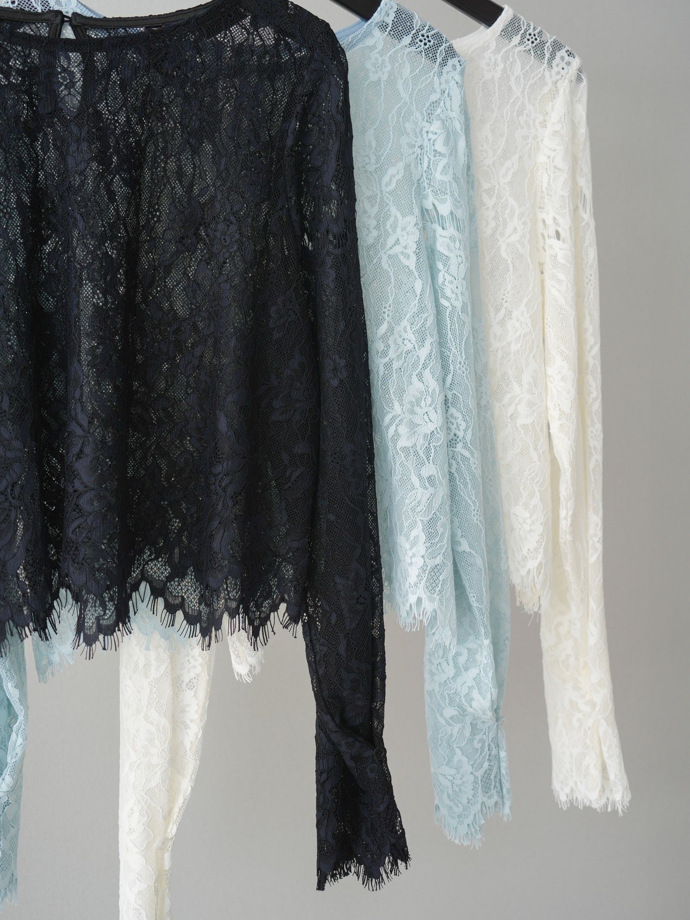 繊細な総レース素材が目を惹くロングスリーブトップス。透け感のある軽やかな風合いで、スタイリングに抜け感をプラスしてくれます。すっきりとしたシルエットでインナー使いにも重宝し、キャミソールやタンクトップを重ねてヘルシーに着こなすのもおすすめ。デニムやスラックス、ジャンパースカートのインナーなど、幅広いコーディネートに取り入れやすい一枚です。 ※ボトムス、キャミソール(インナー)以外の商品は一律でインナーは付属していません