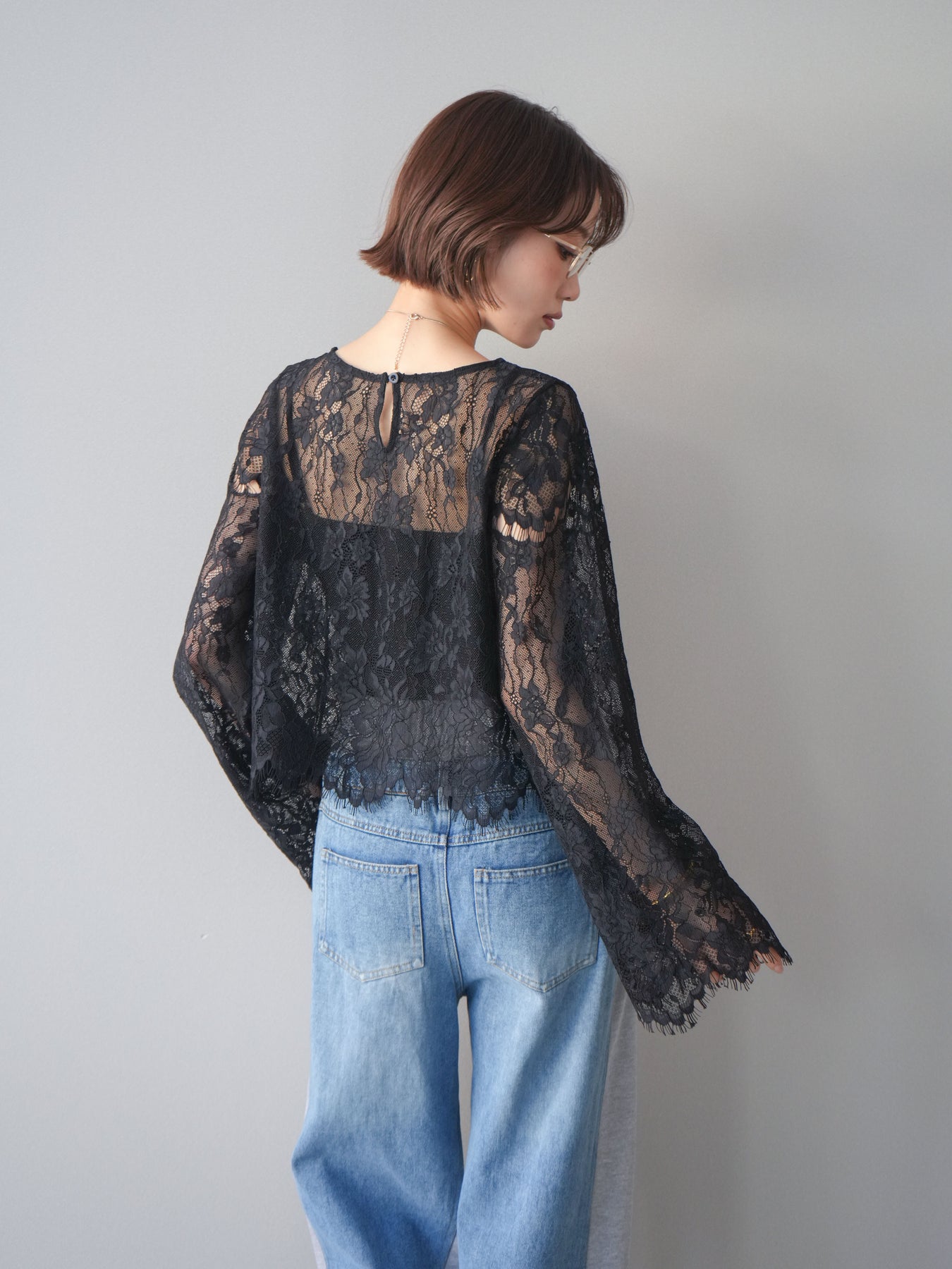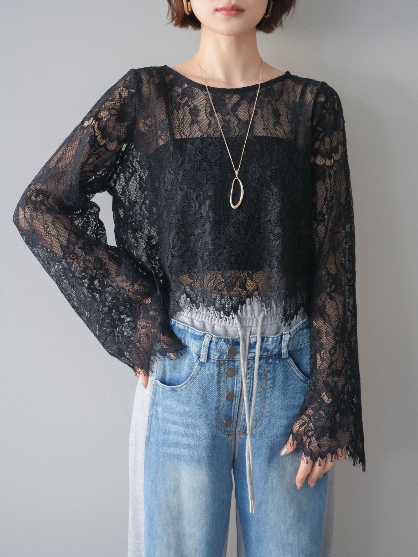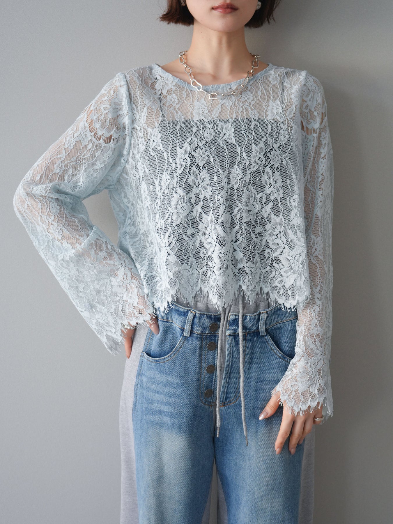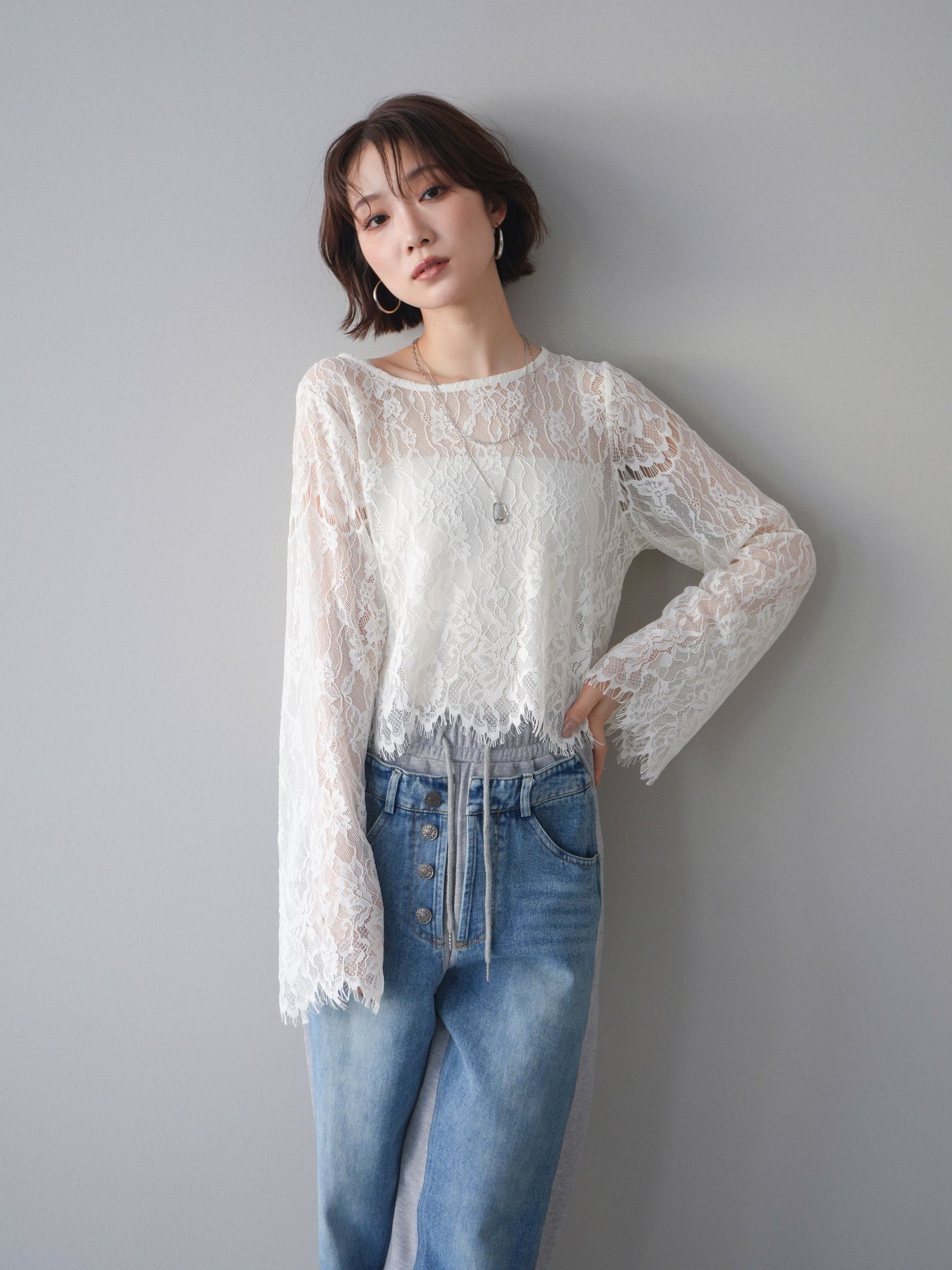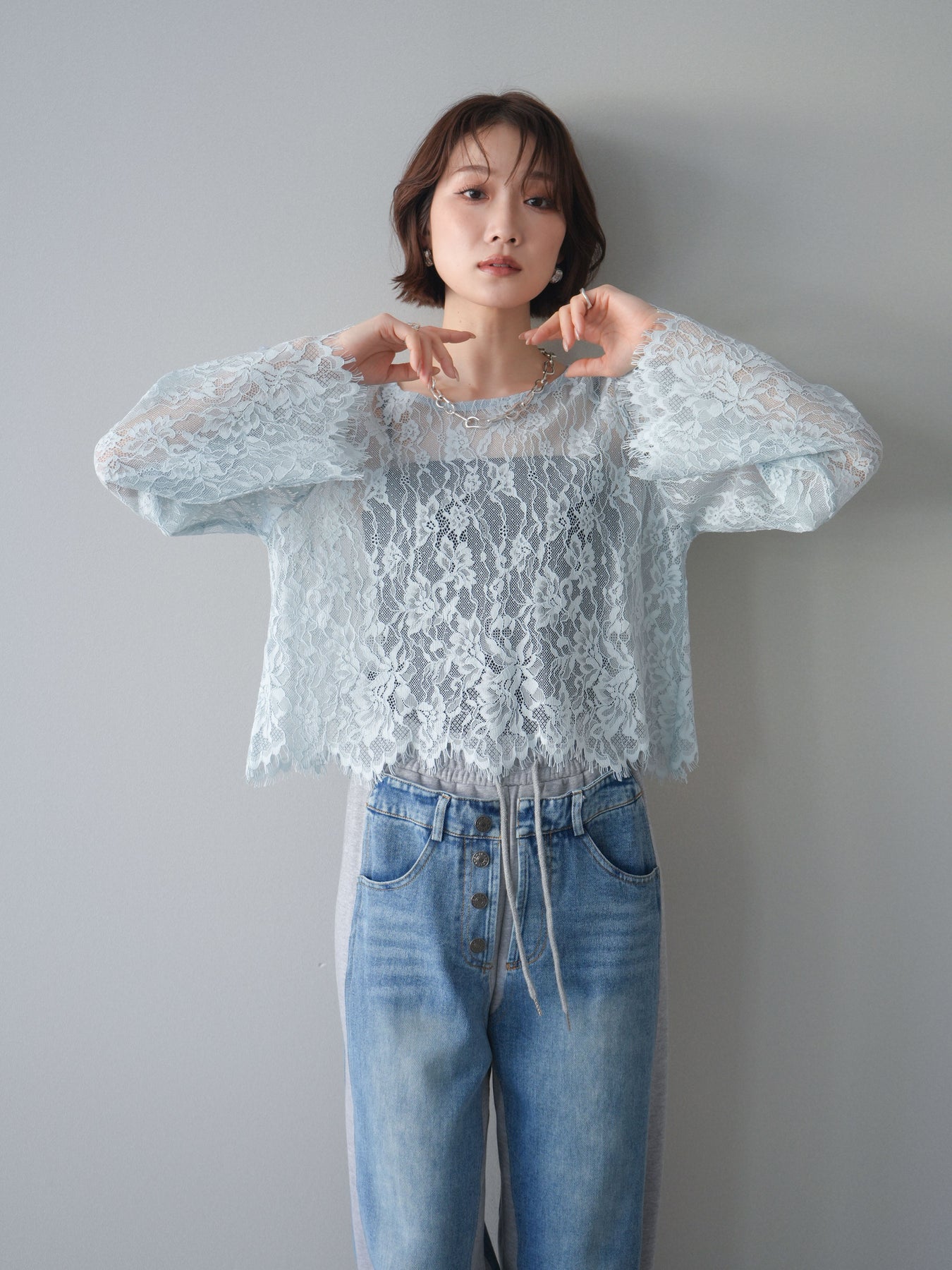 繊細な総レース素材が目を惹くロングスリーブトップス。透け感のある軽やかな風合いで、スタイリングに抜け感をプラスしてくれます。すっきりとしたシルエットでインナー使いにも重宝し、キャミソールやタンクトップを重ねてヘルシーに着こなすのもおすすめ。デニムやスラックス、ジャンパースカートのインナーなど、幅広いコーディネートに取り入れやすい一枚です。 ※ボトムス、キャミソール(インナー)以外の商品は一律でインナーは付属していません