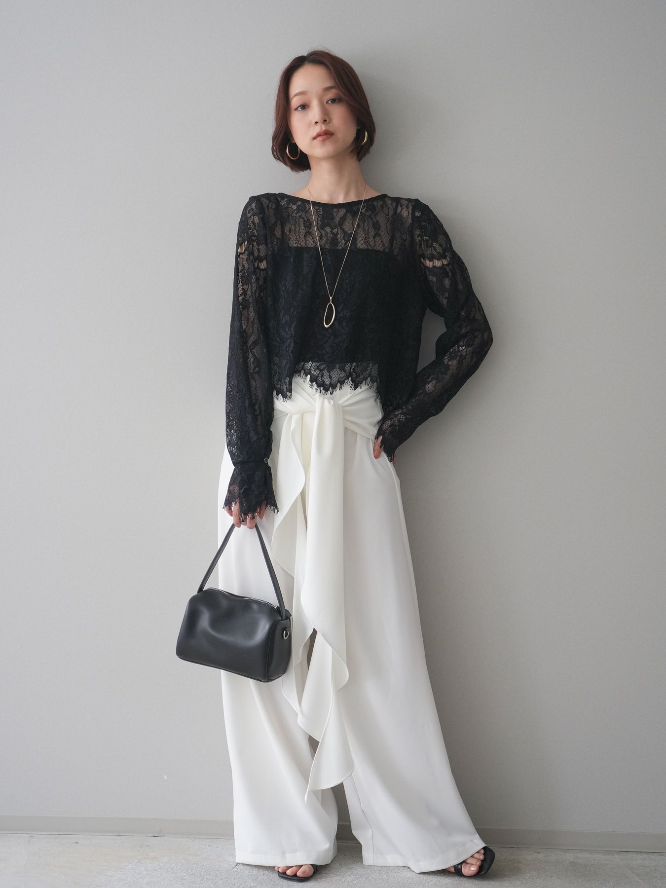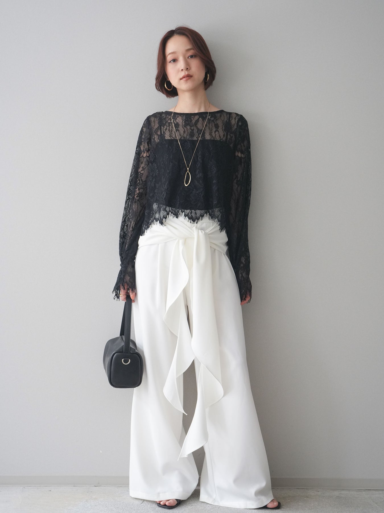[SET]2WAYスリーブレーストップス+ラッフルベルトワイドパンツ(2set)