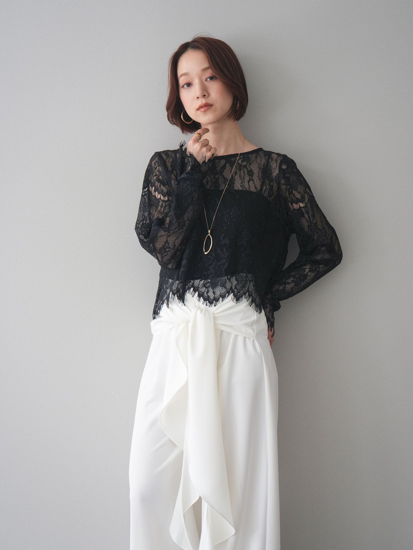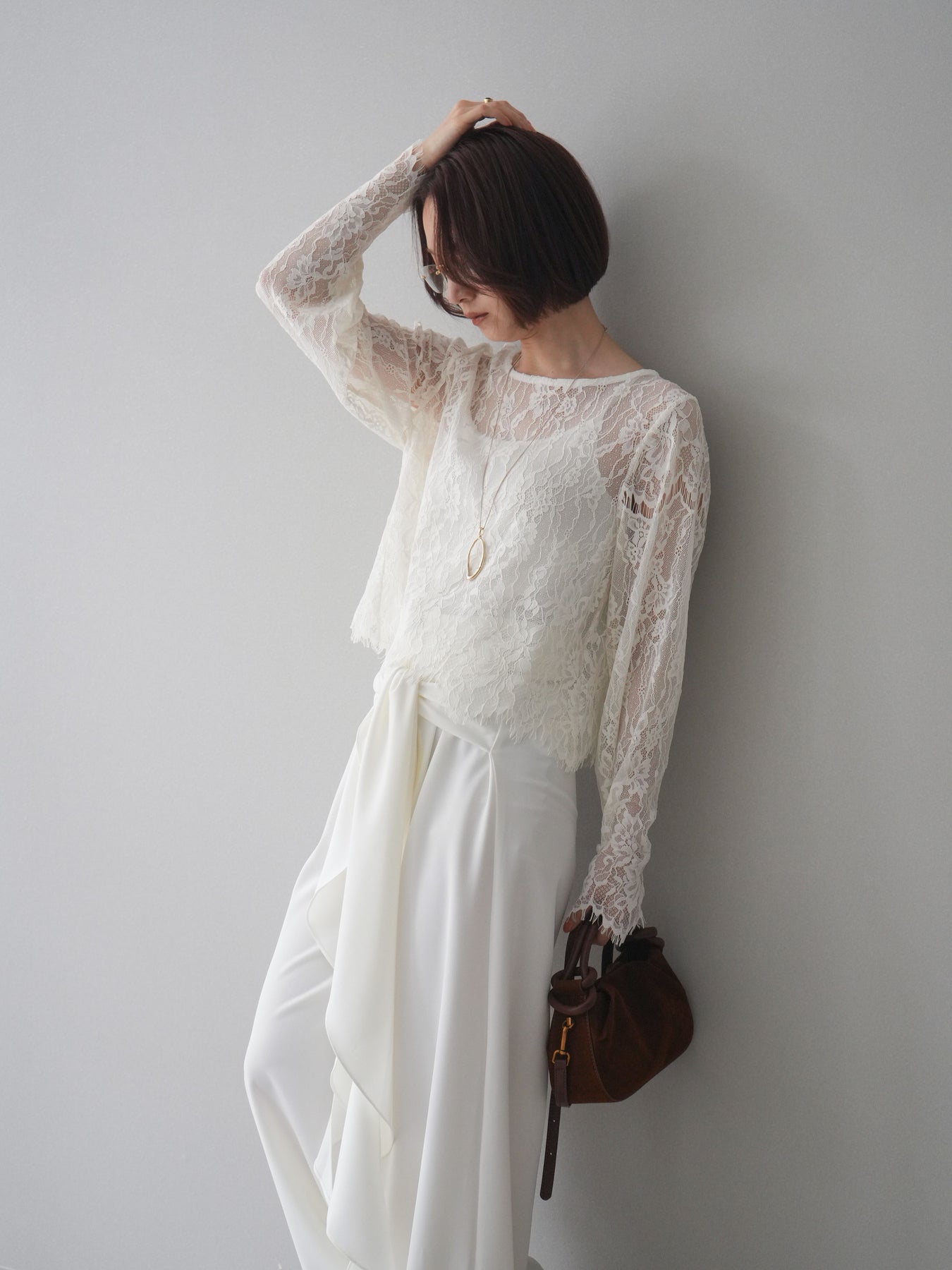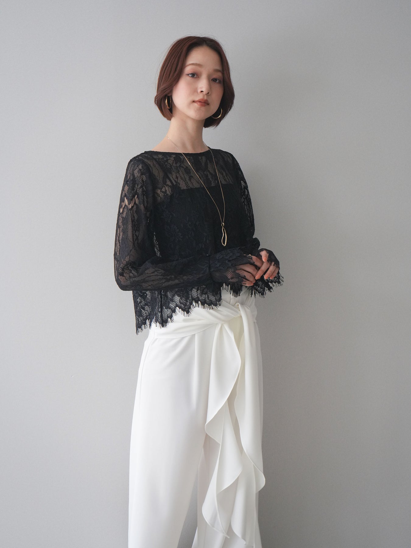 繊細な総レース素材が目を惹くロングスリーブトップス。透け感のある軽やかな風合いで、スタイリングに抜け感をプラスしてくれます。すっきりとしたシルエットでインナー使いにも重宝し、キャミソールやタンクトップを重ねてヘルシーに着こなすのもおすすめ。デニムやスラックス、ジャンパースカートのインナーなど、幅広いコーディネートに取り入れやすい一枚です。 ※ボトムス、キャミソール(インナー)以外の商品は一律でインナーは付属していません