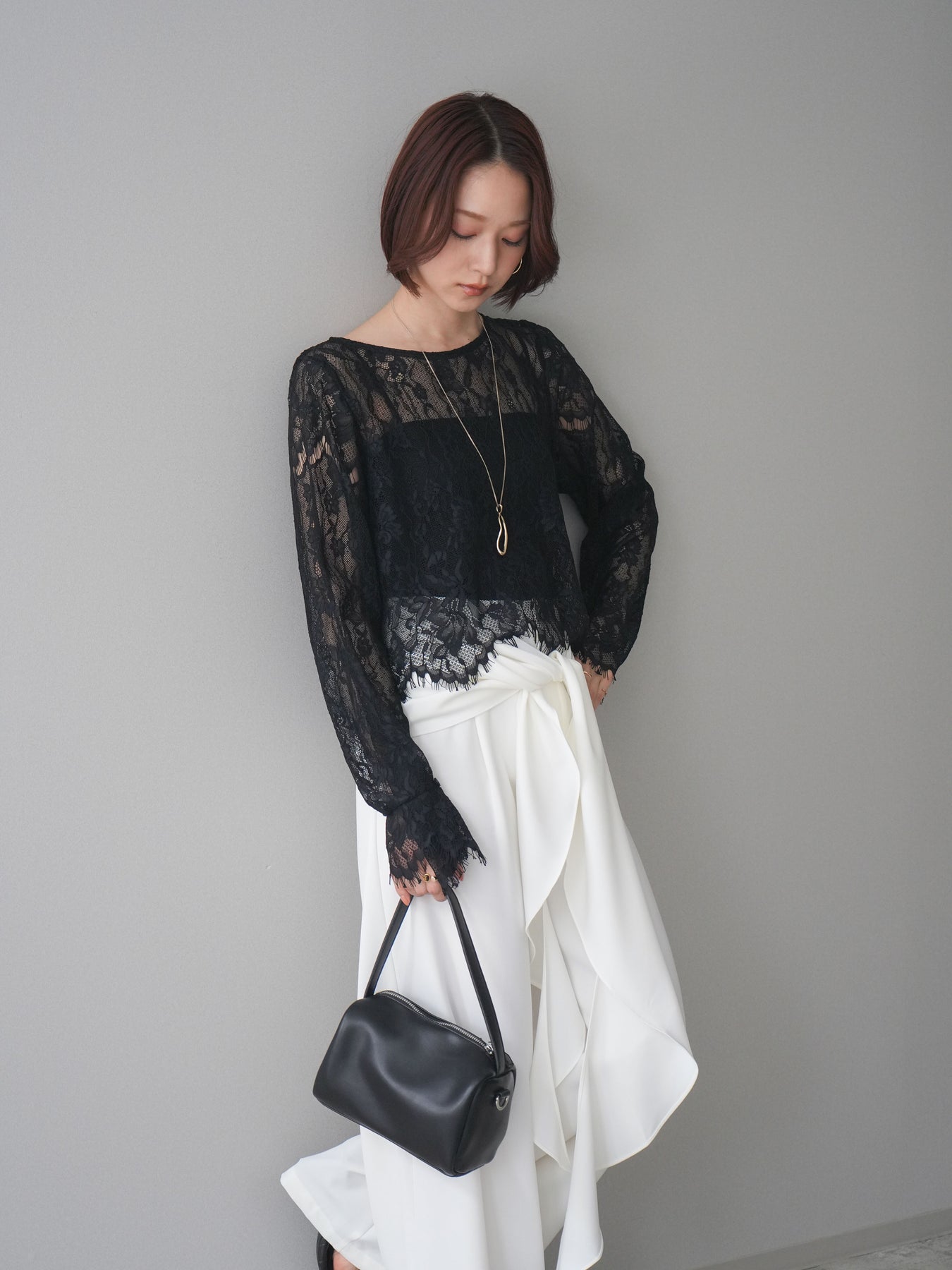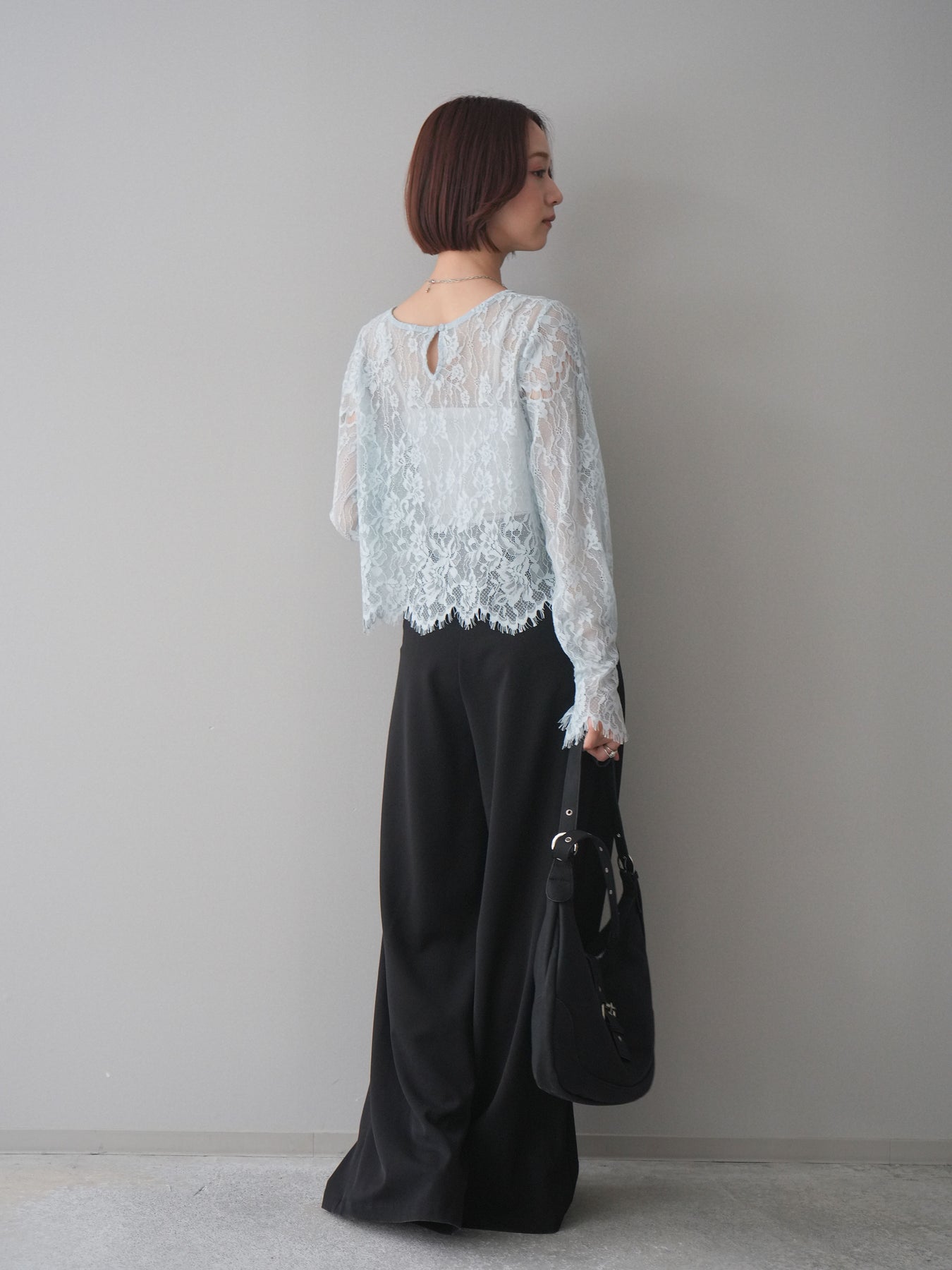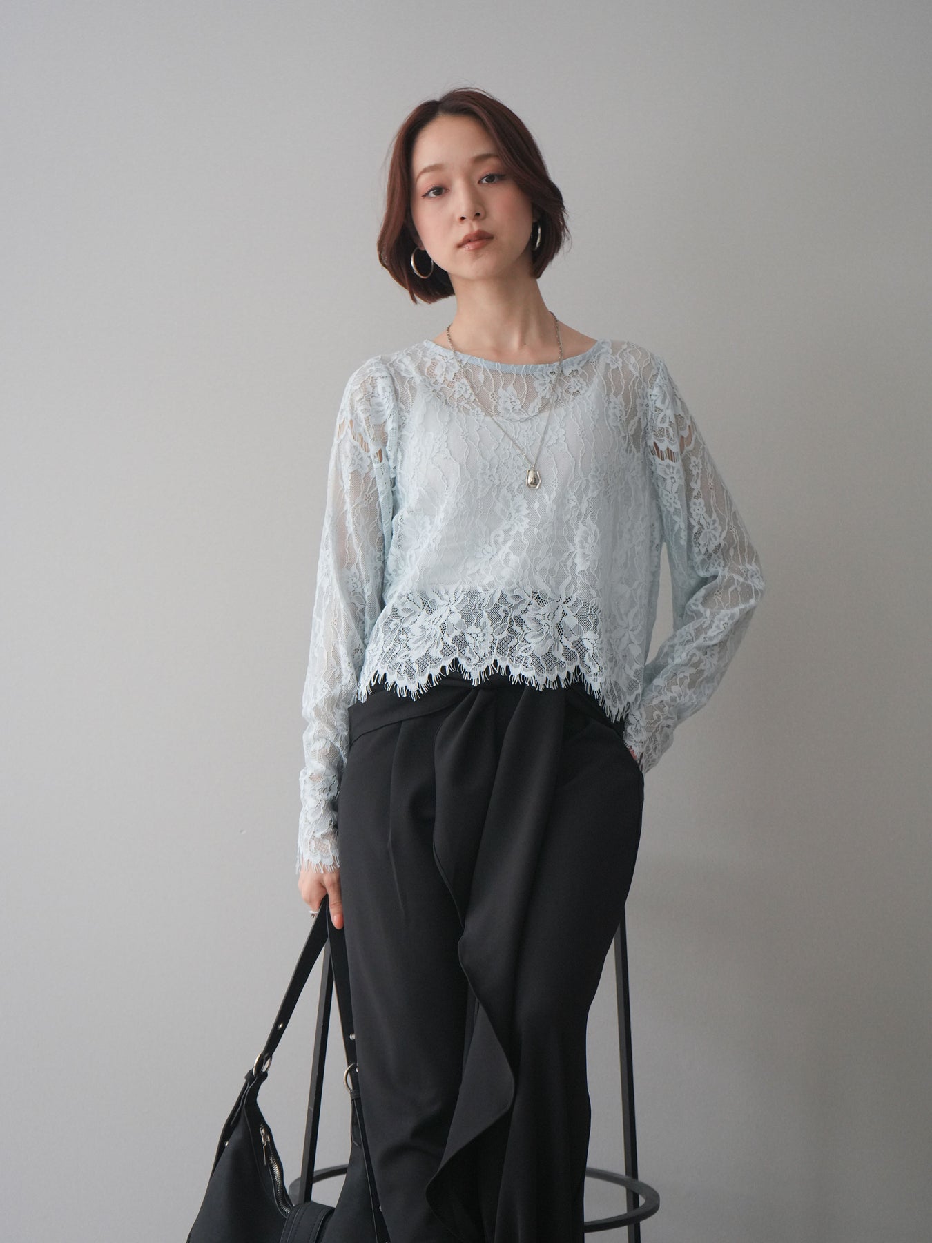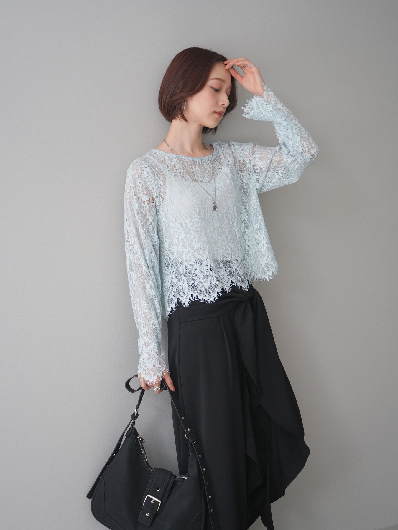 繊細な総レース素材が目を惹くロングスリーブトップス。透け感のある軽やかな風合いで、スタイリングに抜け感をプラスしてくれます。すっきりとしたシルエットでインナー使いにも重宝し、キャミソールやタンクトップを重ねてヘルシーに着こなすのもおすすめ。デニムやスラックス、ジャンパースカートのインナーなど、幅広いコーディネートに取り入れやすい一枚です。 ※ボトムス、キャミソール(インナー)以外の商品は一律でインナーは付属していません