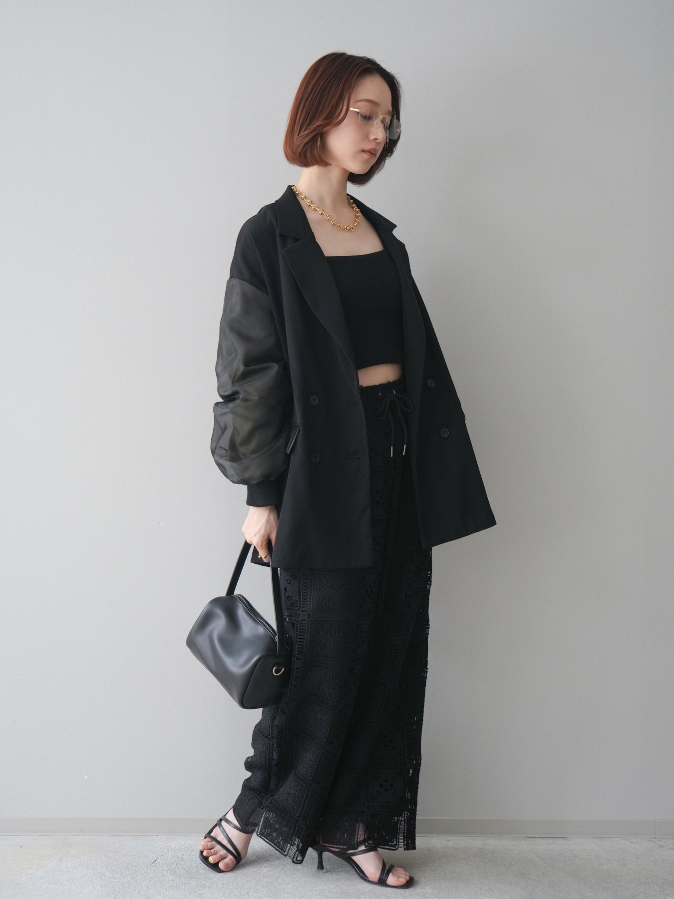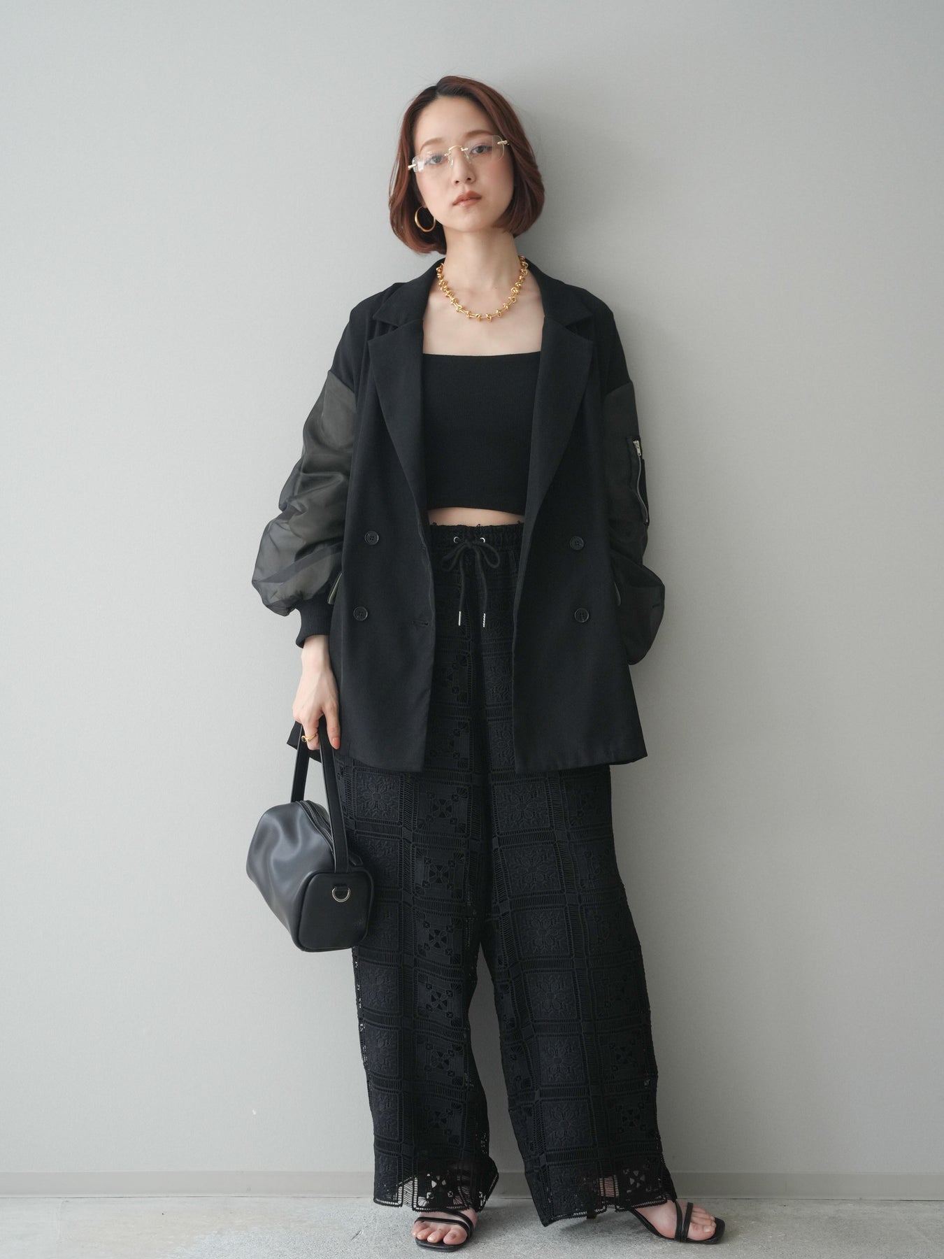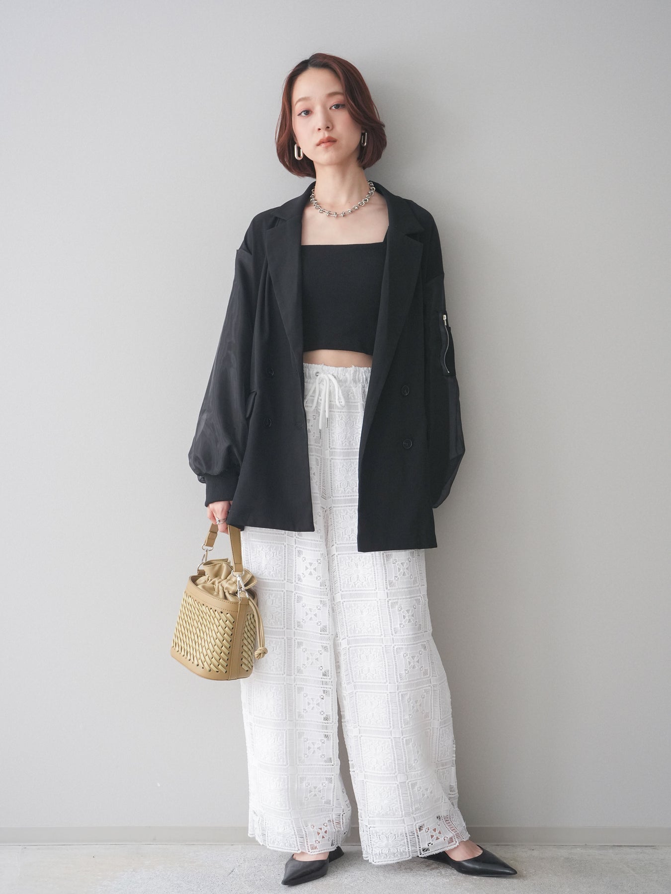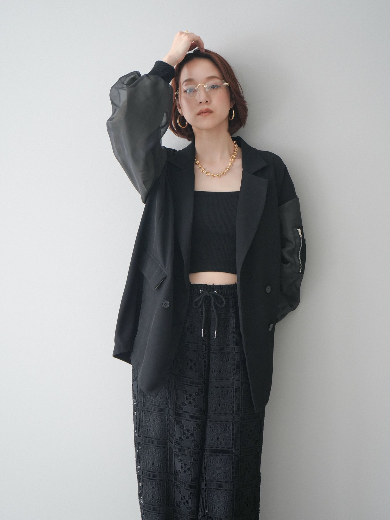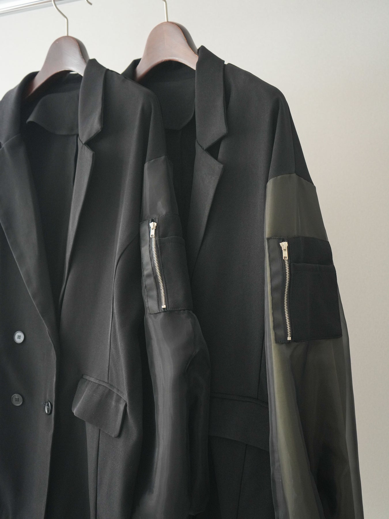 テーラードジャケットにMA-1ディテールを掛け合わせた、モードな印象のデザインジャケット。ダブルボタンのきちんと感に、スリーブの異素材切替やジップポケットがアクセントを添え、スタイリングにエッジを効かせます。程よくゆとりのあるシルエットで、ワンピースやスラックスはもちろん、デニム合わせもバランスよく決まる一着。羽織るだけでコーディネートを引き締めてくれます。 ※ボトムス、キャミソール(インナー)以外の商品は一律でインナーは付属していません