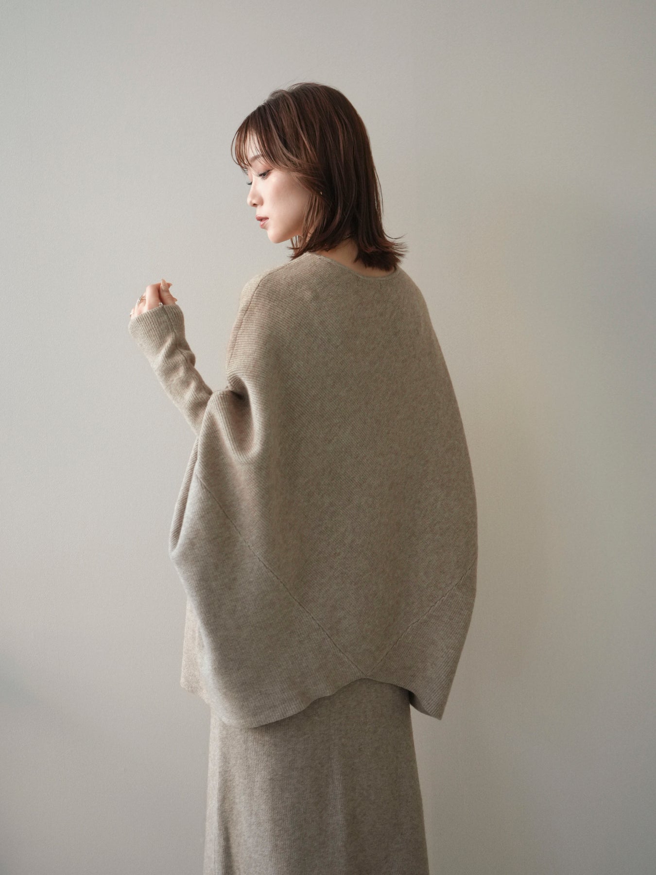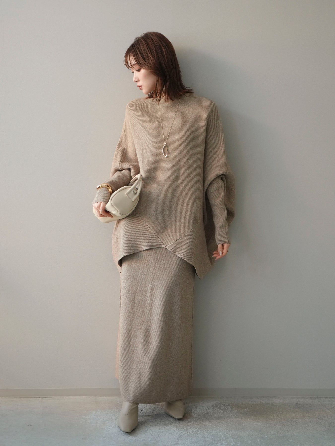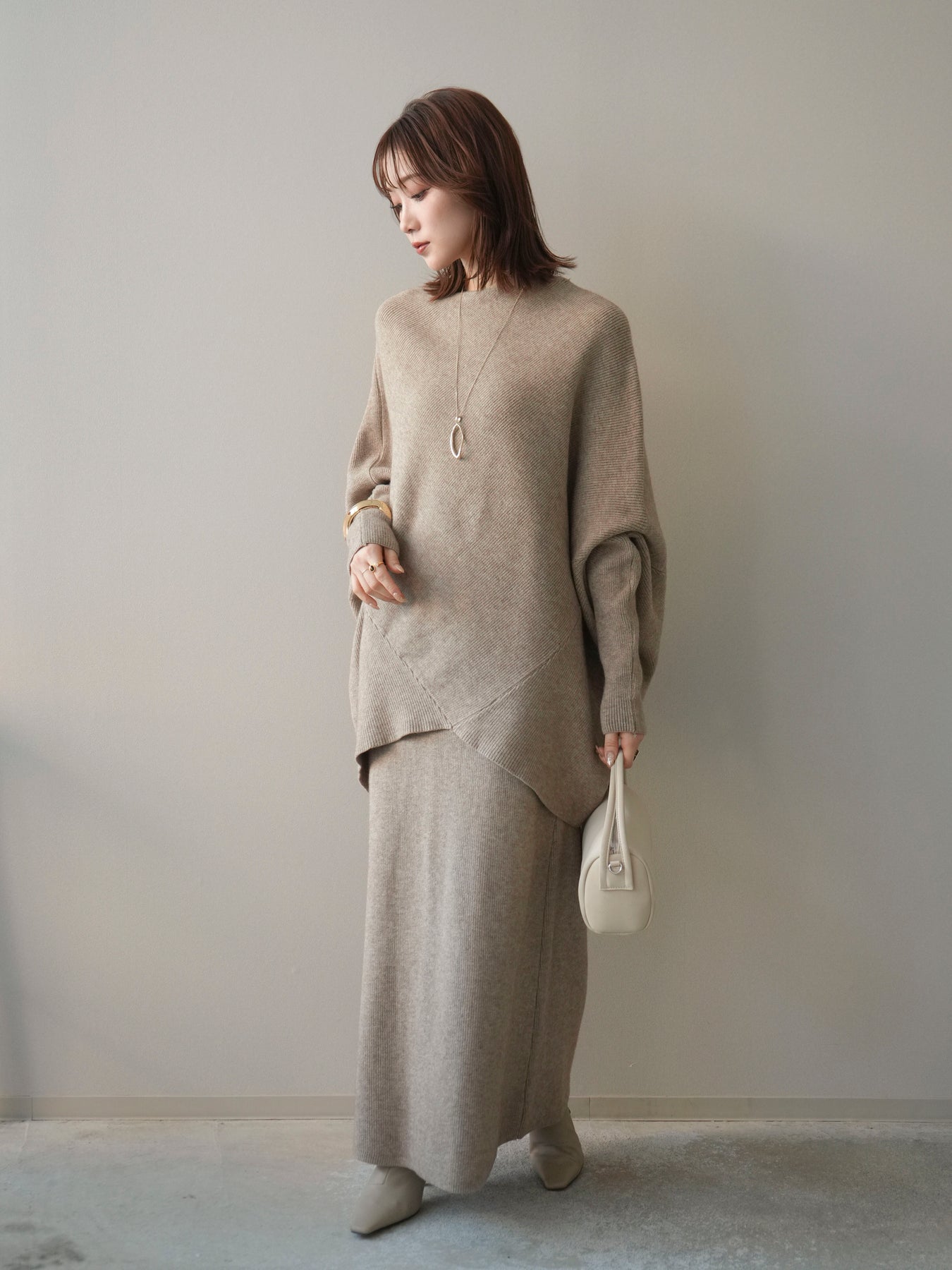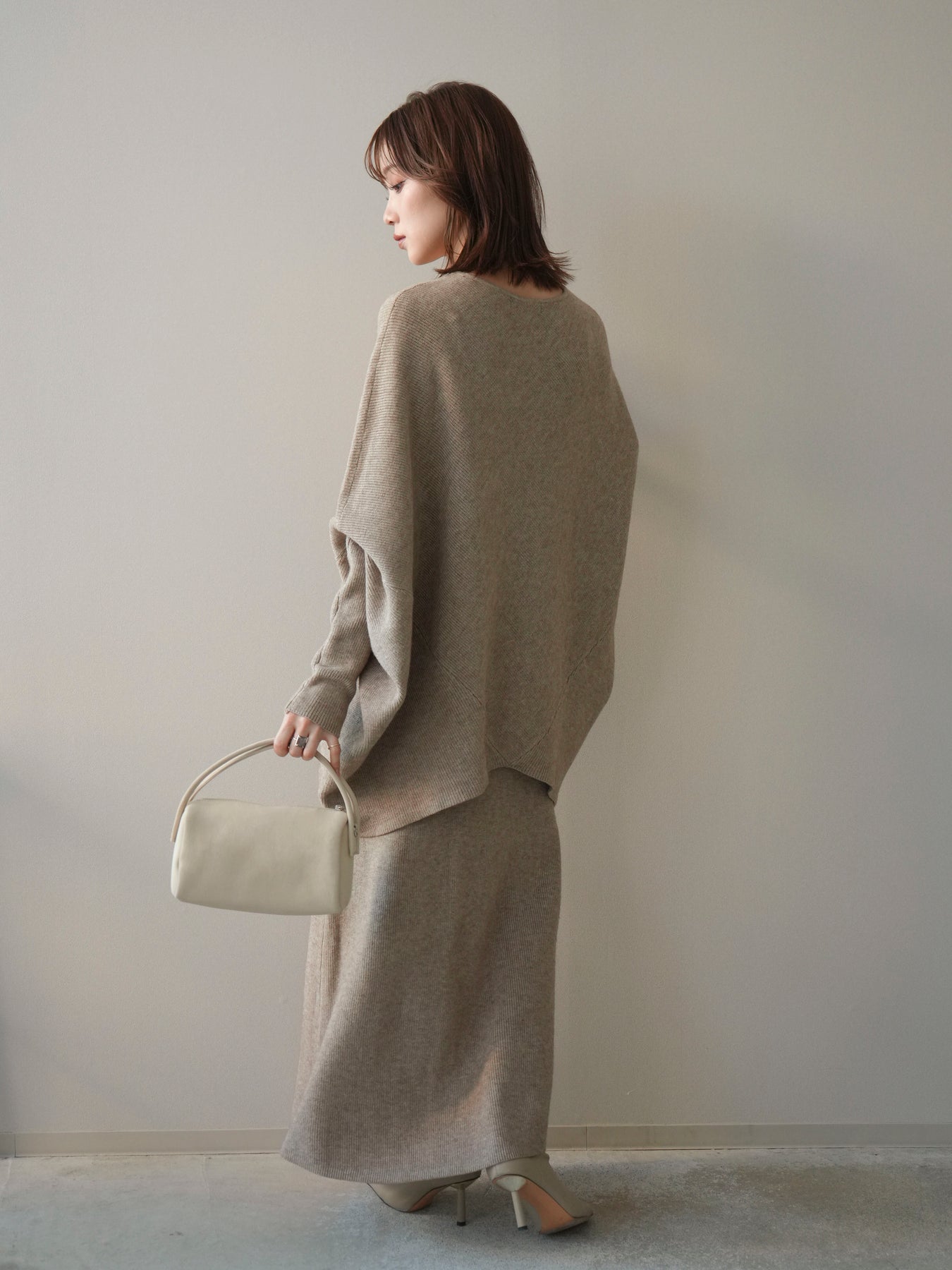 落ち着いた雰囲気と上品さを兼ね備えた、ニットとスカートのセットアップ。 ウール混ならではのあたたかみのある風合いが、シーズンムードを高めてくれます。 トップスはゆったりとしたドルマンシルエットで、身体のラインを拾いにくく、リラックス感のある着心地が魅力。 スカートはすっきりとした印象で、全体のバランスを美しくまとめてくれます。 セットで着るだけで統一感のあるスタイリングが完成し、それぞれ単品使いでも着回しが楽しめる、汎用性の高いアイテムです。
