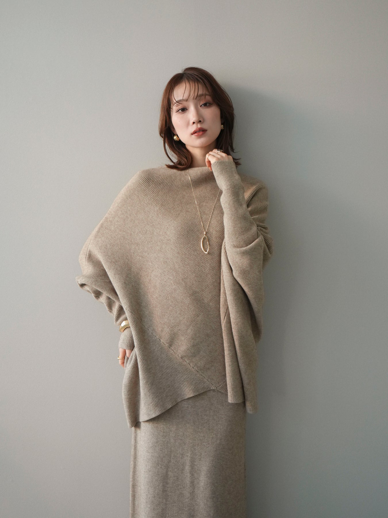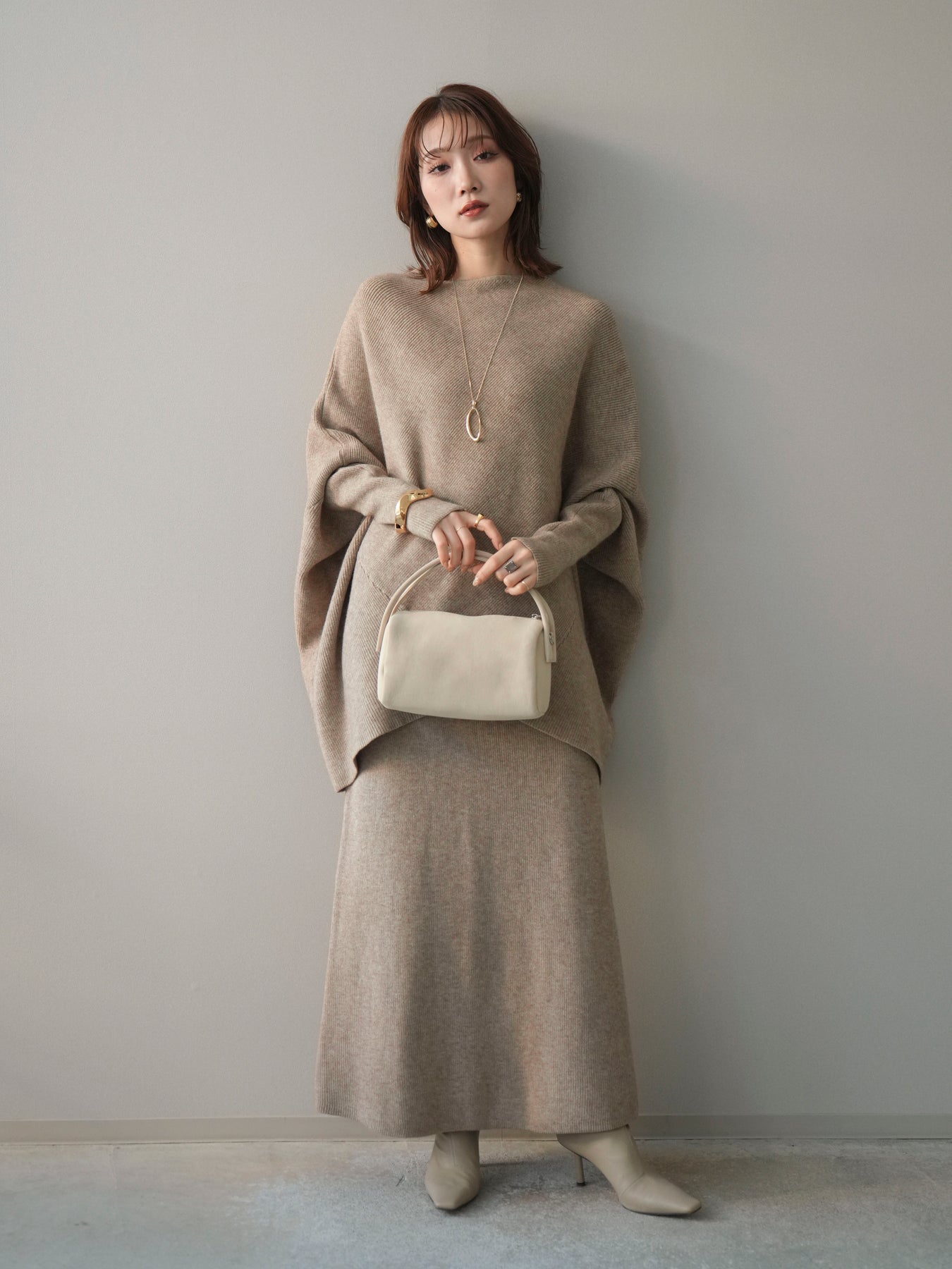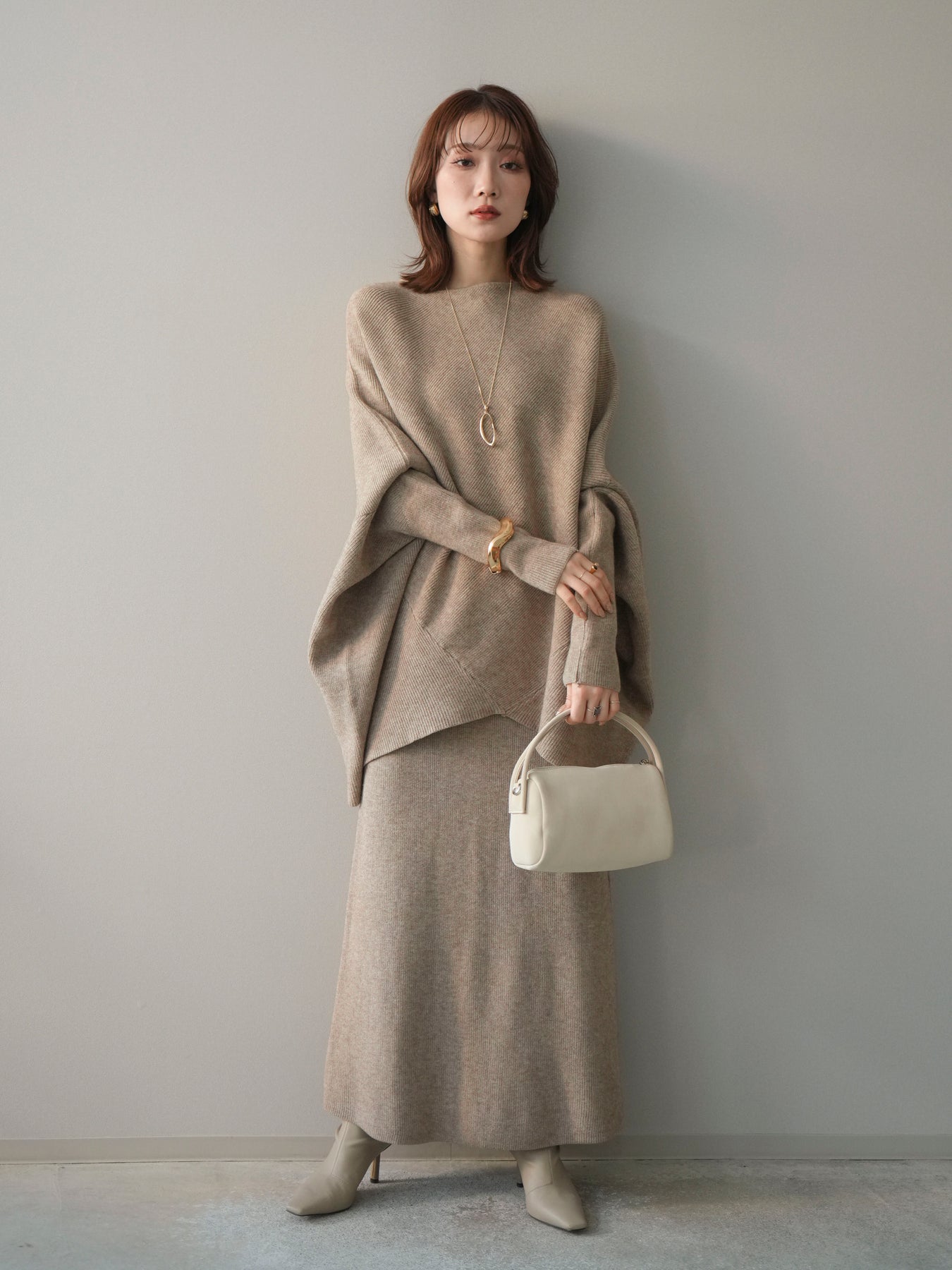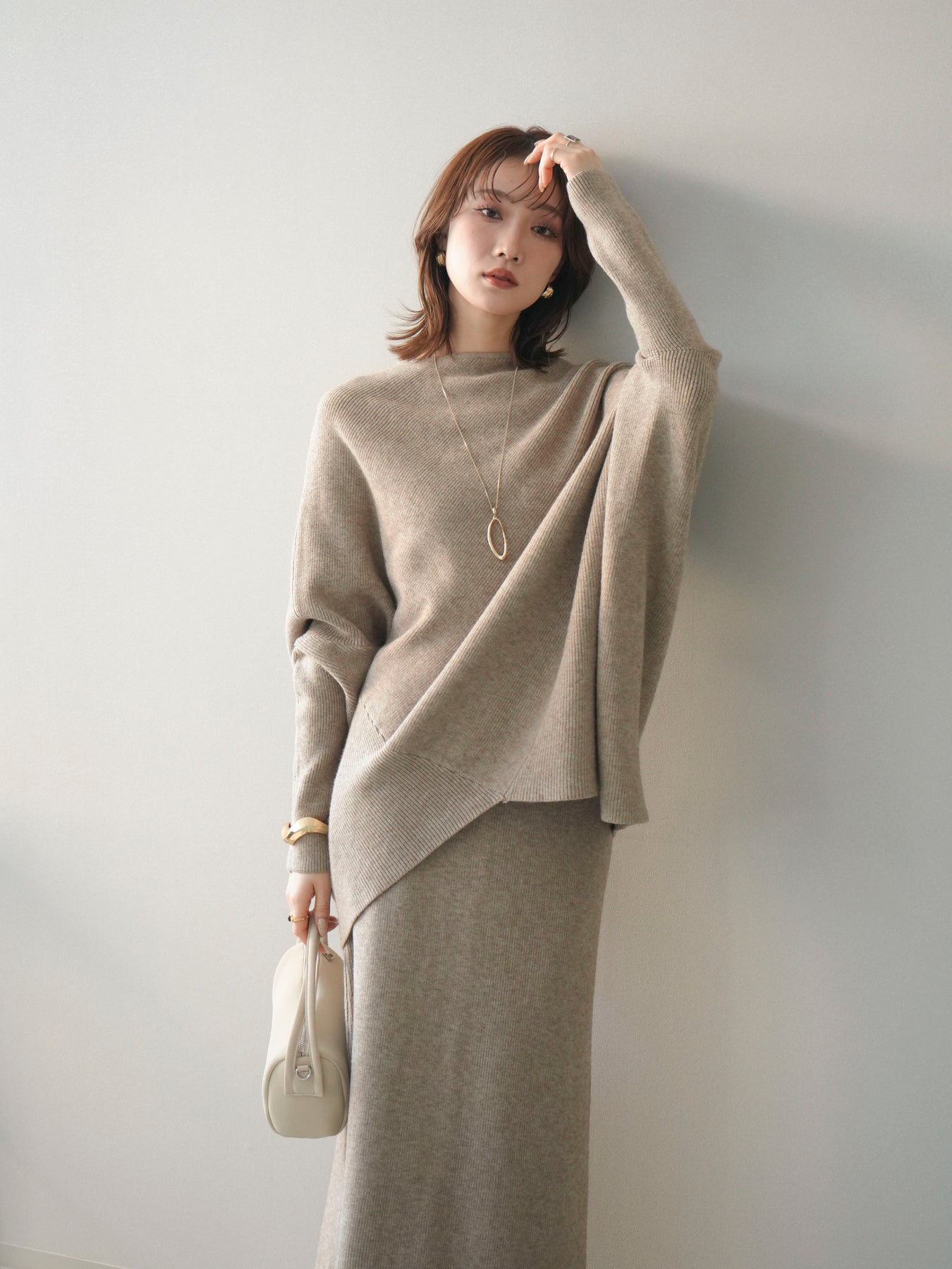 落ち着いた雰囲気と上品さを兼ね備えた、ニットとスカートのセットアップ。 ウール混ならではのあたたかみのある風合いが、シーズンムードを高めてくれます。 トップスはゆったりとしたドルマンシルエットで、身体のラインを拾いにくく、リラックス感のある着心地が魅力。 スカートはすっきりとした印象で、全体のバランスを美しくまとめてくれます。 セットで着るだけで統一感のあるスタイリングが完成し、それぞれ単品使いでも着回しが楽しめる、汎用性の高いアイテムです。