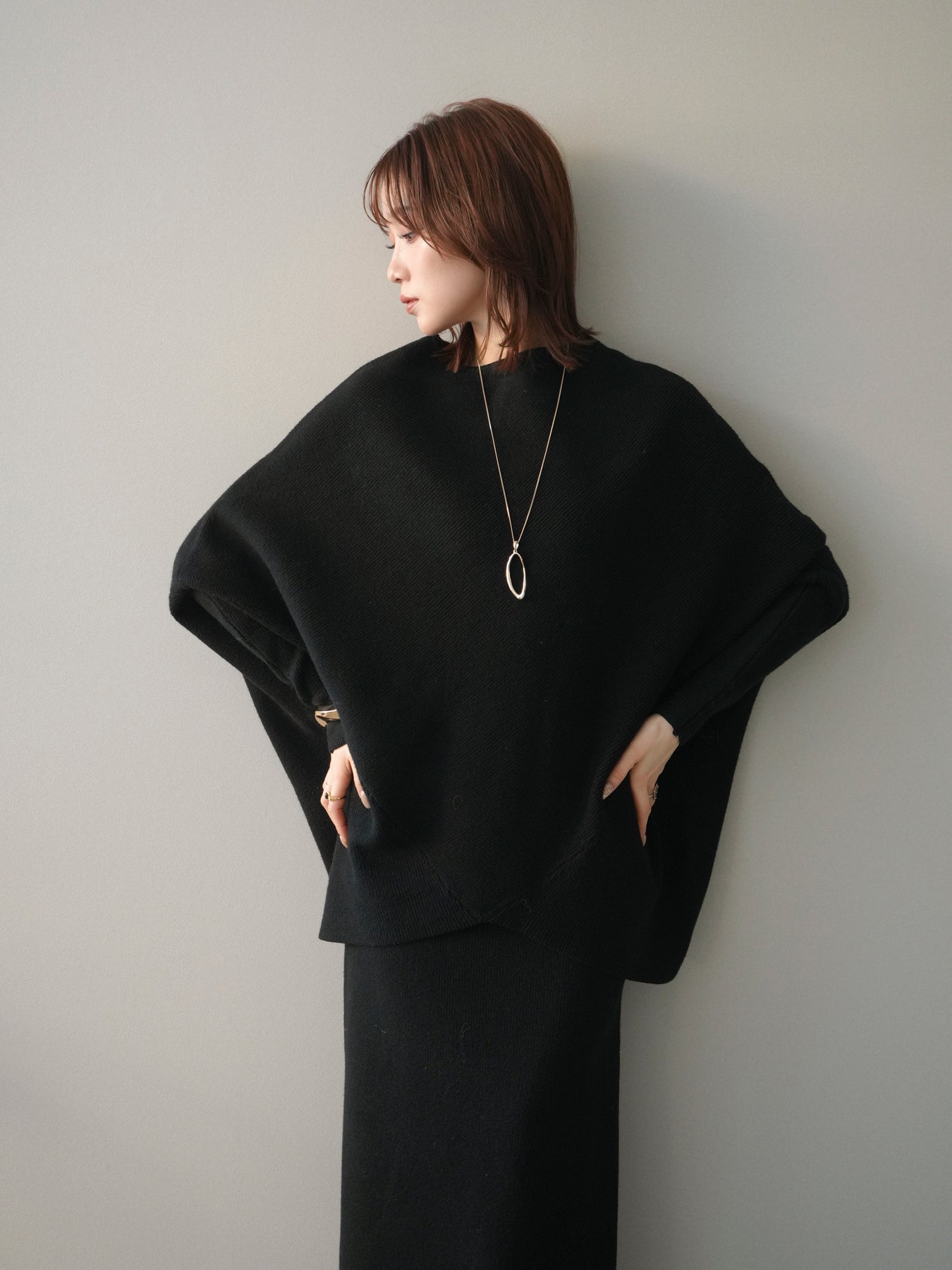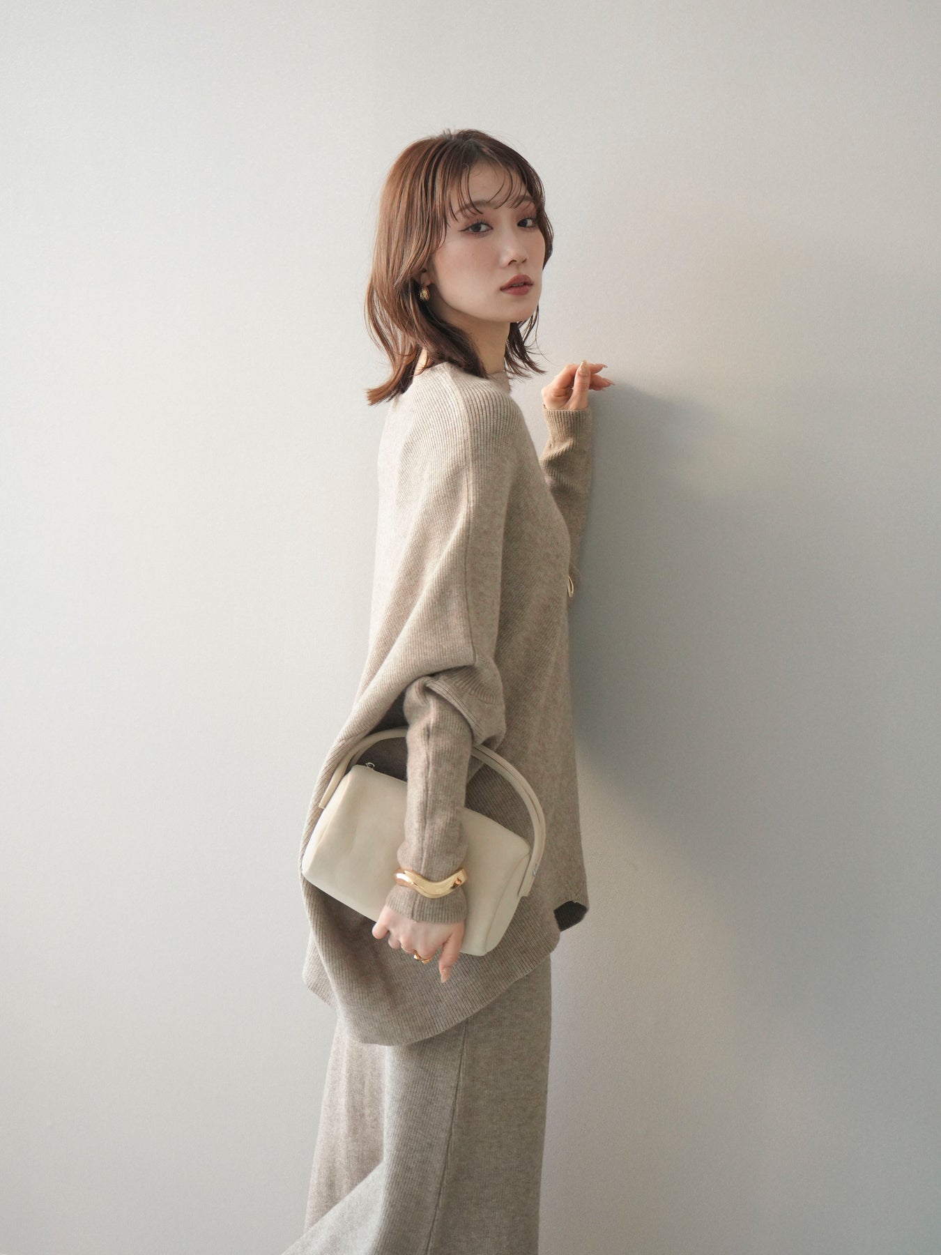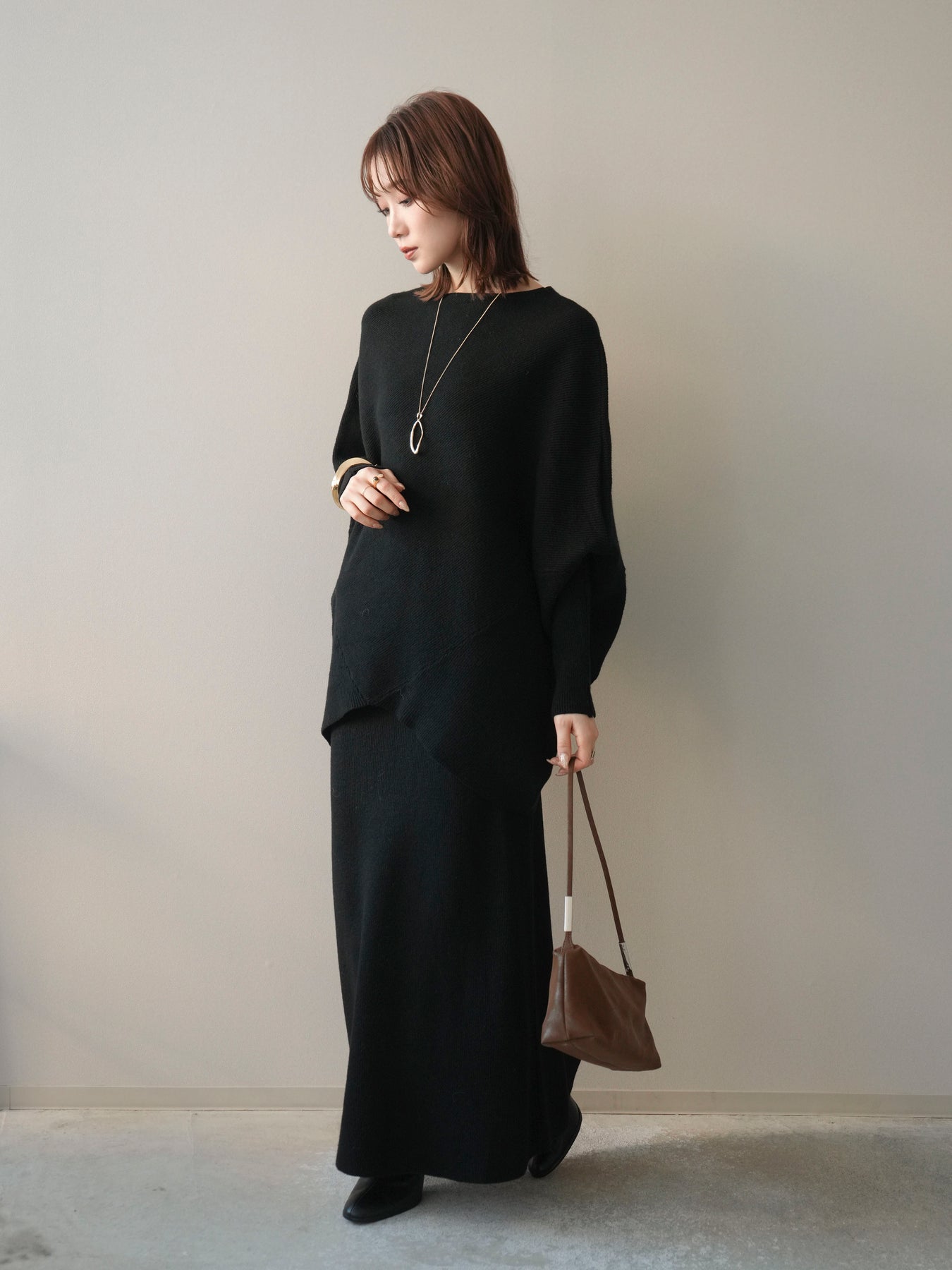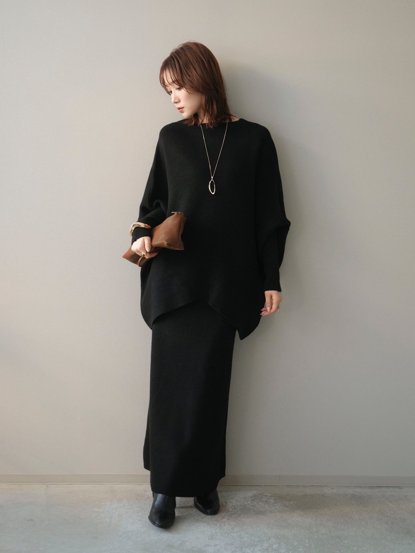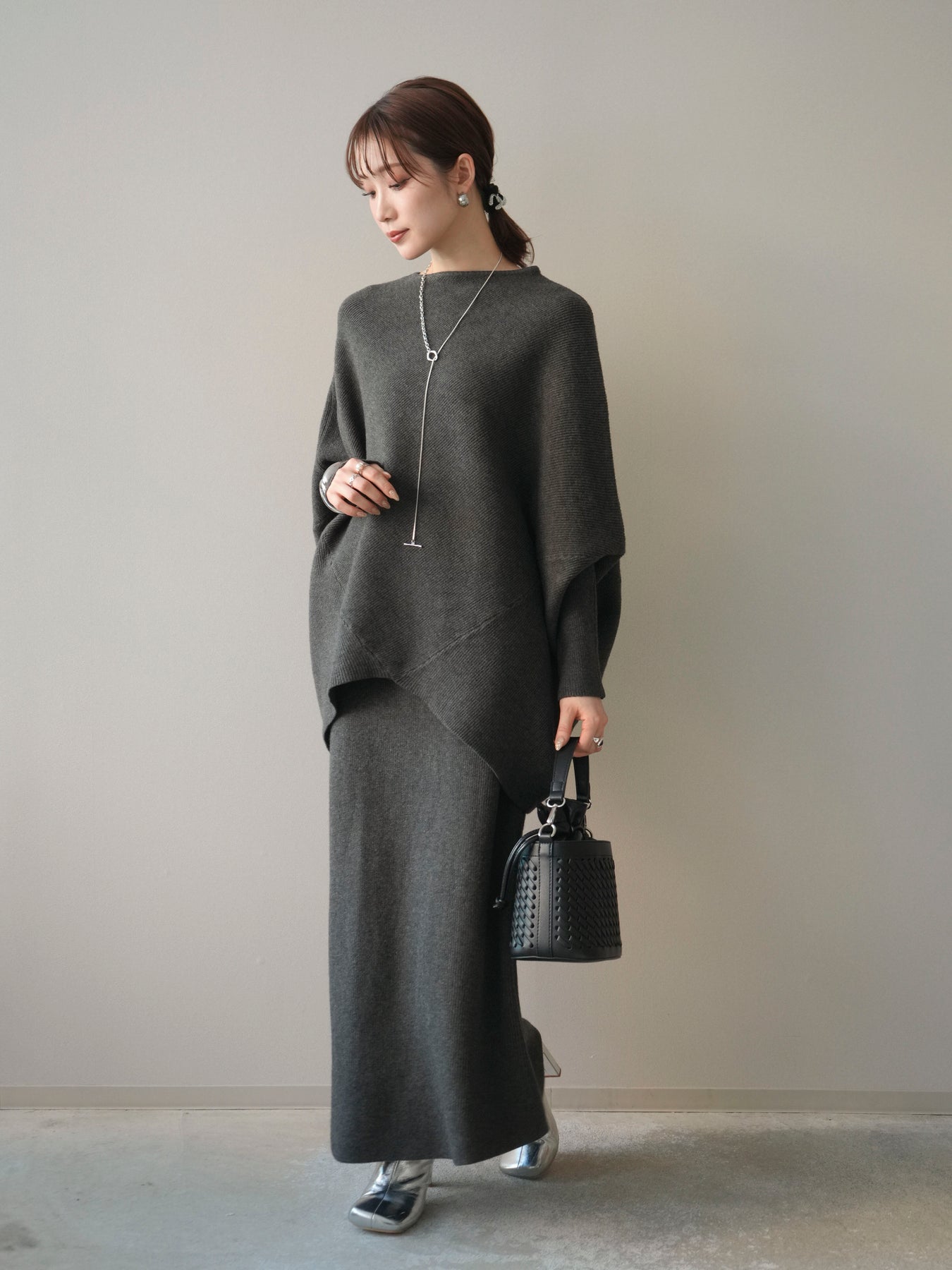 落ち着いた雰囲気と上品さを兼ね備えた、ニットとスカートのセットアップ。 ウール混ならではのあたたかみのある風合いが、シーズンムードを高めてくれます。 トップスはゆったりとしたドルマンシルエットで、身体のラインを拾いにくく、リラックス感のある着心地が魅力。 スカートはすっきりとした印象で、全体のバランスを美しくまとめてくれます。 セットで着るだけで統一感のあるスタイリングが完成し、それぞれ単品使いでも着回しが楽しめる、汎用性の高いアイテムです。