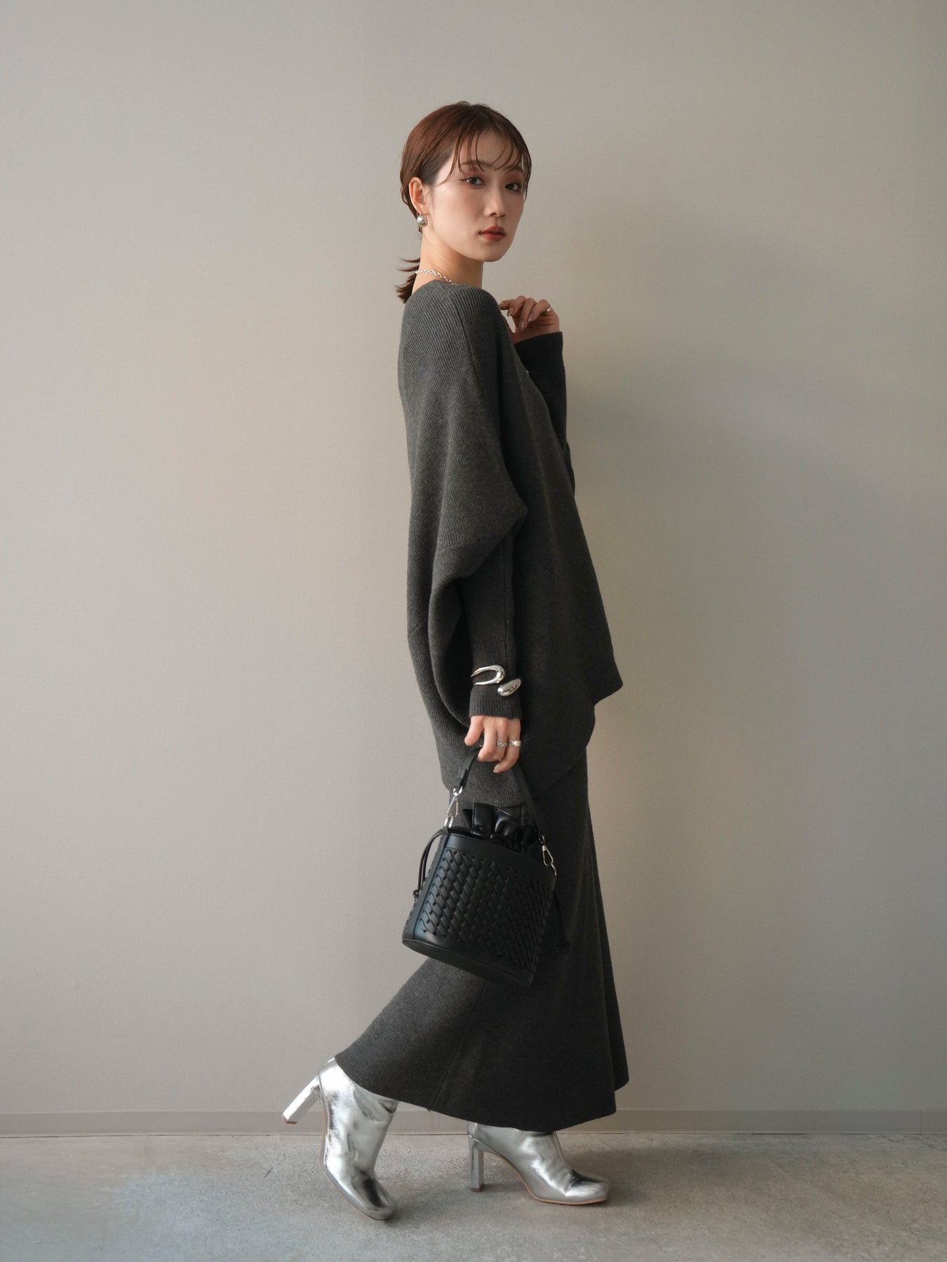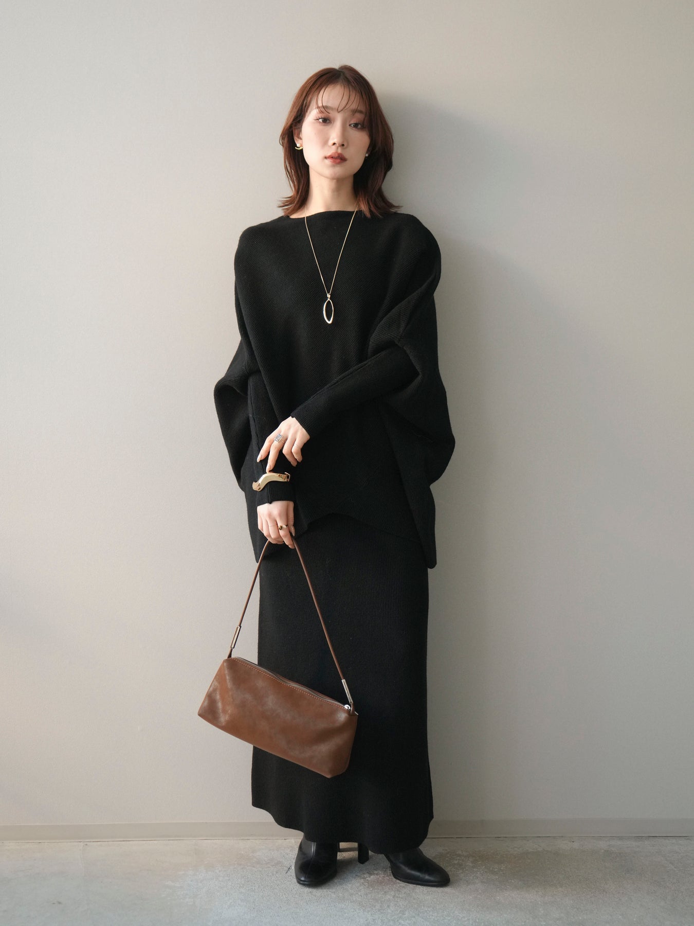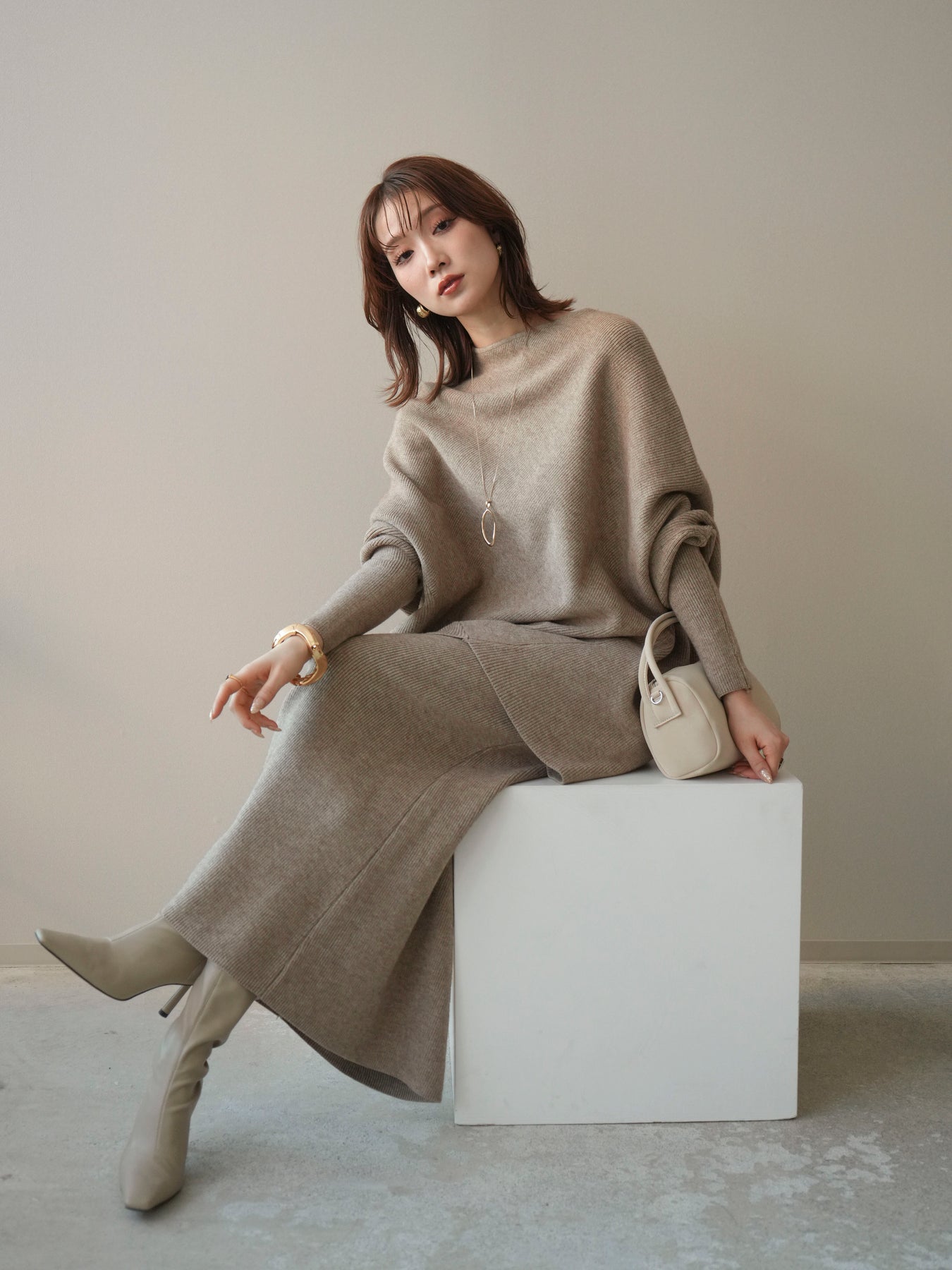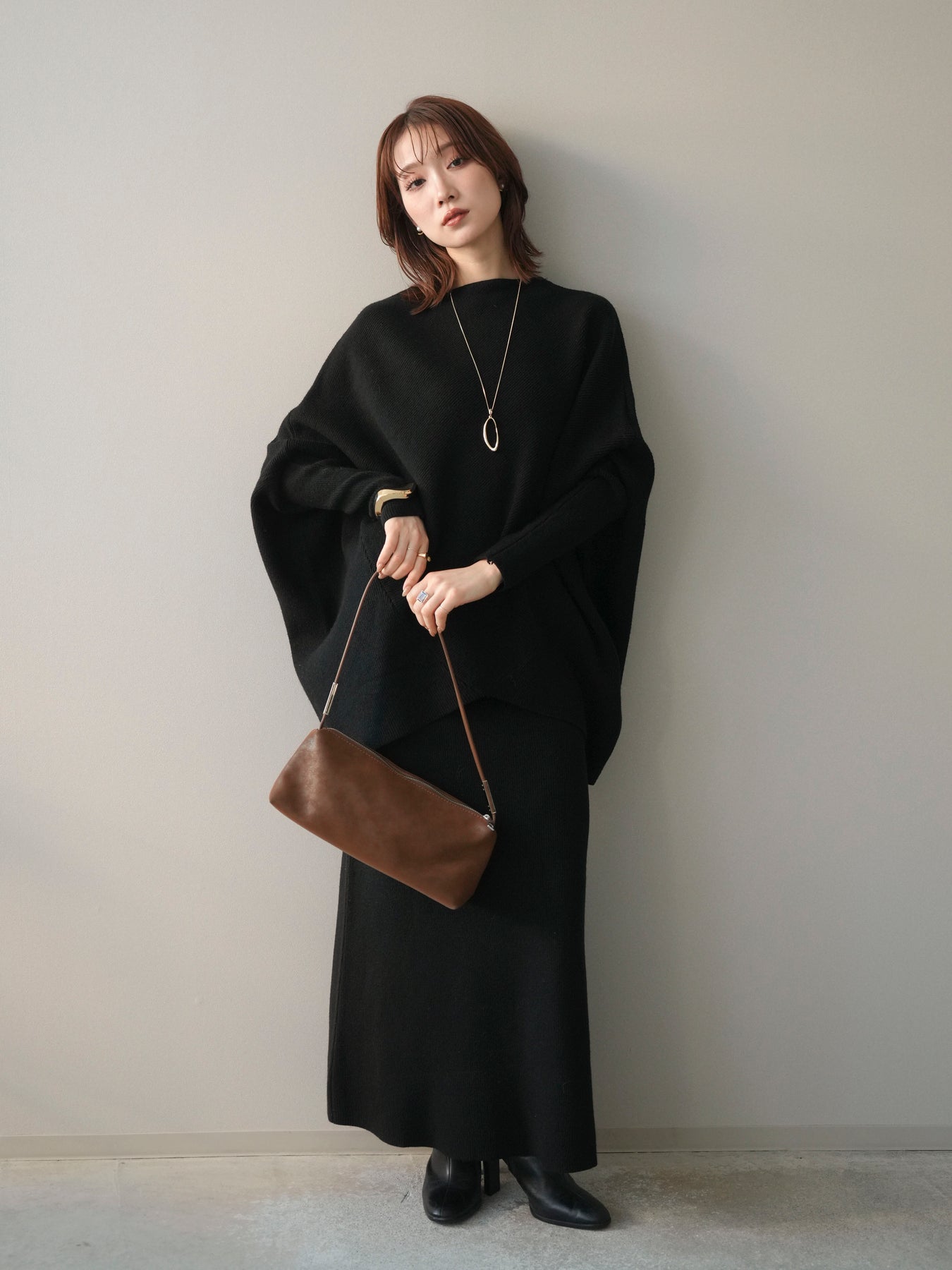 落ち着いた雰囲気と上品さを兼ね備えた、ニットとスカートのセットアップ。 ウール混ならではのあたたかみのある風合いが、シーズンムードを高めてくれます。 トップスはゆったりとしたドルマンシルエットで、身体のラインを拾いにくく、リラックス感のある着心地が魅力。 スカートはすっきりとした印象で、全体のバランスを美しくまとめてくれます。 セットで着るだけで統一感のあるスタイリングが完成し、それぞれ単品使いでも着回しが楽しめる、汎用性の高いアイテムです。