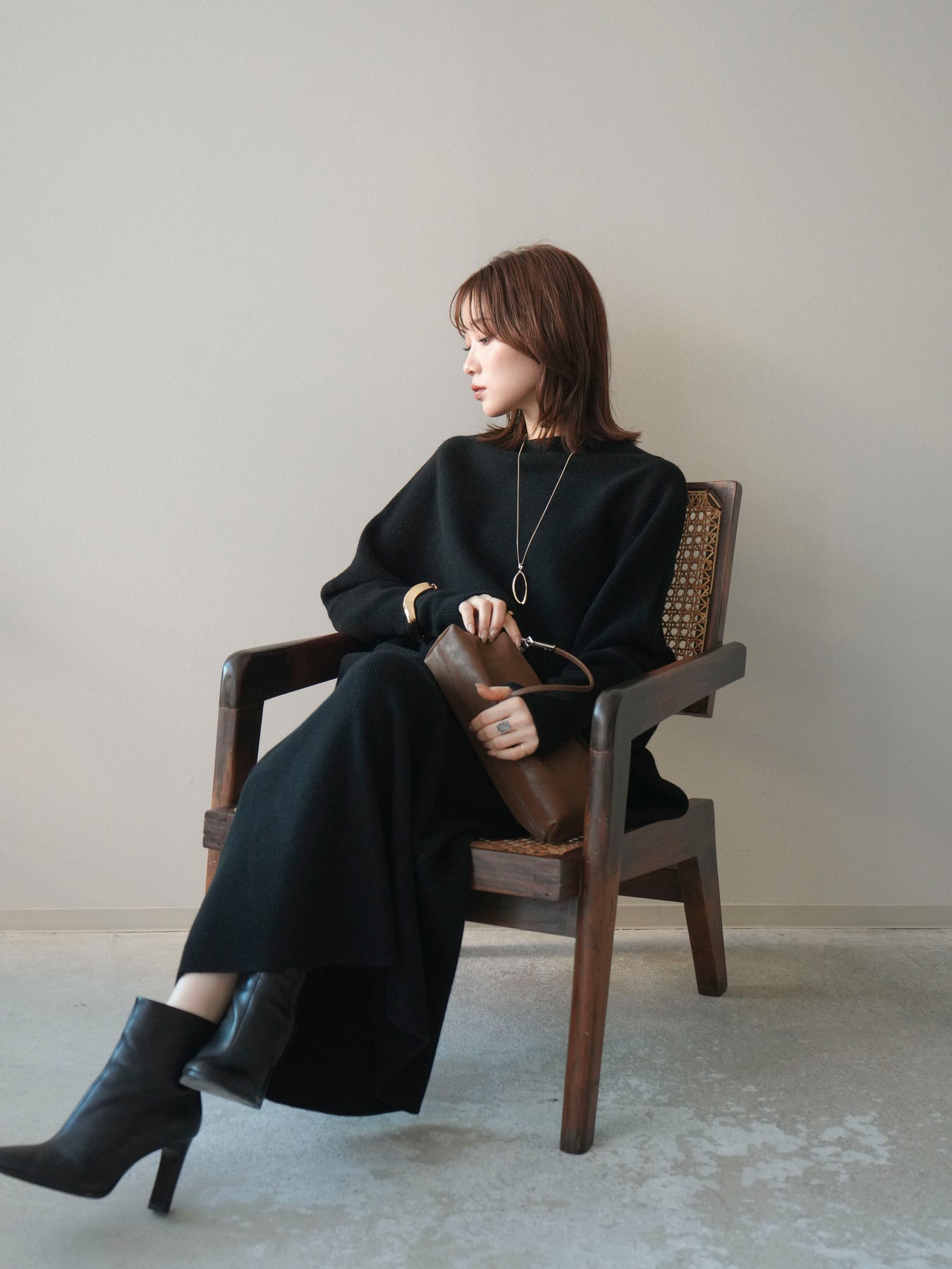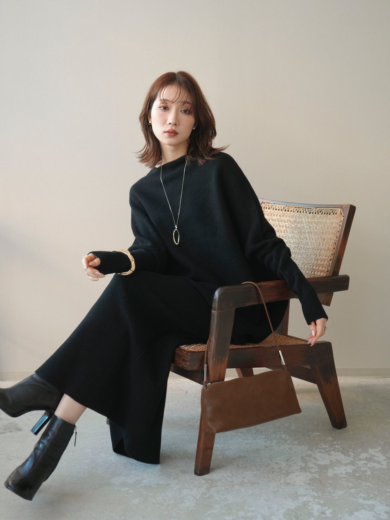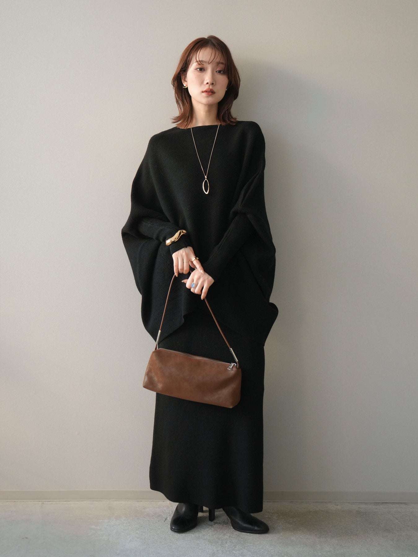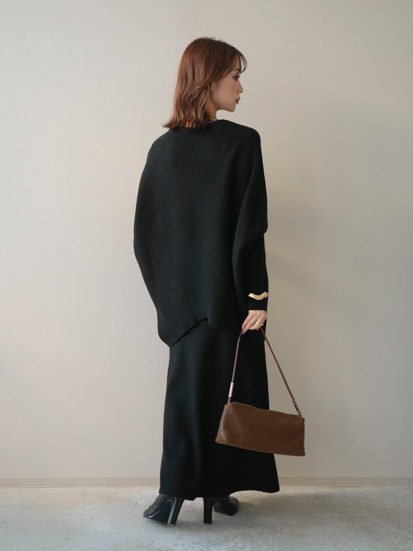 落ち着いた雰囲気と上品さを兼ね備えた、ニットとスカートのセットアップ。 ウール混ならではのあたたかみのある風合いが、シーズンムードを高めてくれます。 トップスはゆったりとしたドルマンシルエットで、身体のラインを拾いにくく、リラックス感のある着心地が魅力。 スカートはすっきりとした印象で、全体のバランスを美しくまとめてくれます。 セットで着るだけで統一感のあるスタイリングが完成し、それぞれ単品使いでも着回しが楽しめる、汎用性の高いアイテムです。
