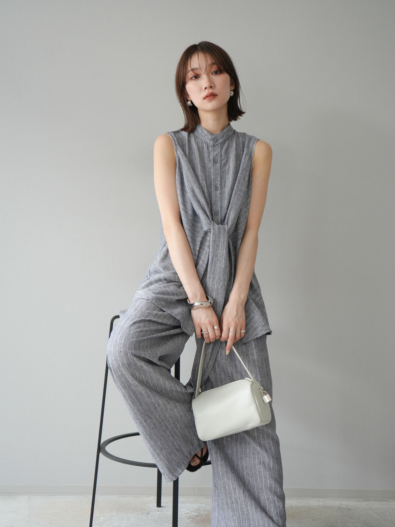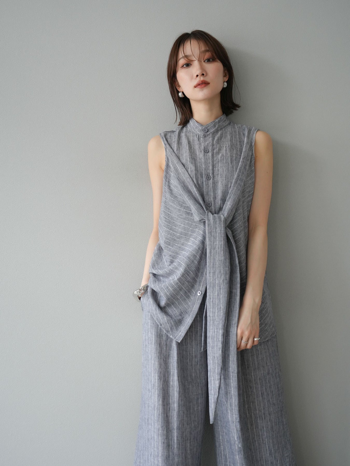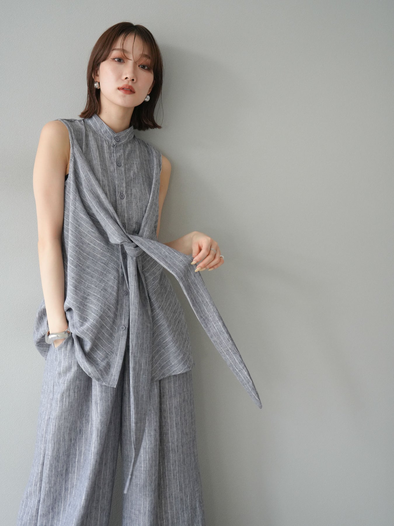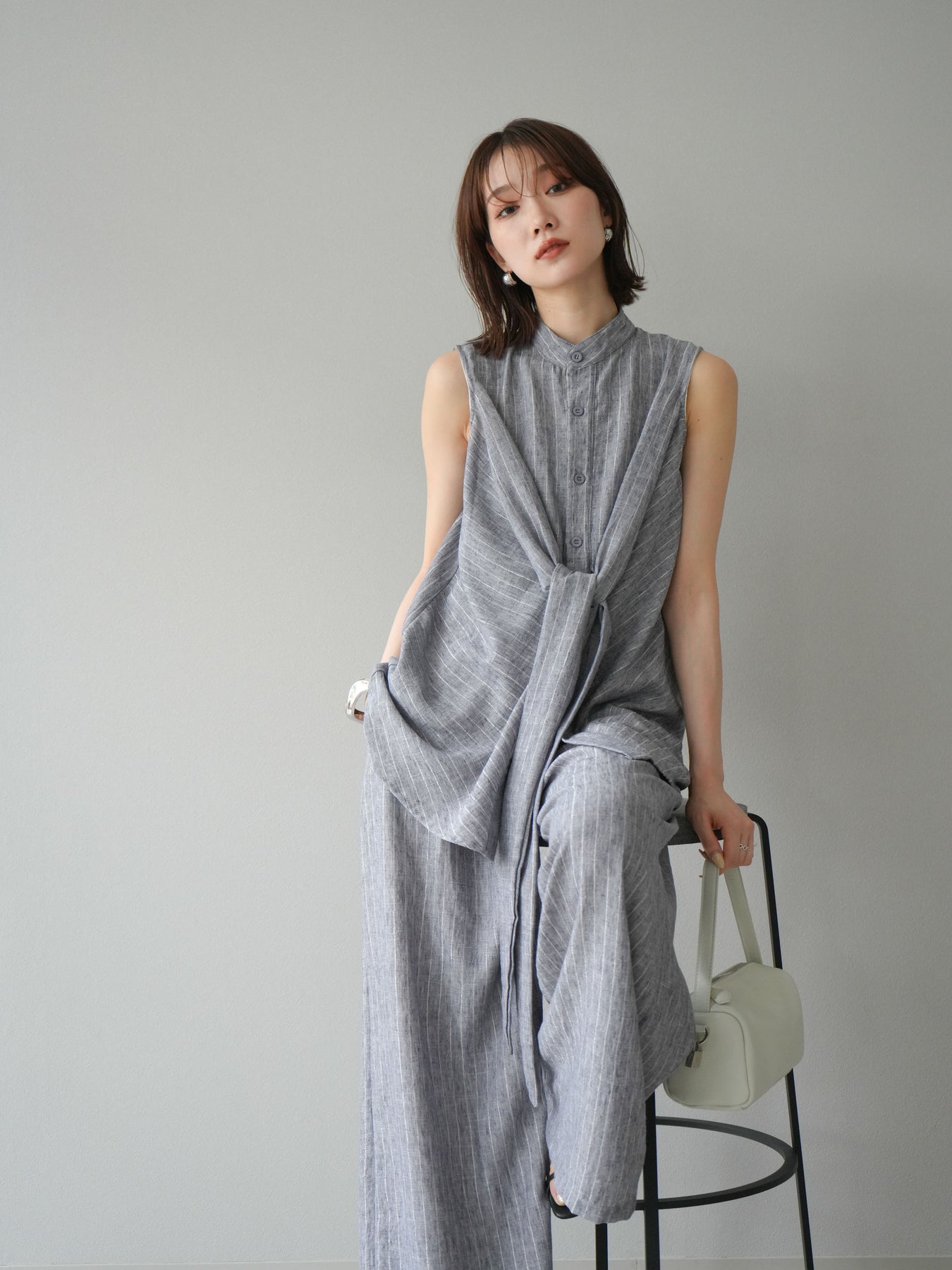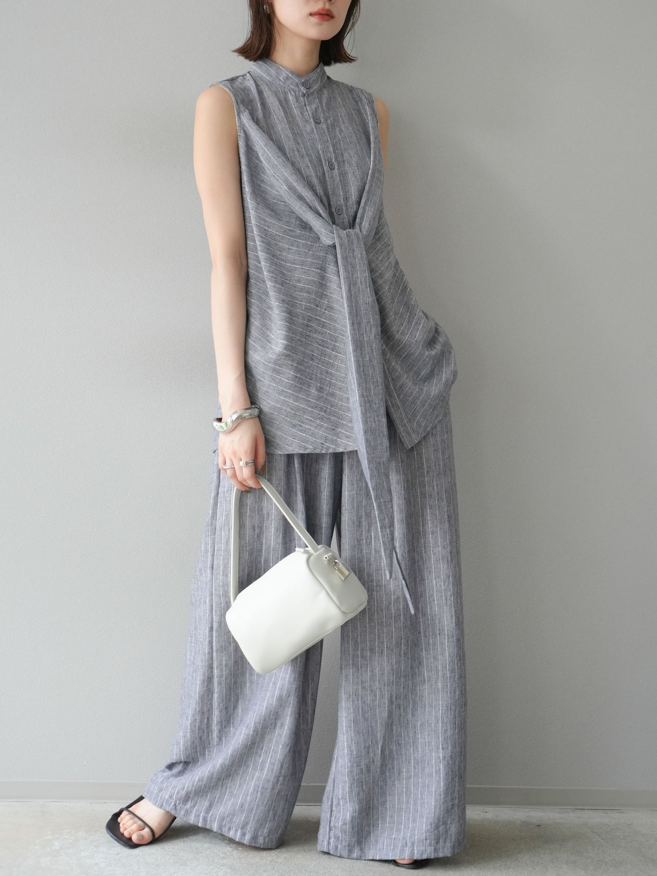 繊細なラメストライプがさりげなく輝く、ボウタイ付きブラウスとワイドパンツのセットアップ。ブラウスは比翼仕立てのフロントデザインに、フロント結びの長めボウタイがアクセント。首元をすっきり見せるバンドカラーで、上品な印象に仕上がっています。 パンツはストンと落ちるワイドシルエットで、ラメの繊細な輝きが動きに合わせて表情を変えます。ウエスト後ろはゴム仕様で、リラックス感もありながらきちんと見えが叶う一着。 セットでの着用はもちろん、それぞれ単品でも着回しやすく、デイリーからお仕事シーンまで幅広く活躍するアイテムです。 ※ボトムス、キャミソール(インナー)以外の商品は一律でインナーは付属していません。