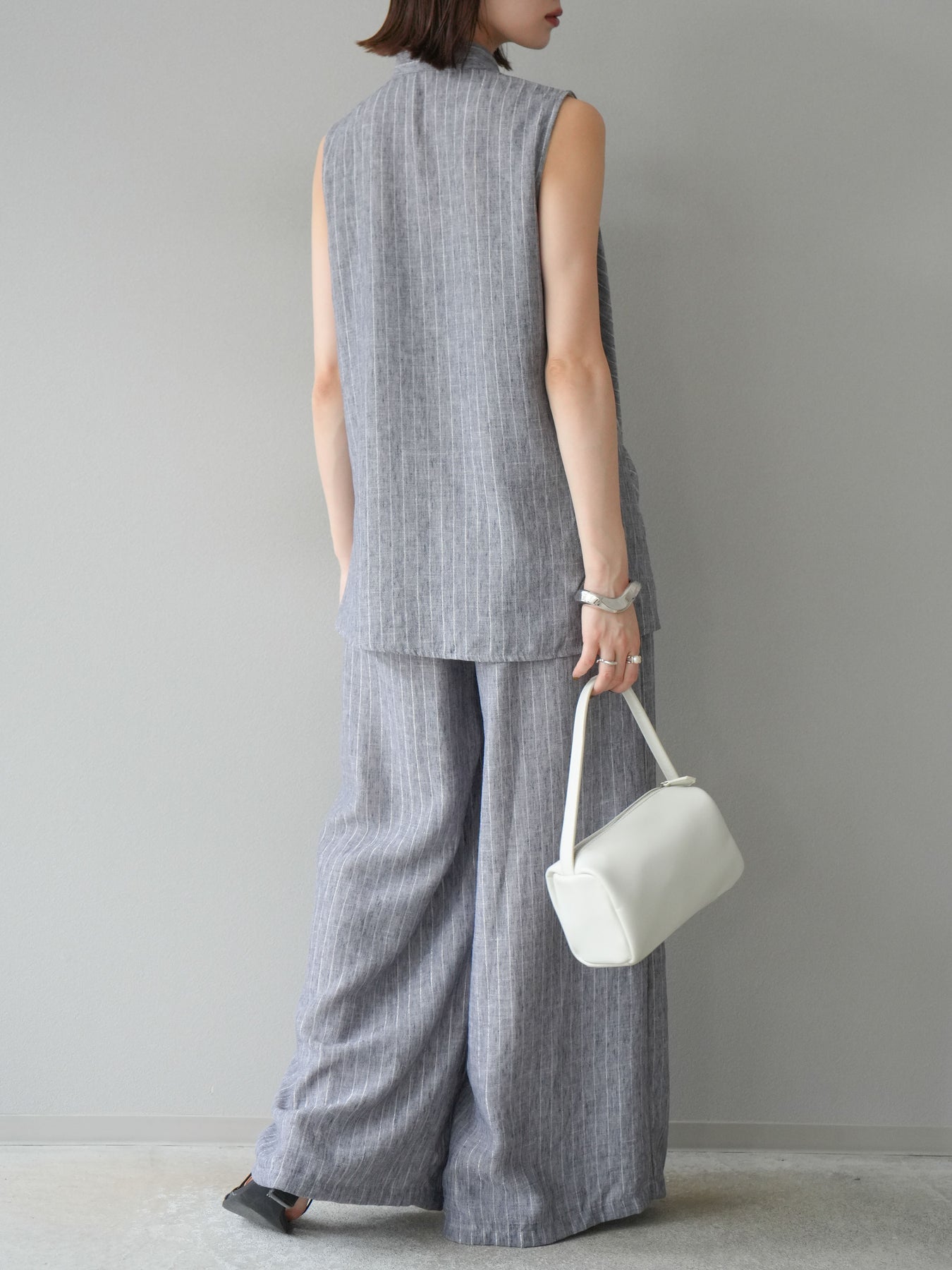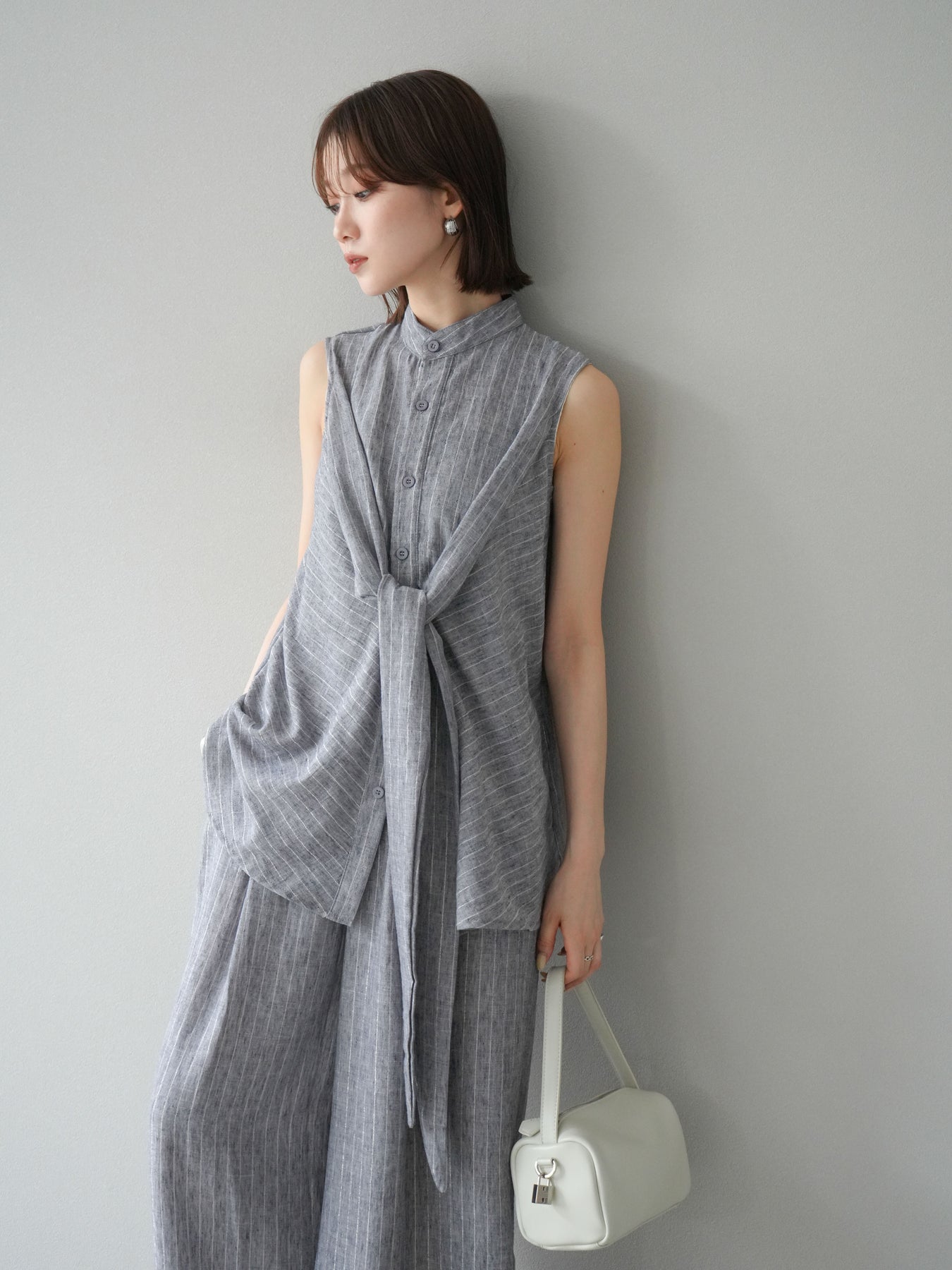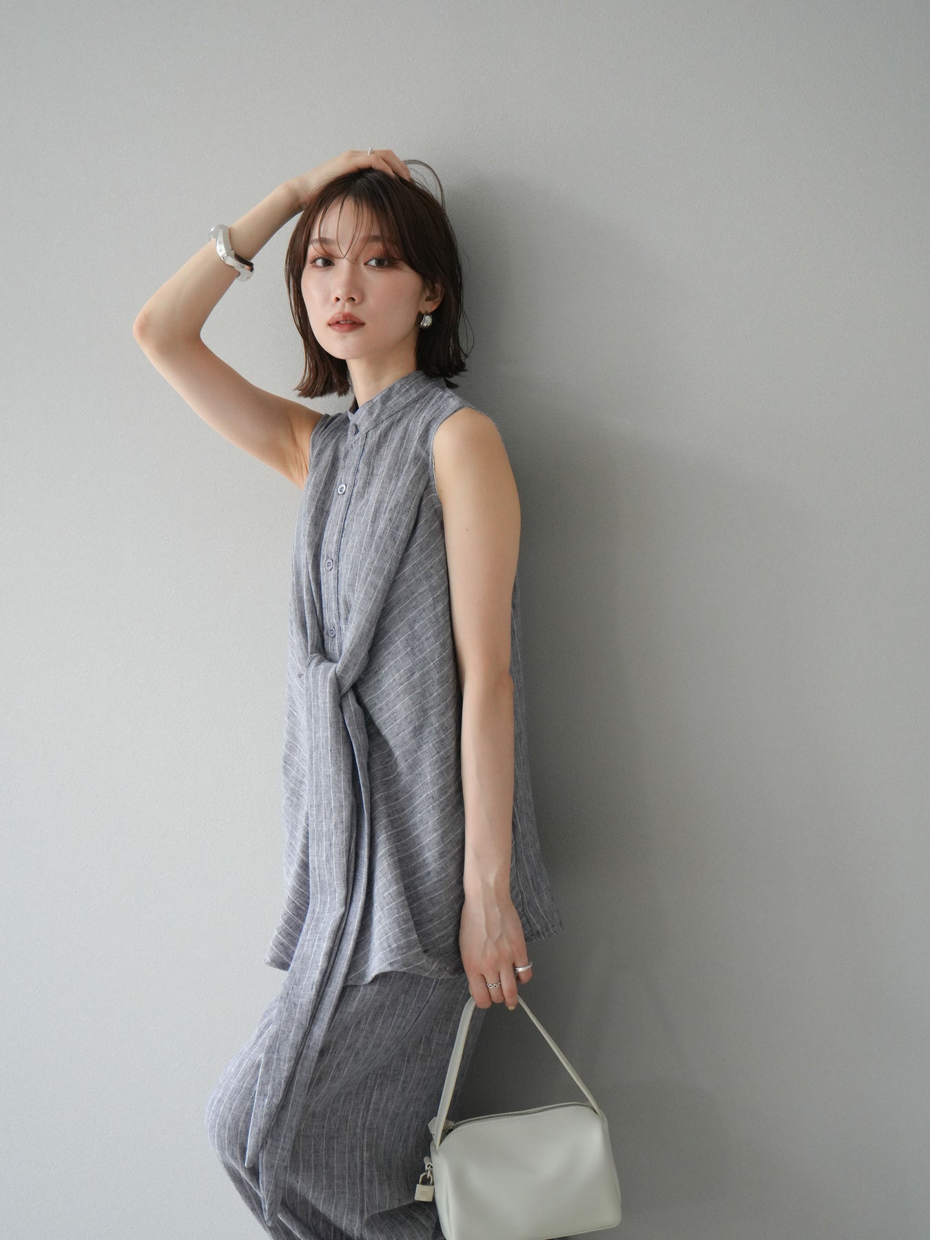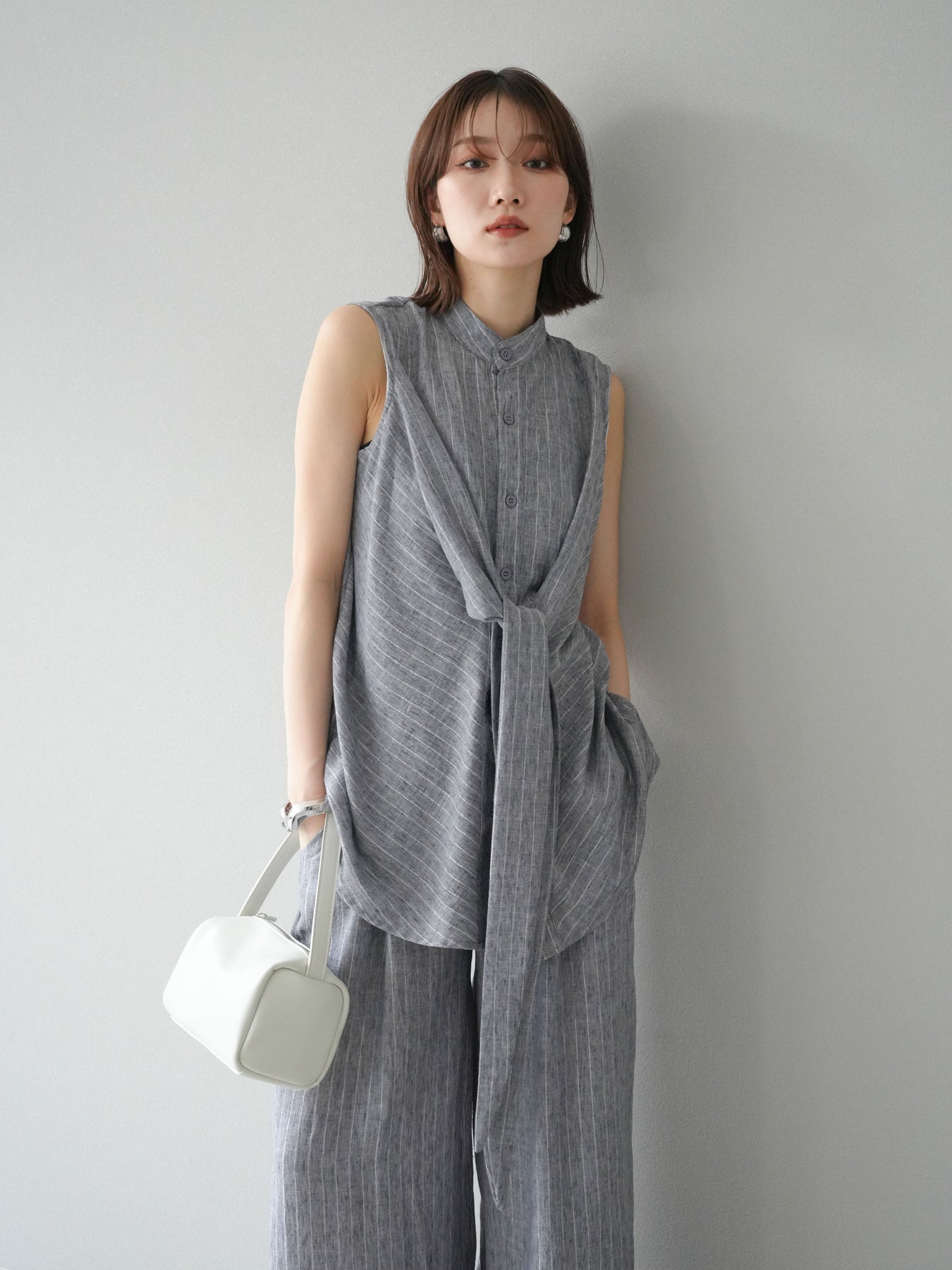 繊細なラメストライプがさりげなく輝く、ボウタイ付きブラウスとワイドパンツのセットアップ。ブラウスは比翼仕立てのフロントデザインに、フロント結びの長めボウタイがアクセント。首元をすっきり見せるバンドカラーで、上品な印象に仕上がっています。 パンツはストンと落ちるワイドシルエットで、ラメの繊細な輝きが動きに合わせて表情を変えます。ウエスト後ろはゴム仕様で、リラックス感もありながらきちんと見えが叶う一着。 セットでの着用はもちろん、それぞれ単品でも着回しやすく、デイリーからお仕事シーンまで幅広く活躍するアイテムです。 ※ボトムス、キャミソール(インナー)以外の商品は一律でインナーは付属していません。