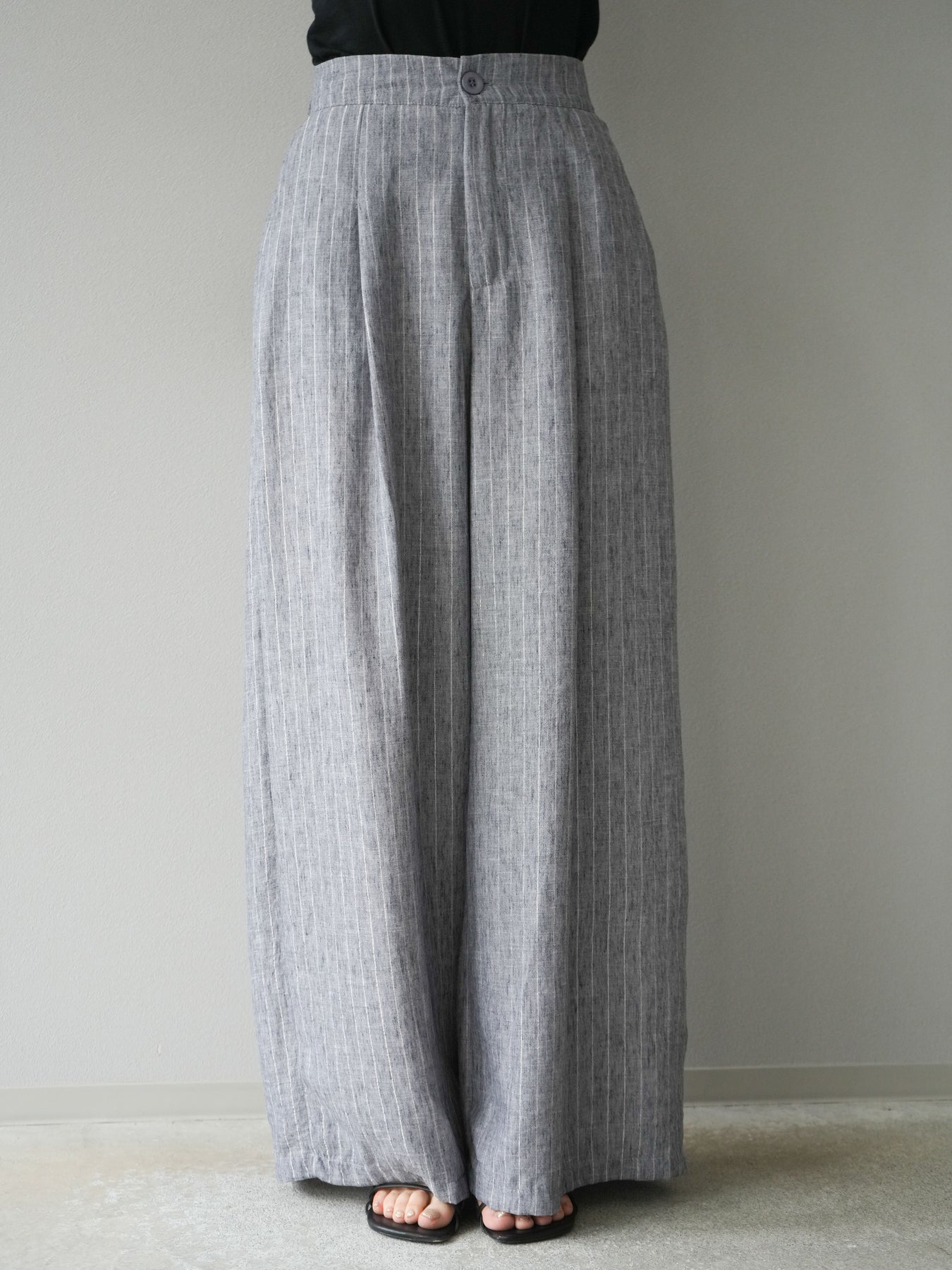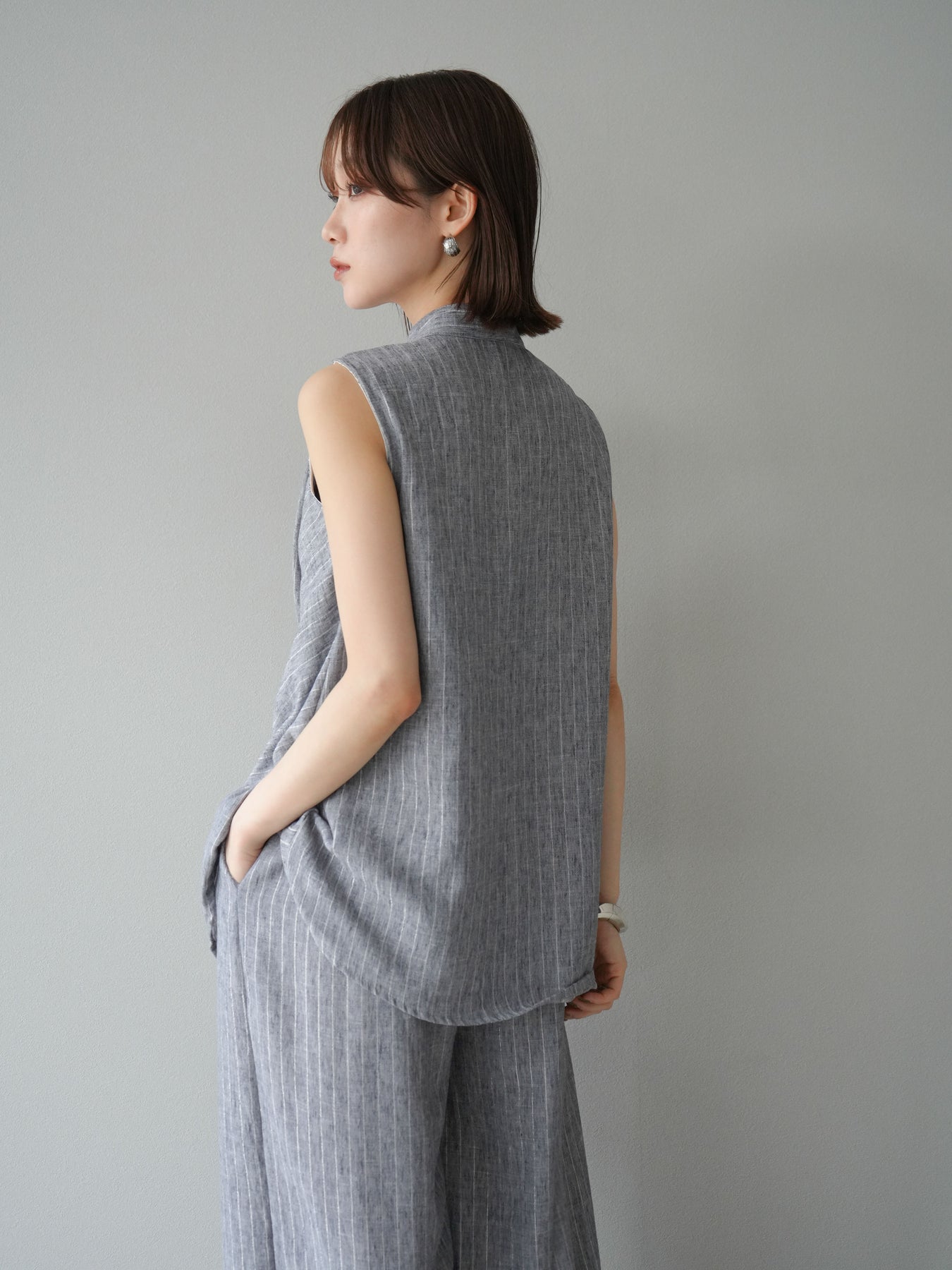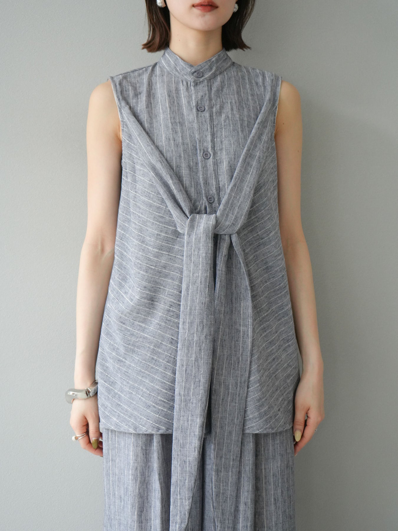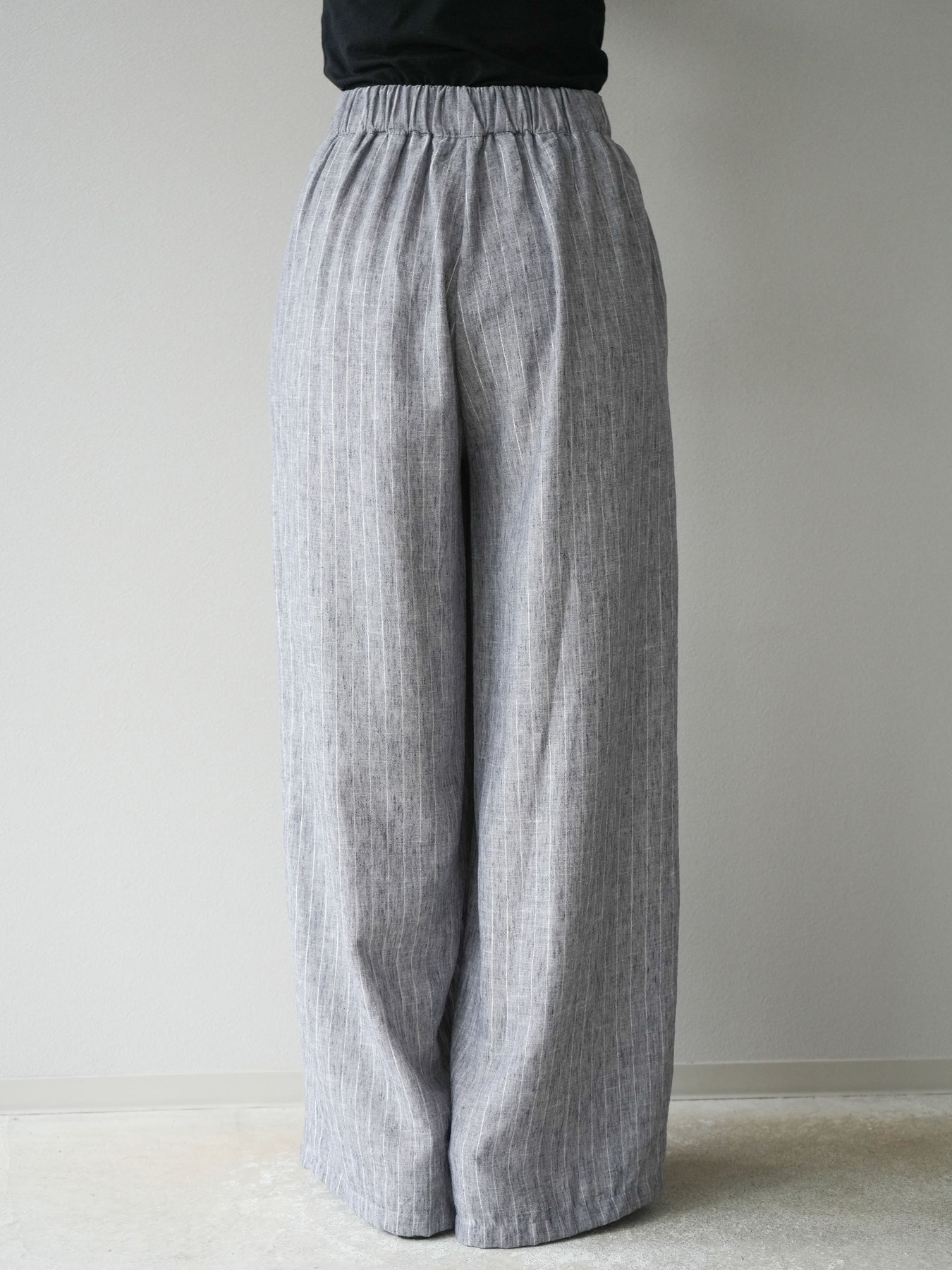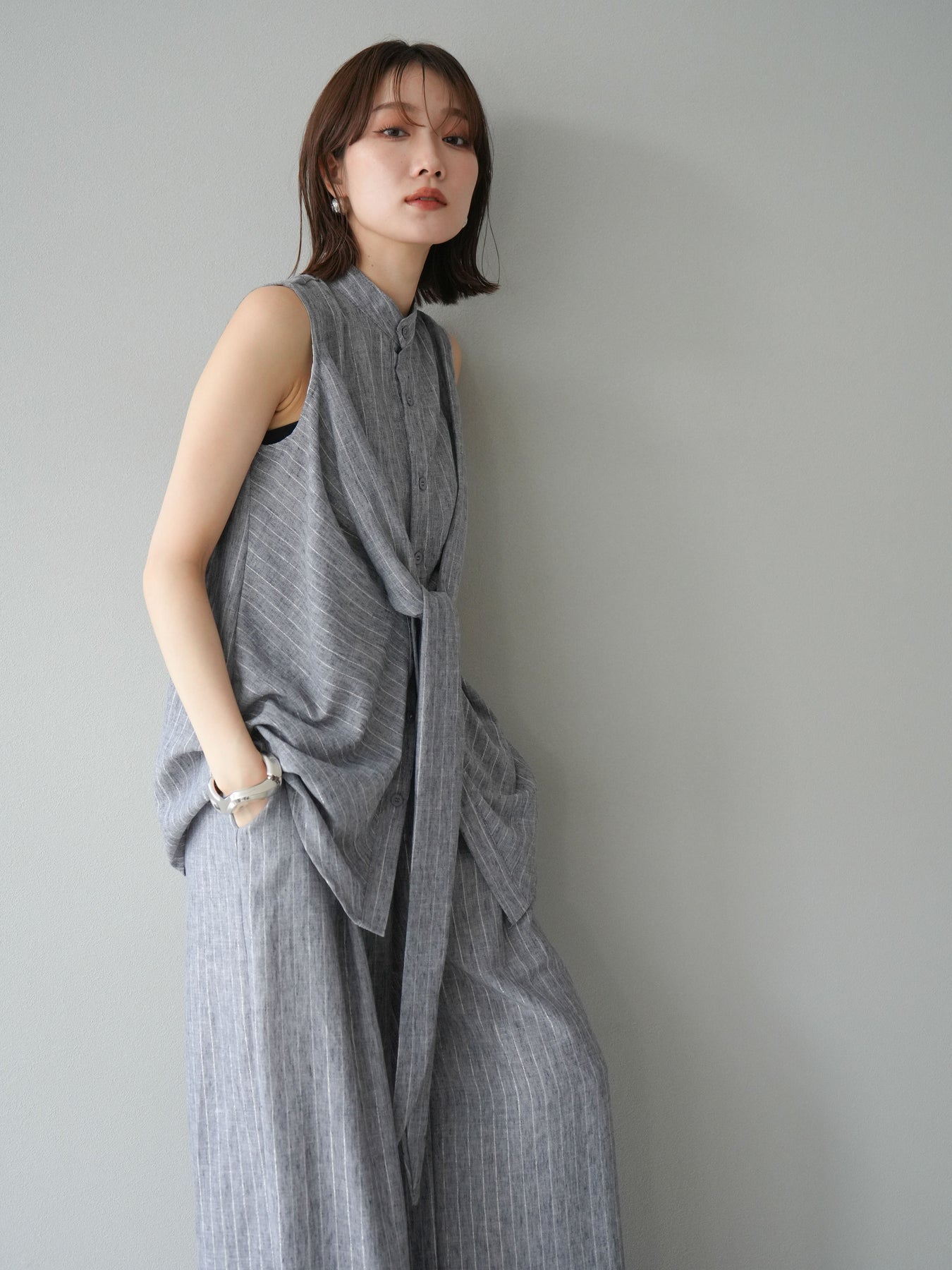繊細なラメストライプがさりげなく輝く、ボウタイ付きブラウスとワイドパンツのセットアップ。ブラウスは比翼仕立てのフロントデザインに、フロント結びの長めボウタイがアクセント。首元をすっきり見せるバンドカラーで、上品な印象に仕上がっています。 パンツはストンと落ちるワイドシルエットで、ラメの繊細な輝きが動きに合わせて表情を変えます。ウエスト後ろはゴム仕様で、リラックス感もありながらきちんと見えが叶う一着。 セットでの着用はもちろん、それぞれ単品でも着回しやすく、デイリーからお仕事シーンまで幅広く活躍するアイテムです。 ※ボトムス、キャミソール(インナー)以外の商品は一律でインナーは付属していません。