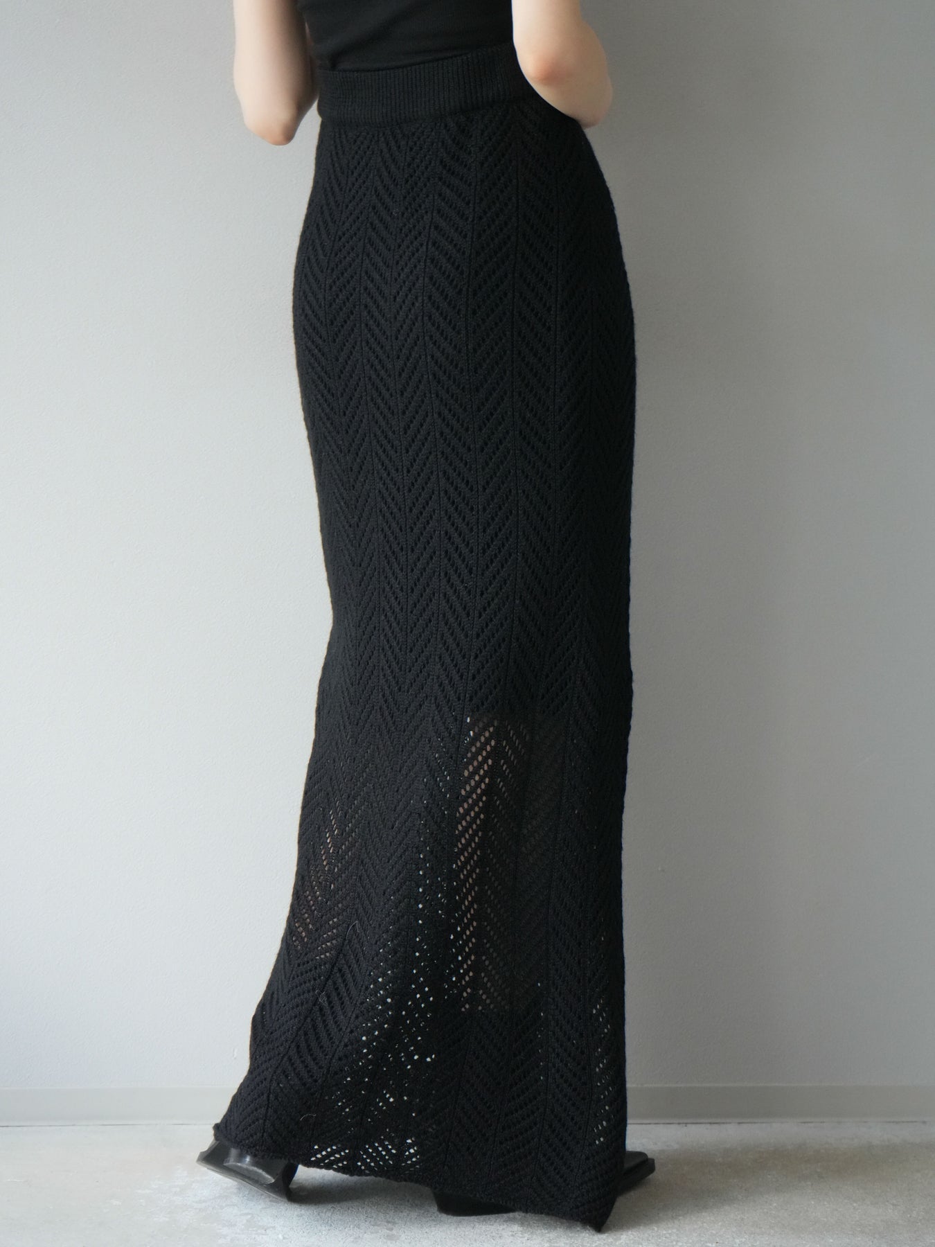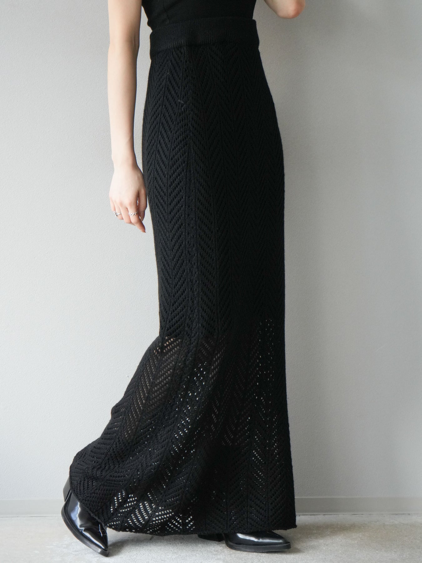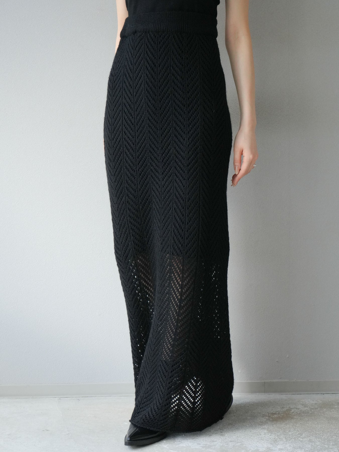 繊細な透かし編みが軽やかな印象を与えるニットスカート。縦のラインを強調する編地がすっきりとしたシルエットを演出し、女性らしい雰囲気を引き立てます。歩くたびに揺れる柔らかな風合いが上品で、シーズンレスで活躍できる一着。ウエストはゴム仕様で快適な穿き心地を叶えつつ、トップスをインしてもアウトしてもバランス良くまとまります。シンプルながらも存在感があり、カジュアルからきれいめまで幅広いコーディネートに対応可能です。