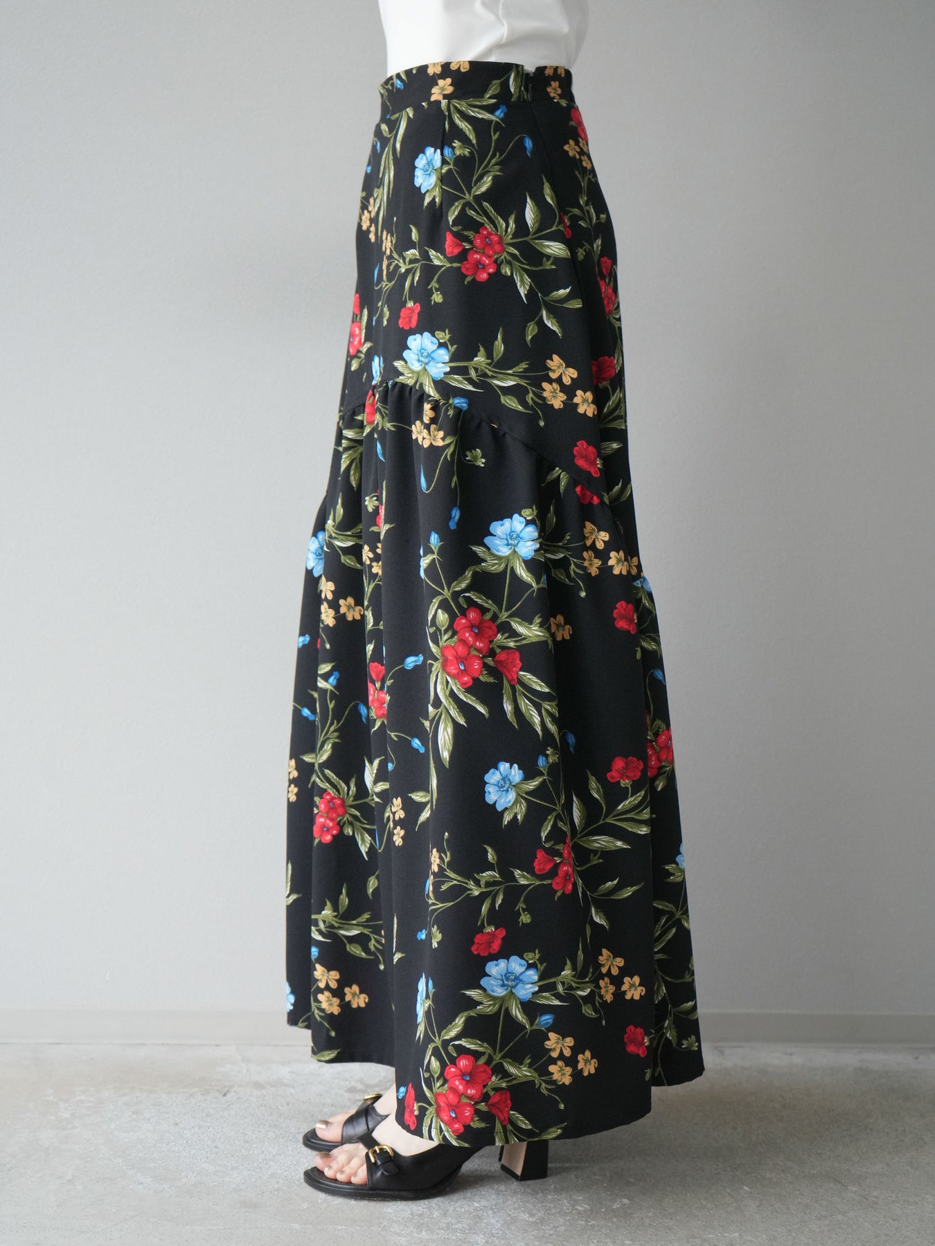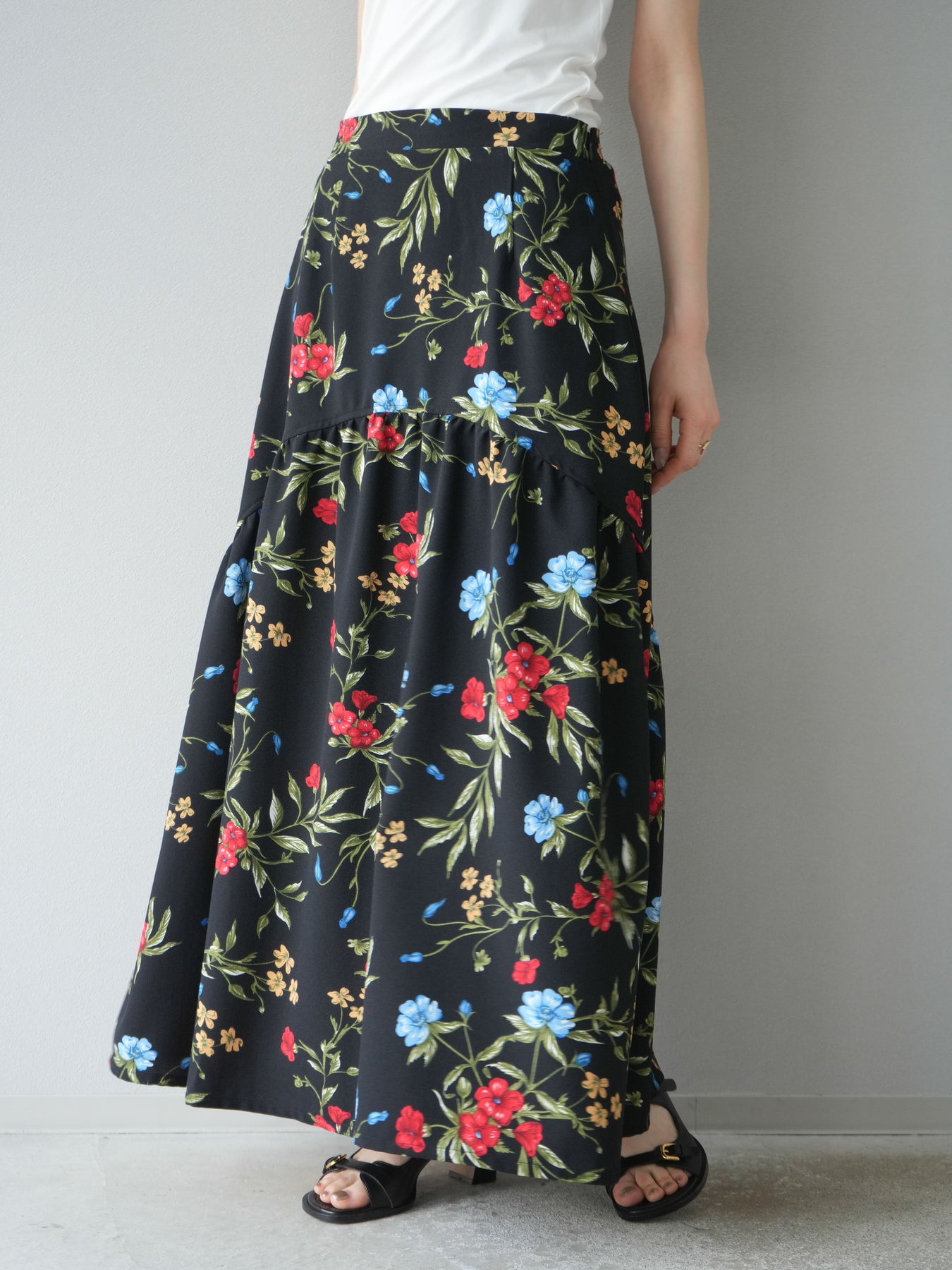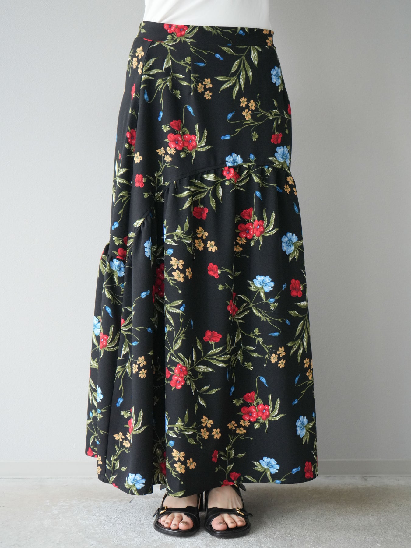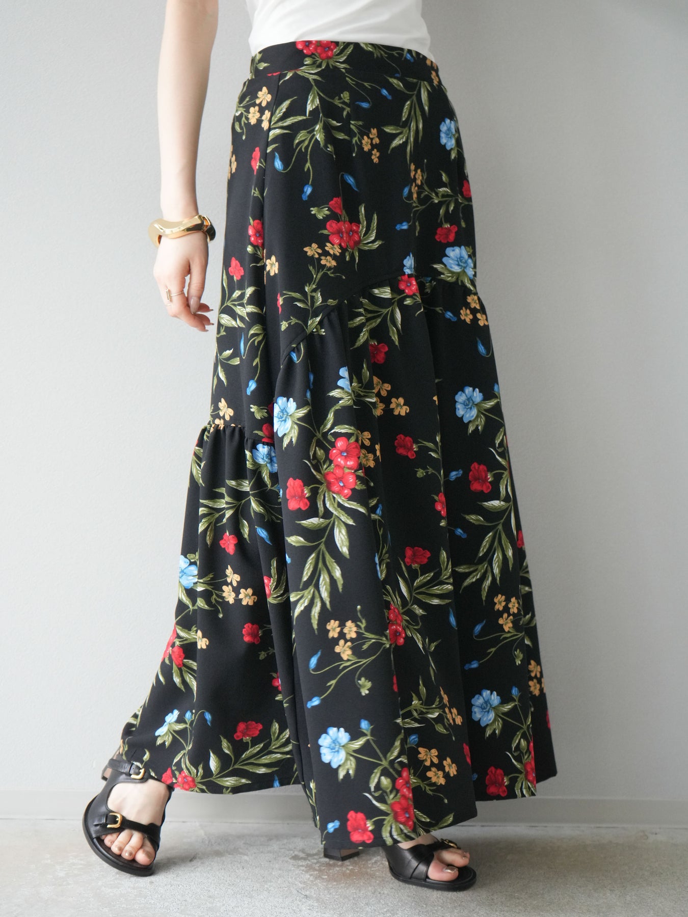 [予約]ボタニカル柄ティアードスカート/ブラック