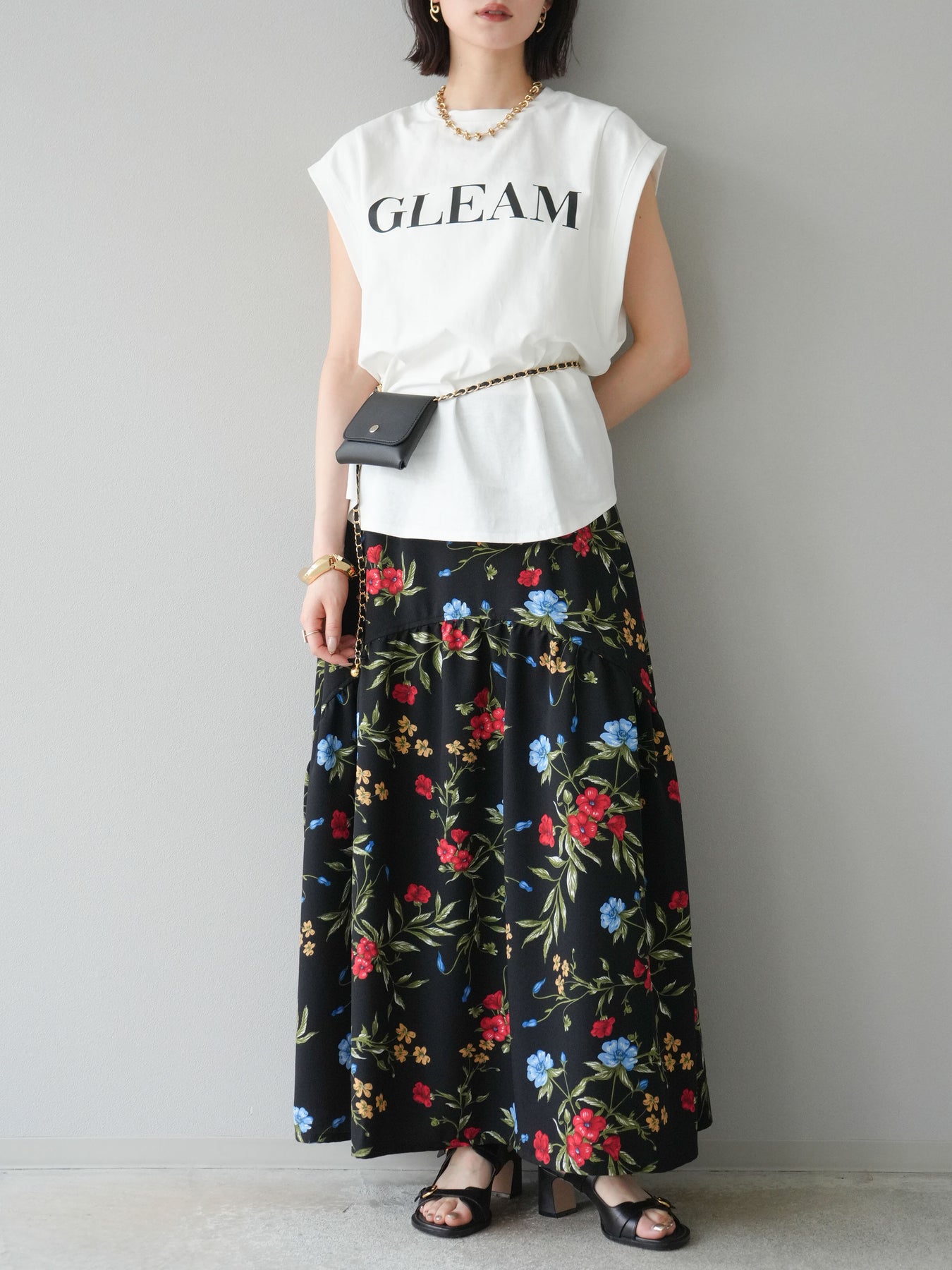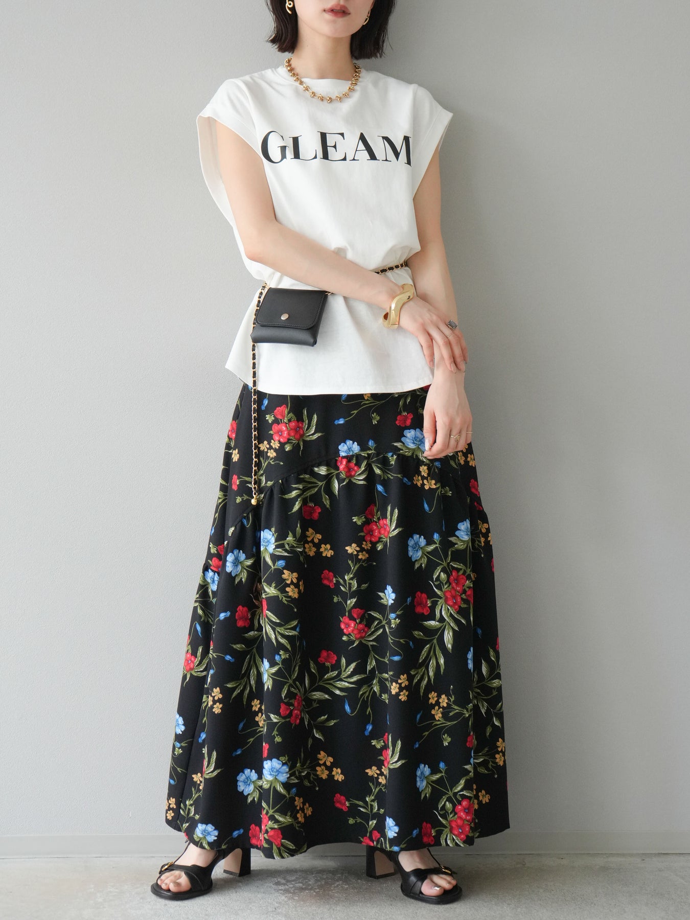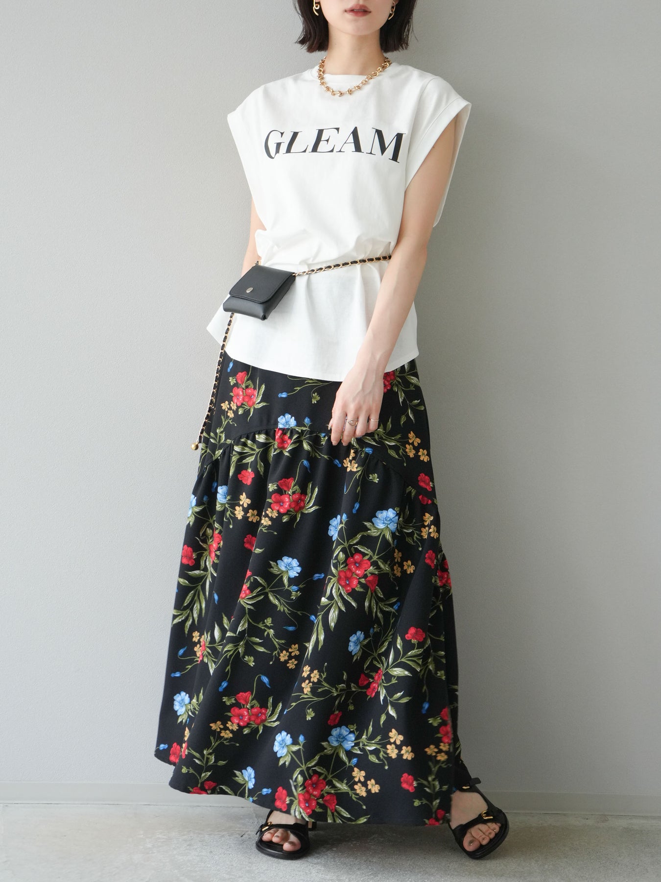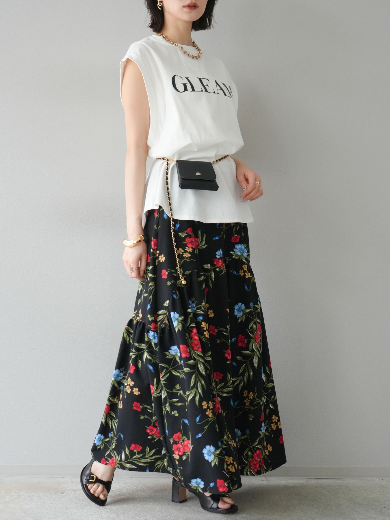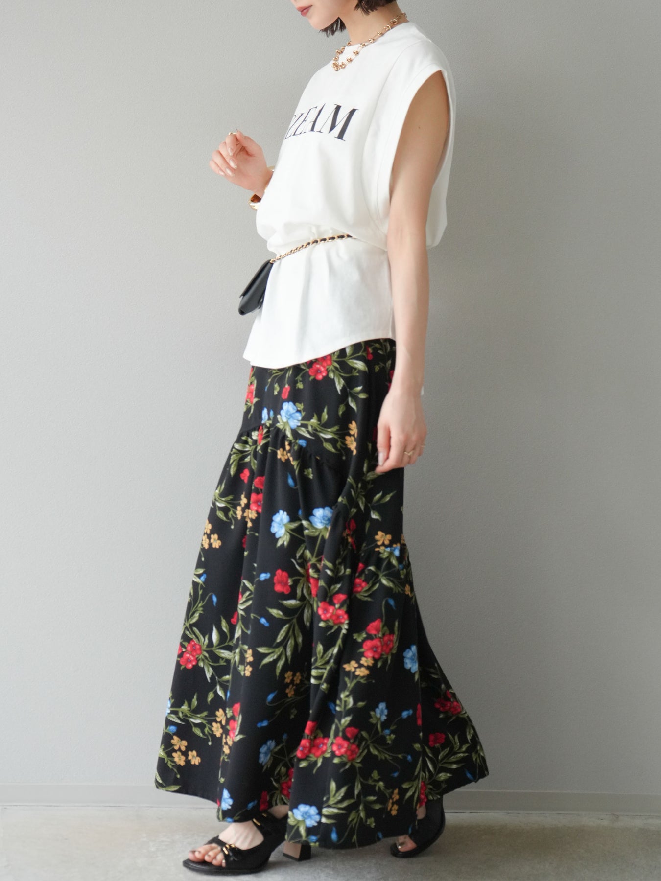 [予約]ボタニカル柄ティアードスカート/ブラック
