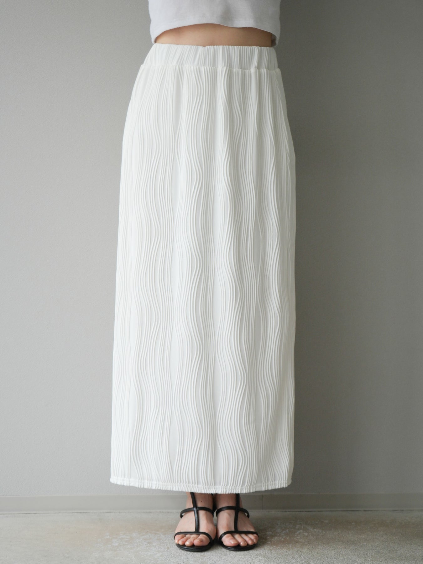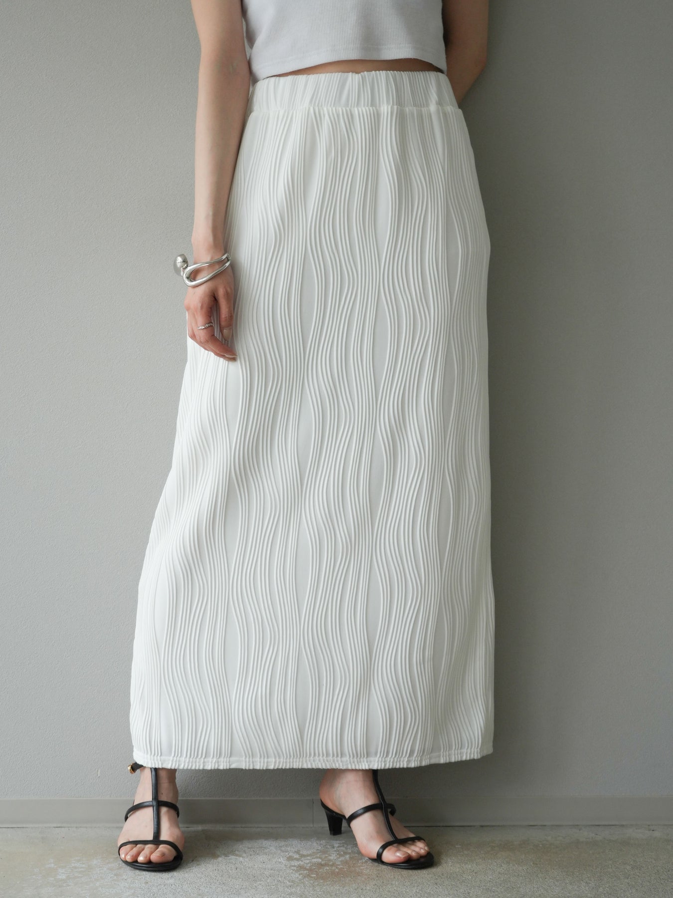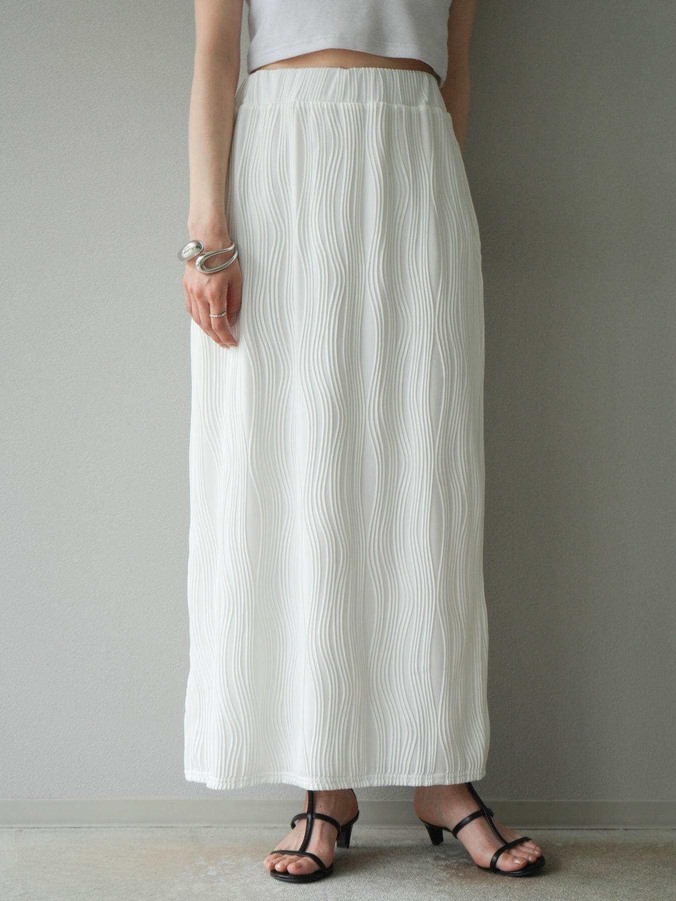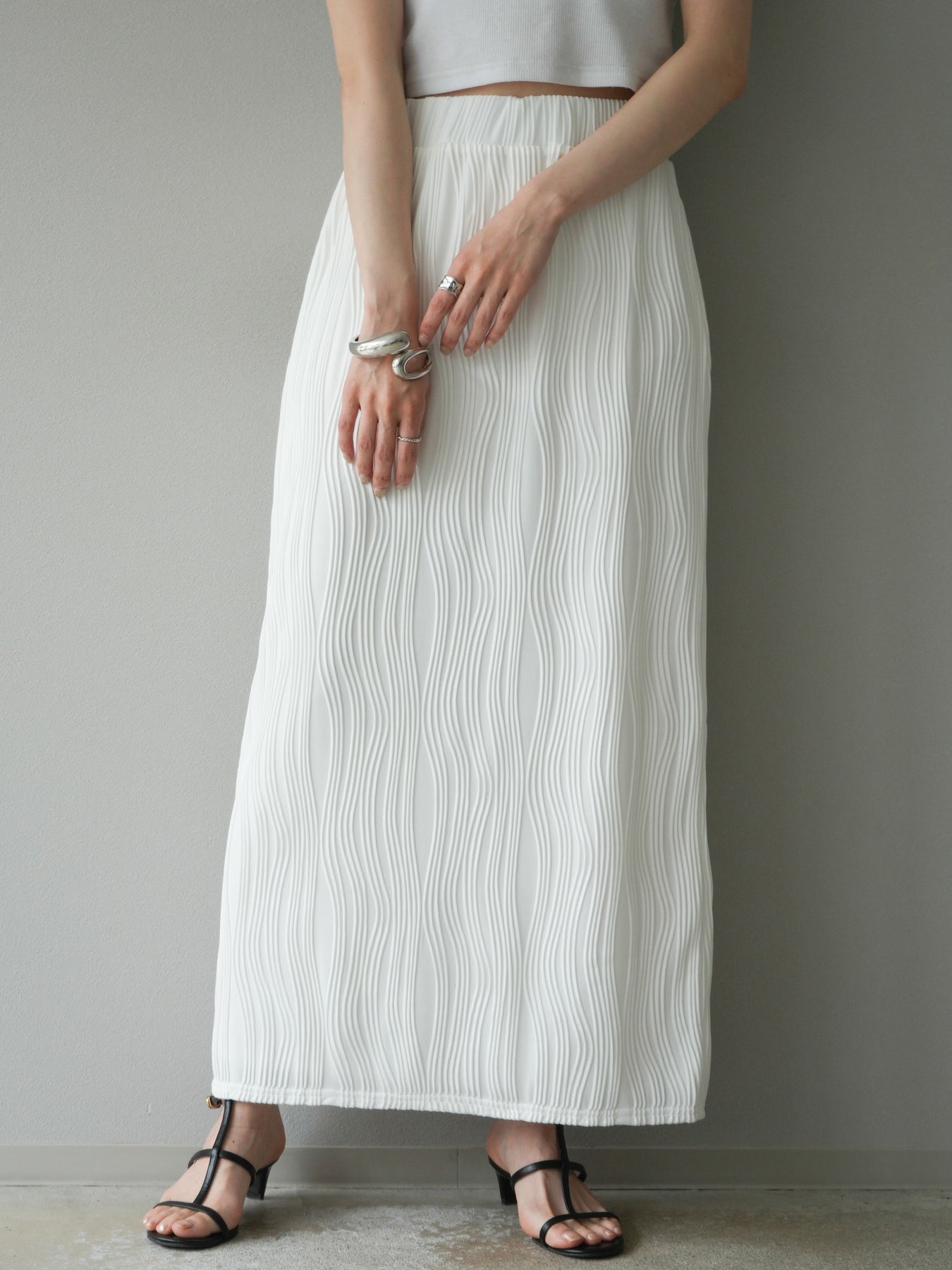 立体的なウェーブ状パイピング素材が特徴のタイトスカート。細かい凹凸のある生地感が動きに表情を加え、シンプルながらも存在感のある1枚に仕上がっています。ウエストはゴム仕様でストレスフリーな穿き心地を実現しながら、すっきりとしたIラインシルエットで美脚効果も◎。カジュアルにもモードにも着回し可能なアイテムで、同素材のトップスとセットアップで着用すればより洗練されたスタイリングに。 ※ボトムス、キャミソール(インナー)以外の商品は一律でインナーは付属していません。