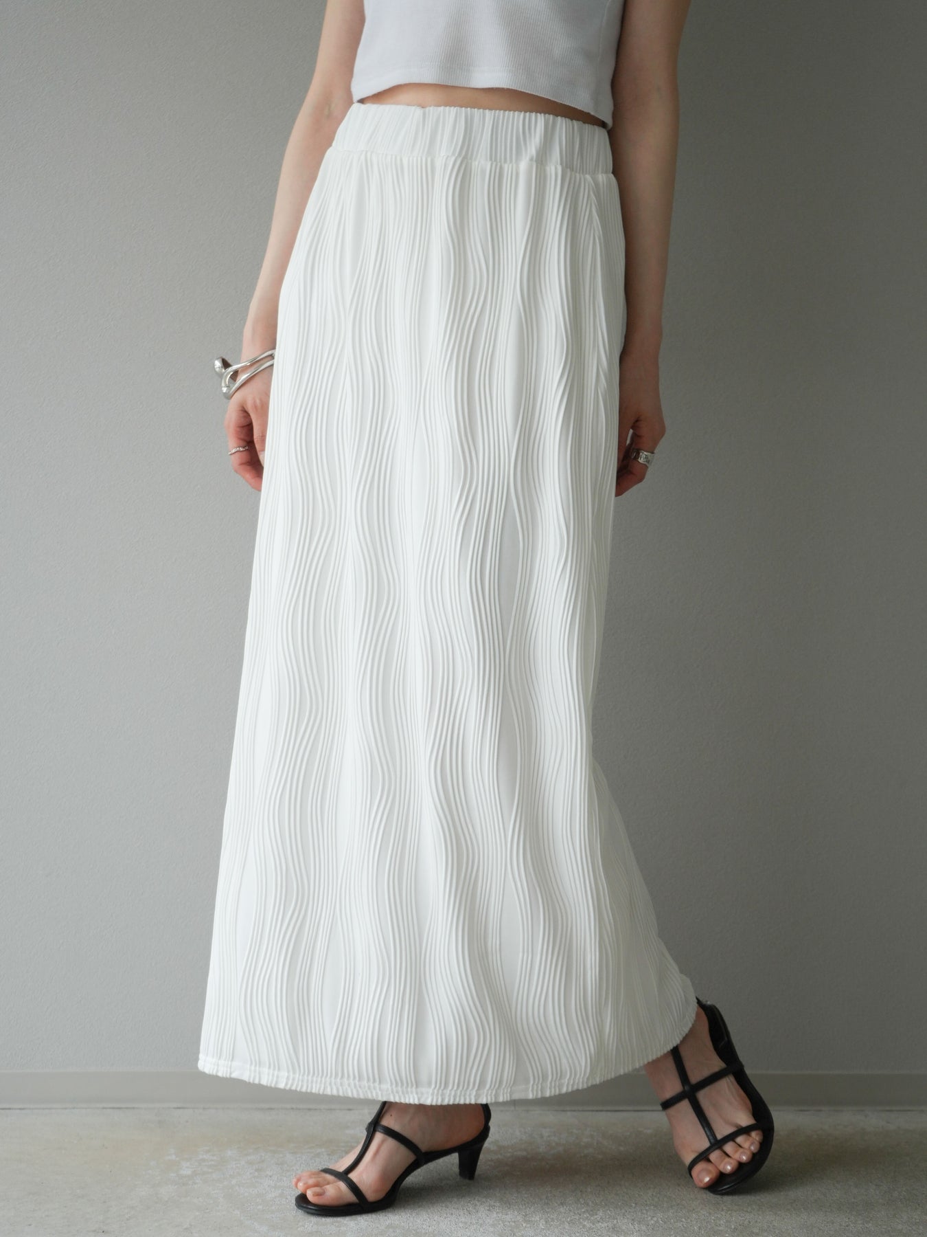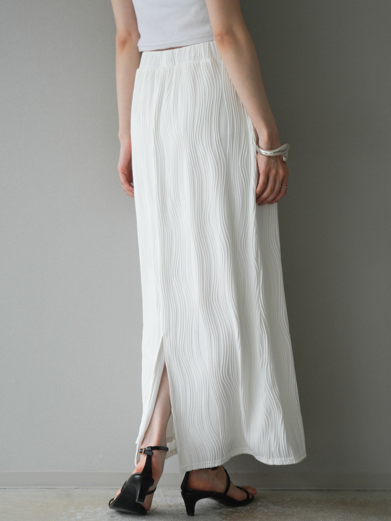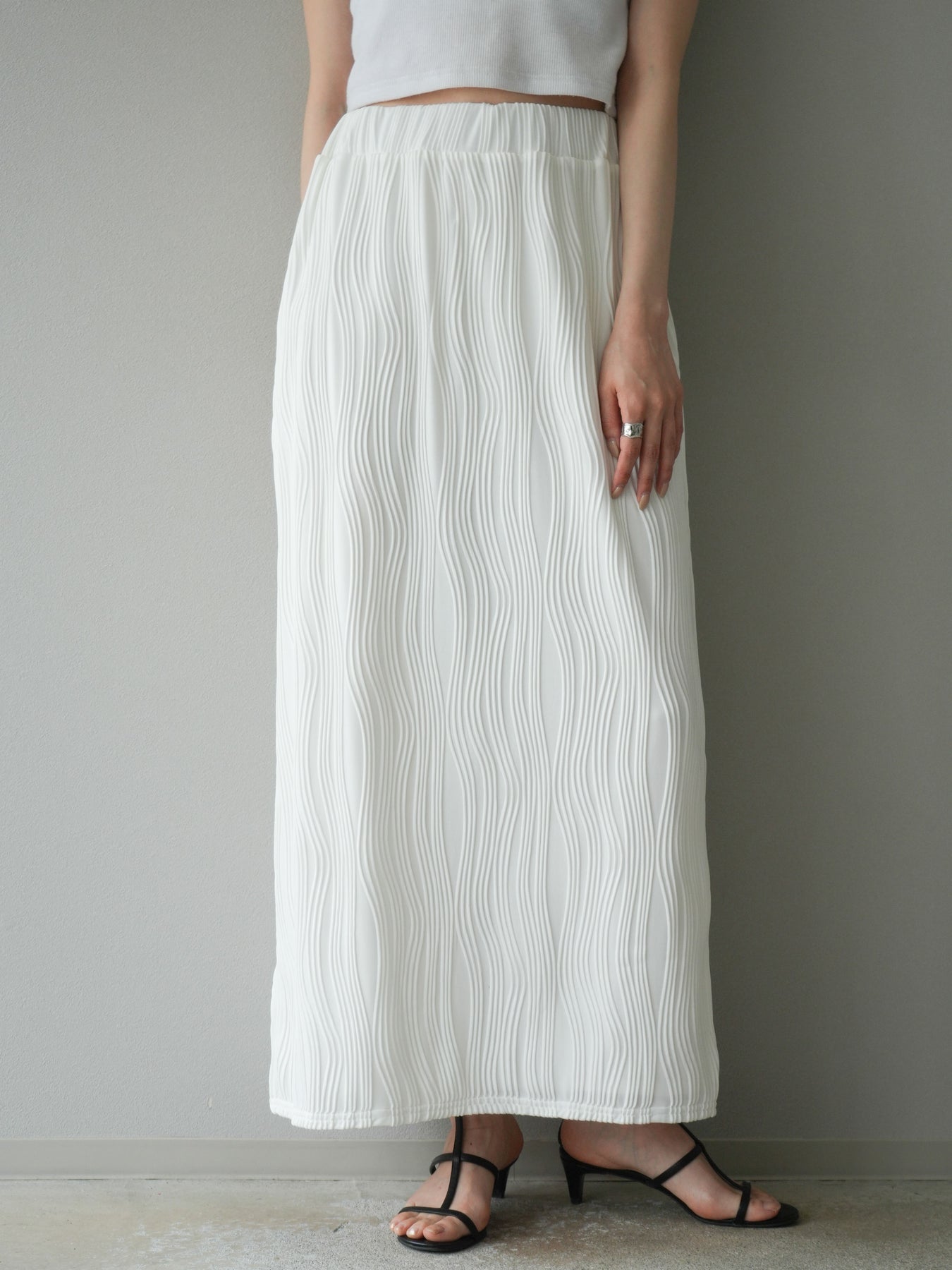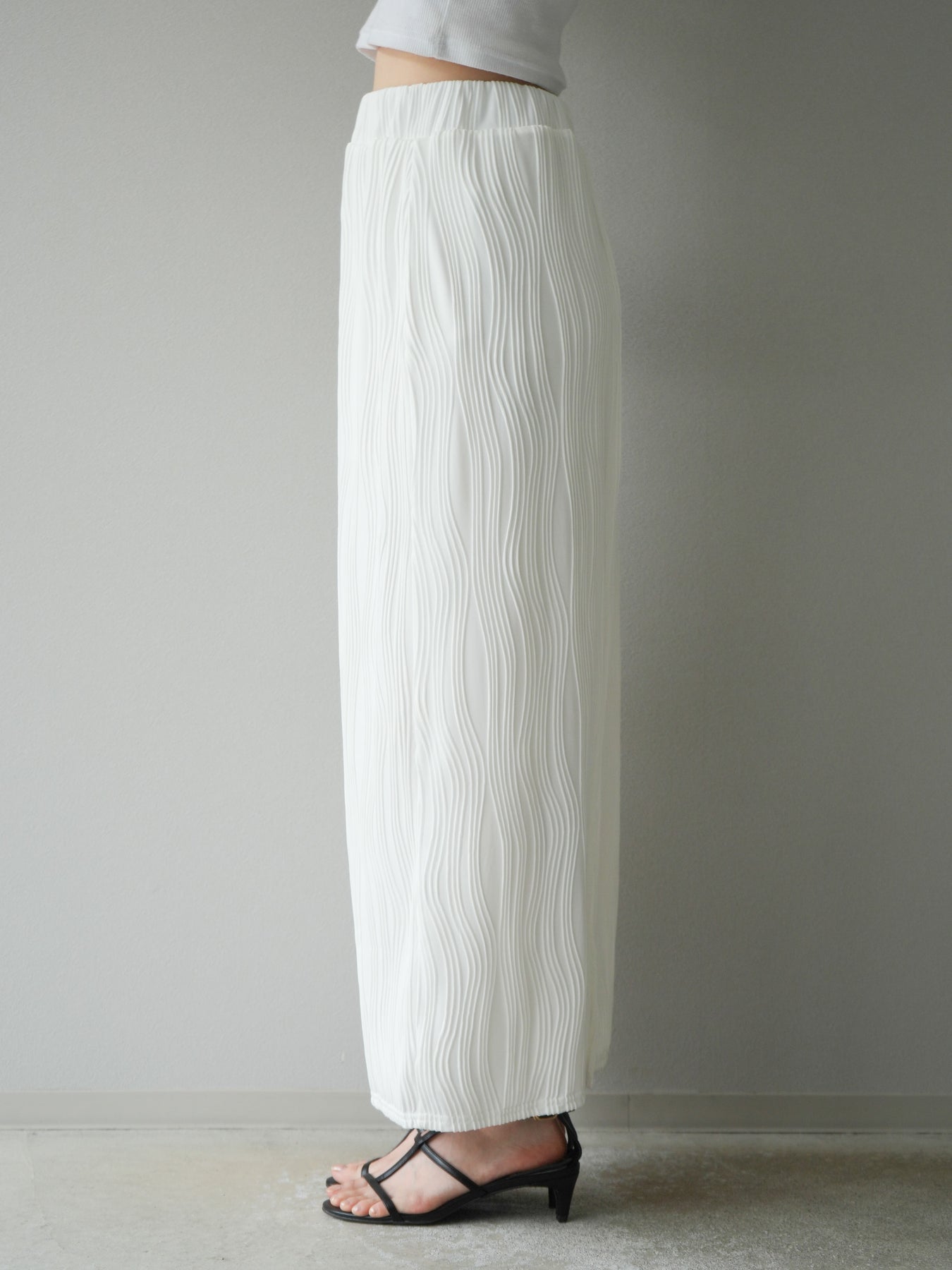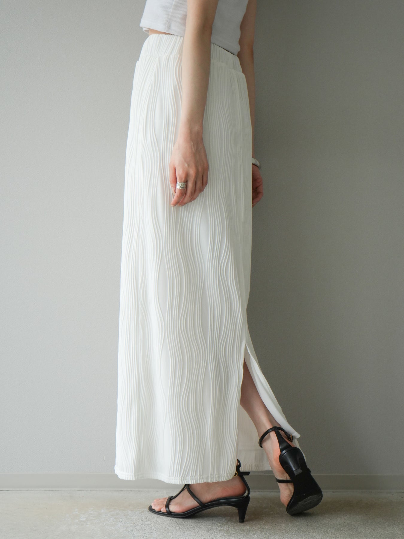 立体的なウェーブ状パイピング素材が特徴のタイトスカート。細かい凹凸のある生地感が動きに表情を加え、シンプルながらも存在感のある1枚に仕上がっています。ウエストはゴム仕様でストレスフリーな穿き心地を実現しながら、すっきりとしたIラインシルエットで美脚効果も◎。カジュアルにもモードにも着回し可能なアイテムで、同素材のトップスとセットアップで着用すればより洗練されたスタイリングに。 ※ボトムス、キャミソール(インナー)以外の商品は一律でインナーは付属していません。