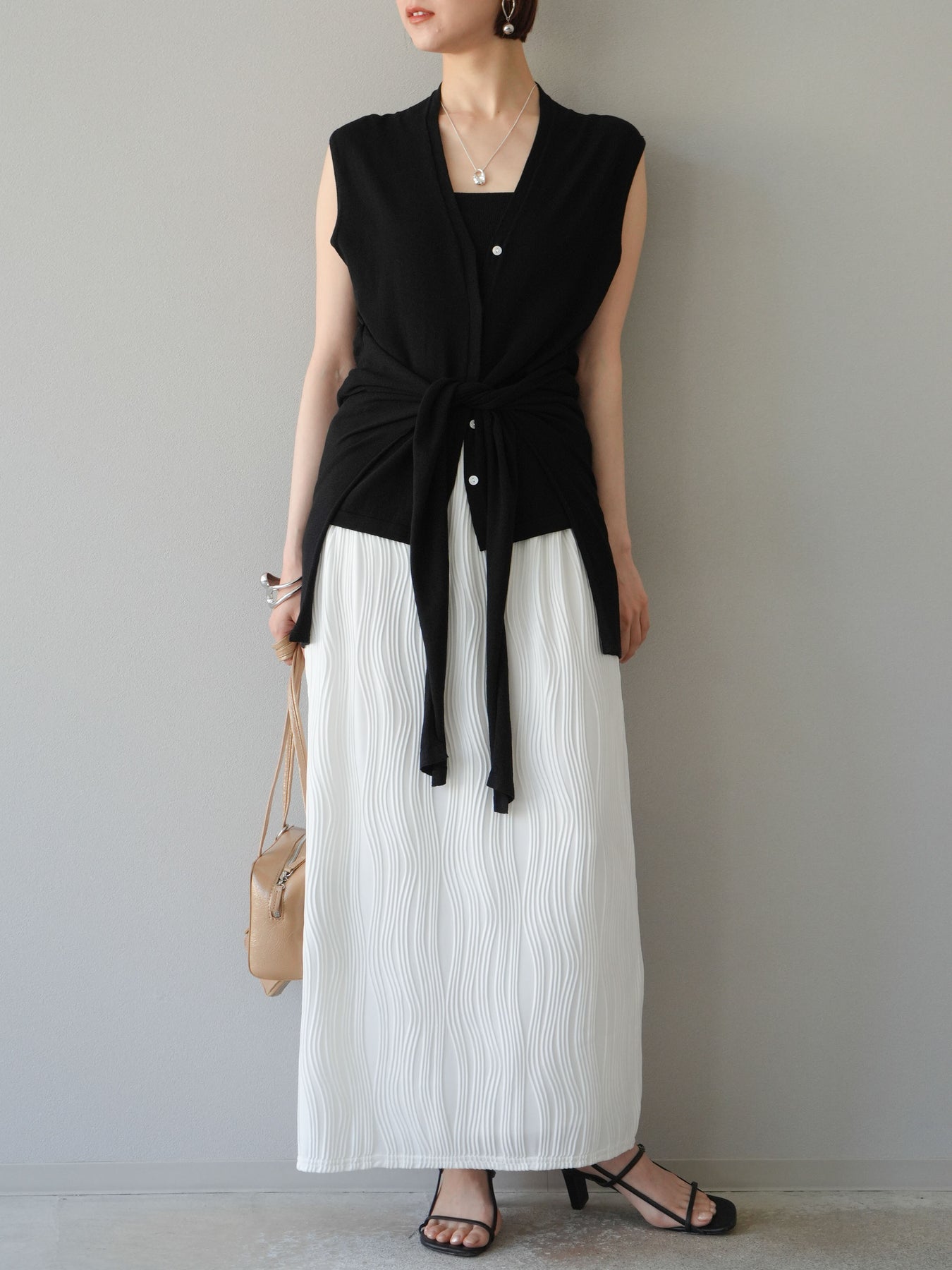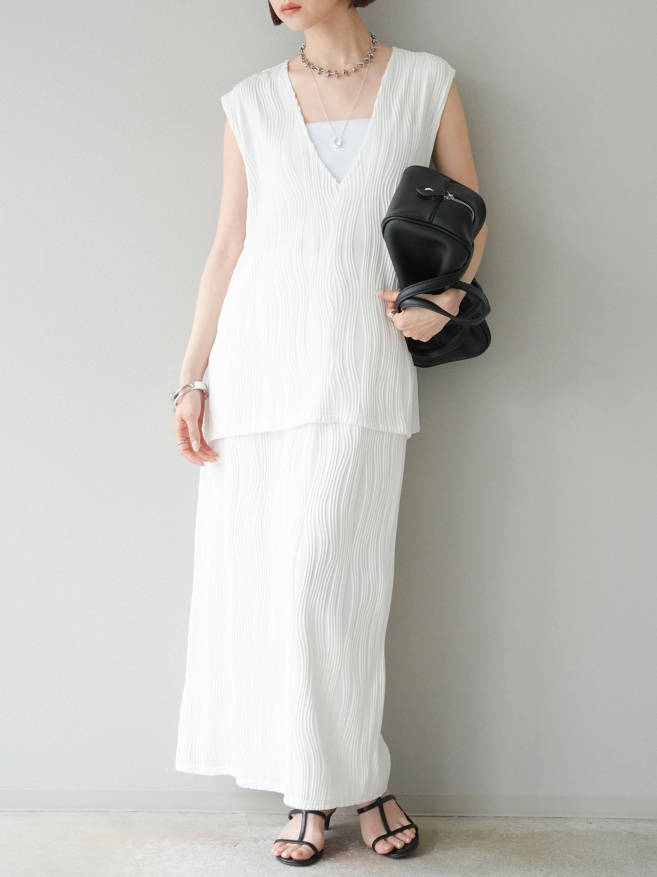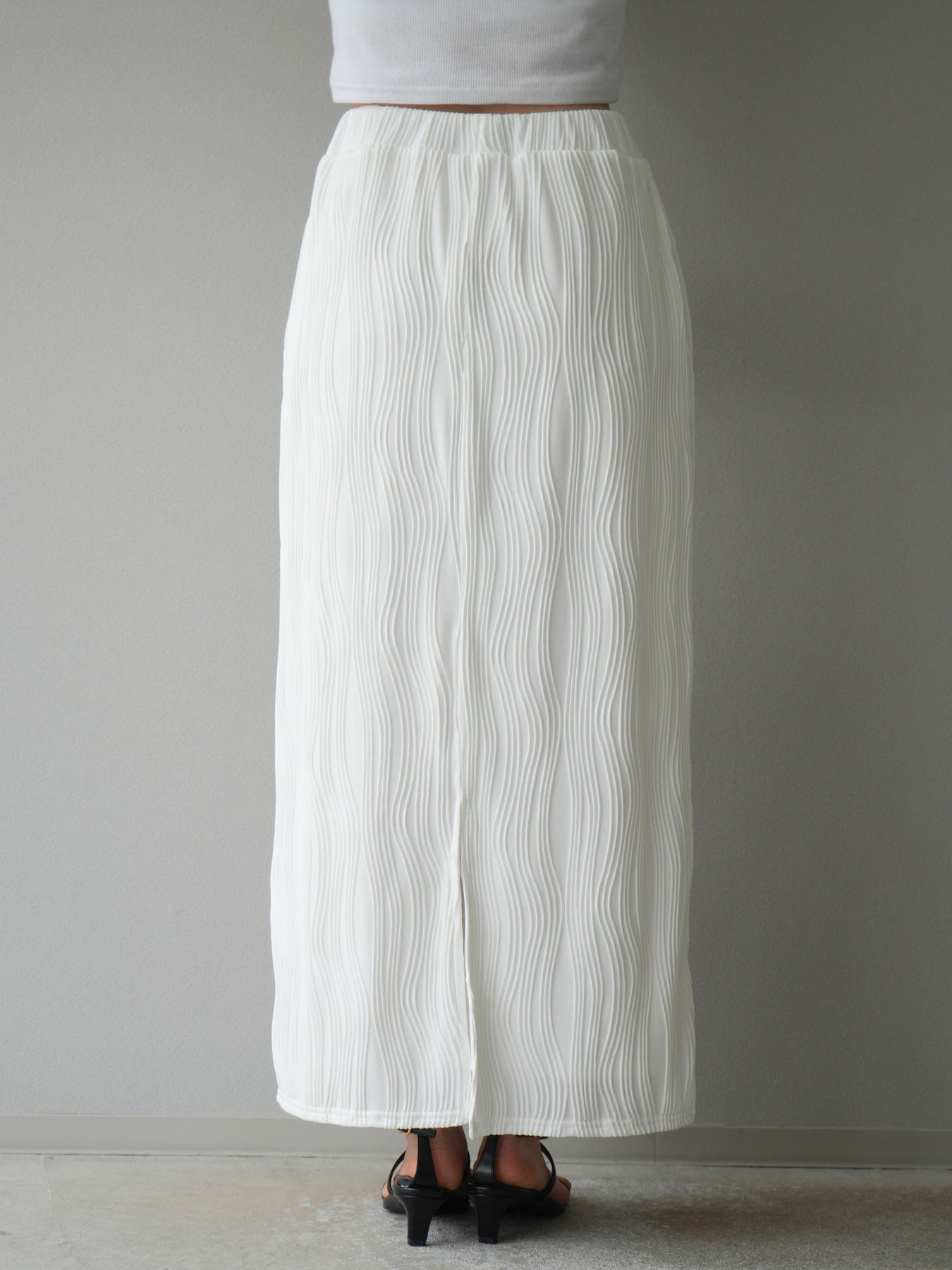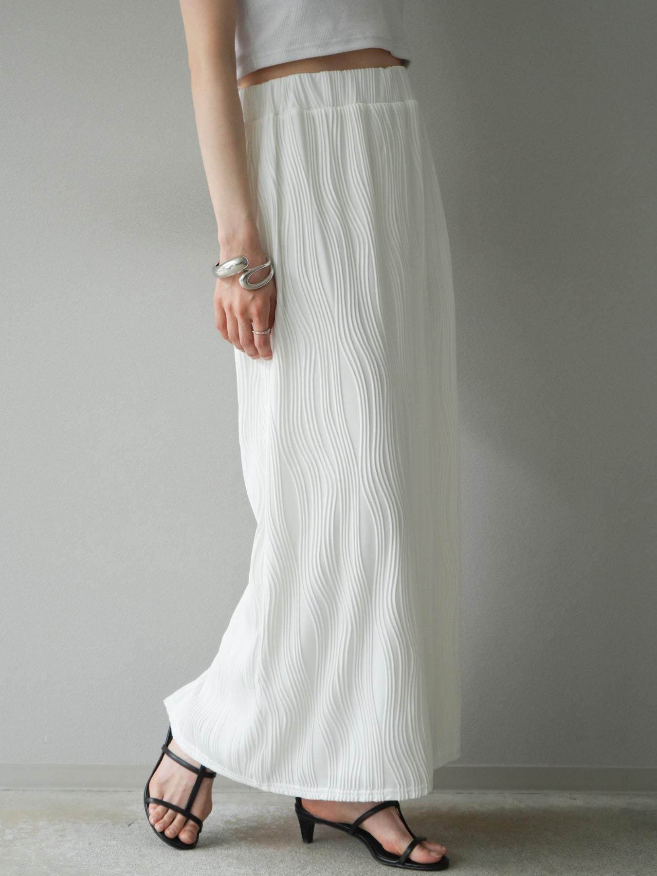 立体的なウェーブ状パイピング素材が特徴のタイトスカート。細かい凹凸のある生地感が動きに表情を加え、シンプルながらも存在感のある1枚に仕上がっています。ウエストはゴム仕様でストレスフリーな穿き心地を実現しながら、すっきりとしたIラインシルエットで美脚効果も◎。カジュアルにもモードにも着回し可能なアイテムで、同素材のトップスとセットアップで着用すればより洗練されたスタイリングに。 ※ボトムス、キャミソール(インナー)以外の商品は一律でインナーは付属していません。
