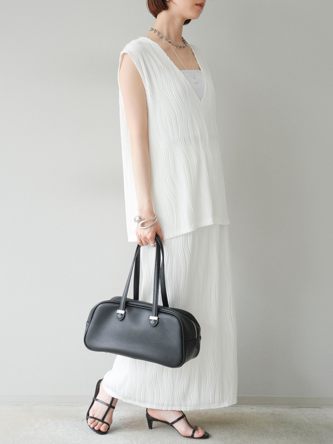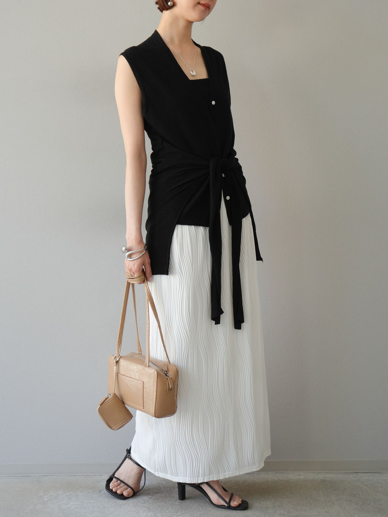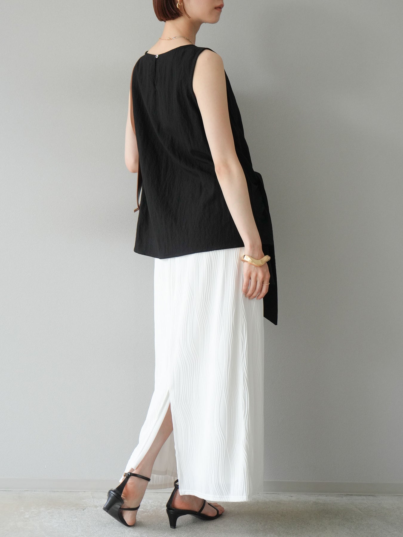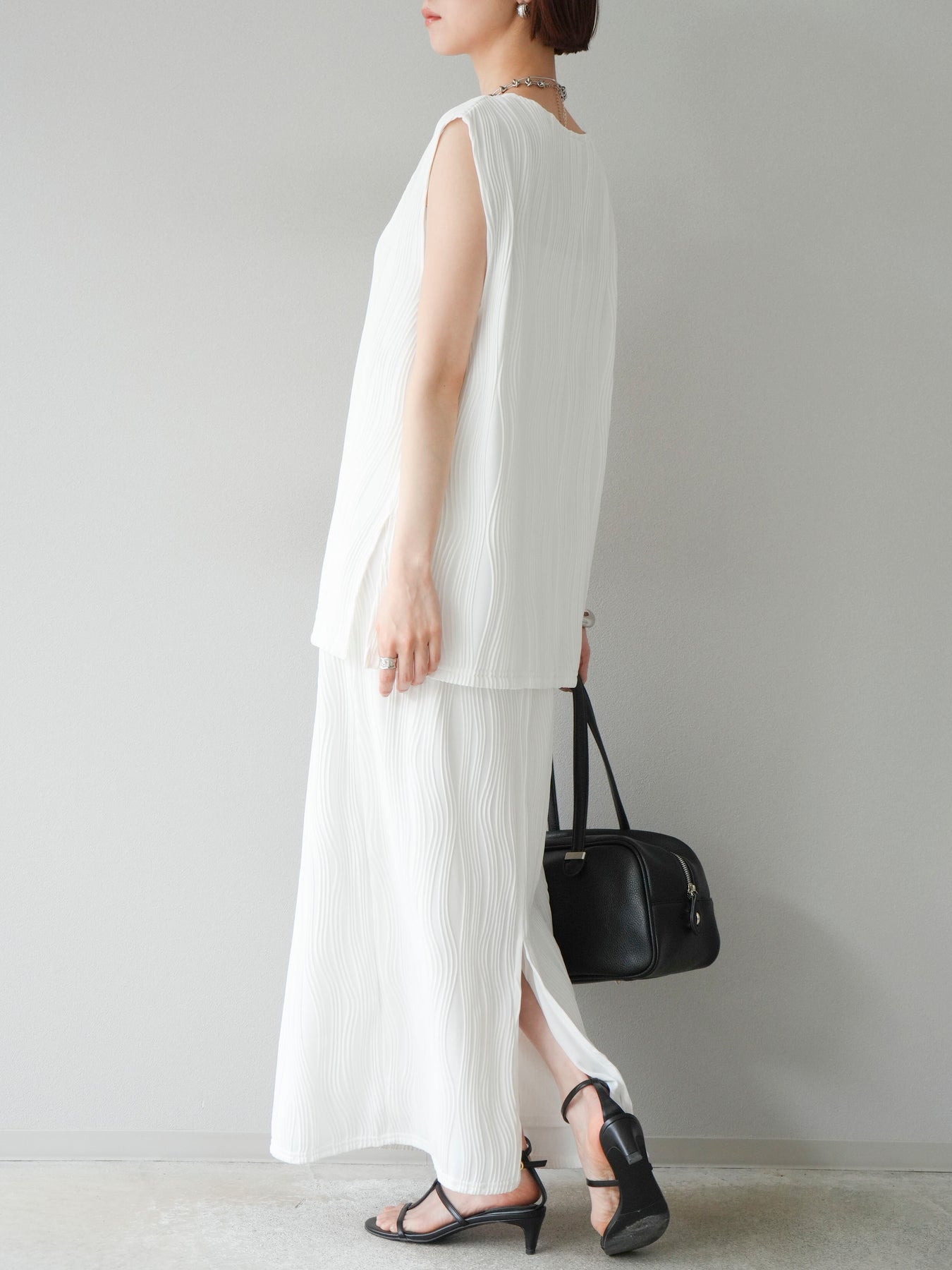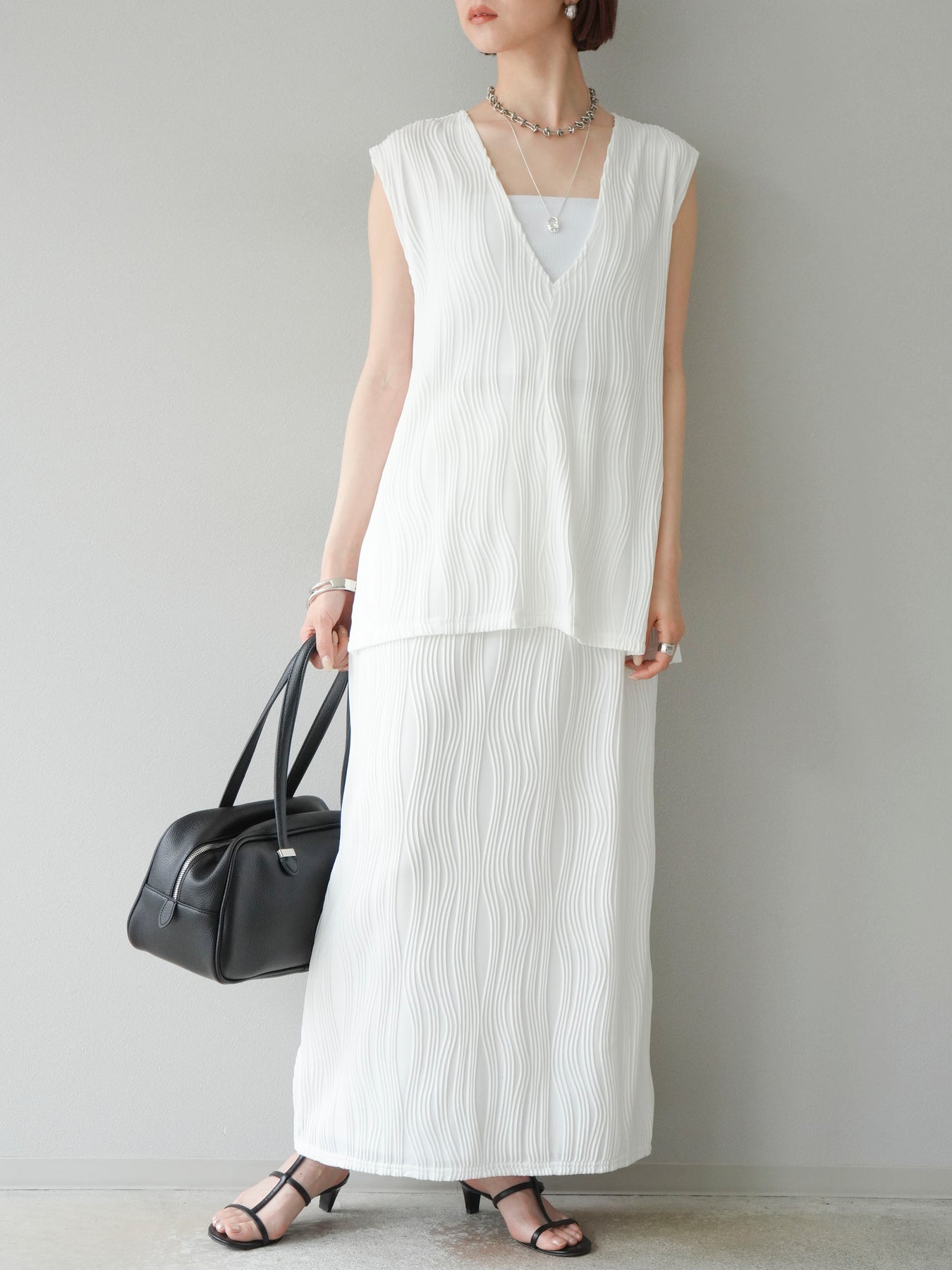 立体的なウェーブ状パイピング素材が特徴のタイトスカート。細かい凹凸のある生地感が動きに表情を加え、シンプルながらも存在感のある1枚に仕上がっています。ウエストはゴム仕様でストレスフリーな穿き心地を実現しながら、すっきりとしたIラインシルエットで美脚効果も◎。カジュアルにもモードにも着回し可能なアイテムで、同素材のトップスとセットアップで着用すればより洗練されたスタイリングに。 ※ボトムス、キャミソール(インナー)以外の商品は一律でインナーは付属していません。