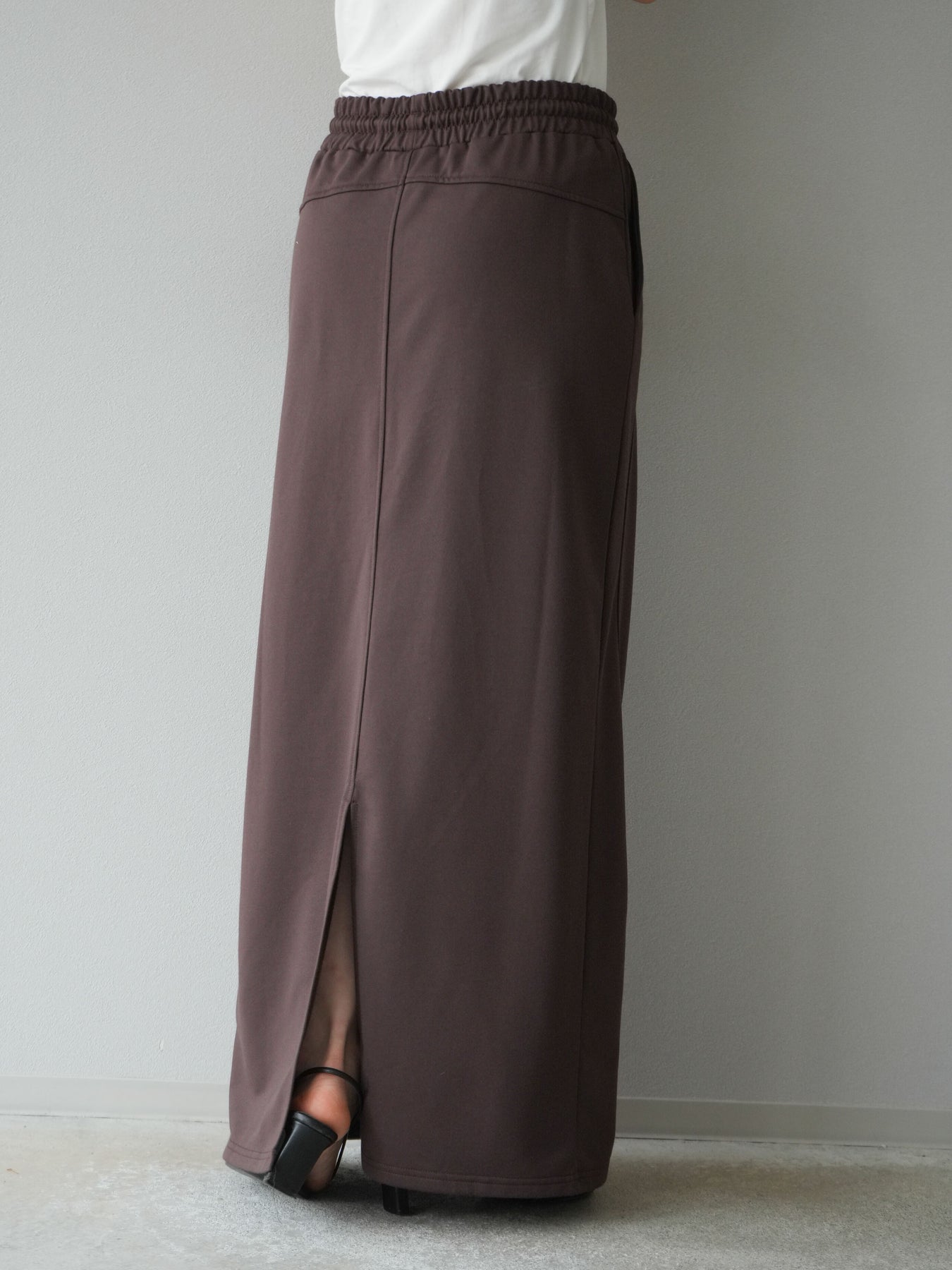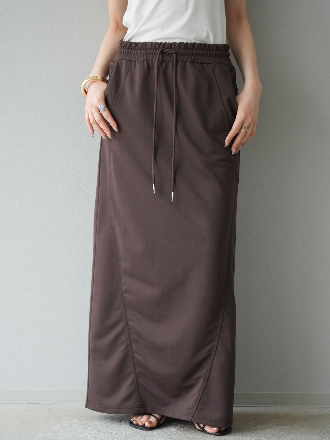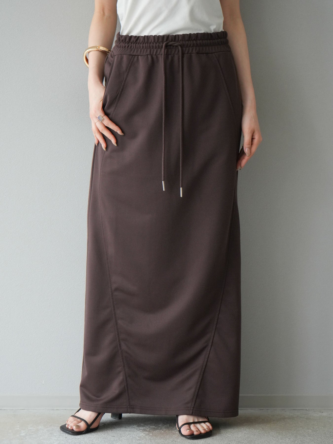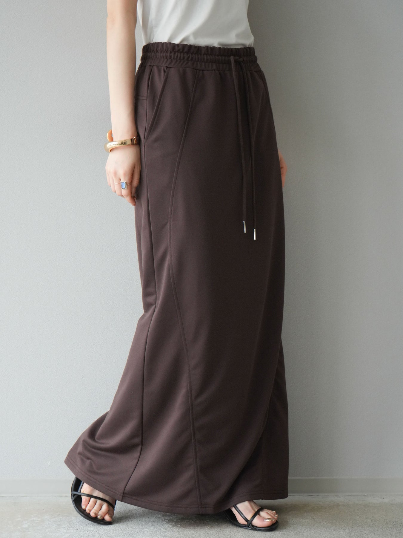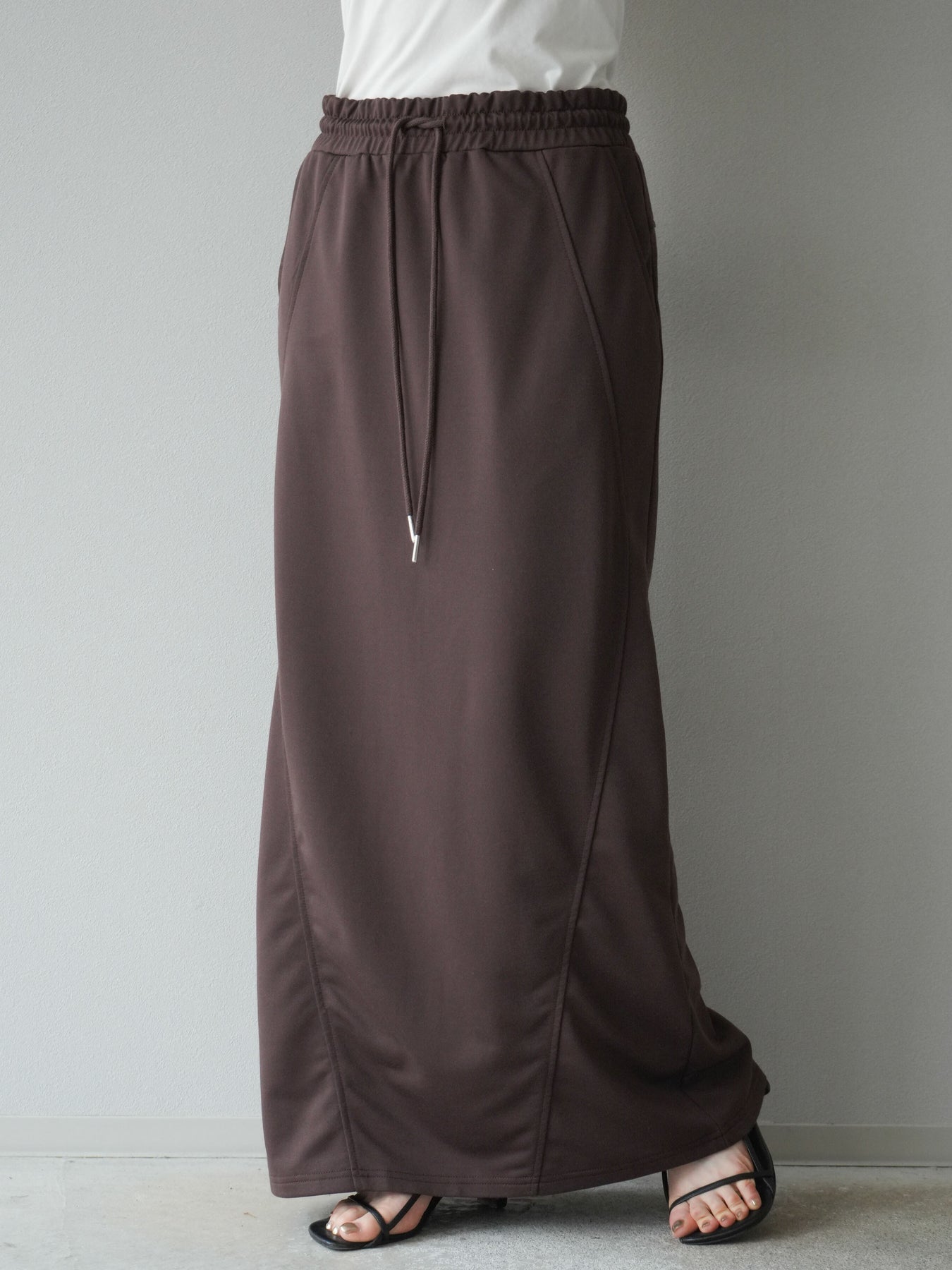 程よい厚みと柔らかな肌触りが魅力の、スウェットロングスカート。カジュアルなスウェット素材ながらも、縦に入った切替ラインがスタイルアップを叶え、すっきりとしたIラインシルエットを演出します。ウエストは総ゴム&ドロスト仕様で、リラクシーかつ快適な履き心地。スニーカーを合わせてラフに着こなすのはもちろん、ヒールやシャツと合わせてきれいめカジュアルにも。シーズンレスで活躍する、万能なデイリーボトムです。 ※ボトムス、キャミソール(インナー)以外の商品は一律でインナーは付属していません。