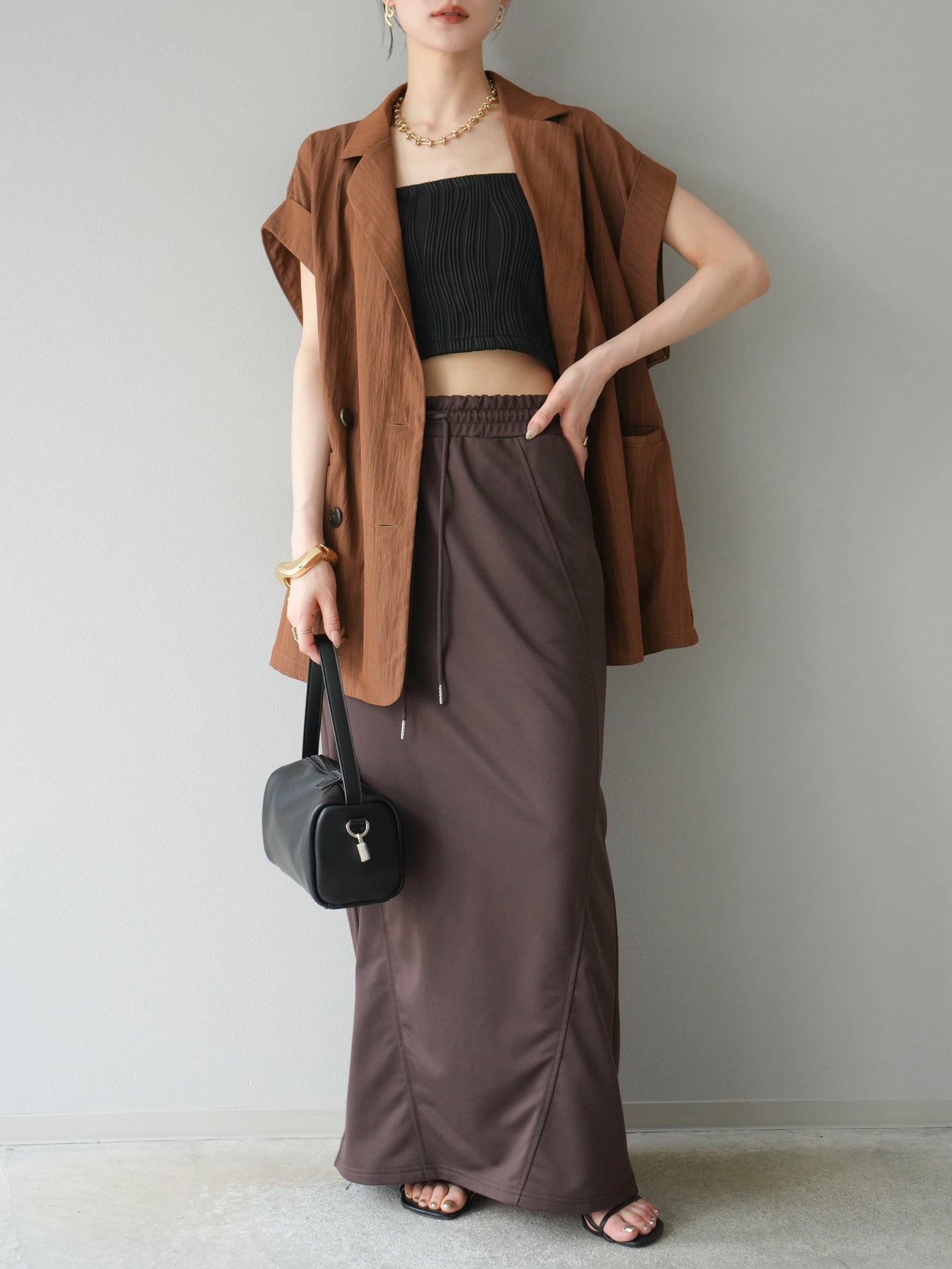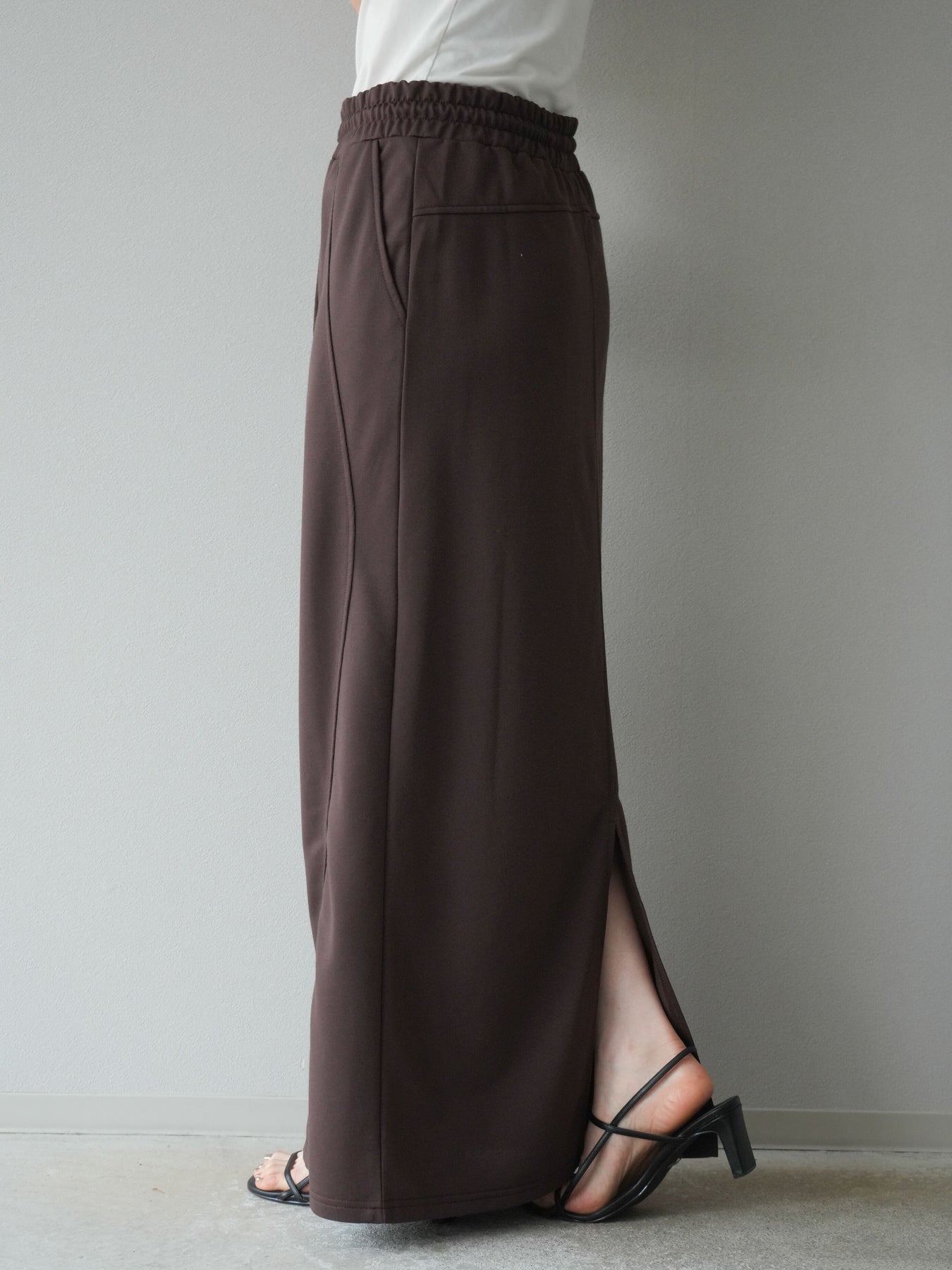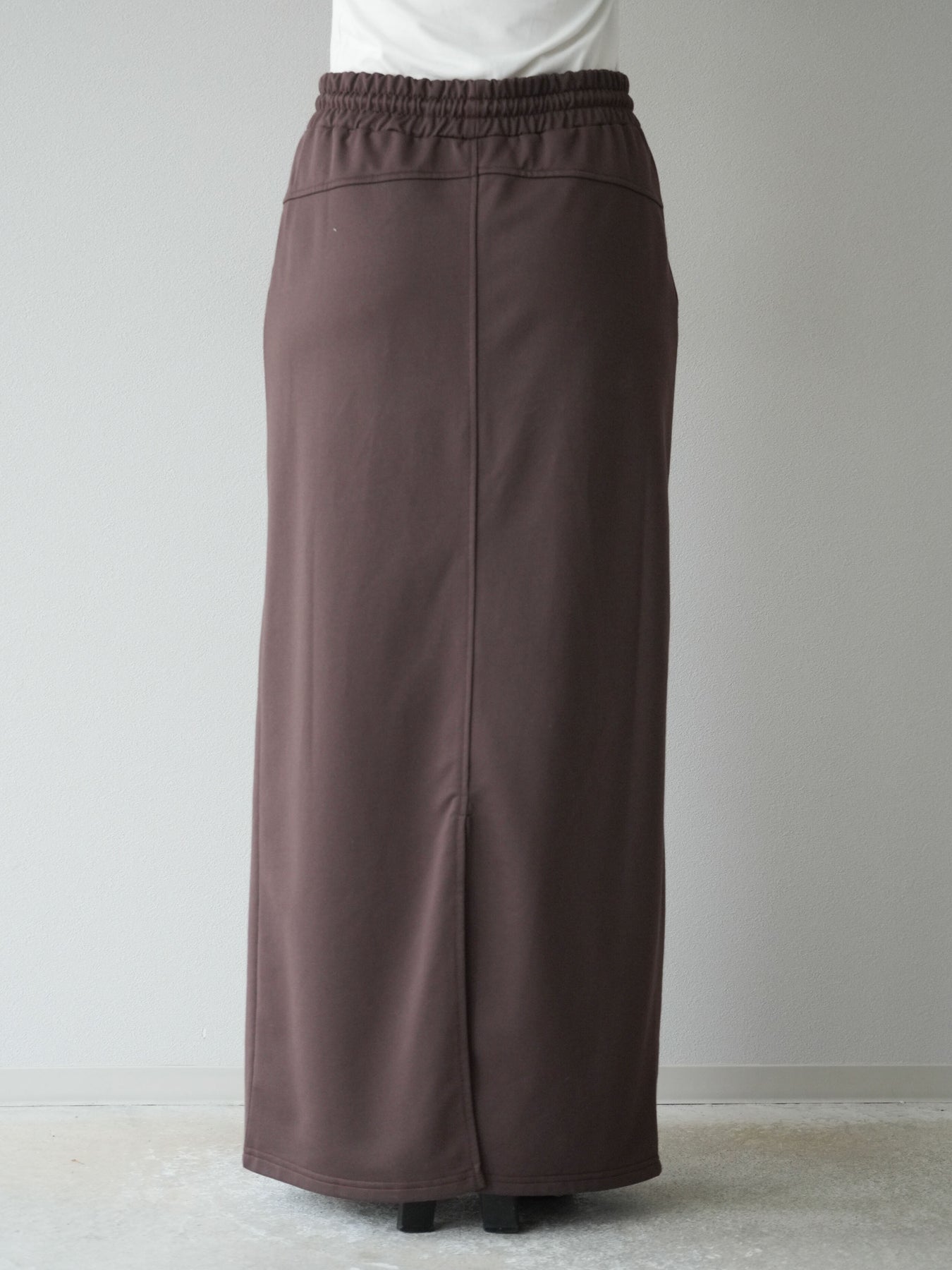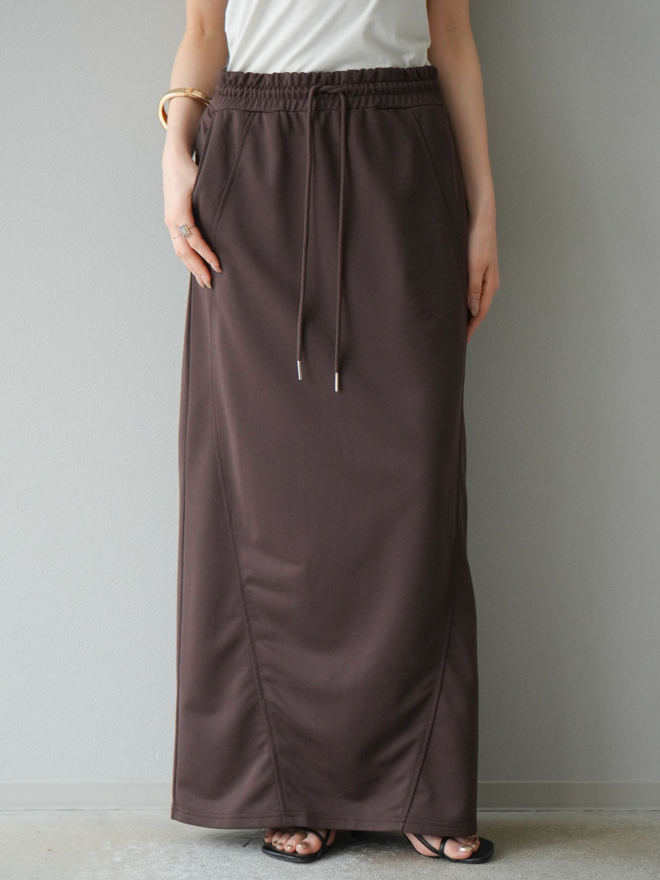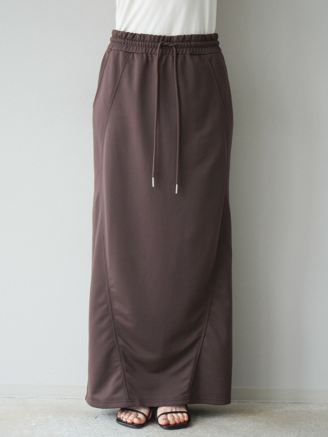 程よい厚みと柔らかな肌触りが魅力の、スウェットロングスカート。カジュアルなスウェット素材ながらも、縦に入った切替ラインがスタイルアップを叶え、すっきりとしたIラインシルエットを演出します。ウエストは総ゴム&ドロスト仕様で、リラクシーかつ快適な履き心地。スニーカーを合わせてラフに着こなすのはもちろん、ヒールやシャツと合わせてきれいめカジュアルにも。シーズンレスで活躍する、万能なデイリーボトムです。 ※ボトムス、キャミソール(インナー)以外の商品は一律でインナーは付属していません。