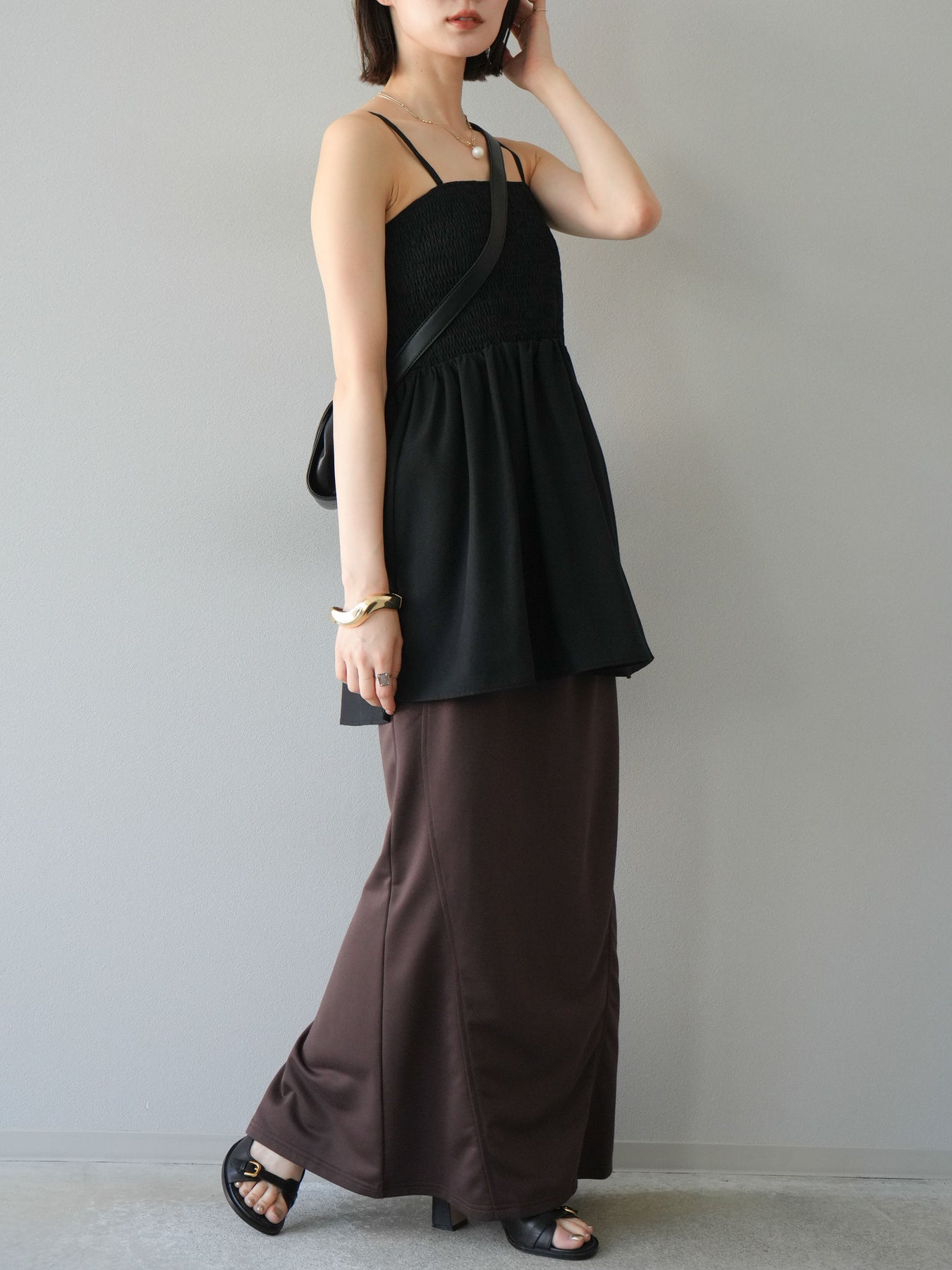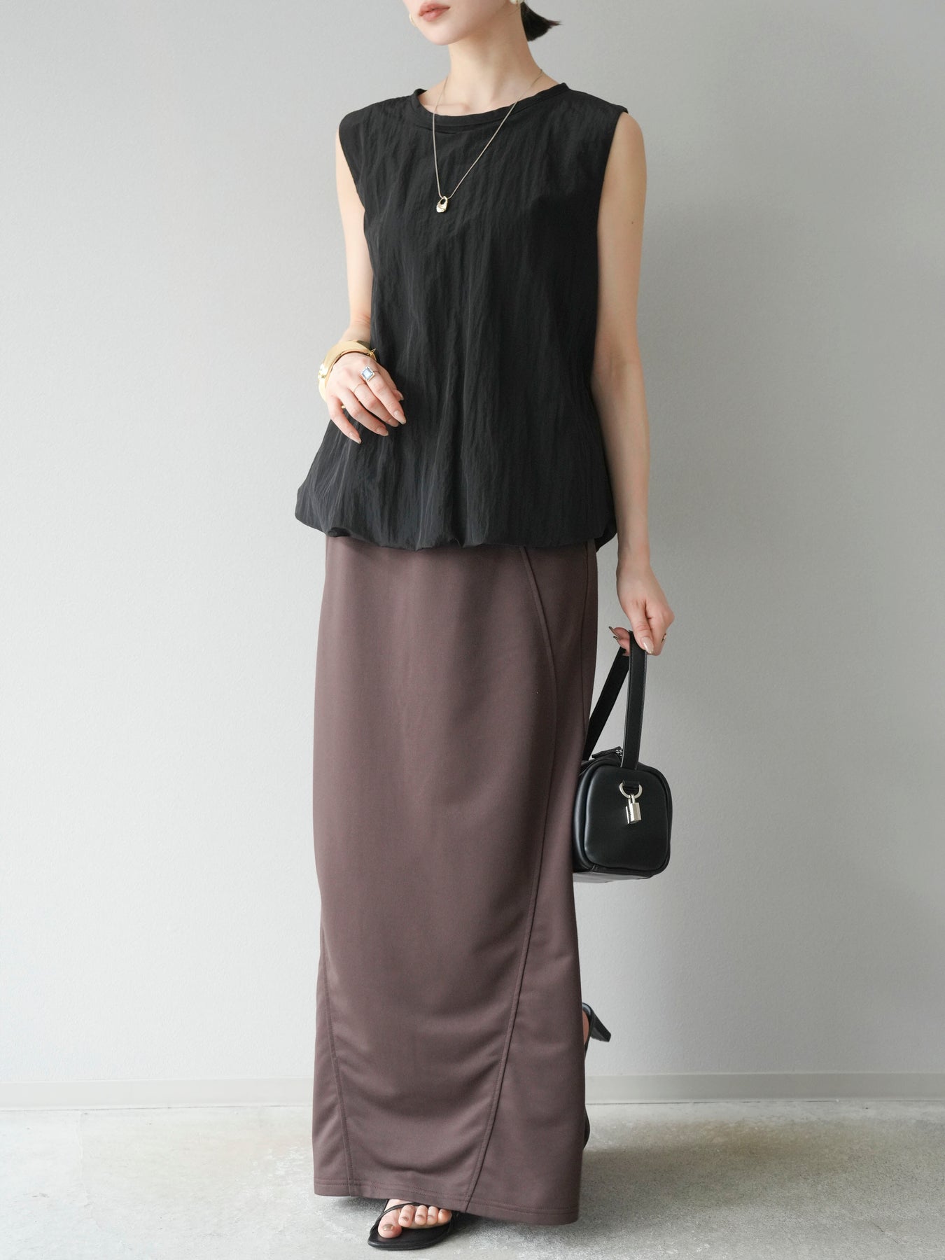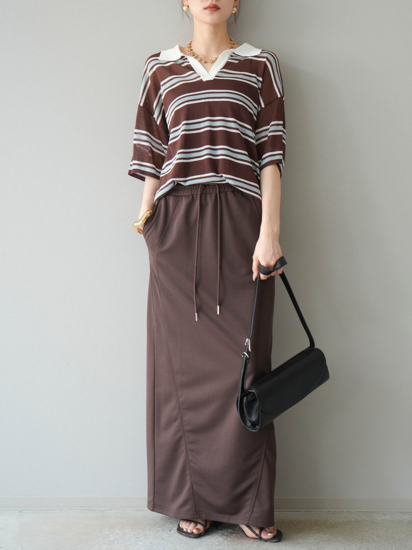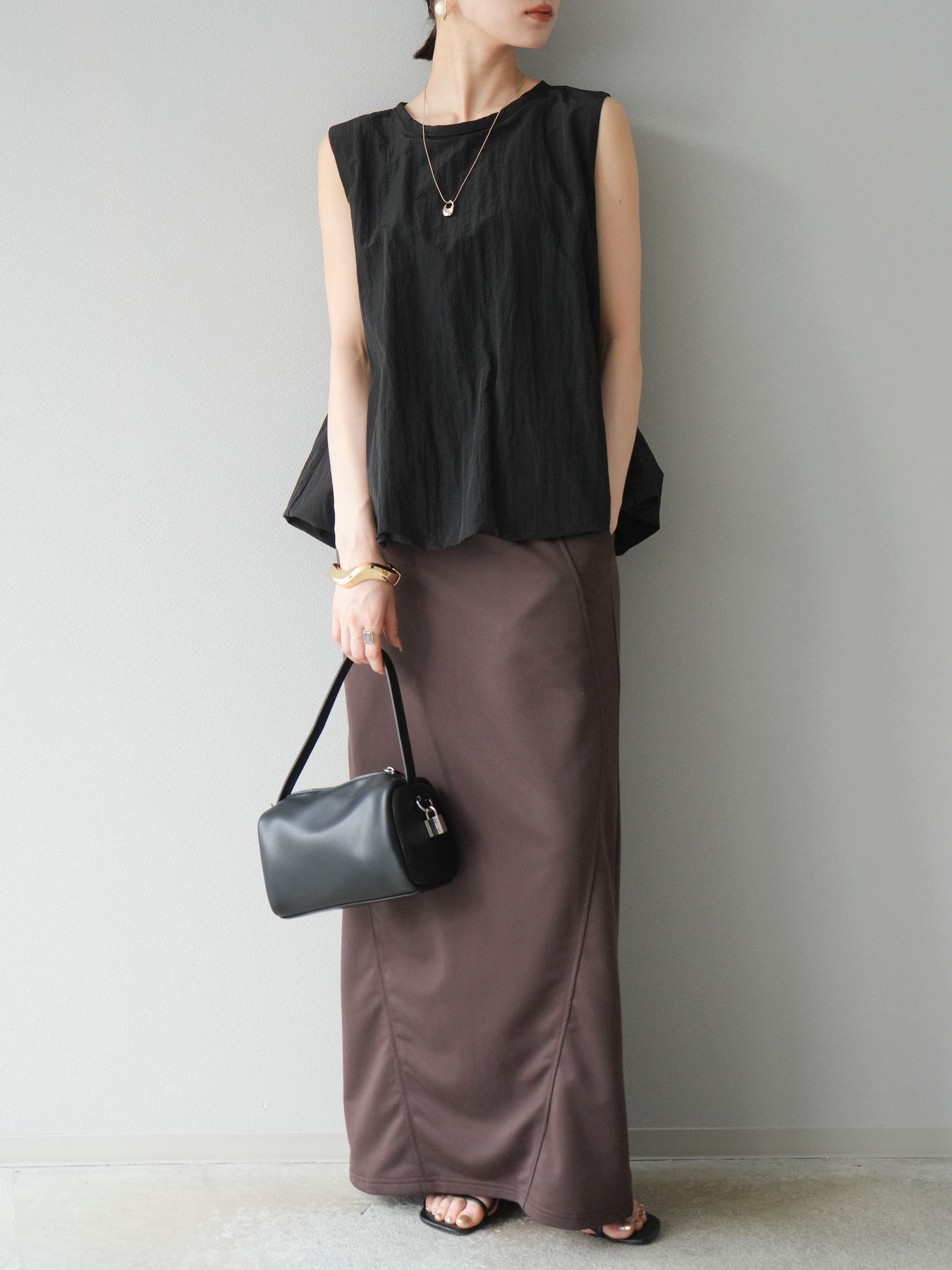程よい厚みと柔らかな肌触りが魅力の、スウェットロングスカート。カジュアルなスウェット素材ながらも、縦に入った切替ラインがスタイルアップを叶え、すっきりとしたIラインシルエットを演出します。ウエストは総ゴム&ドロスト仕様で、リラクシーかつ快適な履き心地。スニーカーを合わせてラフに着こなすのはもちろん、ヒールやシャツと合わせてきれいめカジュアルにも。シーズンレスで活躍する、万能なデイリーボトムです。 ※ボトムス、キャミソール(インナー)以外の商品は一律でインナーは付属していません。