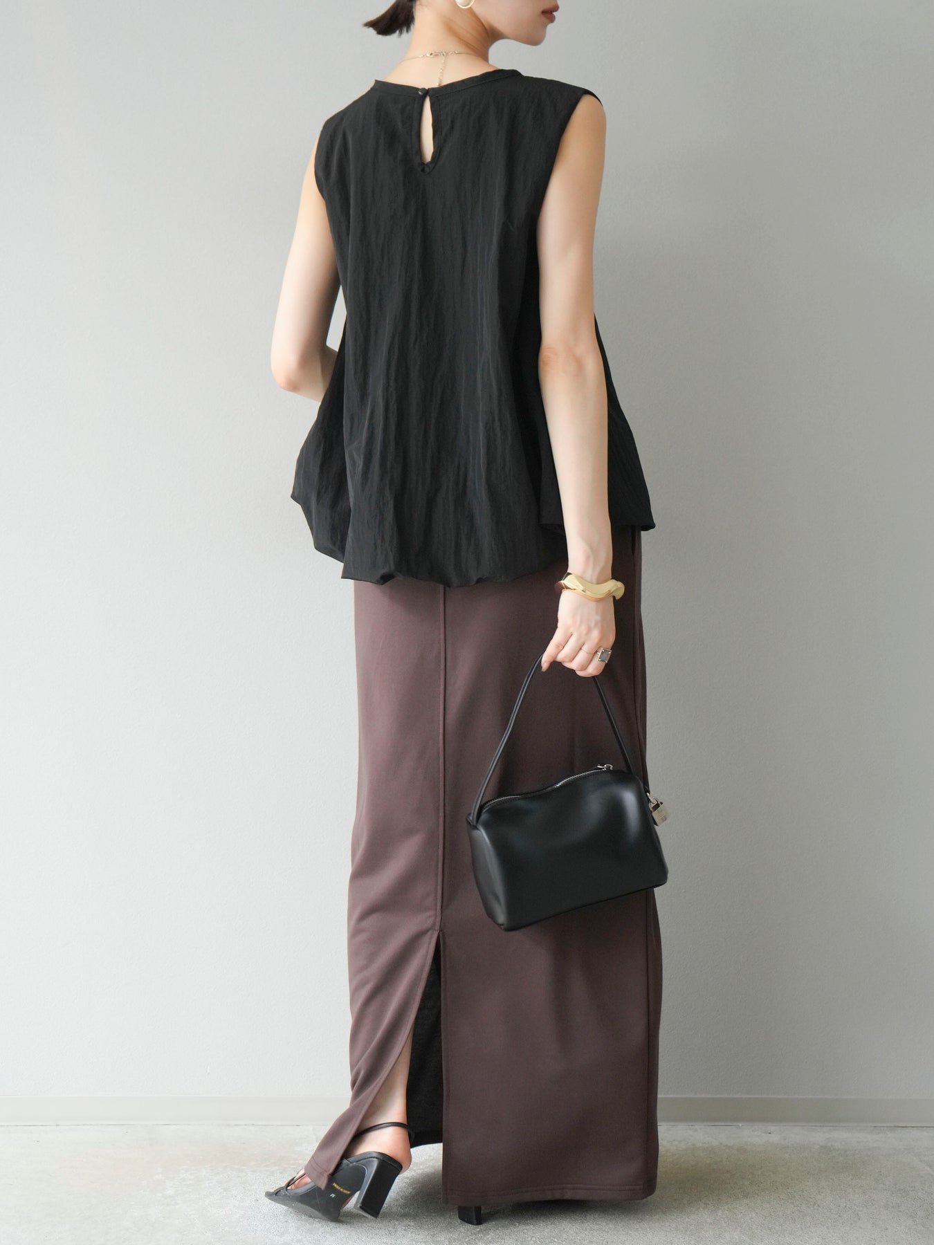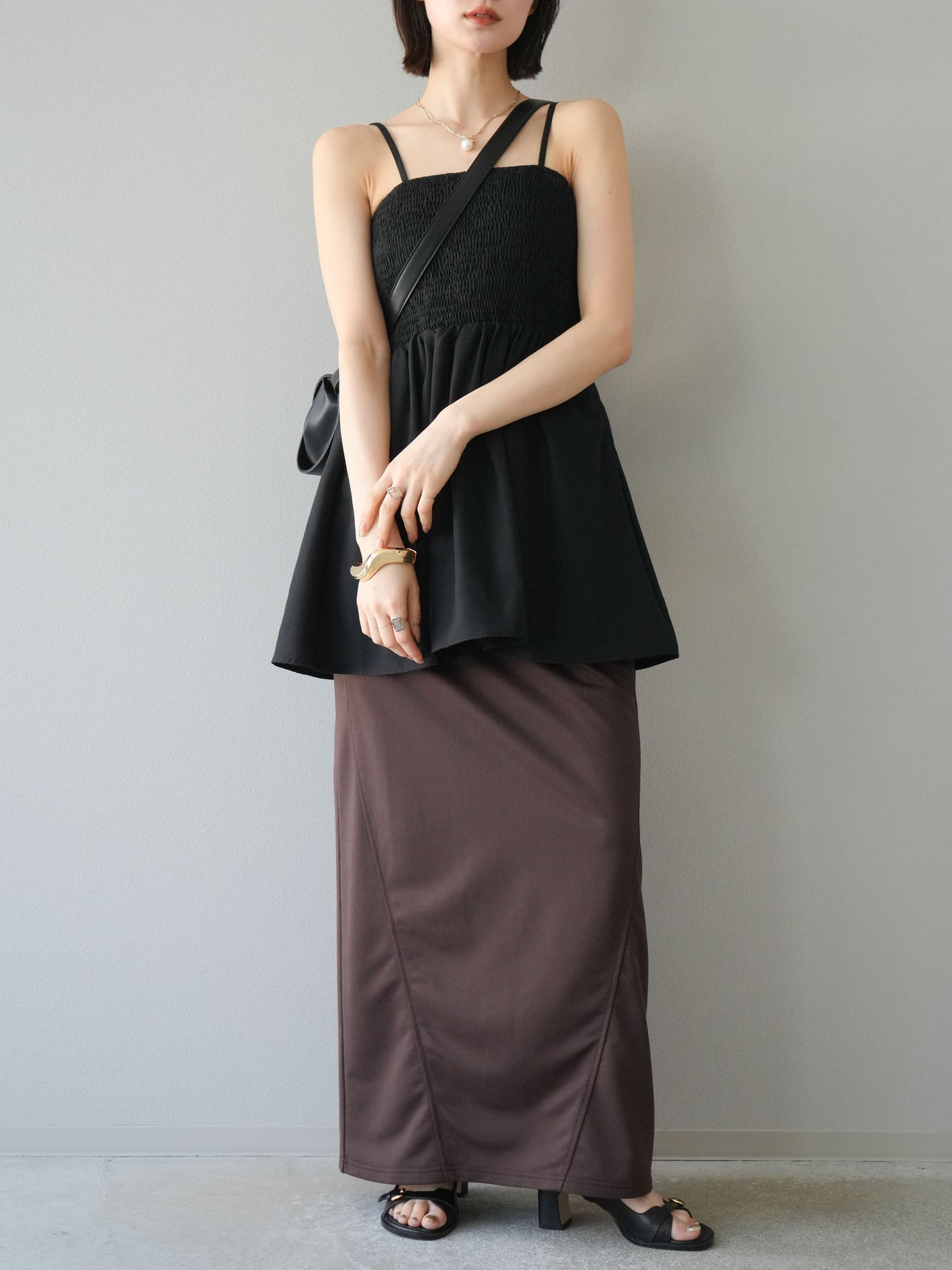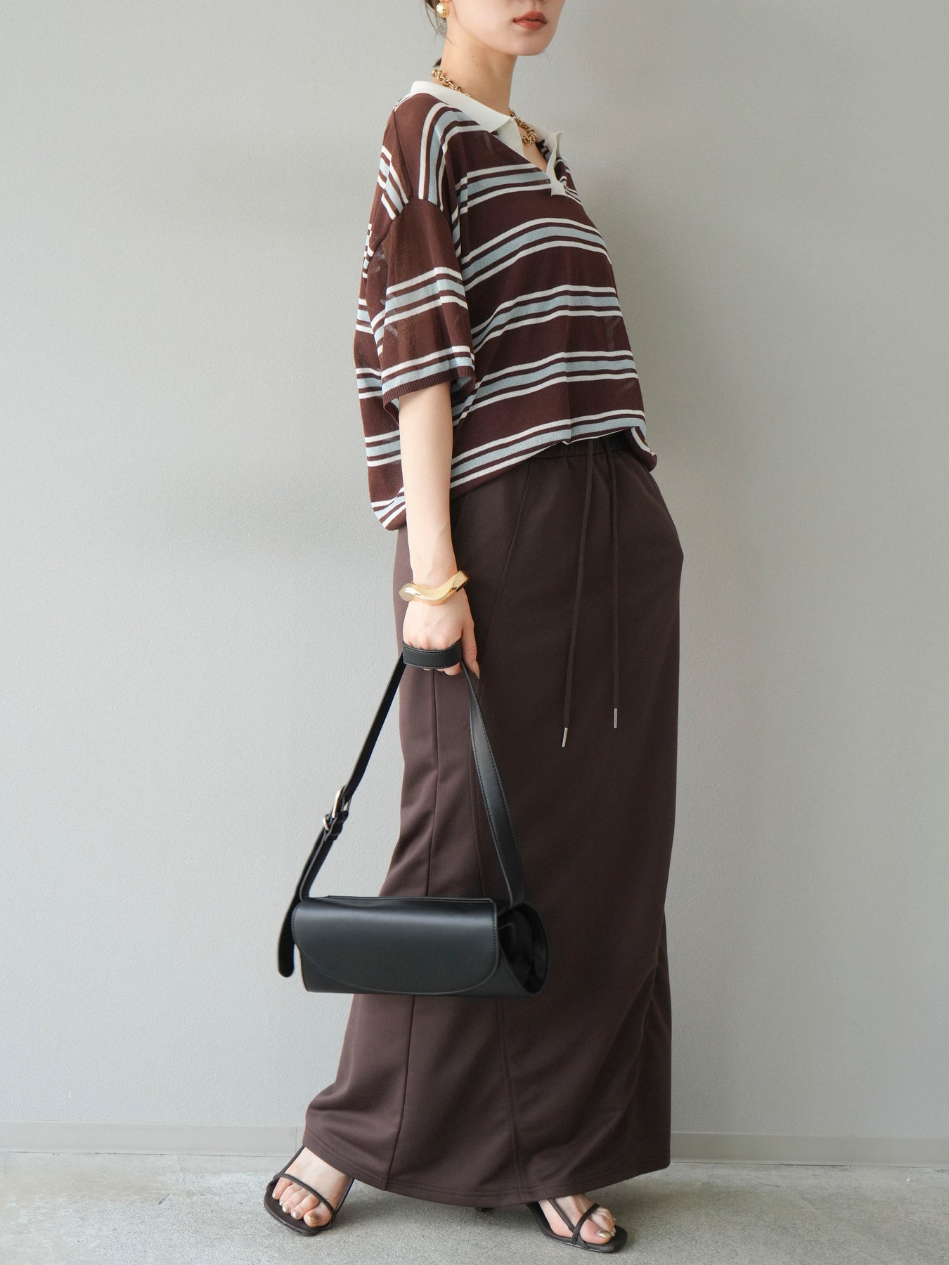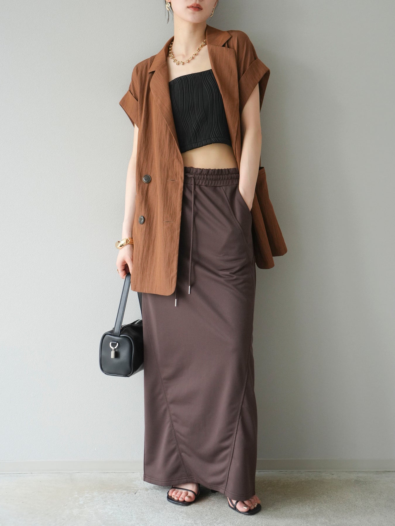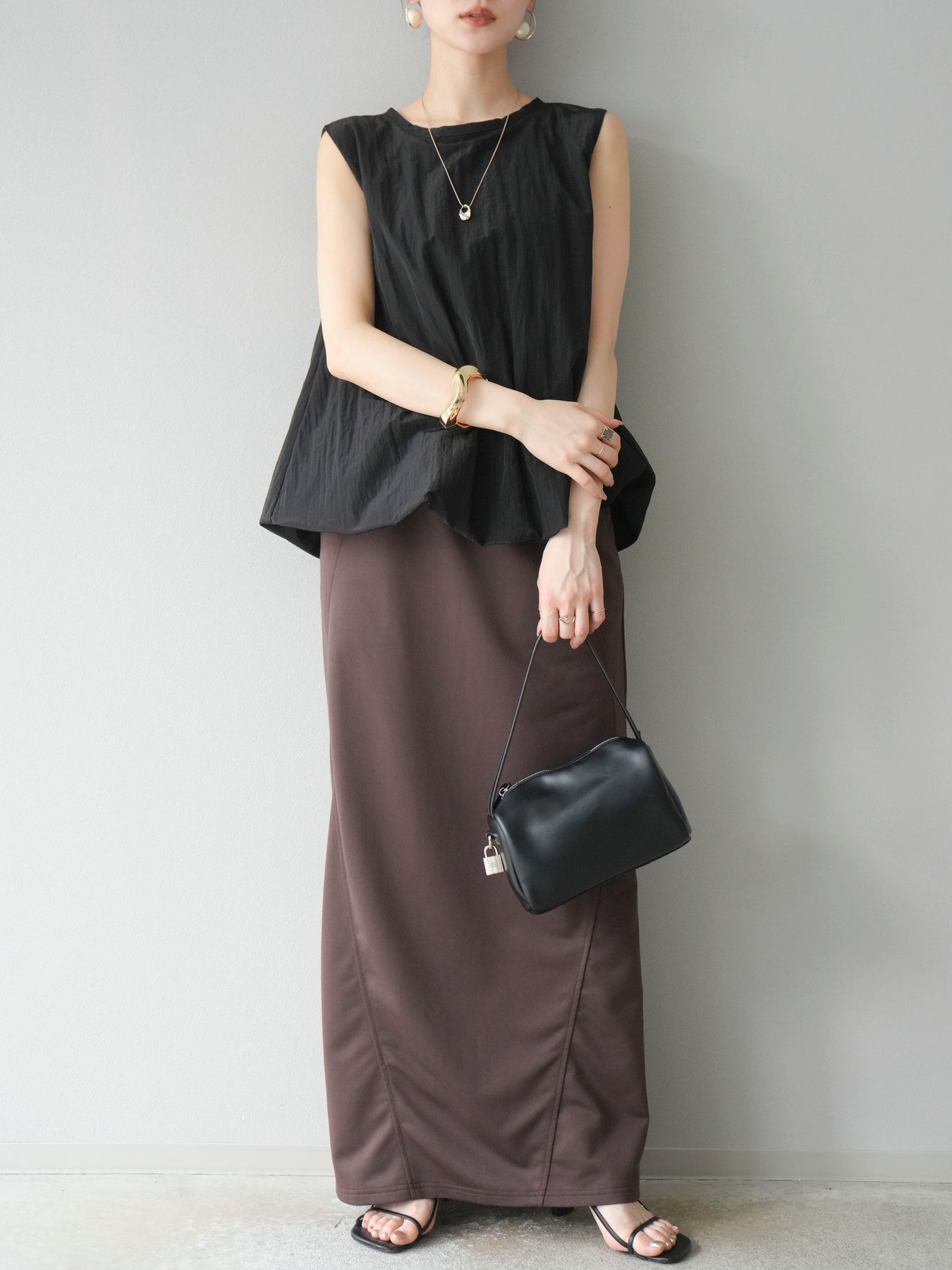 程よい厚みと柔らかな肌触りが魅力の、スウェットロングスカート。カジュアルなスウェット素材ながらも、縦に入った切替ラインがスタイルアップを叶え、すっきりとしたIラインシルエットを演出します。ウエストは総ゴム&ドロスト仕様で、リラクシーかつ快適な履き心地。スニーカーを合わせてラフに着こなすのはもちろん、ヒールやシャツと合わせてきれいめカジュアルにも。シーズンレスで活躍する、万能なデイリーボトムです。 ※ボトムス、キャミソール(インナー)以外の商品は一律でインナーは付属していません。