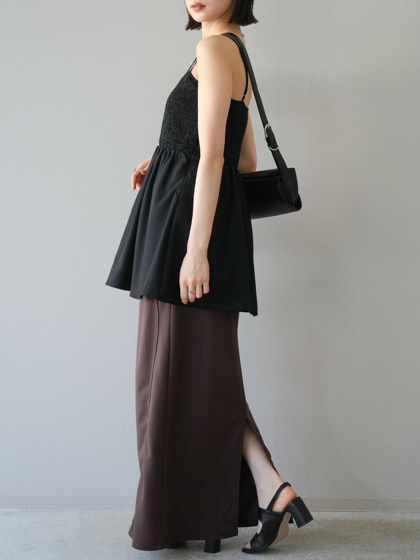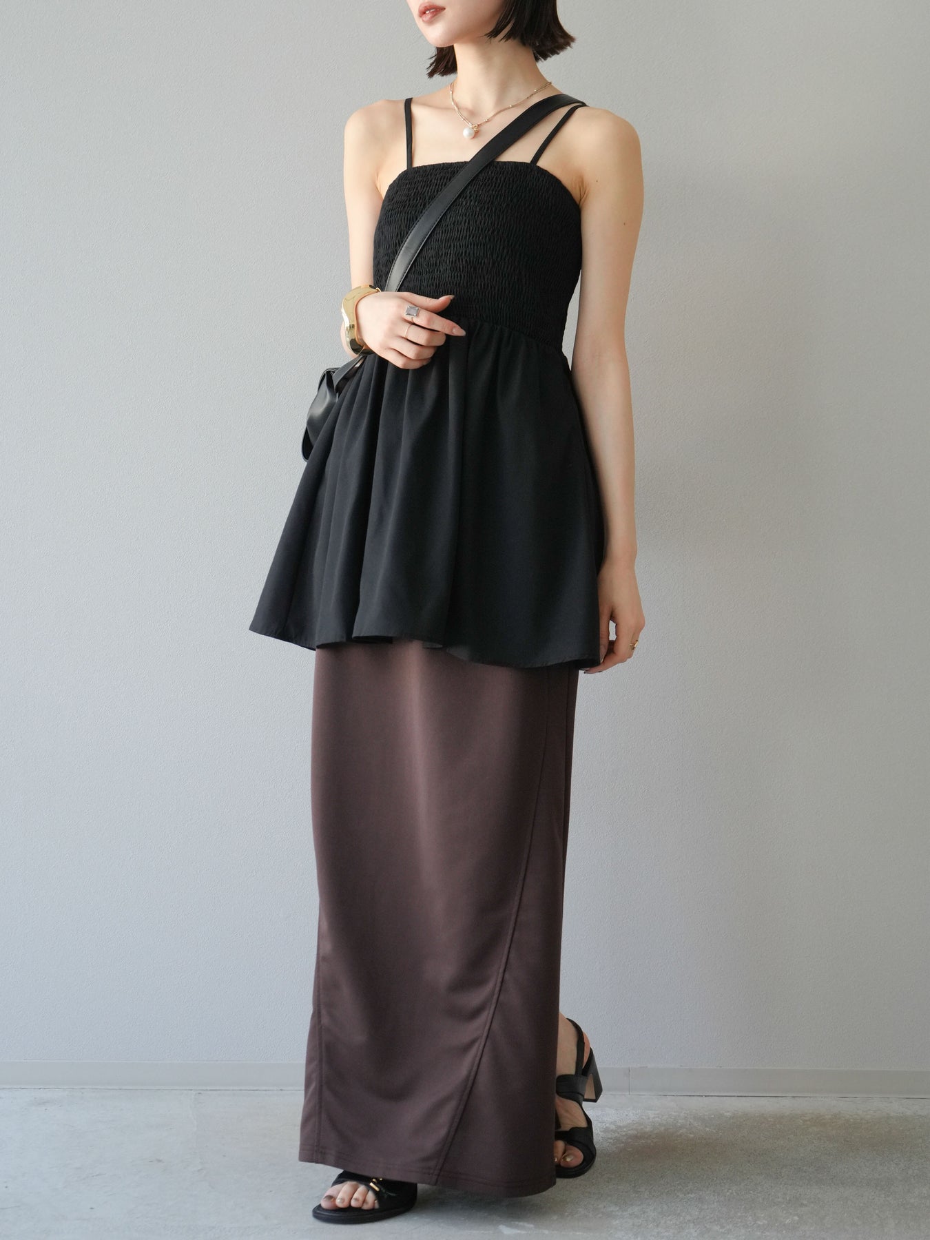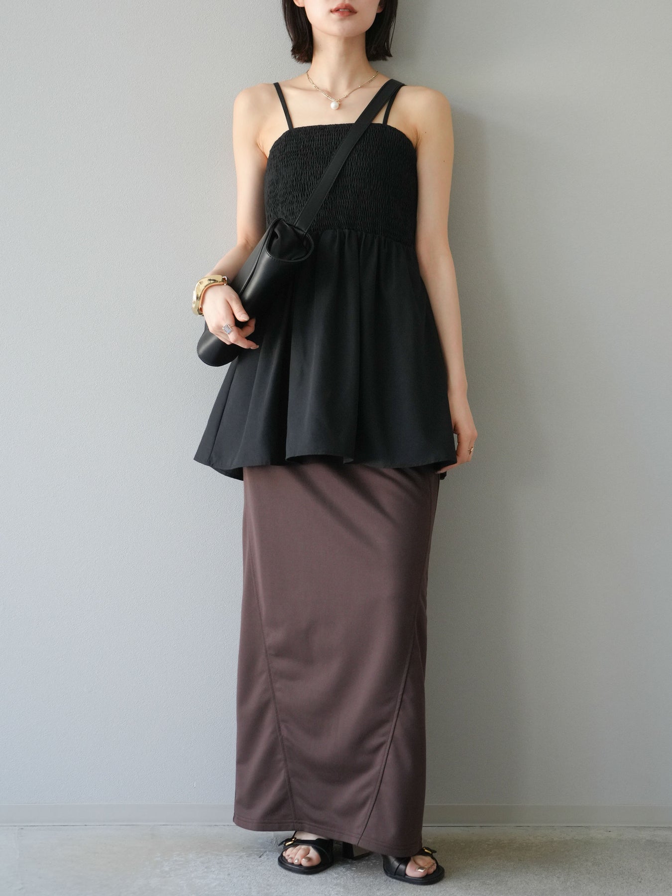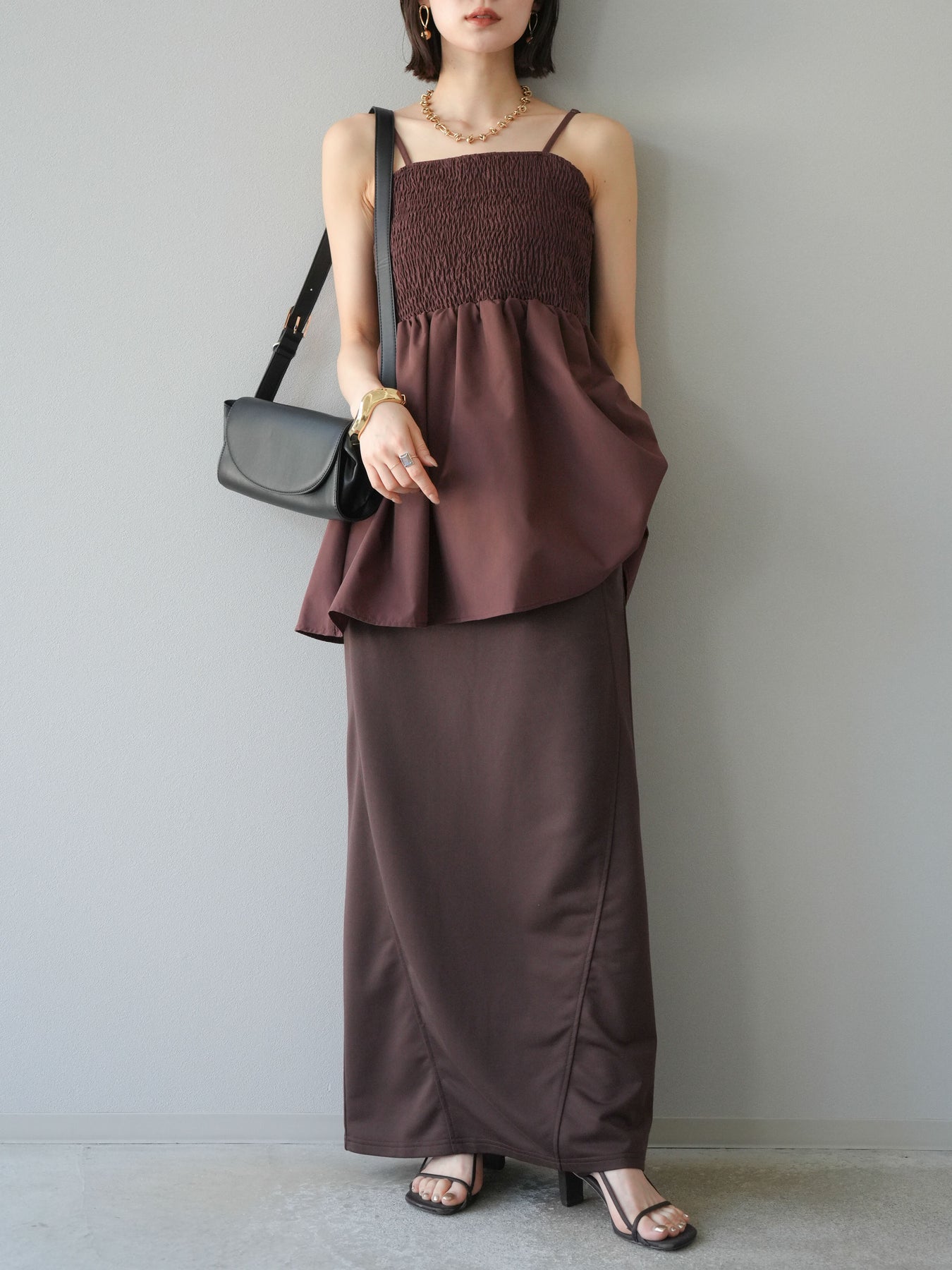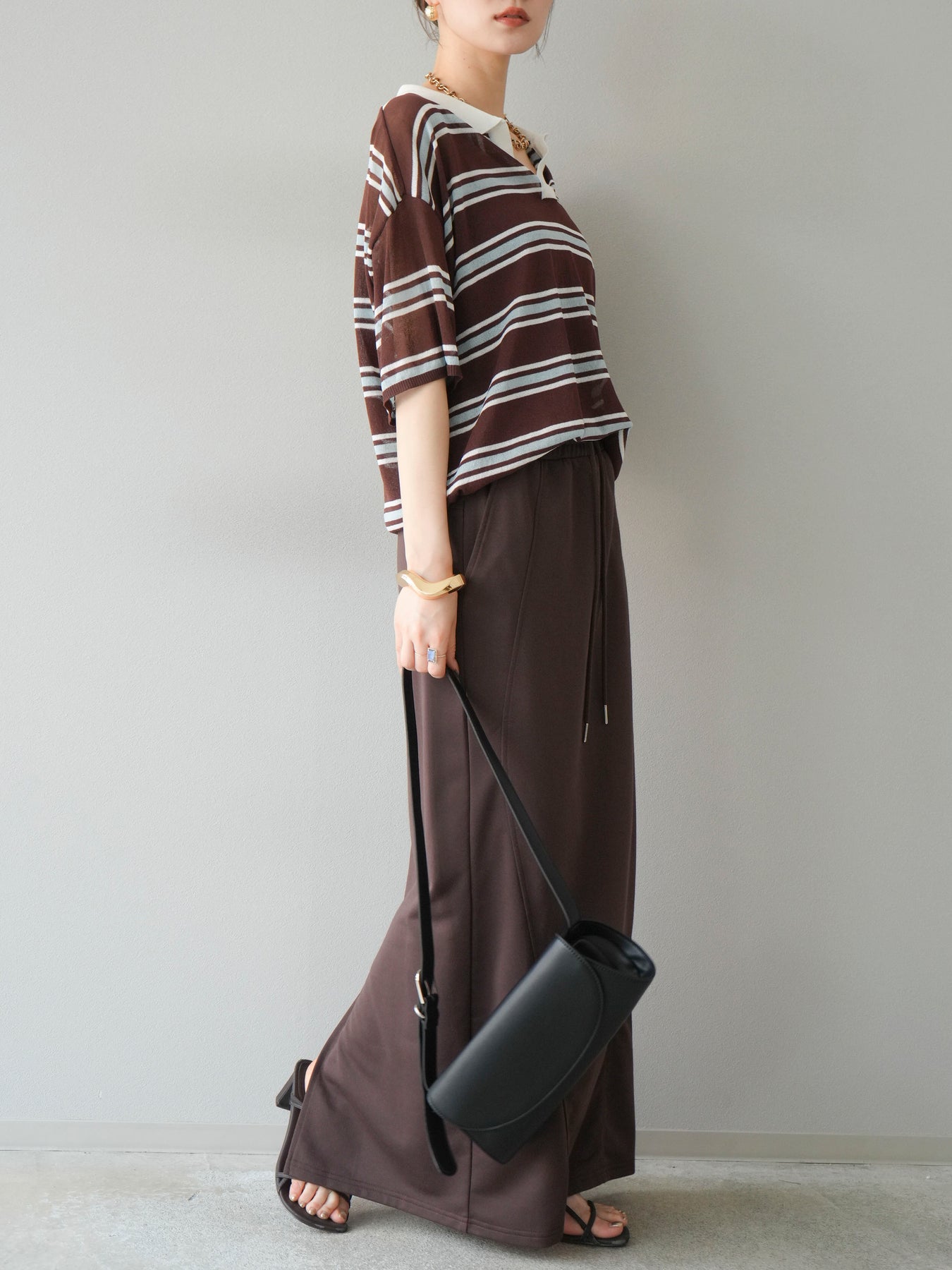 程よい厚みと柔らかな肌触りが魅力の、スウェットロングスカート。カジュアルなスウェット素材ながらも、縦に入った切替ラインがスタイルアップを叶え、すっきりとしたIラインシルエットを演出します。ウエストは総ゴム&ドロスト仕様で、リラクシーかつ快適な履き心地。スニーカーを合わせてラフに着こなすのはもちろん、ヒールやシャツと合わせてきれいめカジュアルにも。シーズンレスで活躍する、万能なデイリーボトムです。 ※ボトムス、キャミソール(インナー)以外の商品は一律でインナーは付属していません。