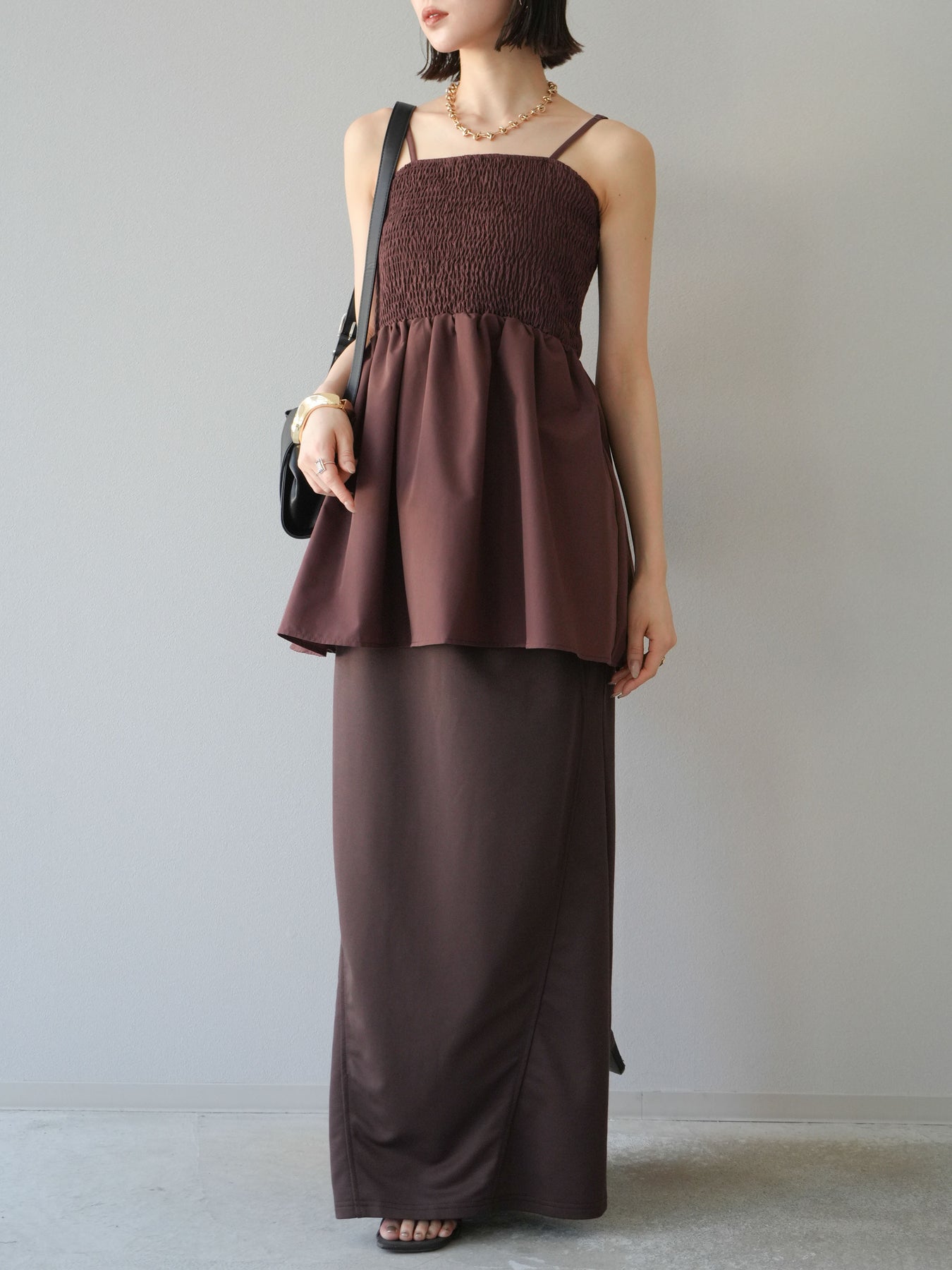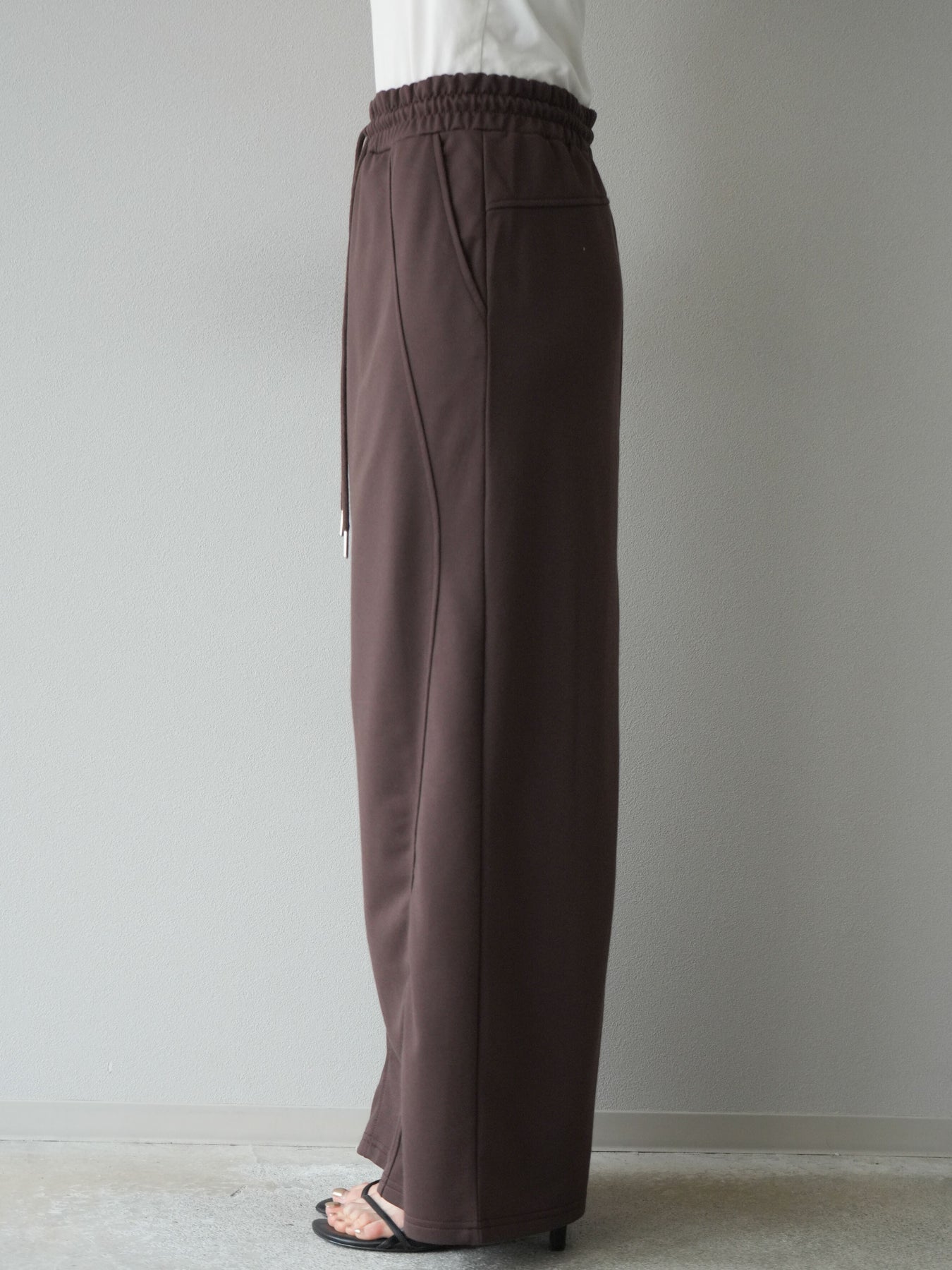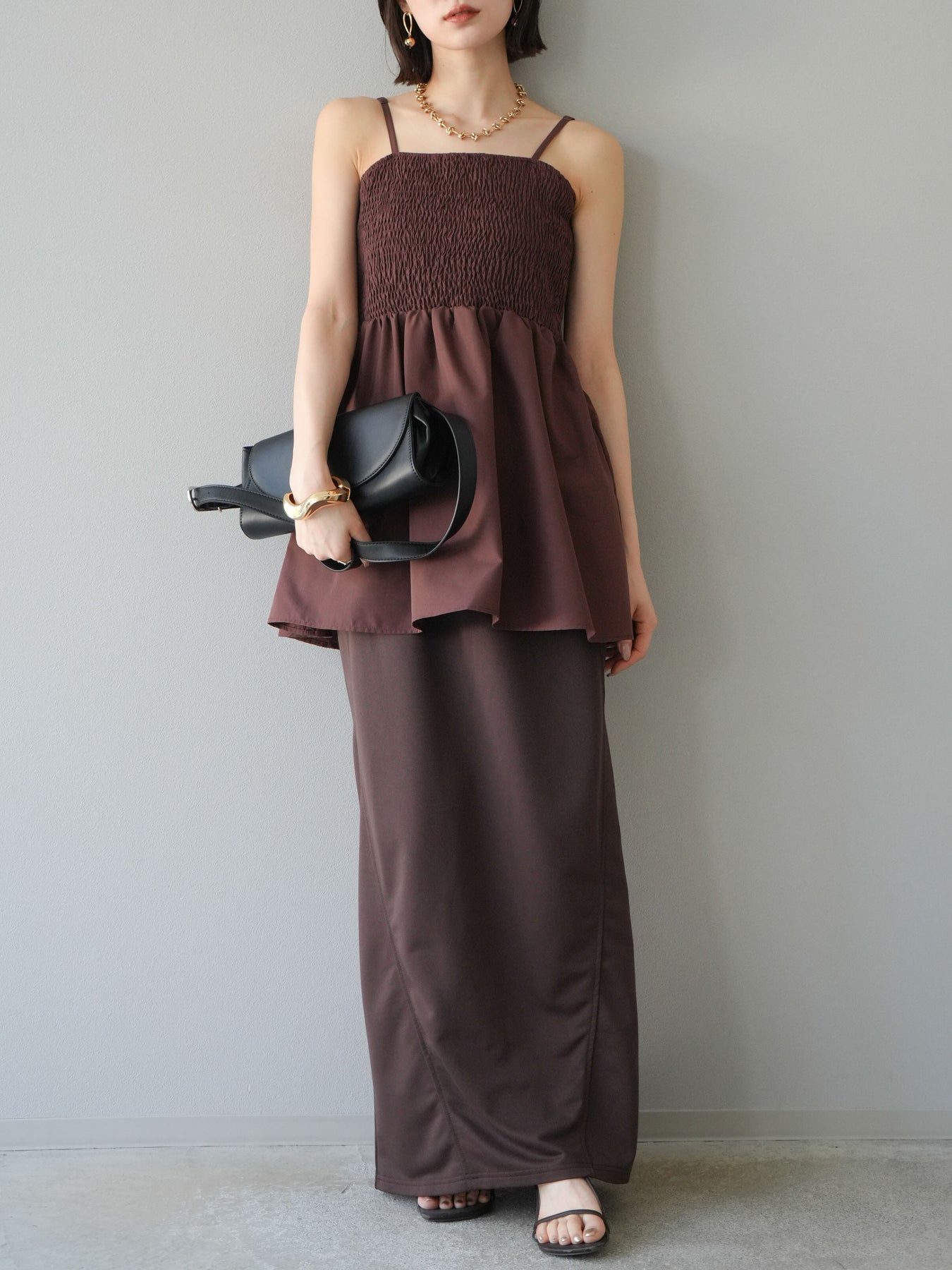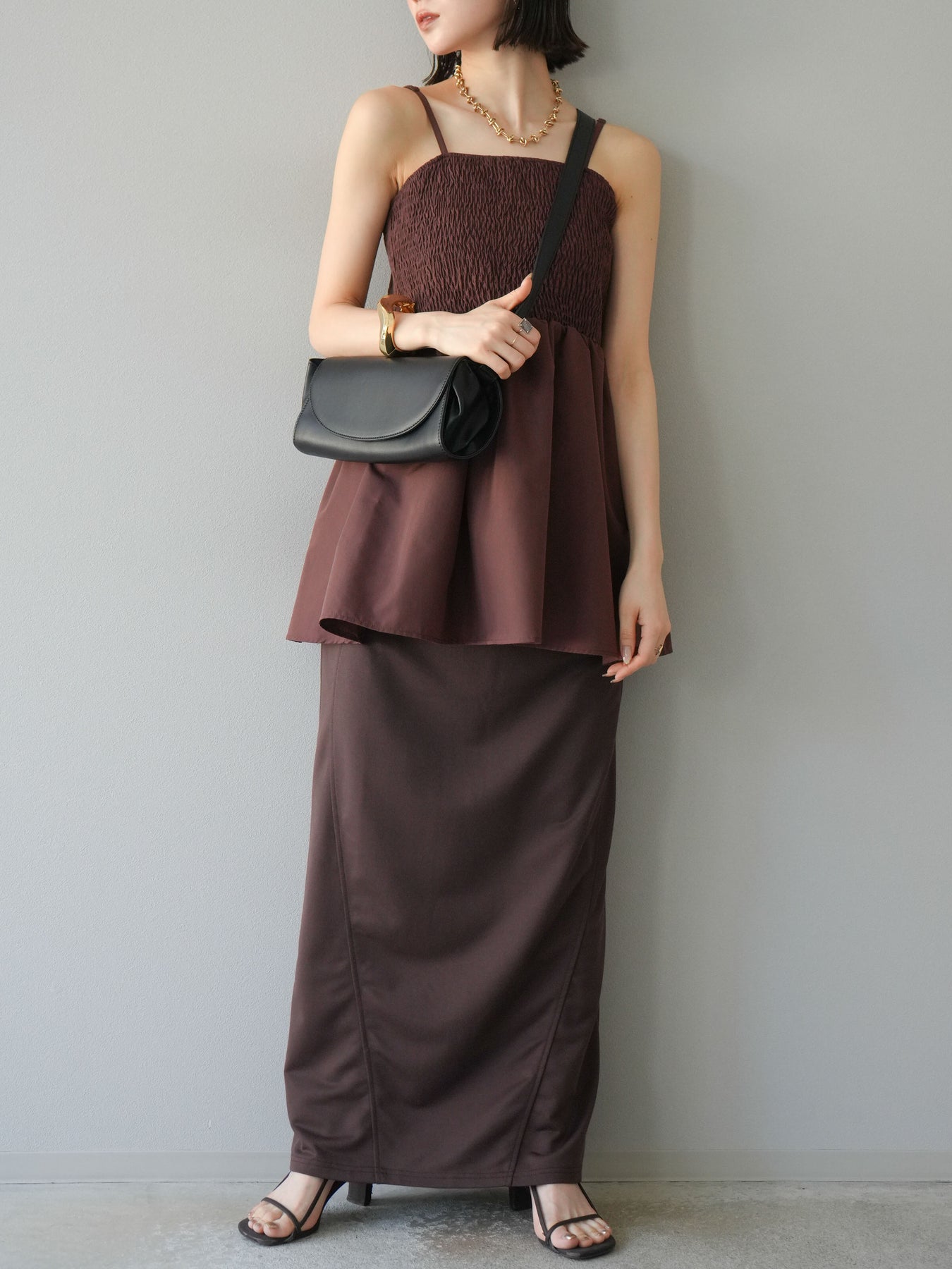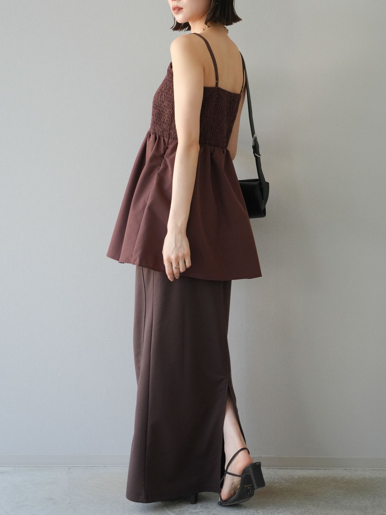 程よい厚みと柔らかな肌触りが魅力の、スウェットロングスカート。カジュアルなスウェット素材ながらも、縦に入った切替ラインがスタイルアップを叶え、すっきりとしたIラインシルエットを演出します。ウエストは総ゴム&ドロスト仕様で、リラクシーかつ快適な履き心地。スニーカーを合わせてラフに着こなすのはもちろん、ヒールやシャツと合わせてきれいめカジュアルにも。シーズンレスで活躍する、万能なデイリーボトムです。 ※ボトムス、キャミソール(インナー)以外の商品は一律でインナーは付属していません。