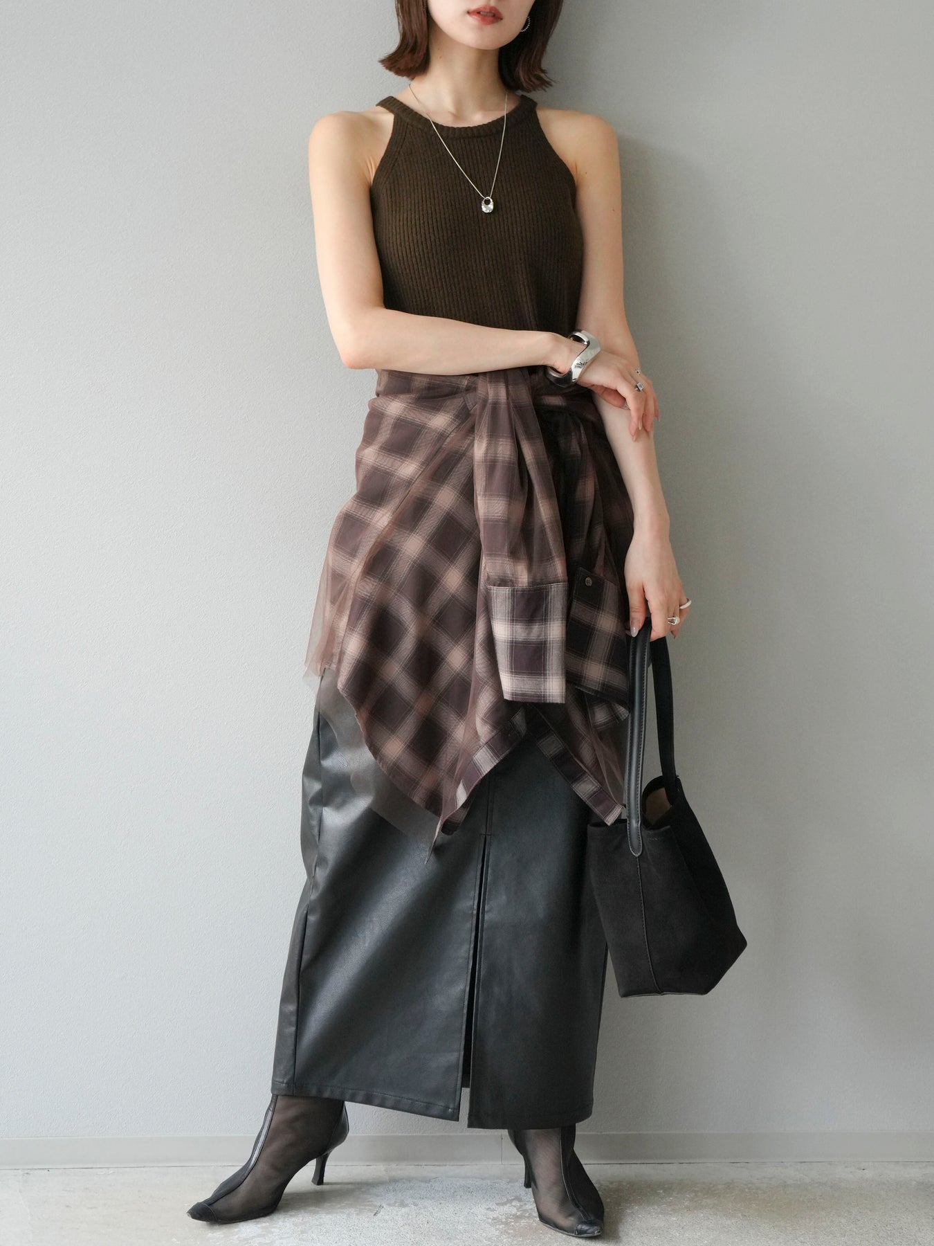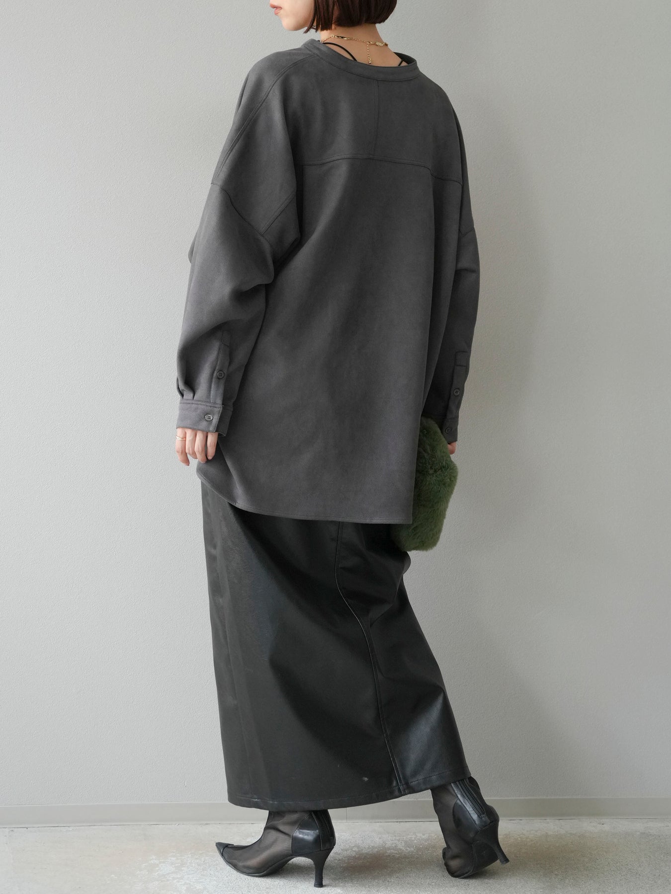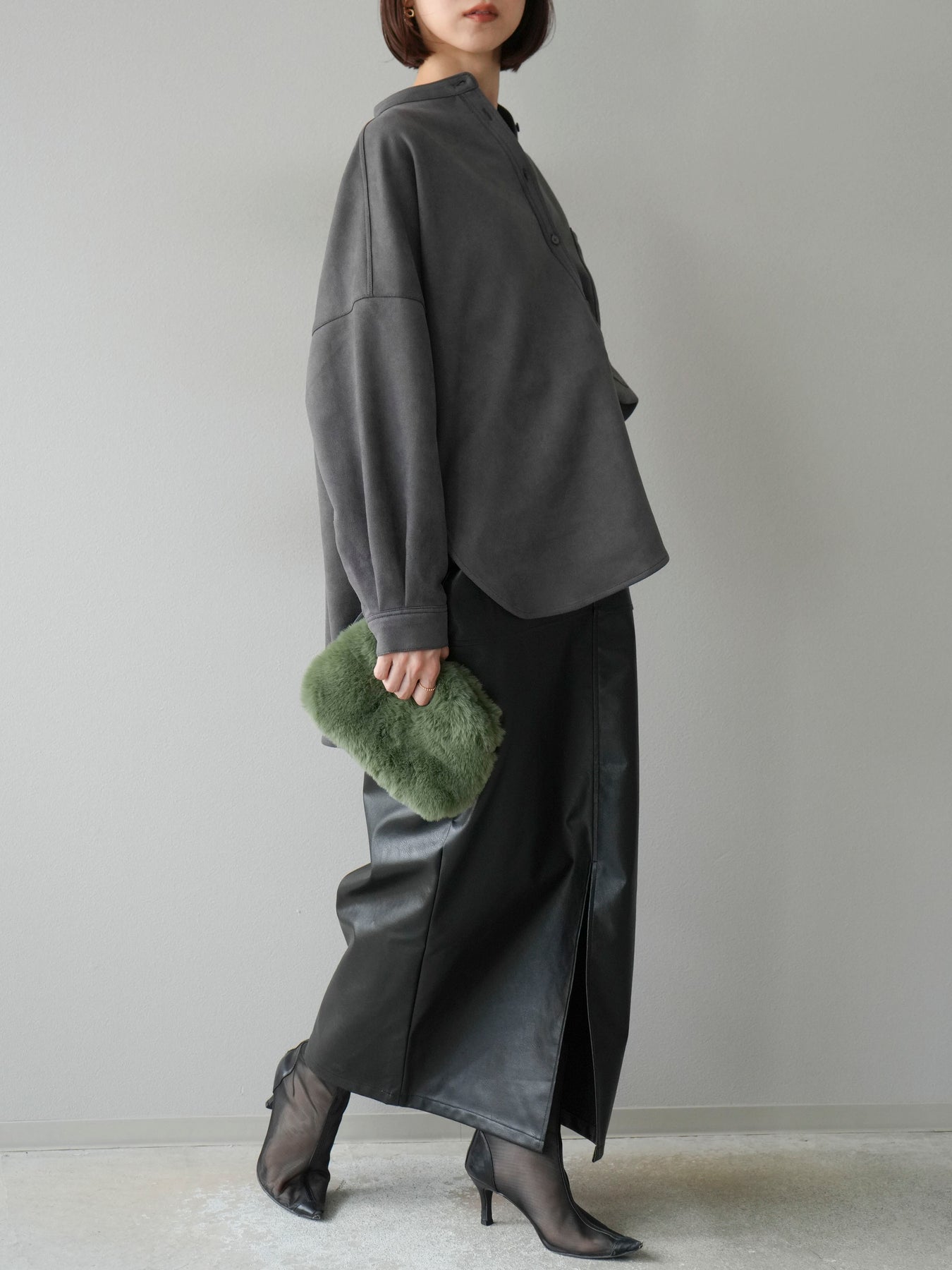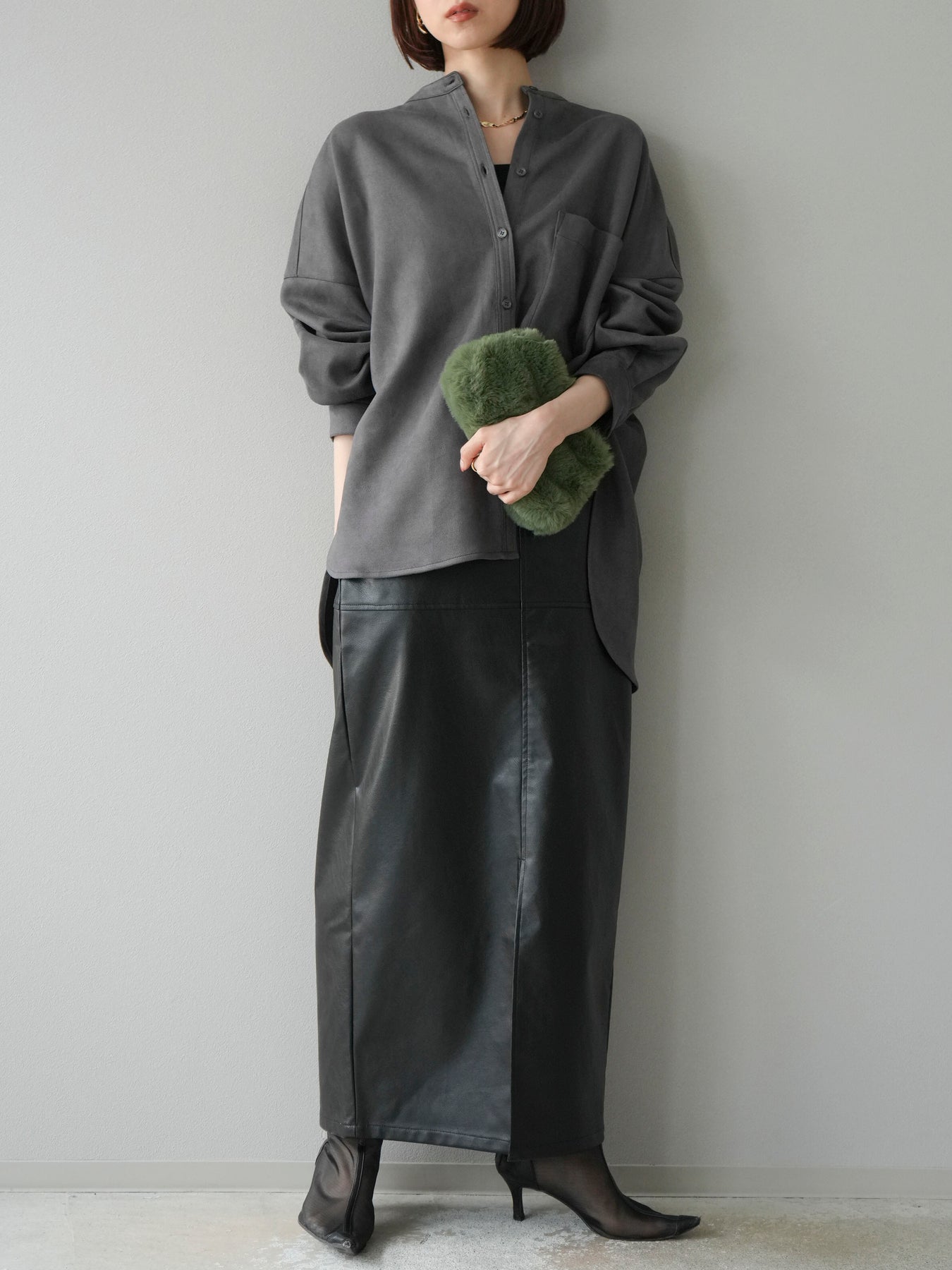 マットな質感のフェイクレザーを使用したフロントスリットスカート。シンプルなIラインシルエットに深めのスリットを施すことで、程よい抜け感と動きやすさを両立しました。タイトすぎないシルエットが大人っぽさを引き立てつつ、スタイルアップ効果も期待できる一枚。トップスをインすればモードな印象に、オーバーサイズのシャツやニットを合わせれば抜け感のあるバランスに仕上がります。デイリー使いから特別なお出かけまで幅広いシーンで活躍する、存在感のあるスカートです。
