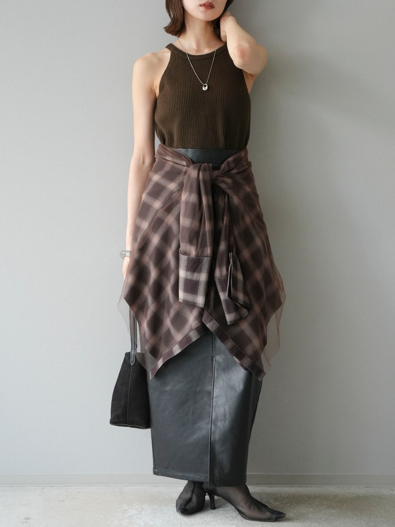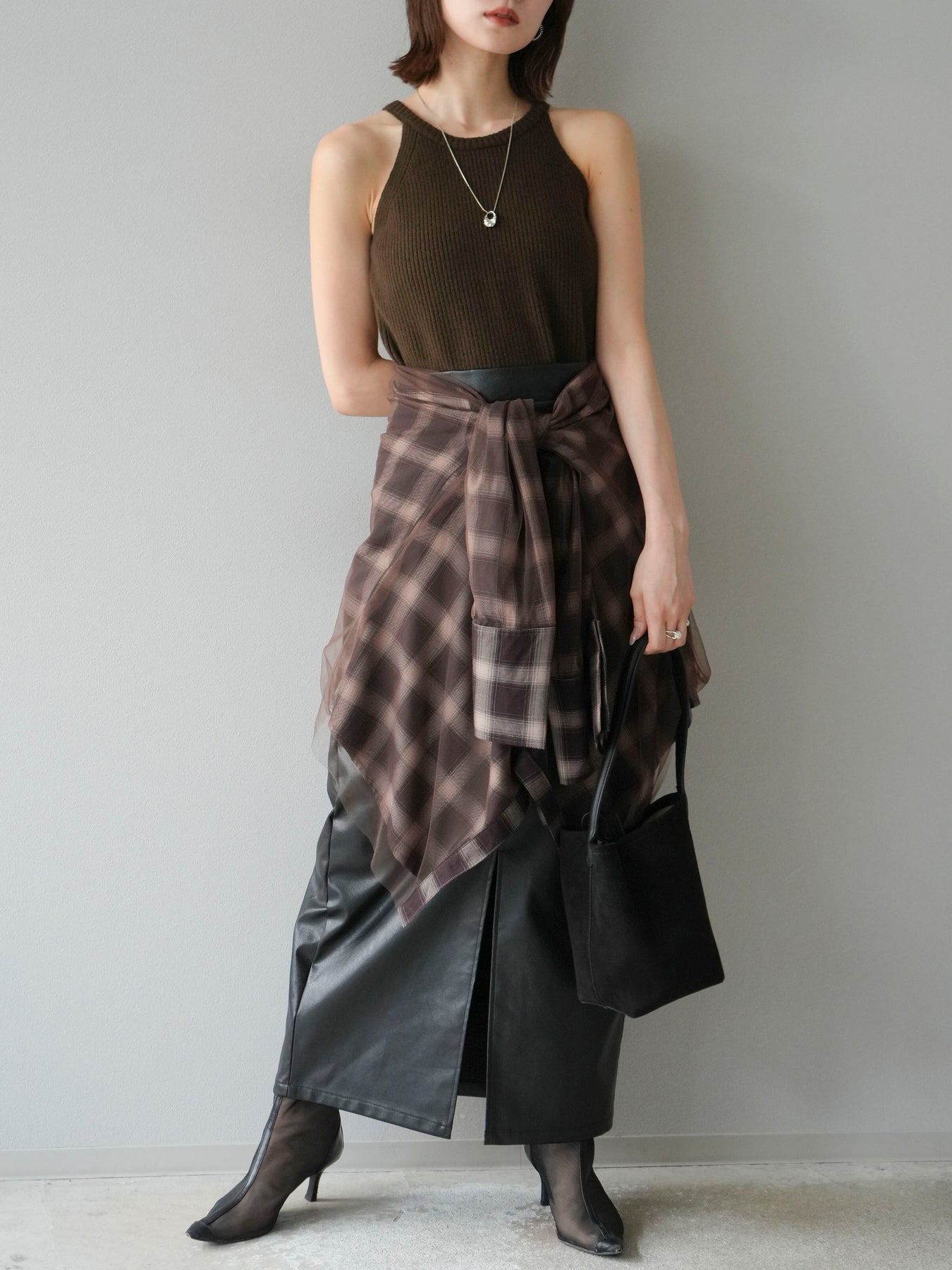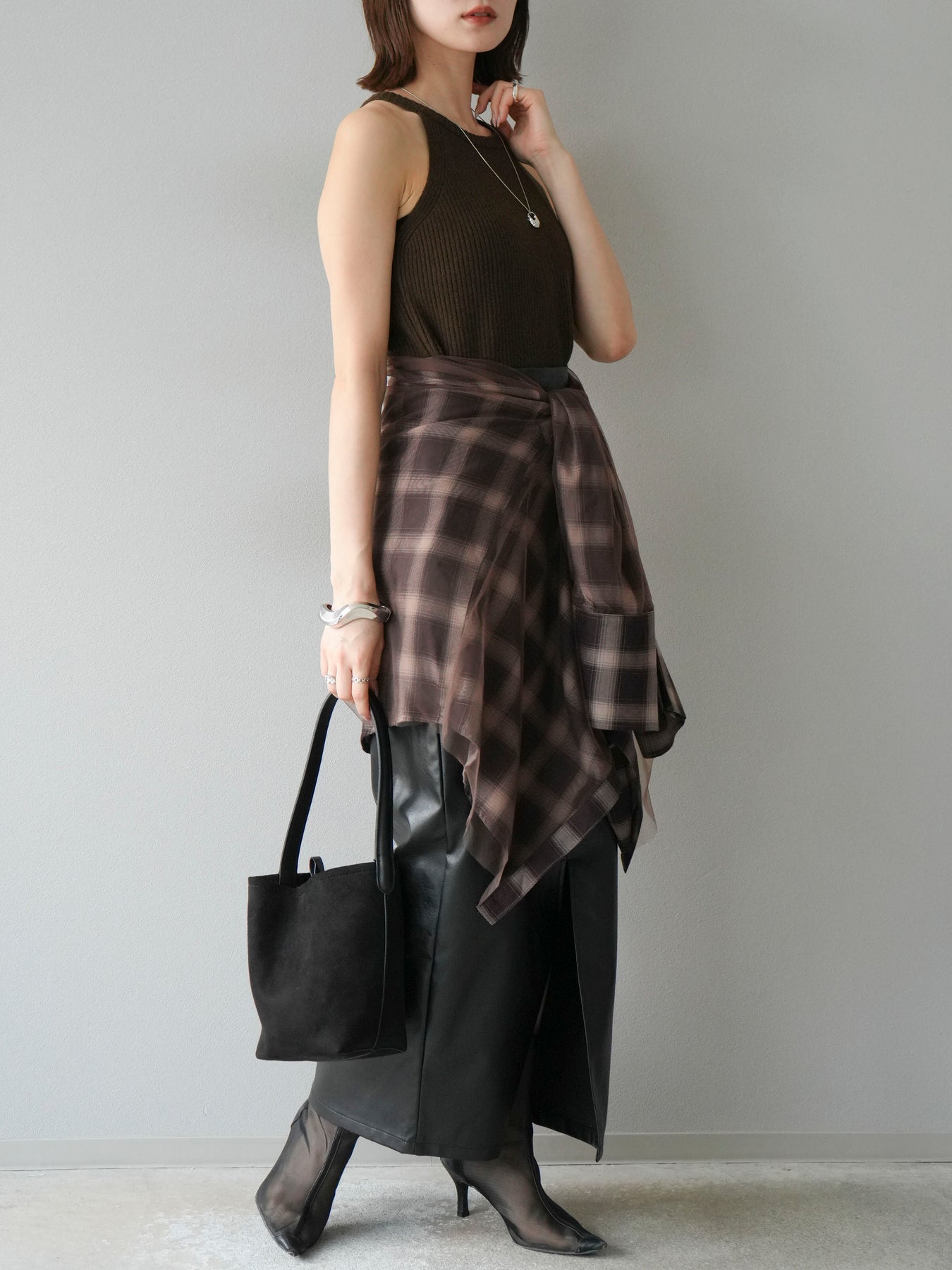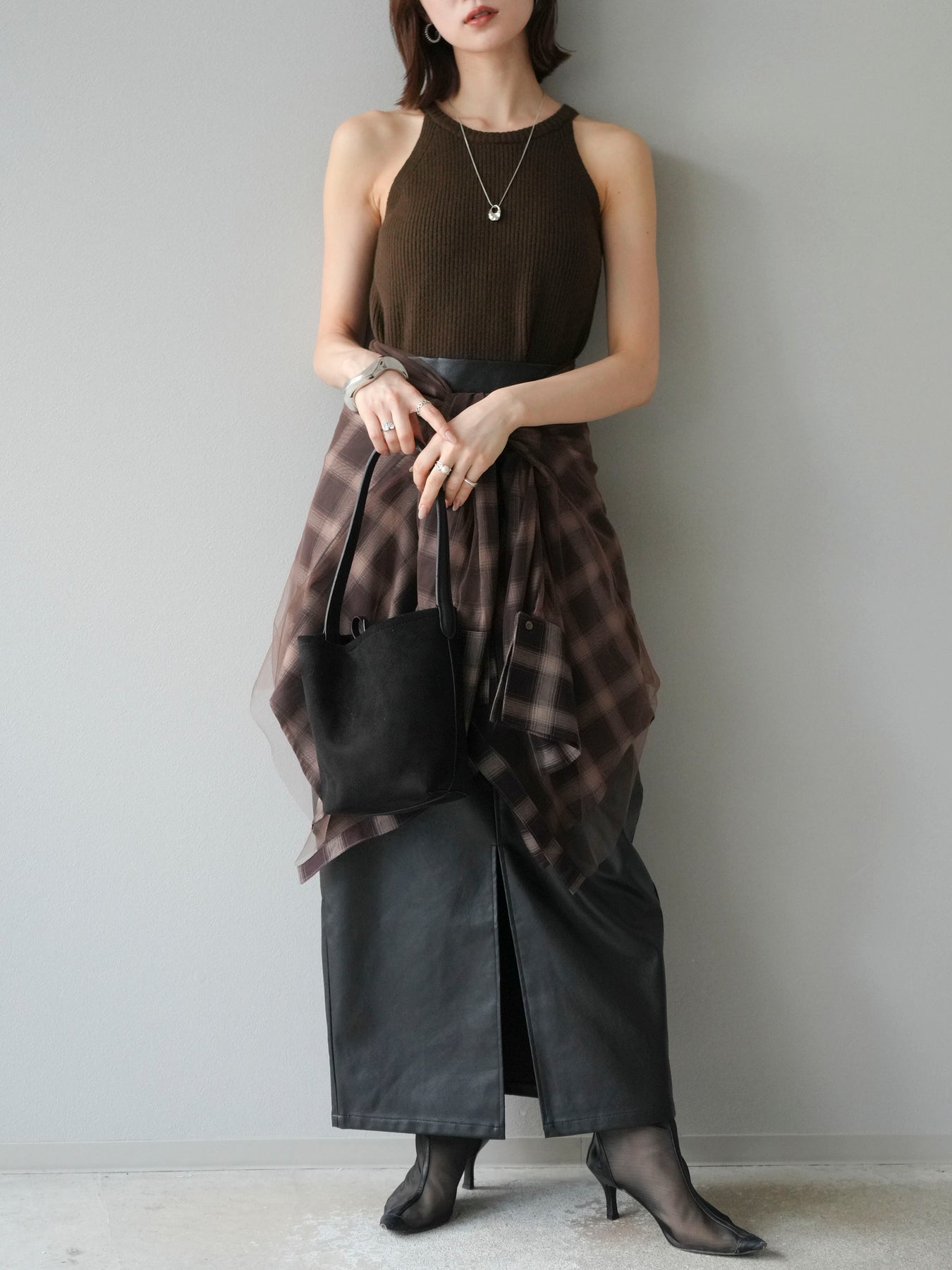 マットな質感のフェイクレザーを使用したフロントスリットスカート。シンプルなIラインシルエットに深めのスリットを施すことで、程よい抜け感と動きやすさを両立しました。タイトすぎないシルエットが大人っぽさを引き立てつつ、スタイルアップ効果も期待できる一枚。トップスをインすればモードな印象に、オーバーサイズのシャツやニットを合わせれば抜け感のあるバランスに仕上がります。デイリー使いから特別なお出かけまで幅広いシーンで活躍する、存在感のあるスカートです。