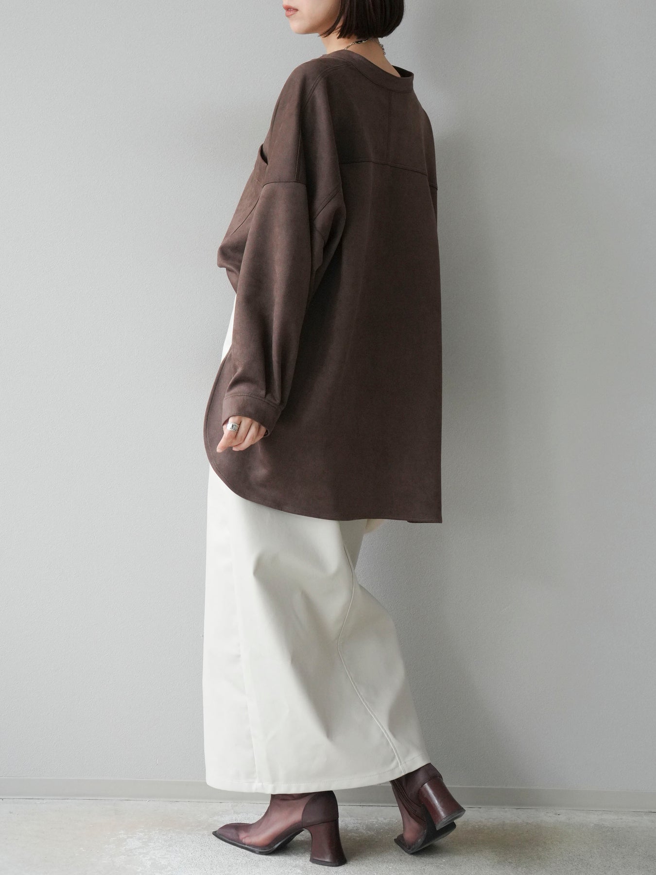 マットな質感のフェイクレザーを使用したフロントスリットスカート。シンプルなIラインシルエットに深めのスリットを施すことで、程よい抜け感と動きやすさを両立しました。タイトすぎないシルエットが大人っぽさを引き立てつつ、スタイルアップ効果も期待できる一枚。トップスをインすればモードな印象に、オーバーサイズのシャツやニットを合わせれば抜け感のあるバランスに仕上がります。デイリー使いから特別なお出かけまで幅広いシーンで活躍する、存在感のあるスカートです。