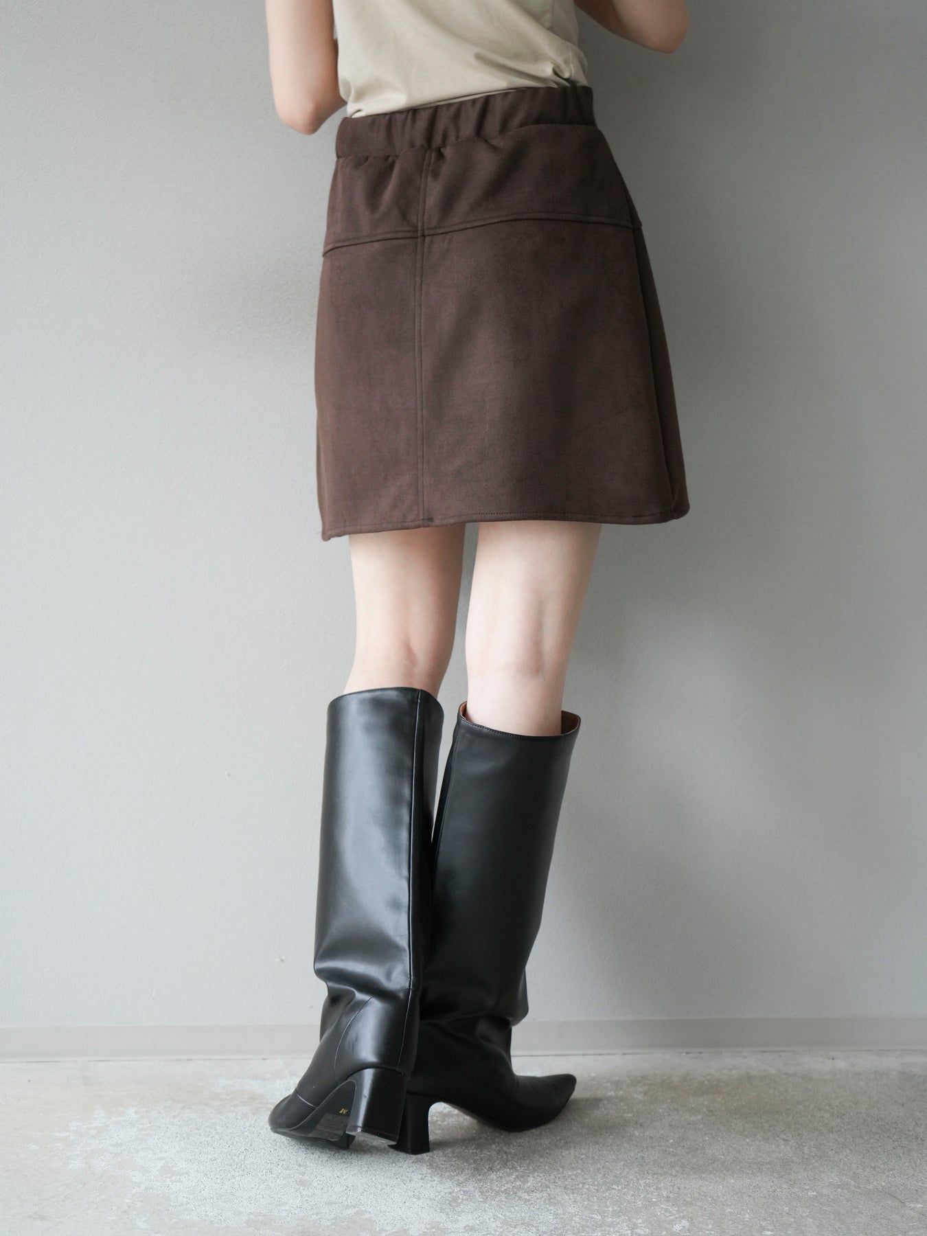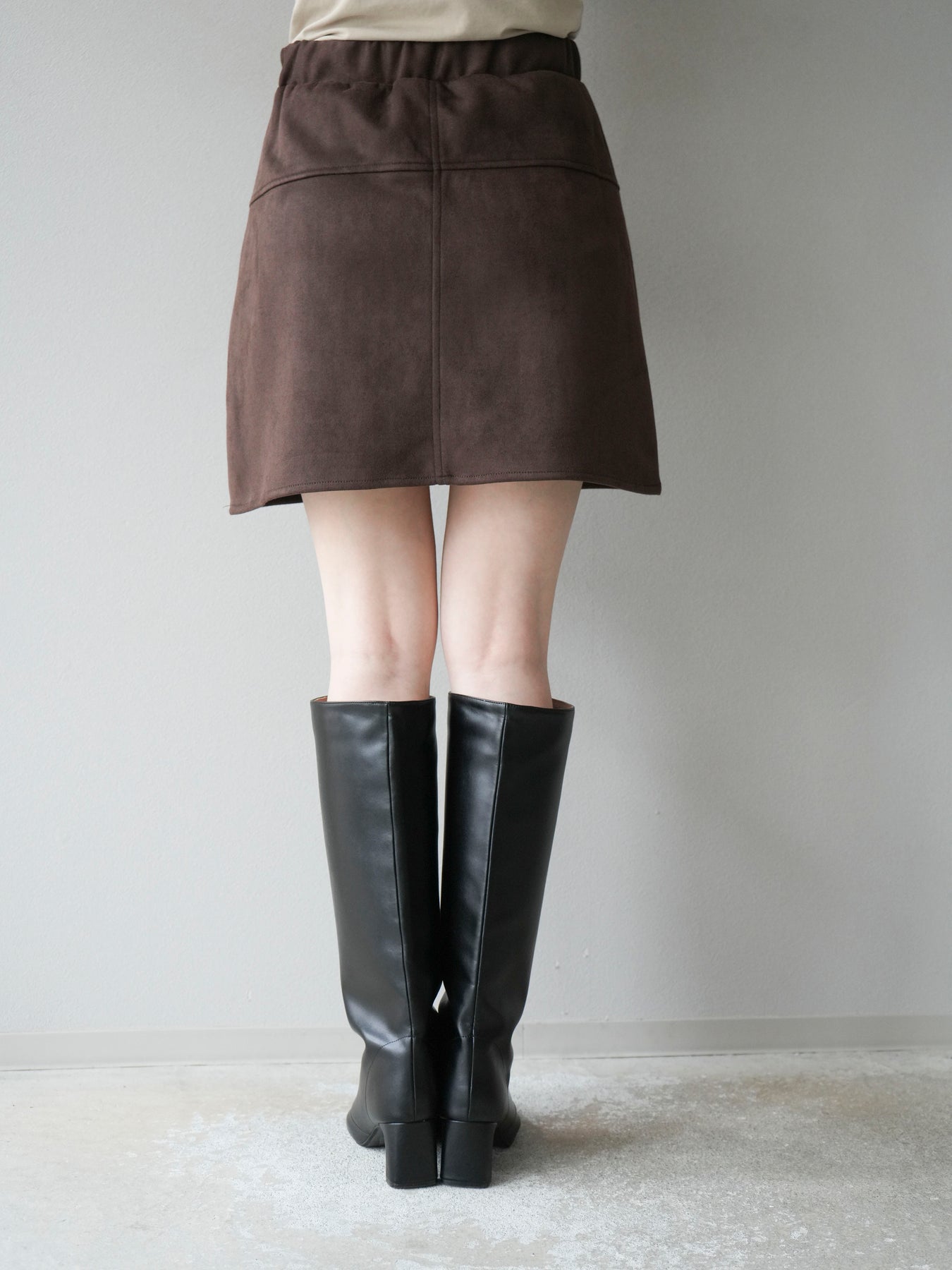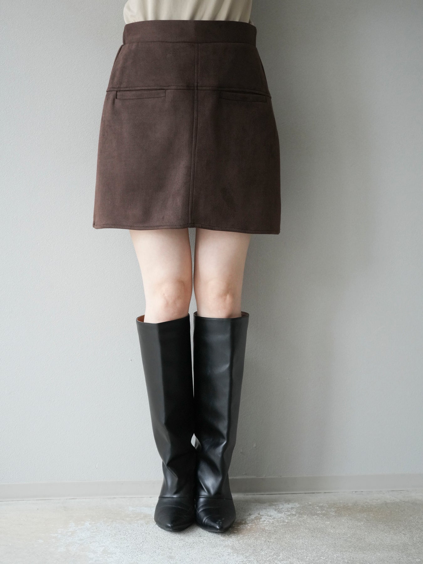 しなやかなスエード調素材を使用したミニスカート。切替ラインがデザインポイントになり、シンプルながらも立体感のある表情を演出します。コンパクトな丈感でスタイルアップ効果があり、トップスをインすればバランス良くまとまる一着。ニットやブラウスと合わせてフェミニンに、スウェットやジャケットと合わせてカジュアルにも着こなせる万能アイテムです。季節感のある素材感で、秋冬のスタイリングに取り入れやすいのも魅力。