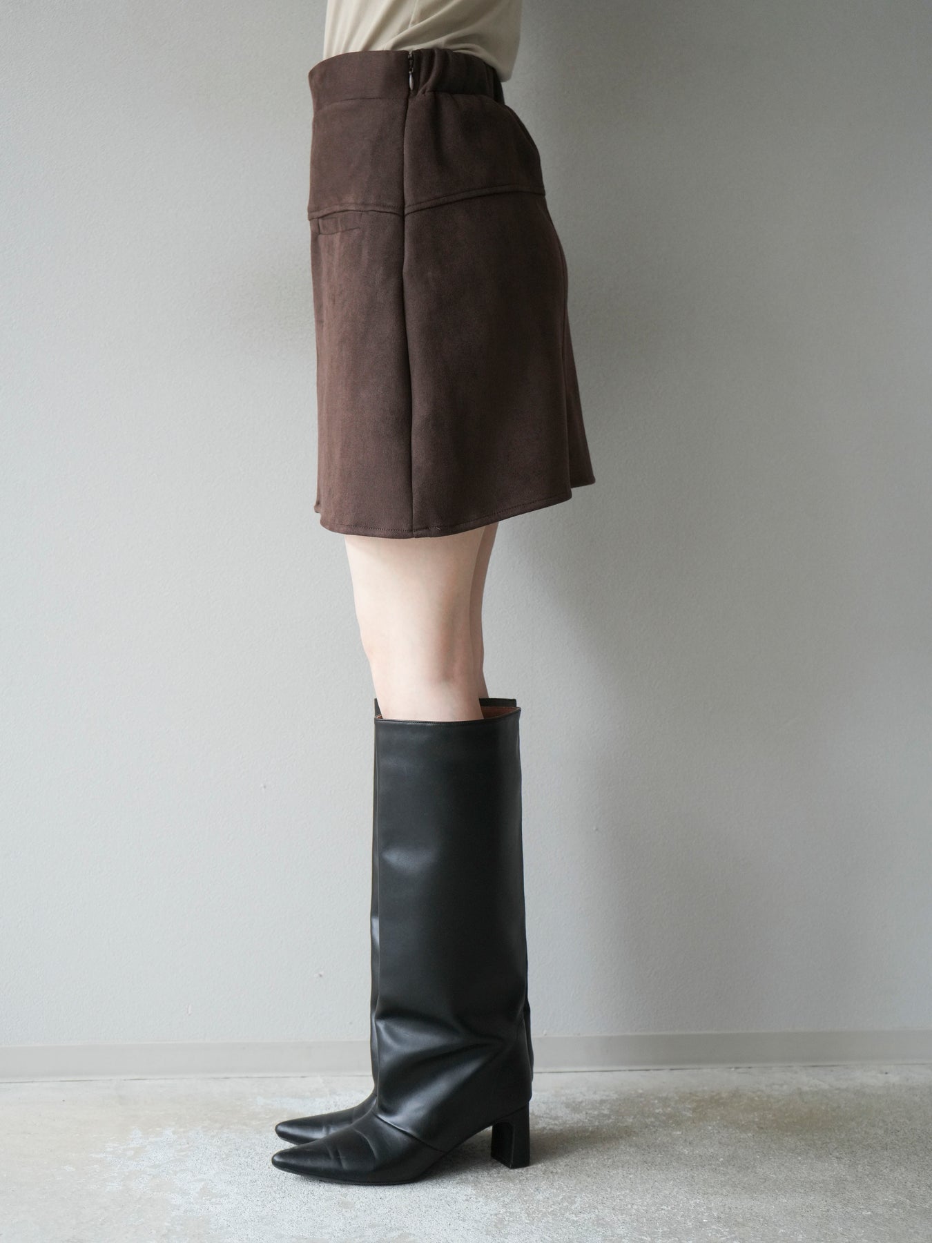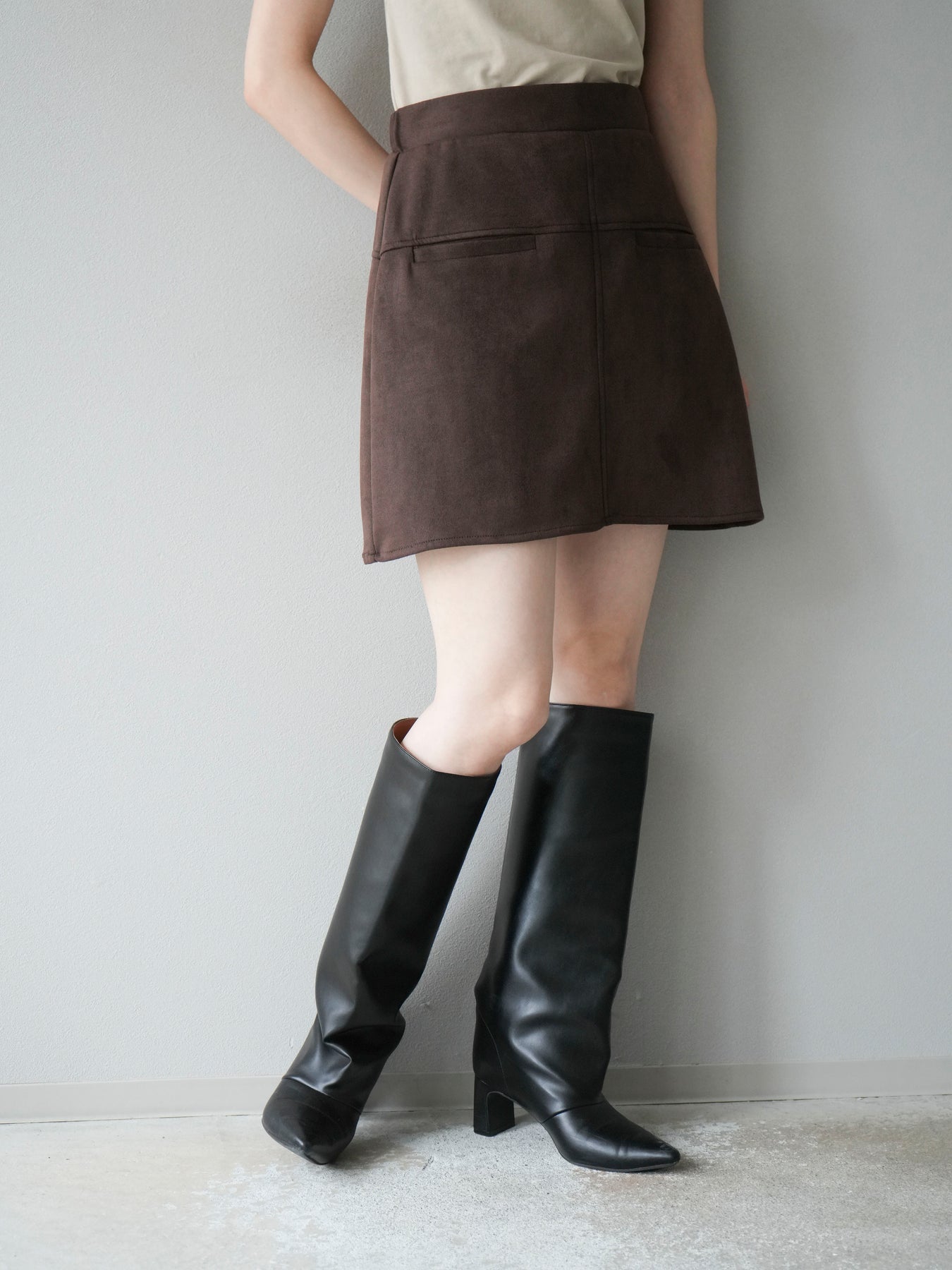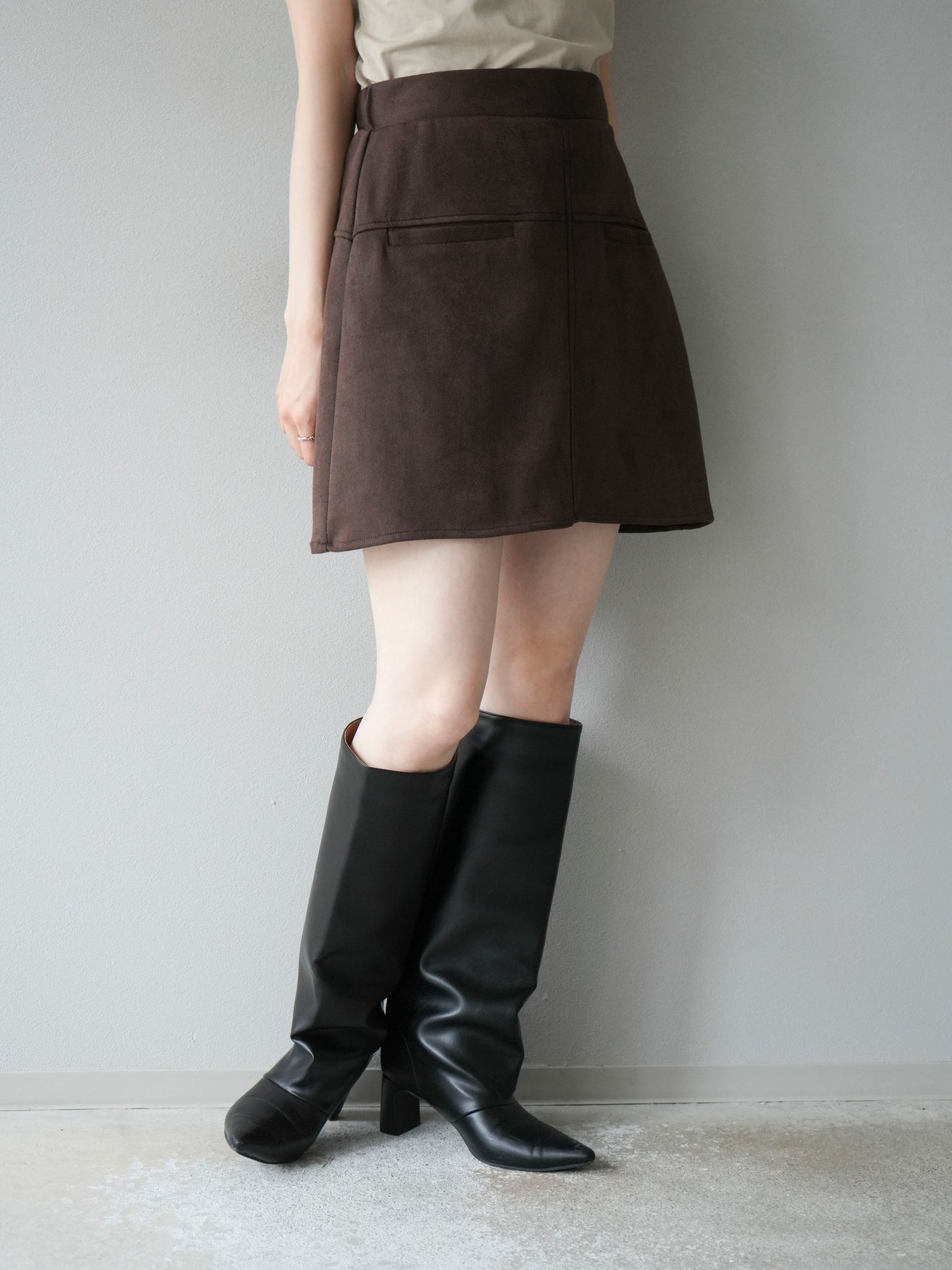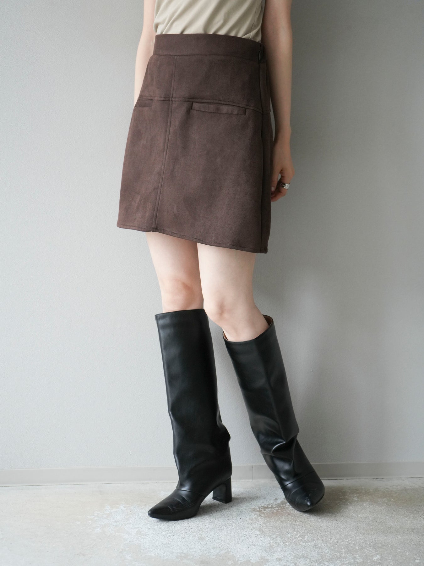 しなやかなスエード調素材を使用したミニスカート。切替ラインがデザインポイントになり、シンプルながらも立体感のある表情を演出します。コンパクトな丈感でスタイルアップ効果があり、トップスをインすればバランス良くまとまる一着。ニットやブラウスと合わせてフェミニンに、スウェットやジャケットと合わせてカジュアルにも着こなせる万能アイテムです。季節感のある素材感で、秋冬のスタイリングに取り入れやすいのも魅力。