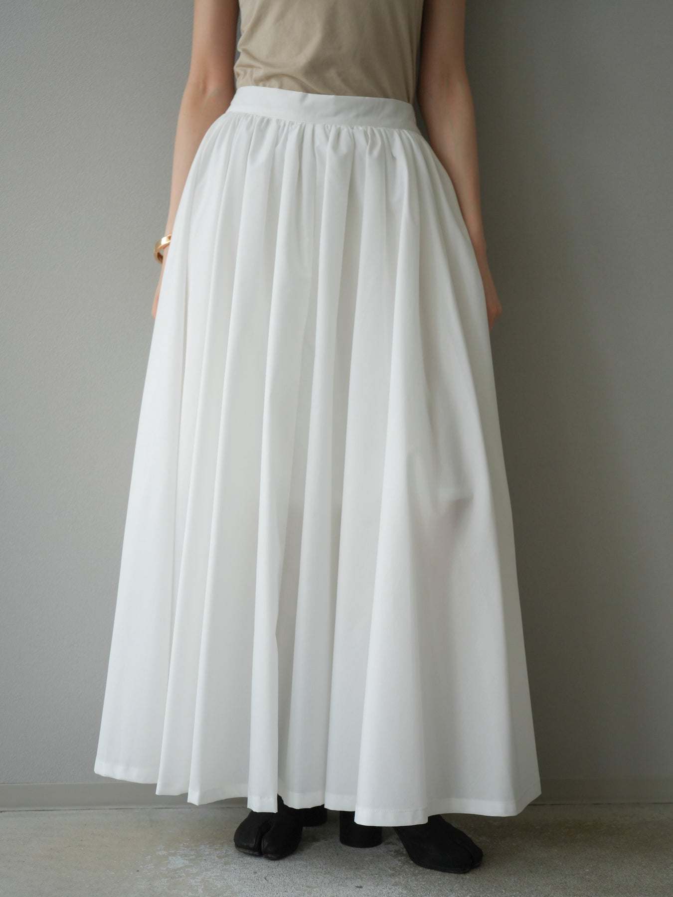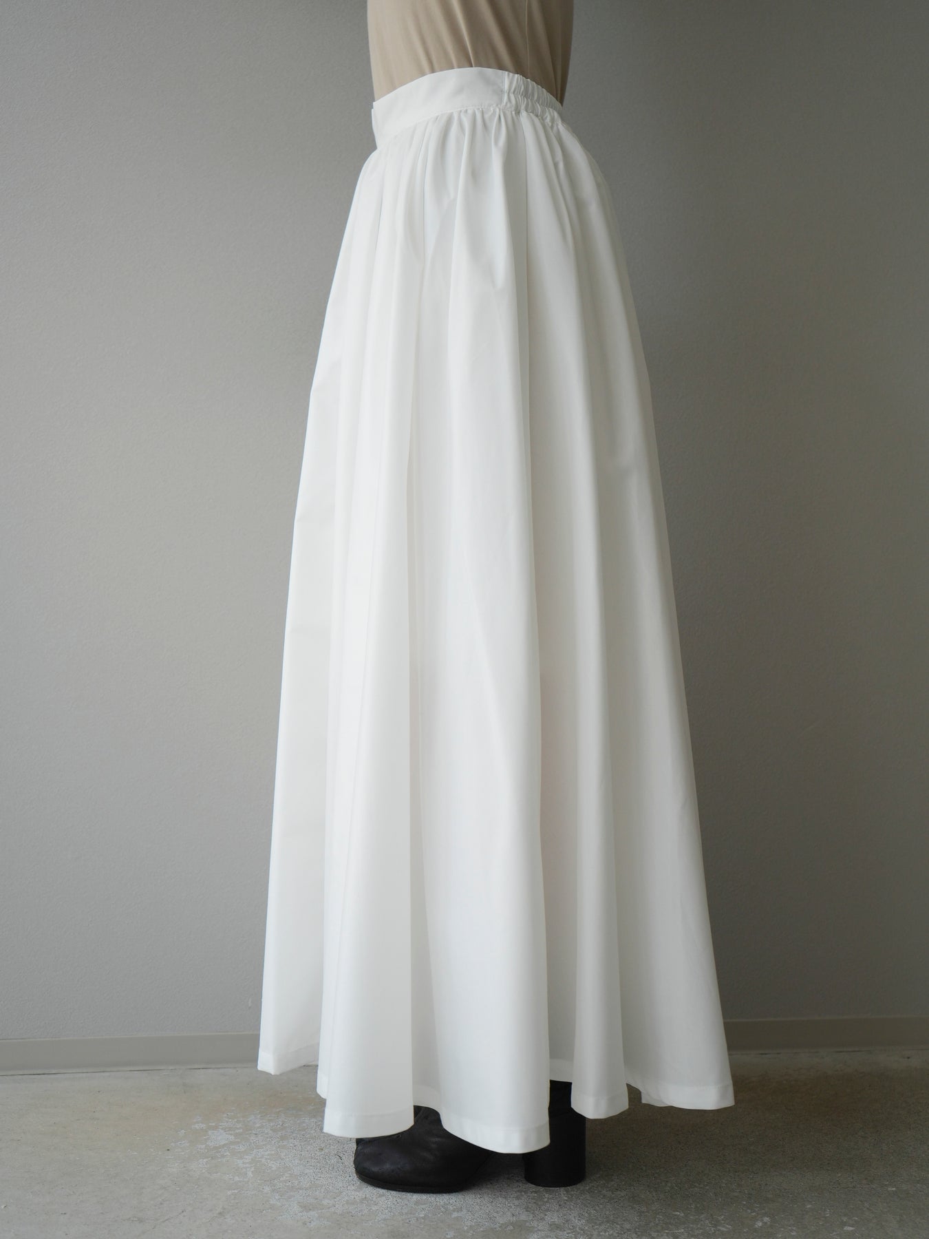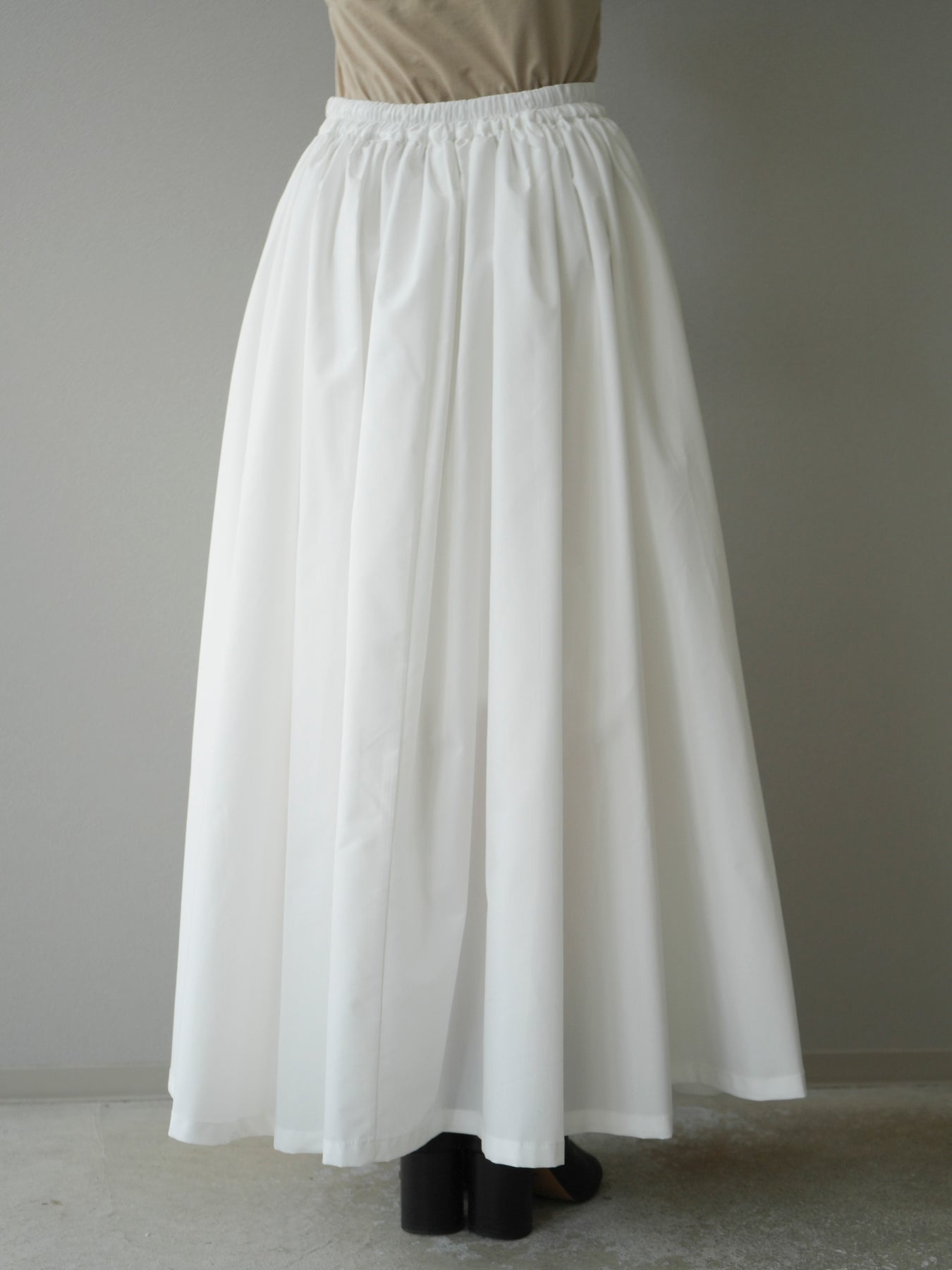 程よいハリのあるブロード素材を使用し、美しいフレアラインを実現。ウエストはギャザー入りで楽な穿き心地ながら、腰まわりはすっきり見える計算されたデザインです。シンプルながら存在感があり、Tシャツやブラウスと合わせるだけでスタイリングが決まる万能アイテム。カジュアルにもきれいめにも着回せて、季節を問わず活躍してくれる一着です。