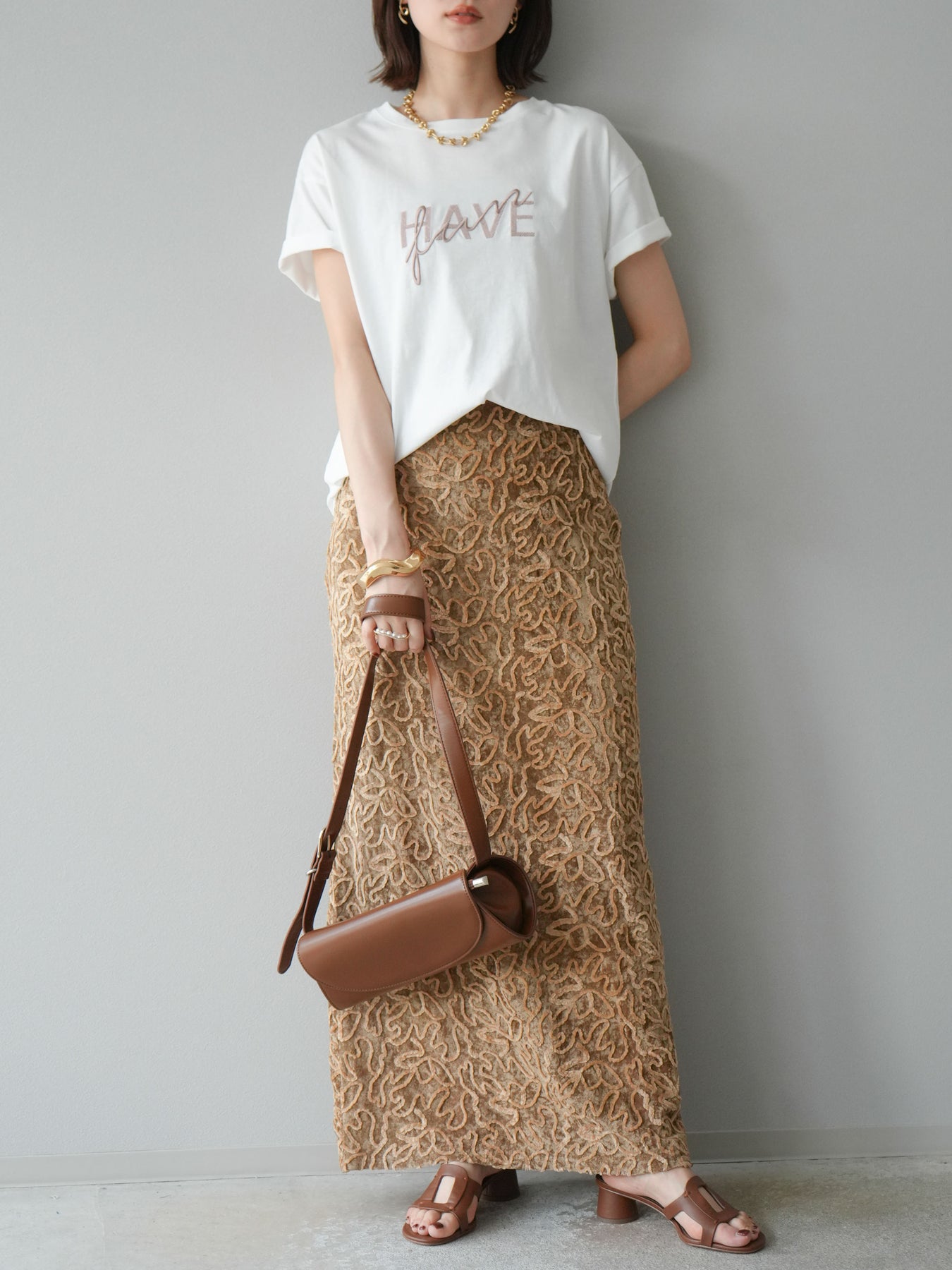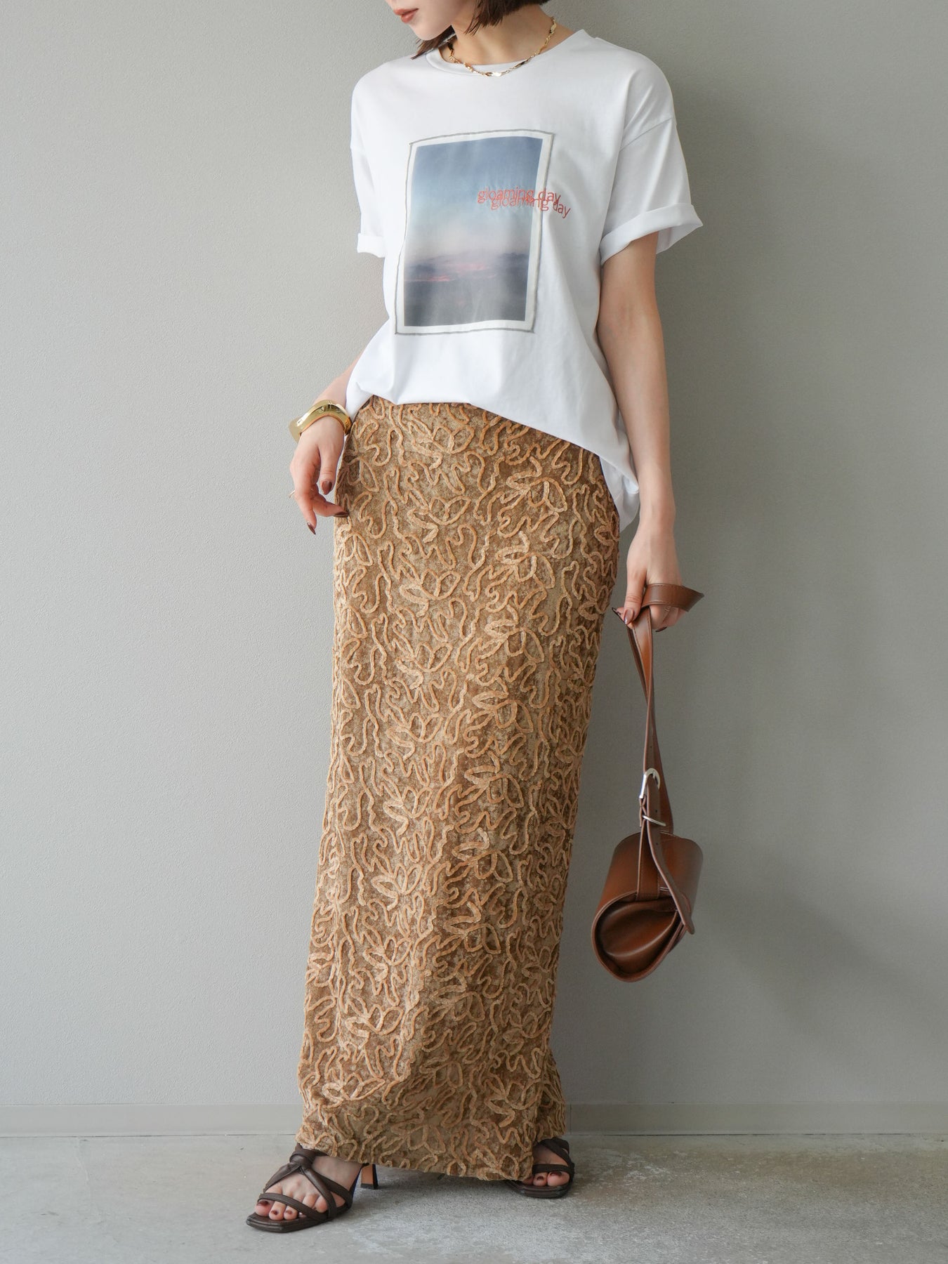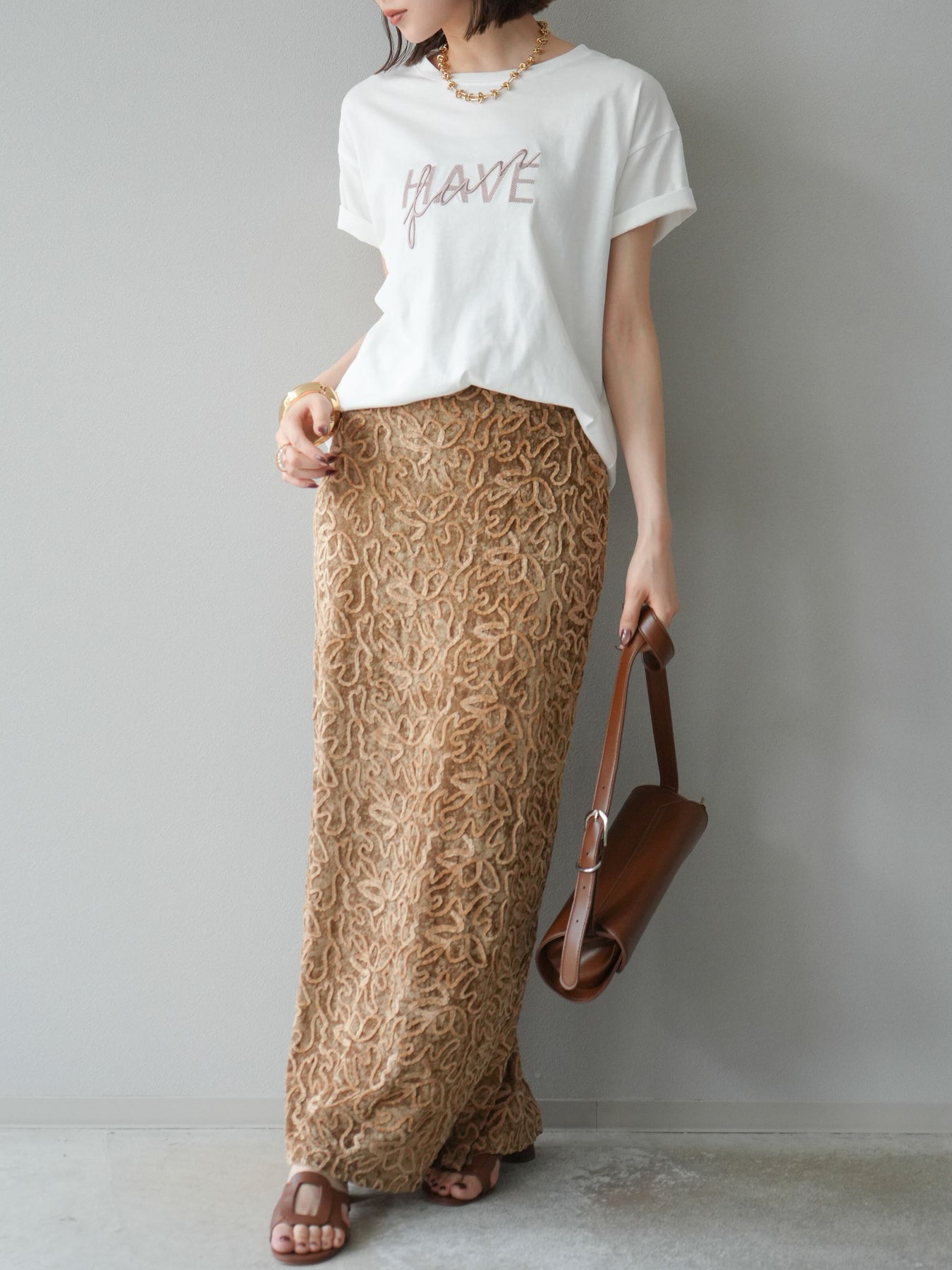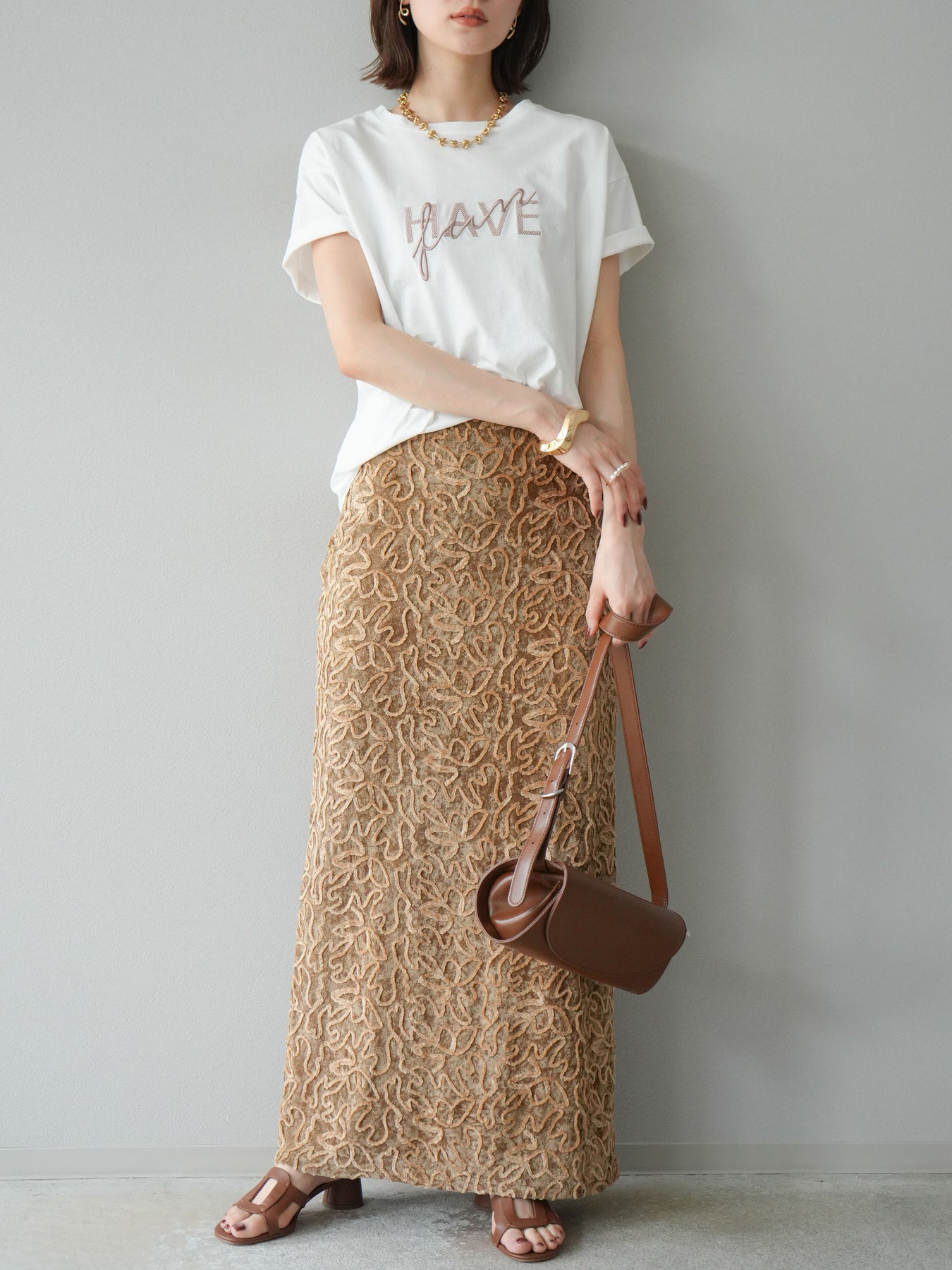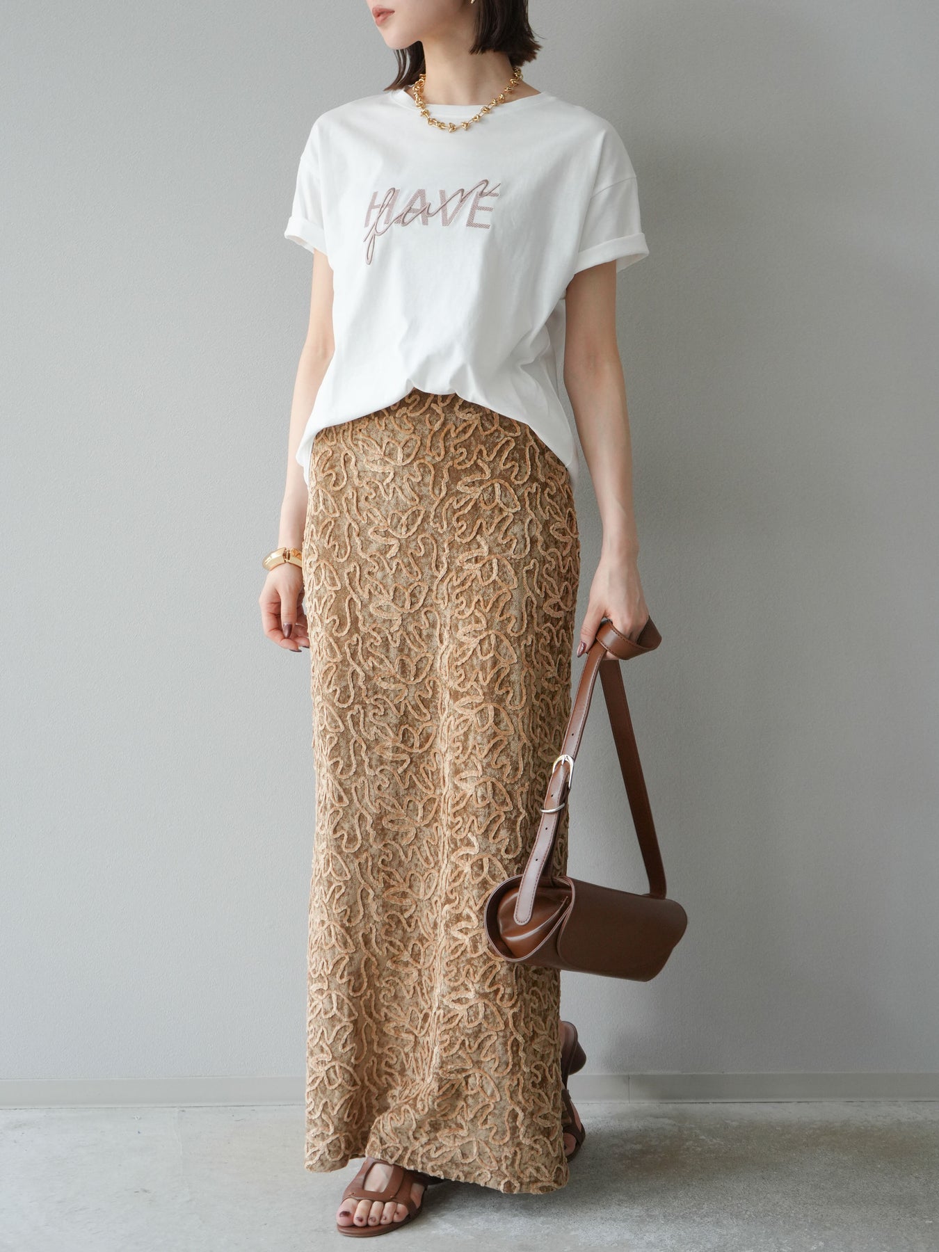 立体的なフラワー柄が印象的なシアーベロア素材のロングスカート。パイピング調の起毛デザインが存在感を放ち、コーディネートに奥行きをプラスします。裏地付きで透け感を抑えつつ、軽やかな抜け感を演出。すっきりとしたIラインシルエットが大人な印象で、トップスを選ばず幅広く活躍します。同素材のキャミソールとのセットアップスタイルもおすすめです。 ※ボトムス、キャミソール(インナー)以外の商品は一律でインナーは付属していません
