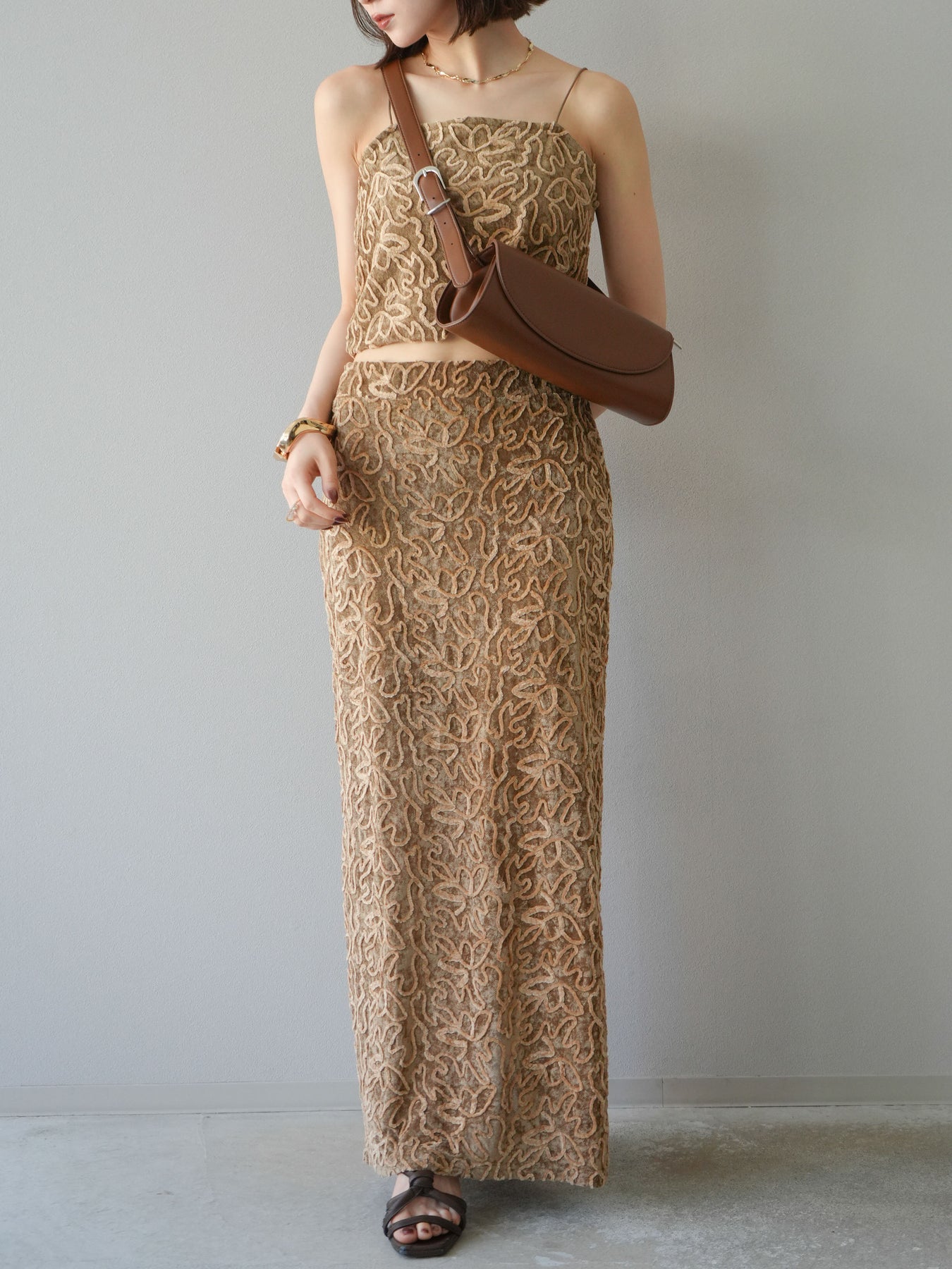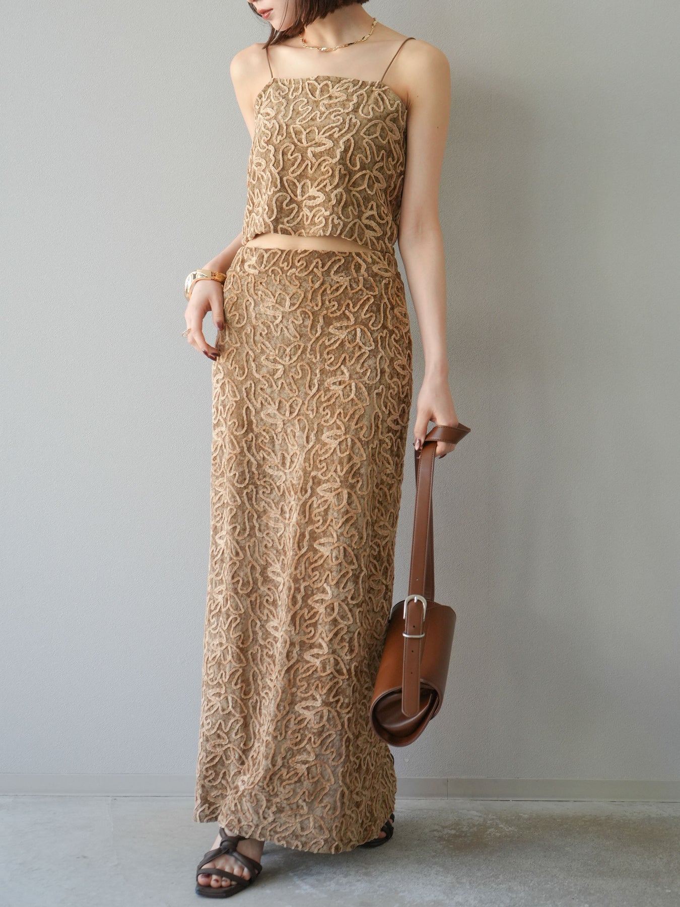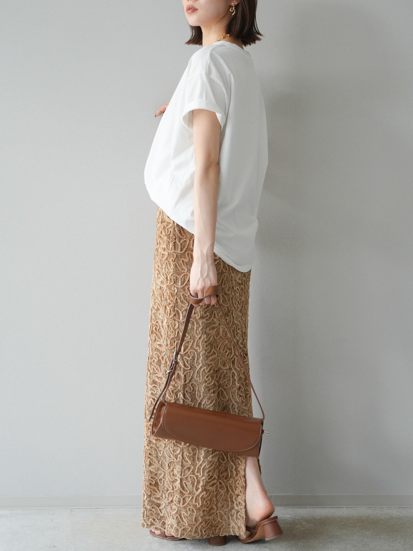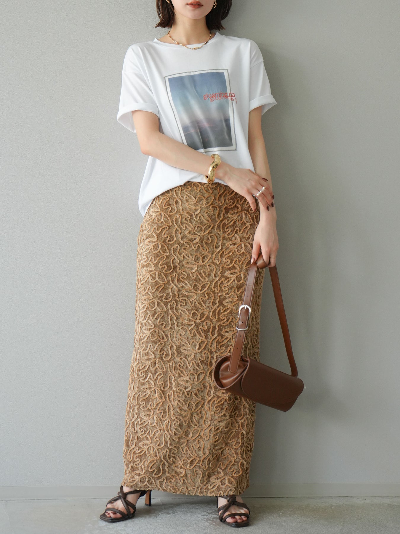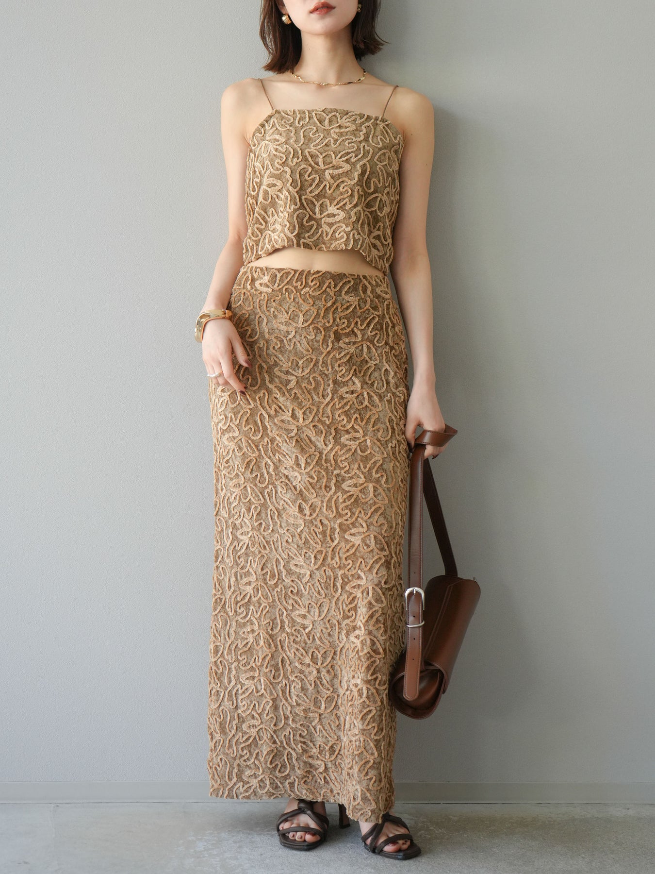 立体的なフラワー柄が印象的なシアーベロア素材のロングスカート。パイピング調の起毛デザインが存在感を放ち、コーディネートに奥行きをプラスします。裏地付きで透け感を抑えつつ、軽やかな抜け感を演出。すっきりとしたIラインシルエットが大人な印象で、トップスを選ばず幅広く活躍します。同素材のキャミソールとのセットアップスタイルもおすすめです。 ※ボトムス、キャミソール(インナー)以外の商品は一律でインナーは付属していません
