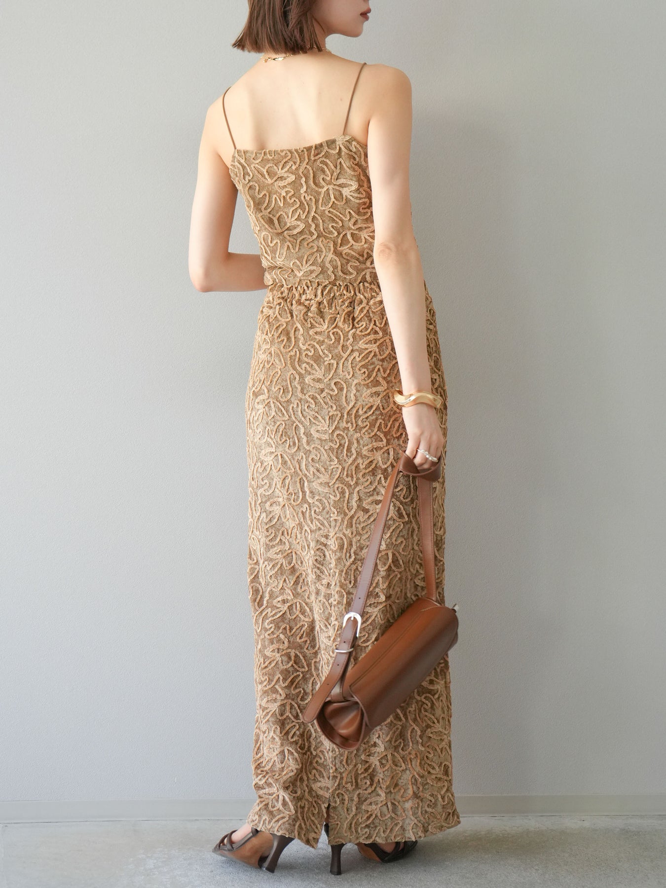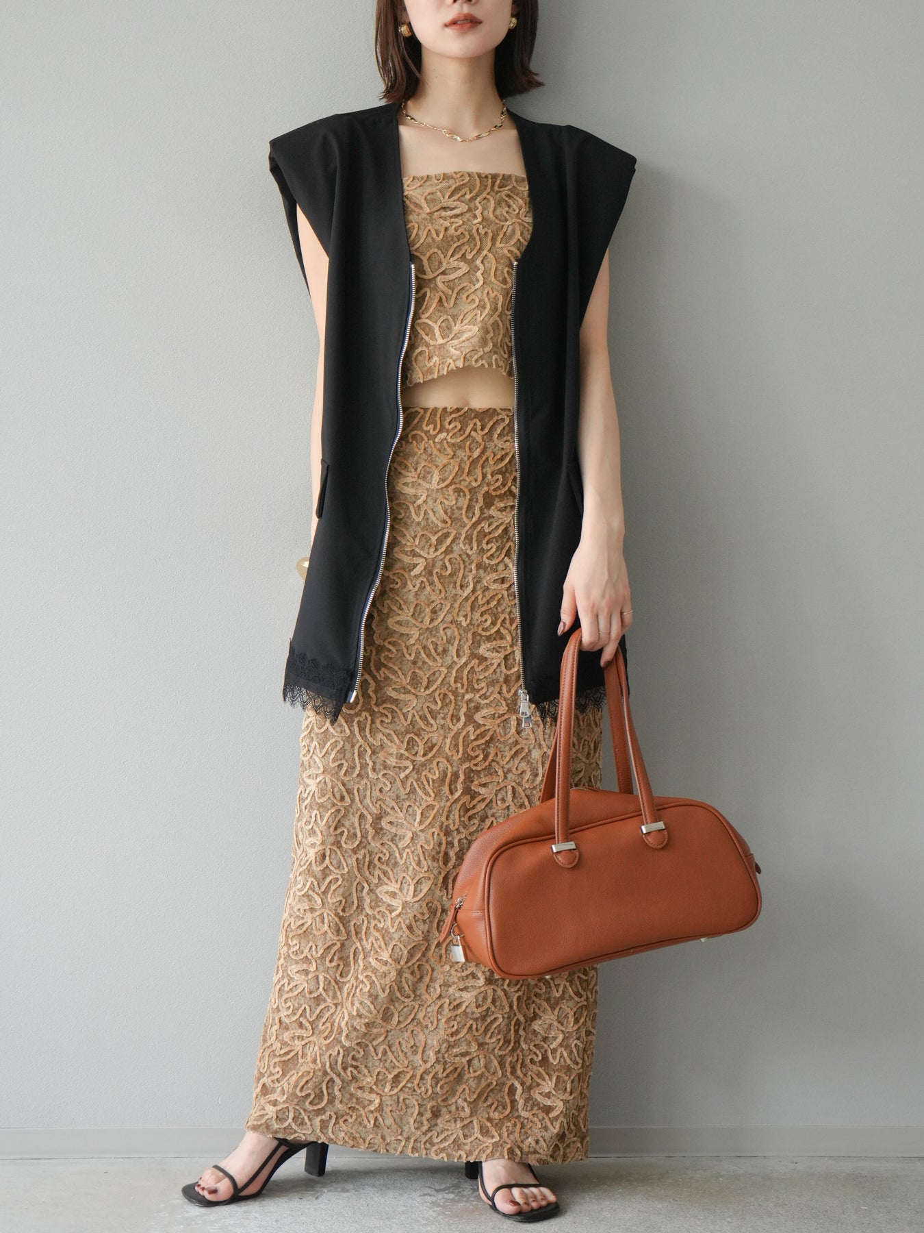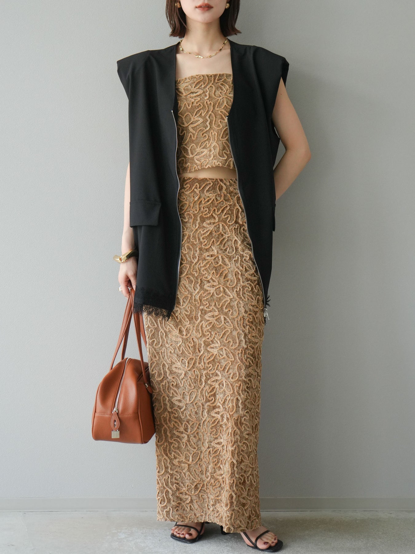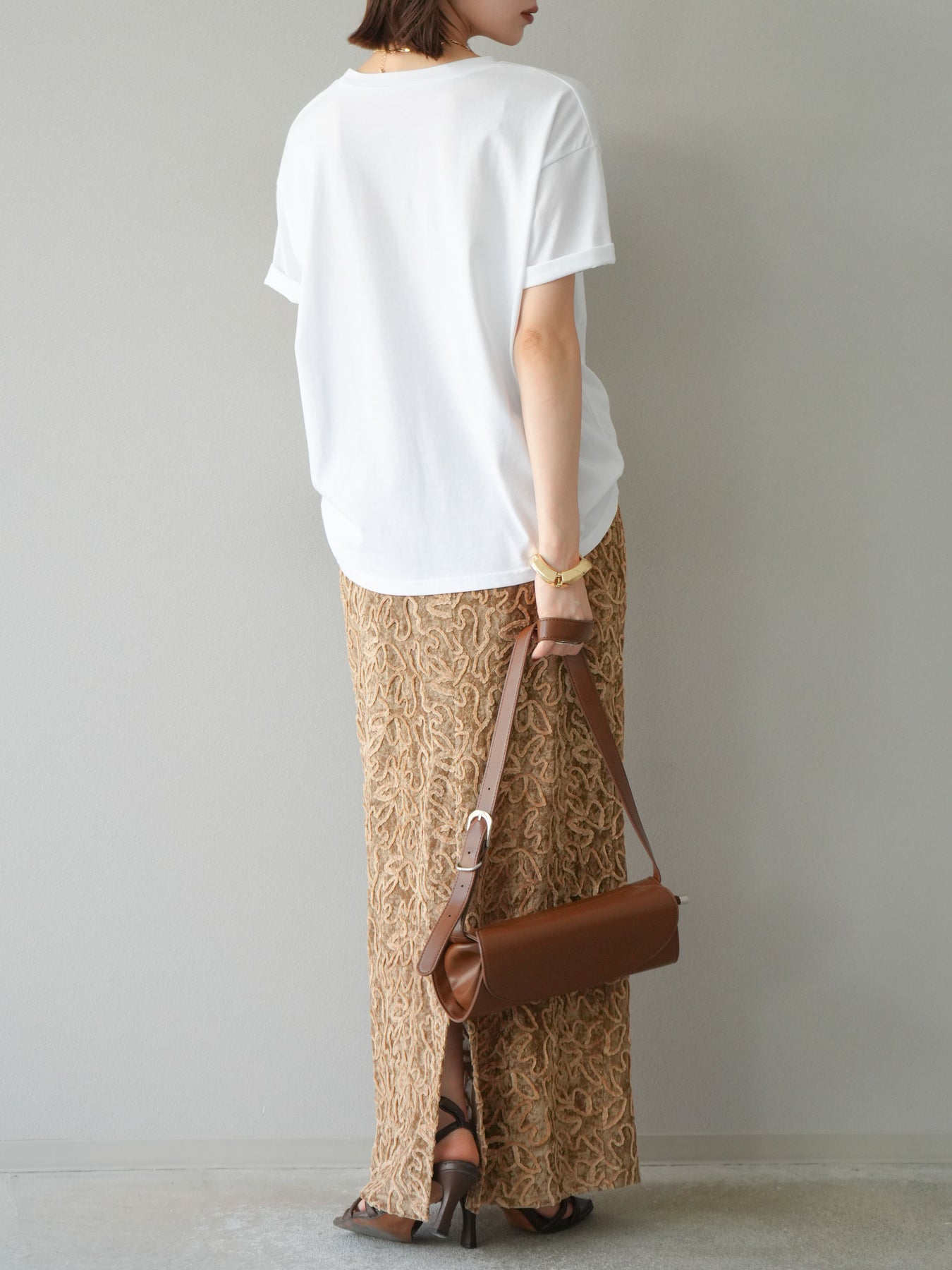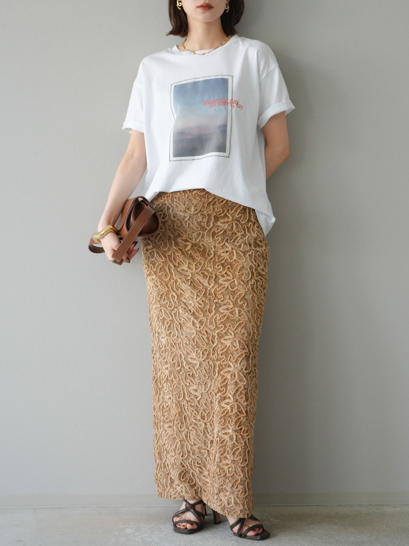 立体的なフラワー柄が印象的なシアーベロア素材のロングスカート。パイピング調の起毛デザインが存在感を放ち、コーディネートに奥行きをプラスします。裏地付きで透け感を抑えつつ、軽やかな抜け感を演出。すっきりとしたIラインシルエットが大人な印象で、トップスを選ばず幅広く活躍します。同素材のキャミソールとのセットアップスタイルもおすすめです。 ※ボトムス、キャミソール(インナー)以外の商品は一律でインナーは付属していません
