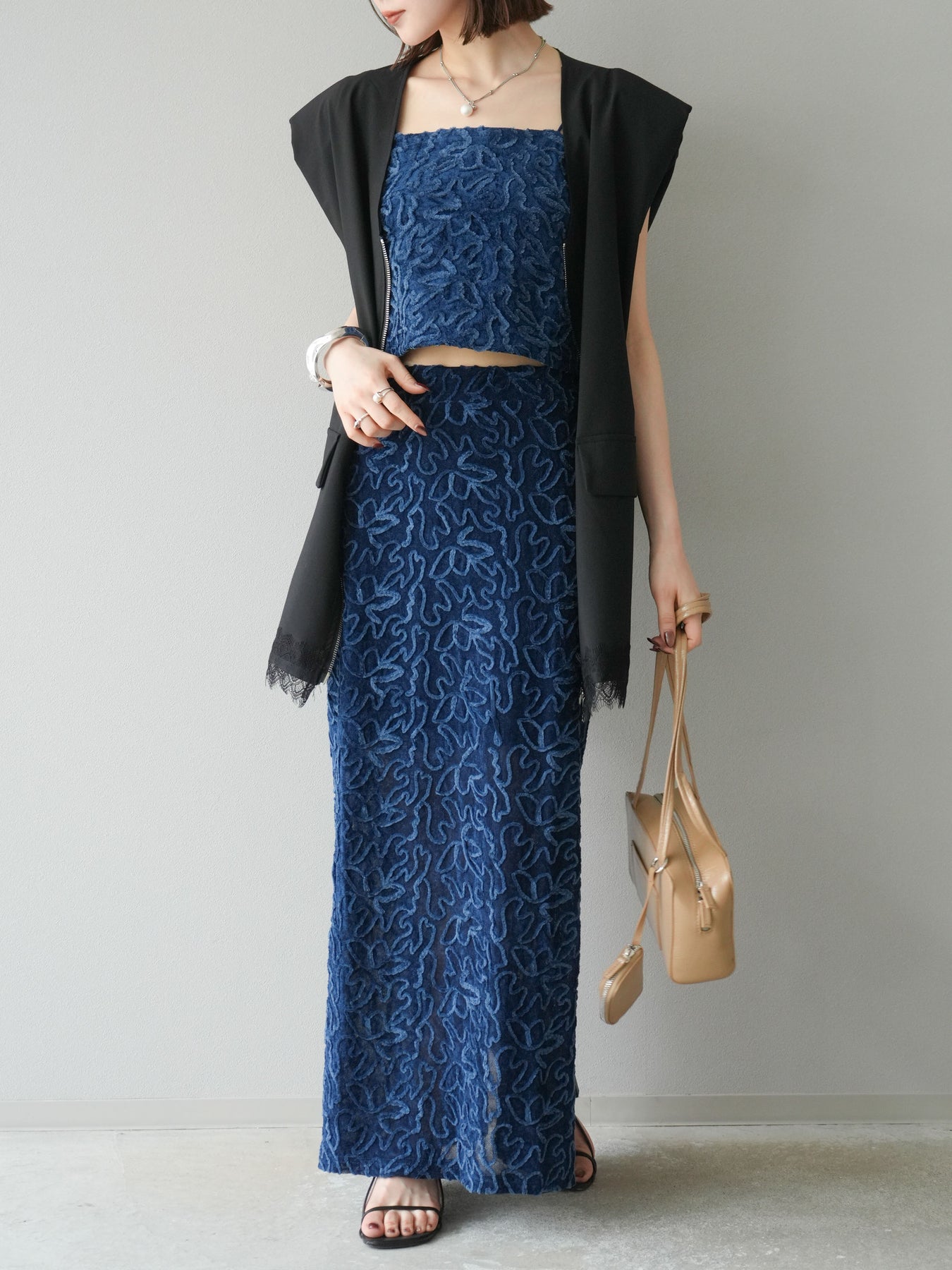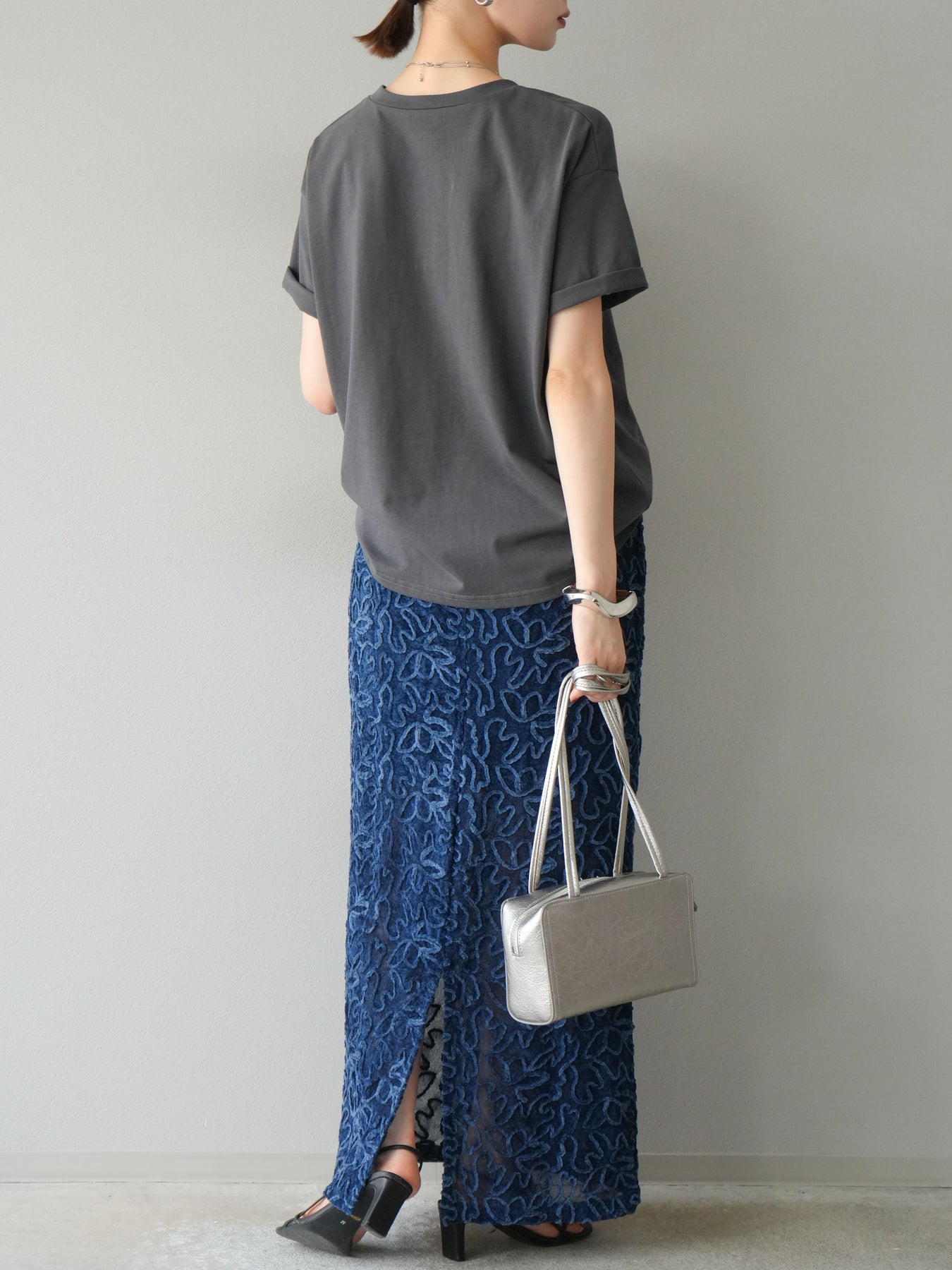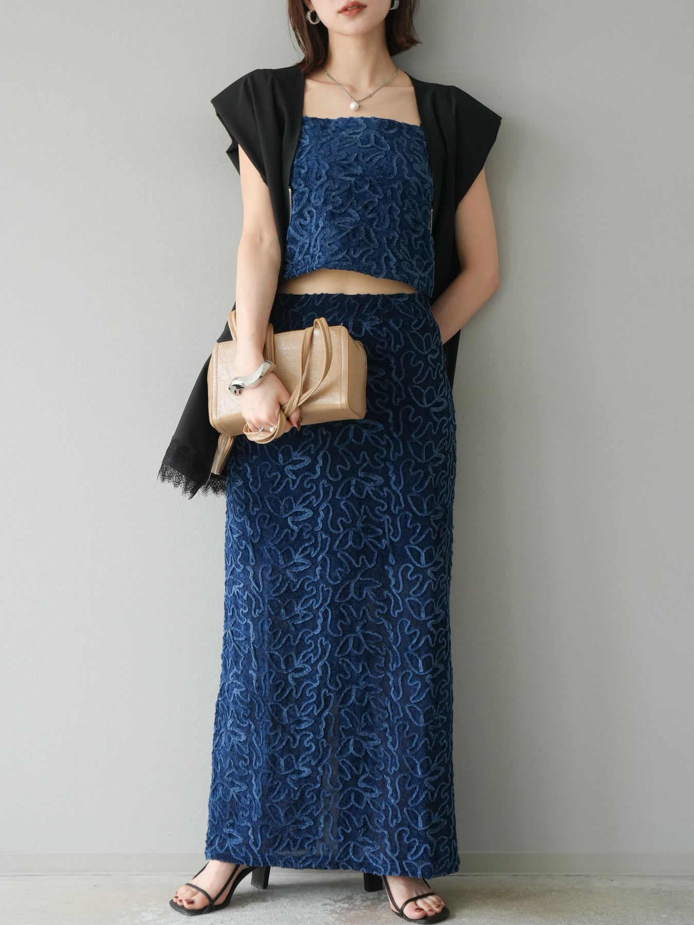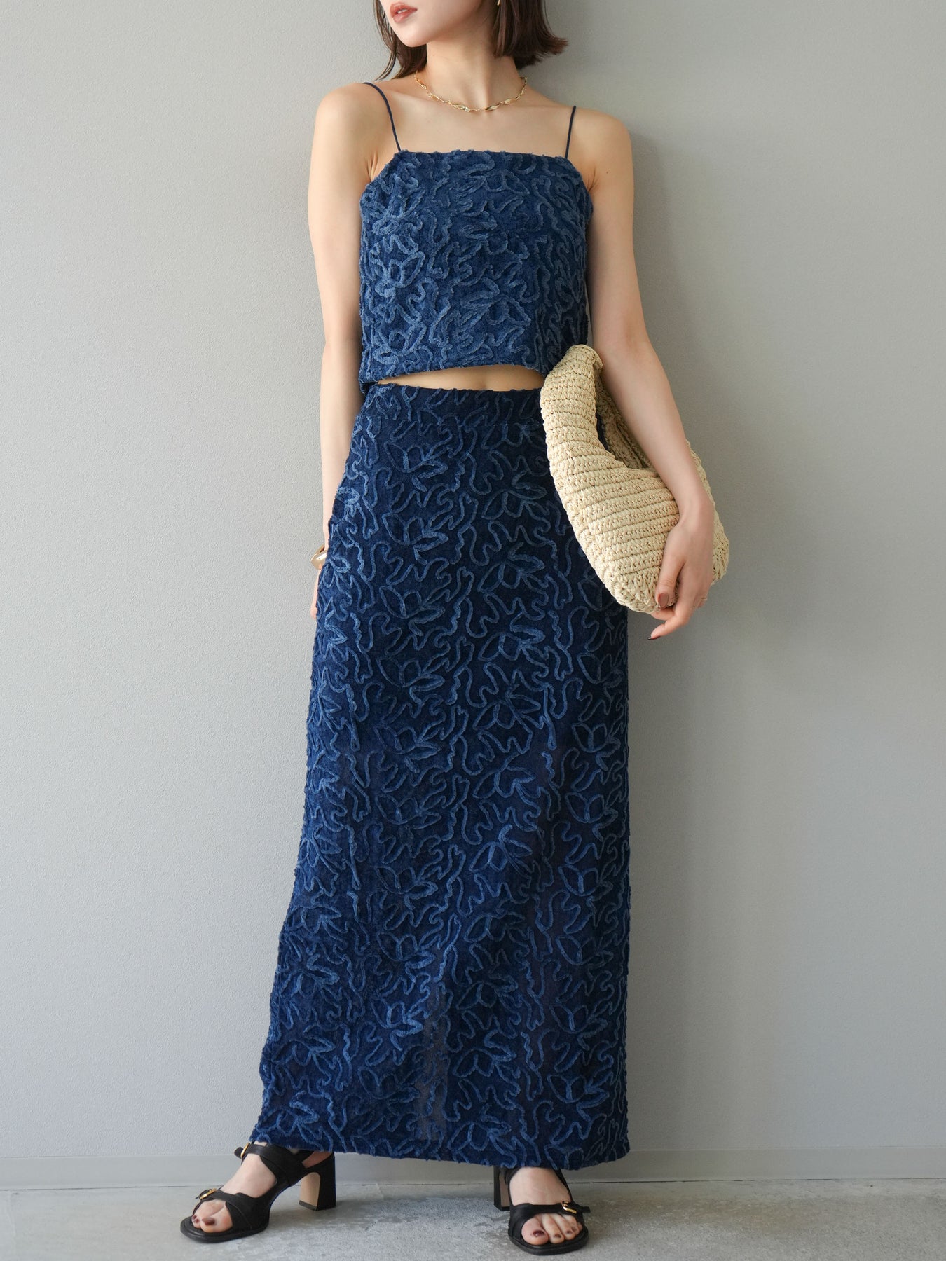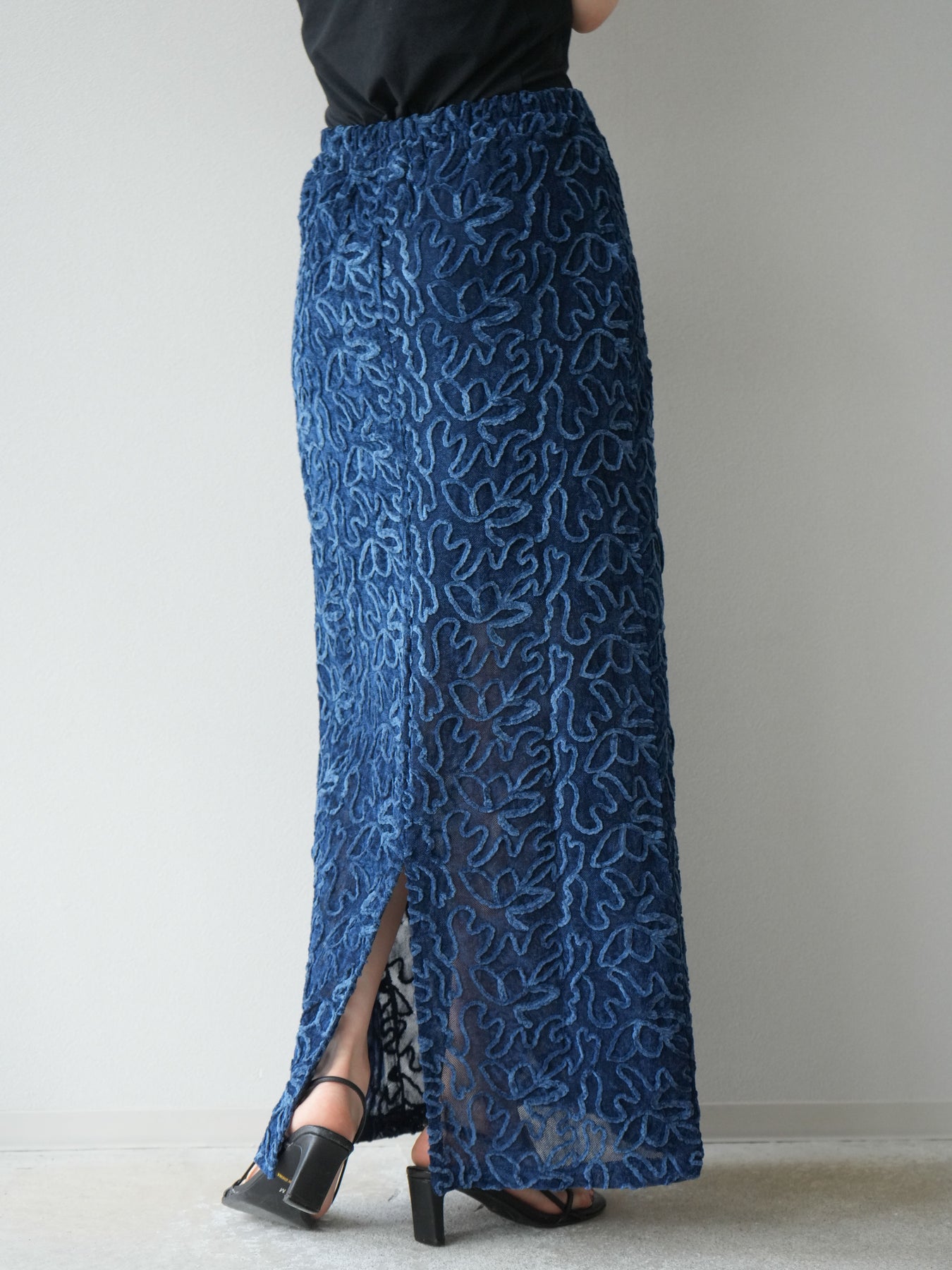 立体的なフラワー柄が印象的なシアーベロア素材のロングスカート。パイピング調の起毛デザインが存在感を放ち、コーディネートに奥行きをプラスします。裏地付きで透け感を抑えつつ、軽やかな抜け感を演出。すっきりとしたIラインシルエットが大人な印象で、トップスを選ばず幅広く活躍します。同素材のキャミソールとのセットアップスタイルもおすすめです。 ※ボトムス、キャミソール(インナー)以外の商品は一律でインナーは付属していません