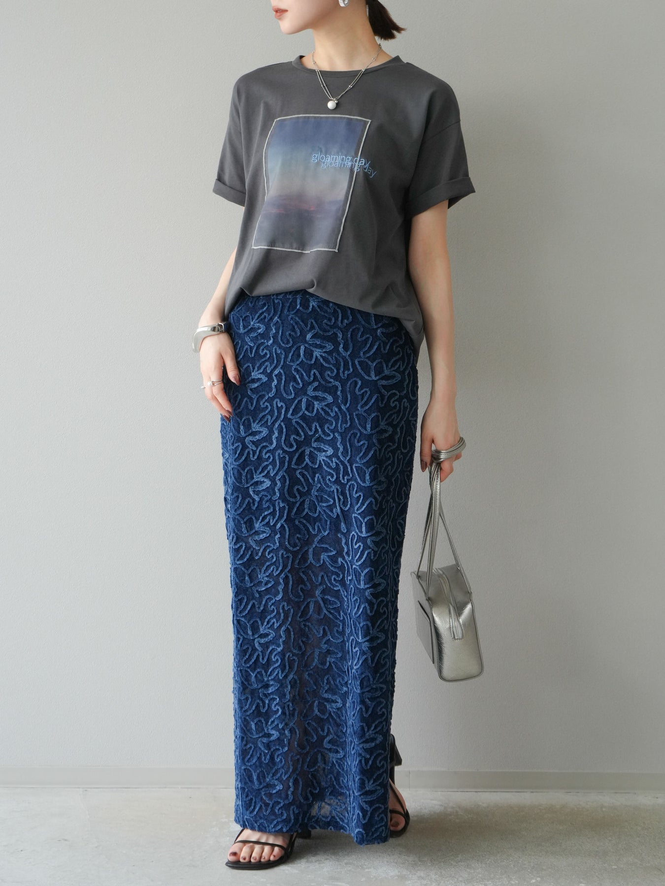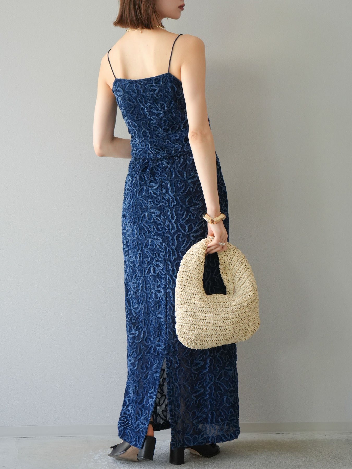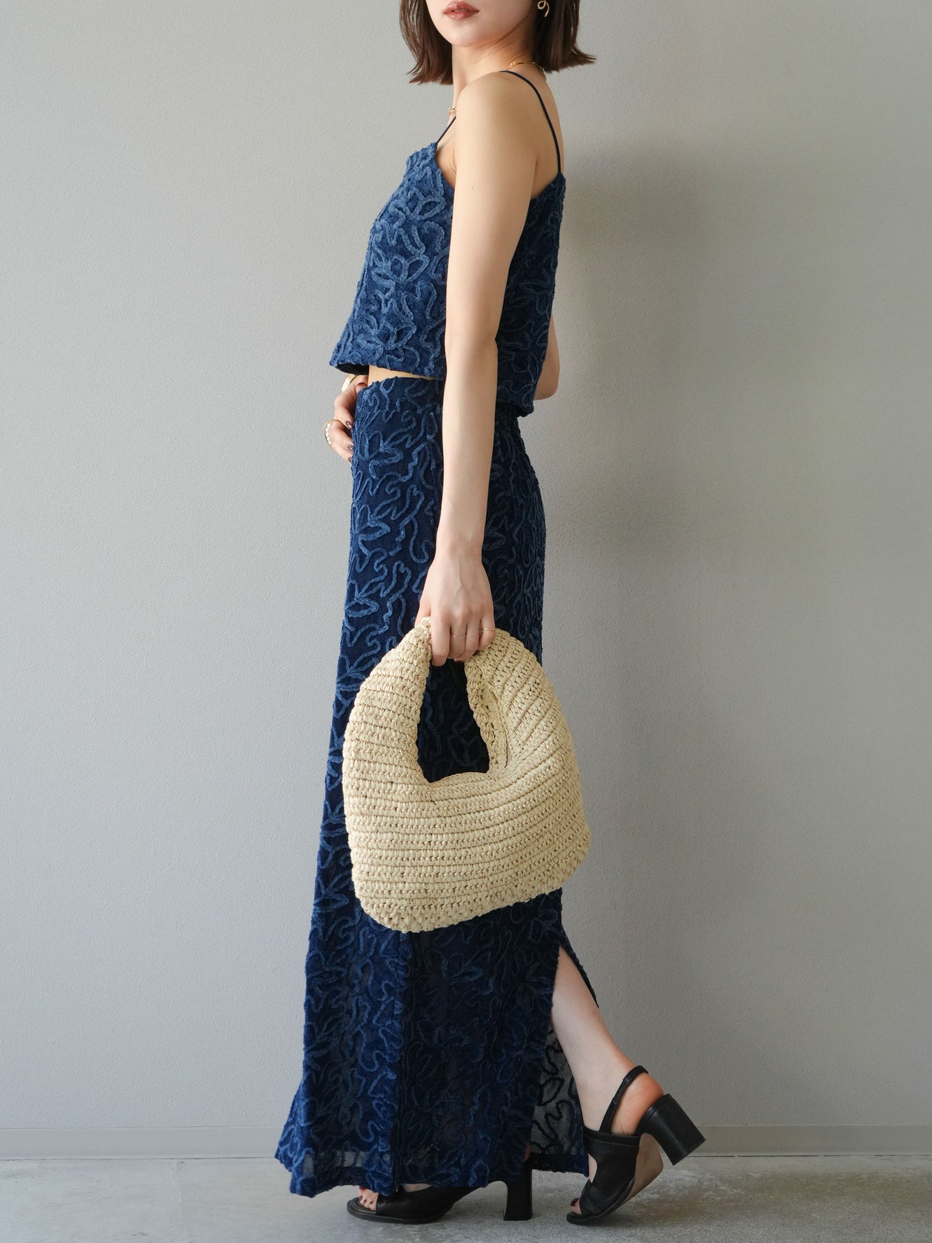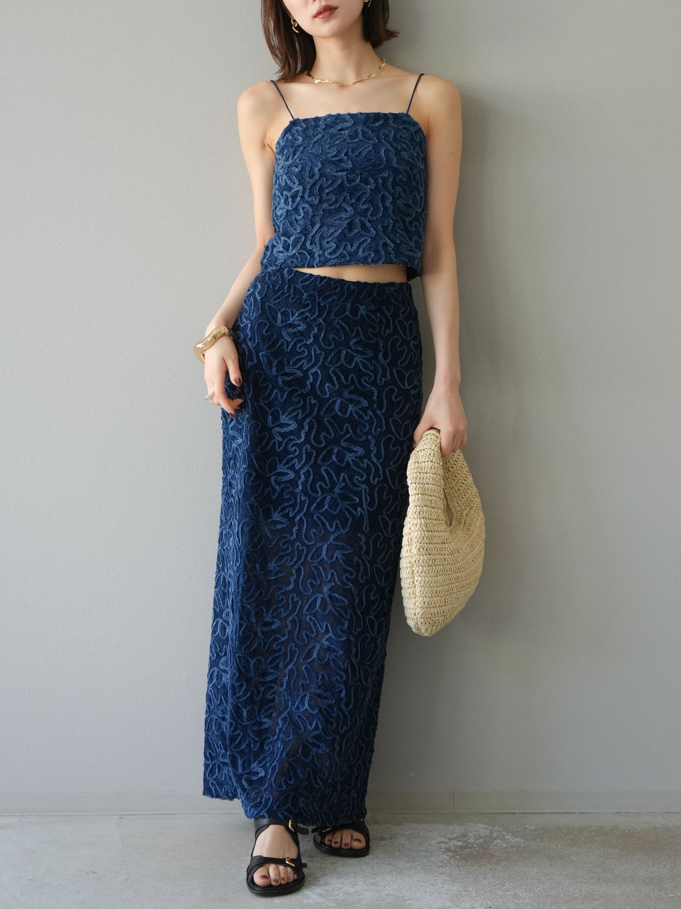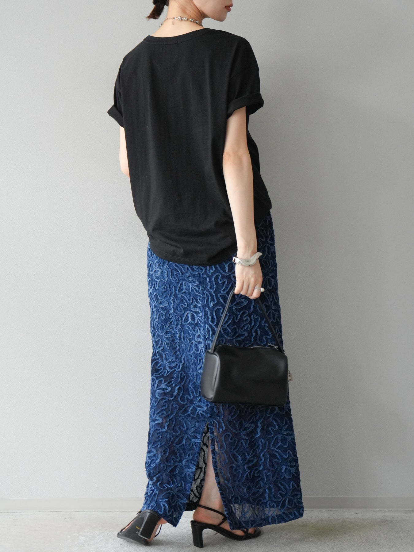 立体的なフラワー柄が印象的なシアーベロア素材のロングスカート。パイピング調の起毛デザインが存在感を放ち、コーディネートに奥行きをプラスします。裏地付きで透け感を抑えつつ、軽やかな抜け感を演出。すっきりとしたIラインシルエットが大人な印象で、トップスを選ばず幅広く活躍します。同素材のキャミソールとのセットアップスタイルもおすすめです。 ※ボトムス、キャミソール(インナー)以外の商品は一律でインナーは付属していません