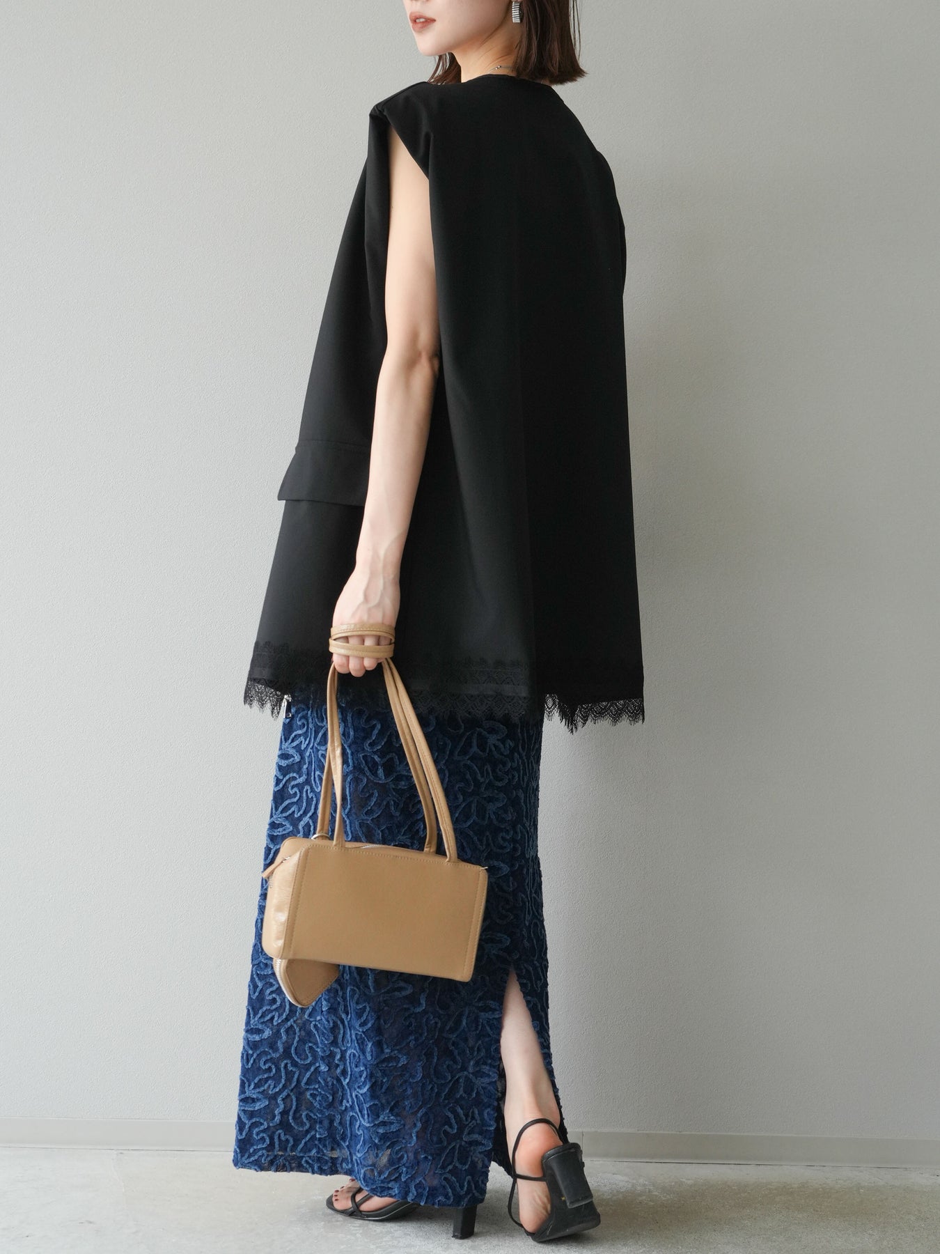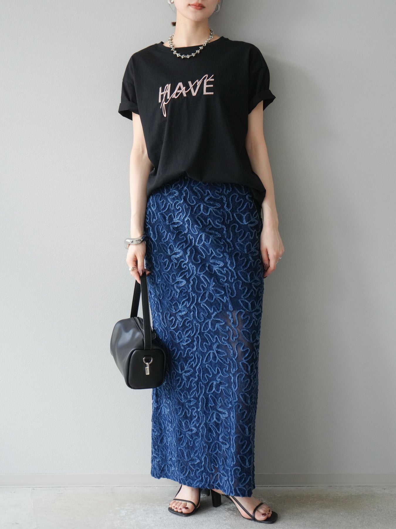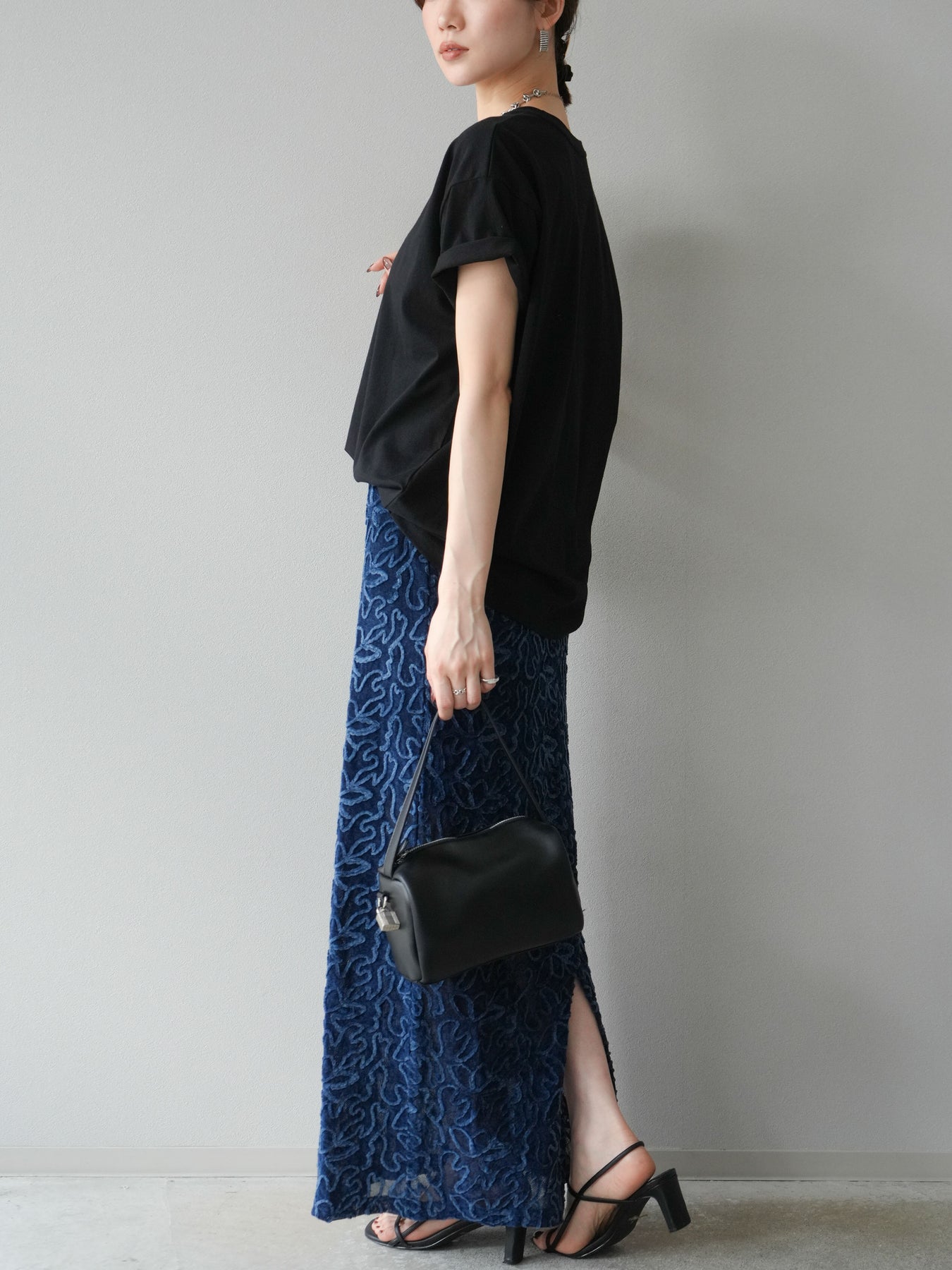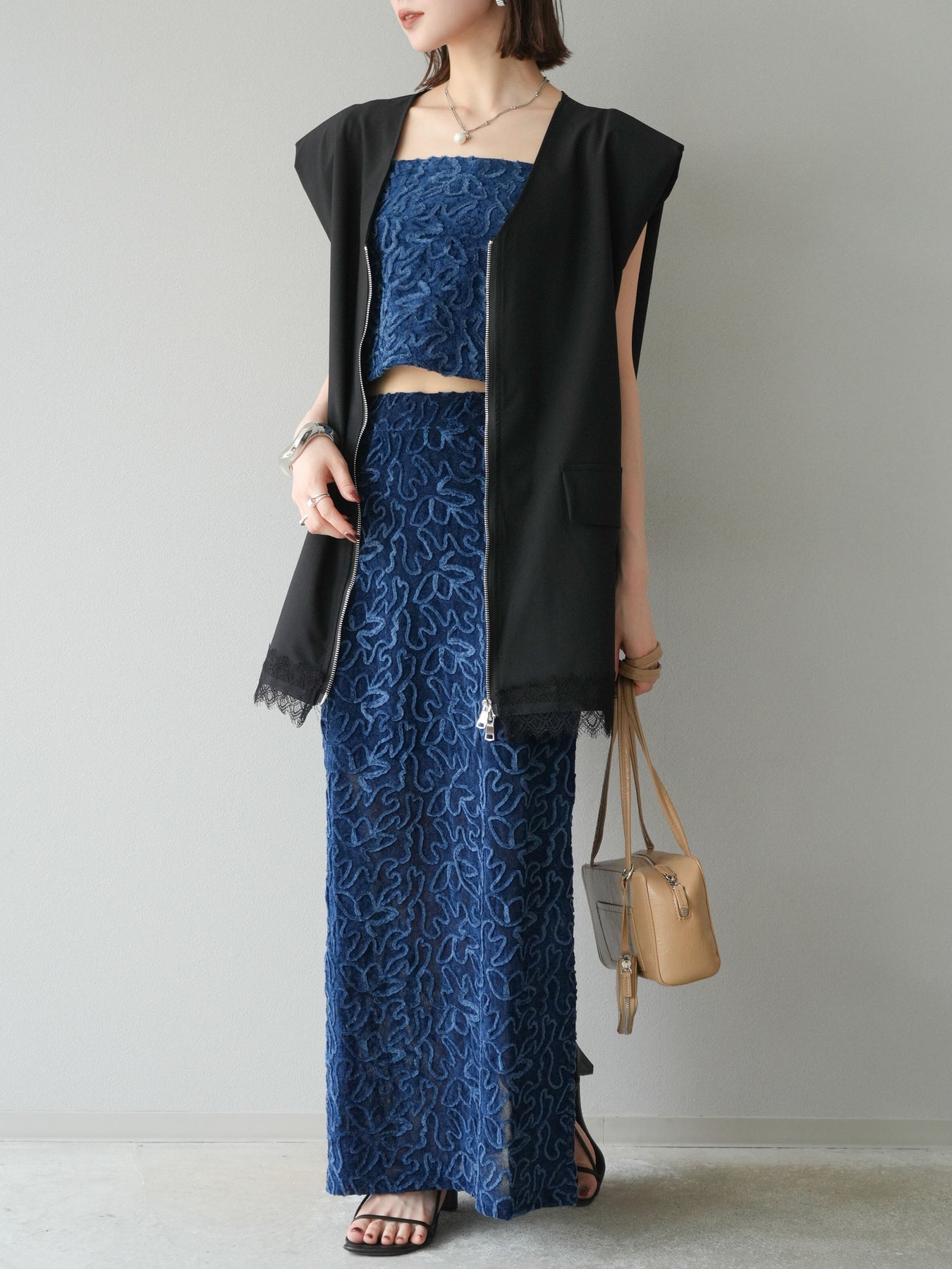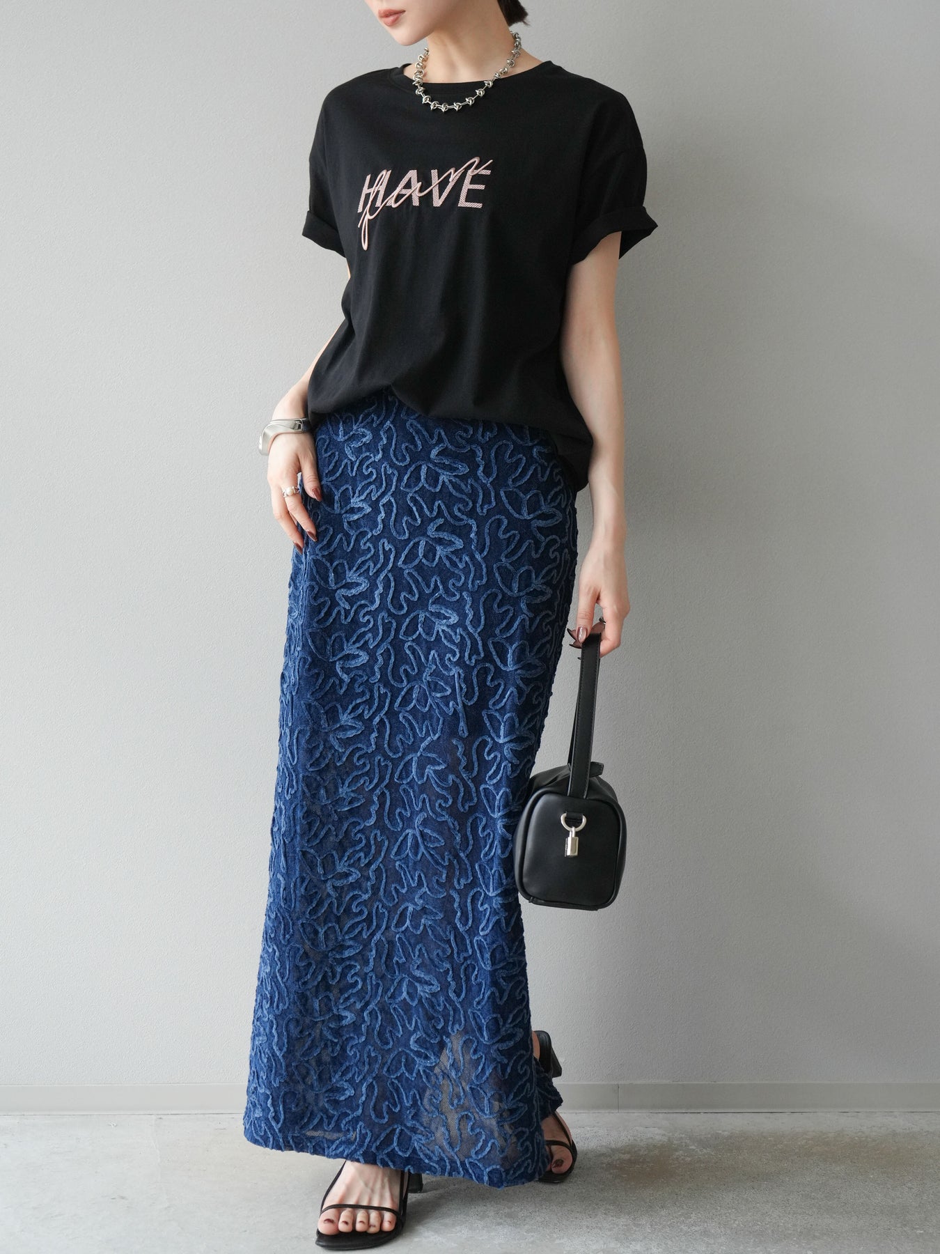 立体的なフラワー柄が印象的なシアーベロア素材のロングスカート。パイピング調の起毛デザインが存在感を放ち、コーディネートに奥行きをプラスします。裏地付きで透け感を抑えつつ、軽やかな抜け感を演出。すっきりとしたIラインシルエットが大人な印象で、トップスを選ばず幅広く活躍します。同素材のキャミソールとのセットアップスタイルもおすすめです。 ※ボトムス、キャミソール(インナー)以外の商品は一律でインナーは付属していません