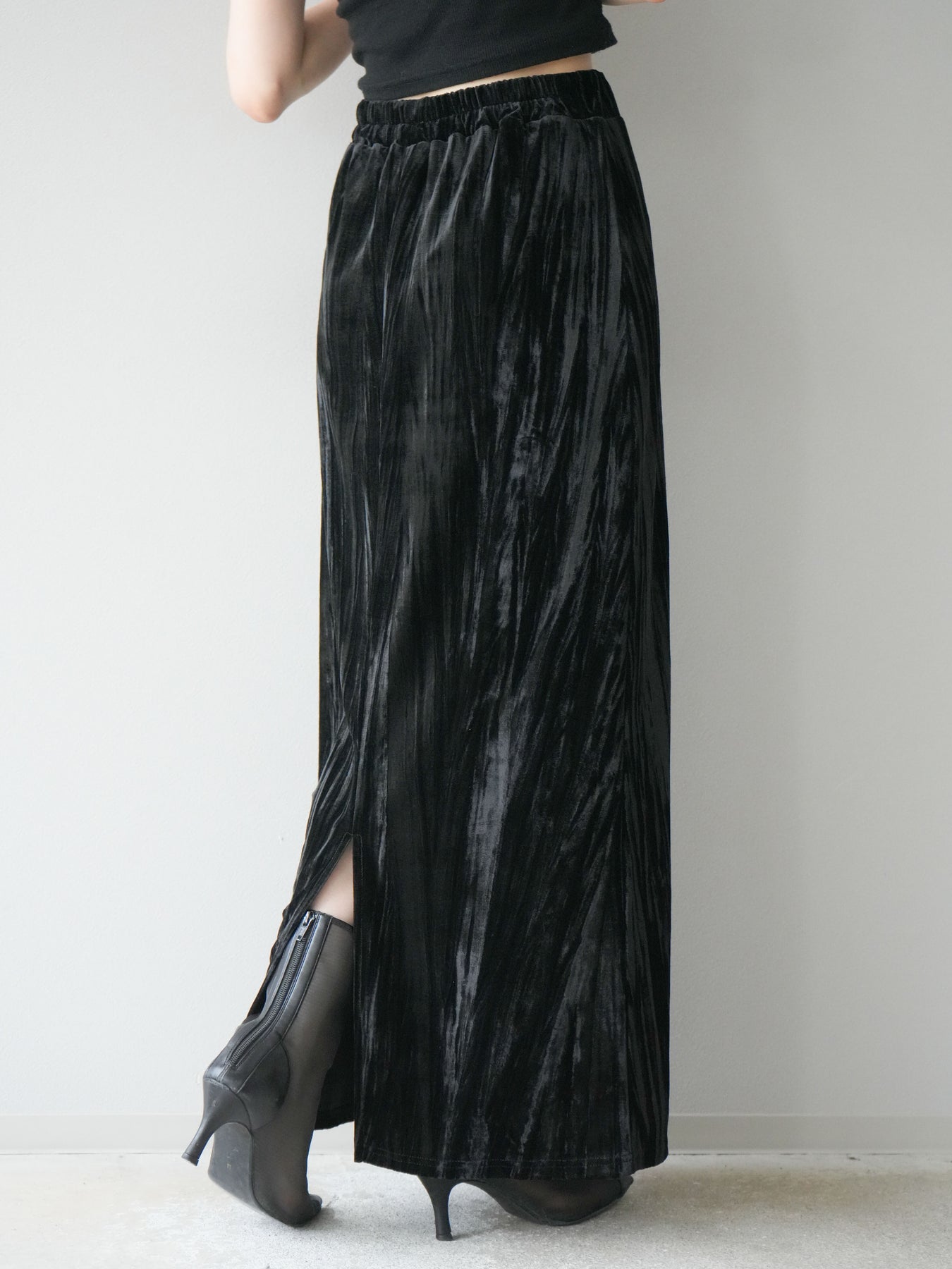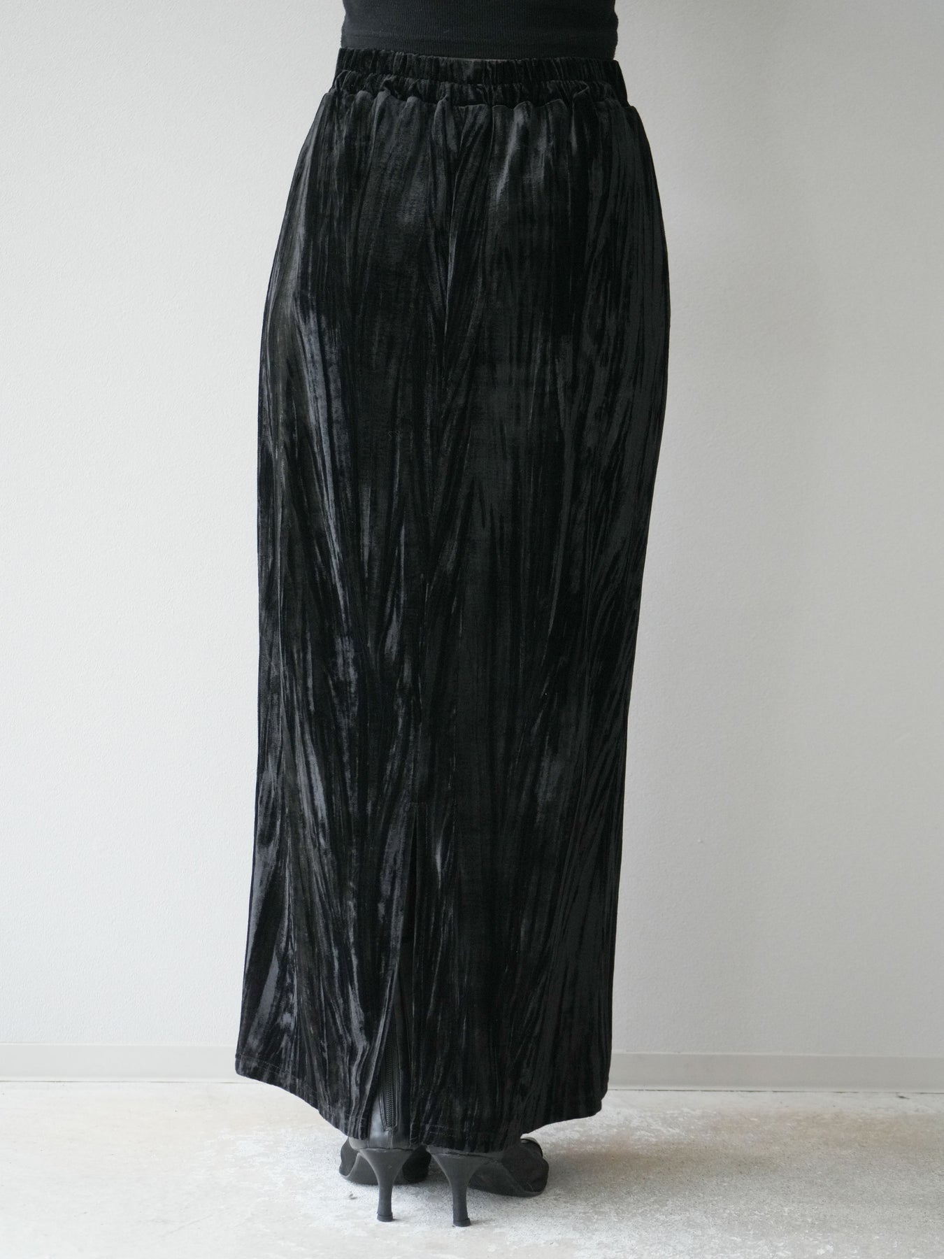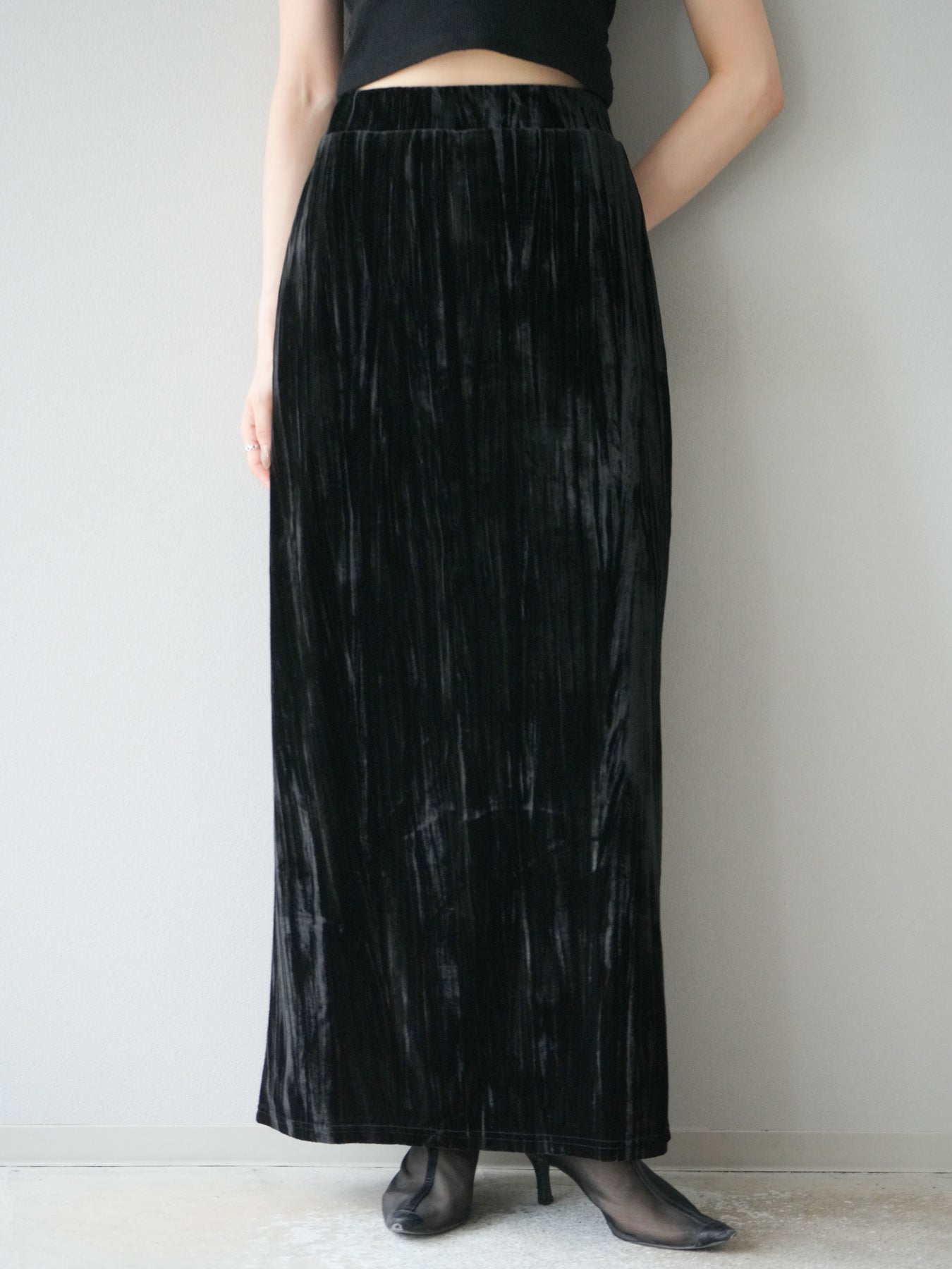 光沢感のあるクラッシュベロア素材を使用したナロースカート。縦のラインを強調するすっきりとしたシルエットで、スタイルアップ効果が期待できます。シンプルながら存在感があり、カジュアルからきれいめまで幅広く取り入れられるアイテムです。