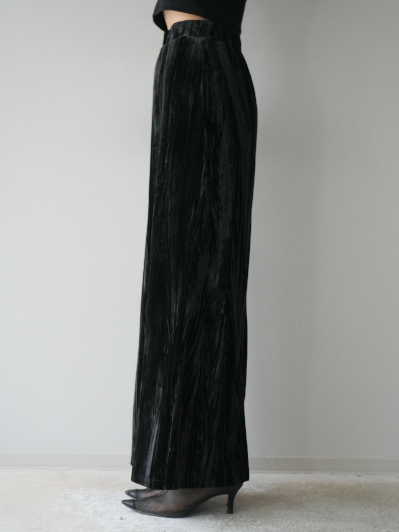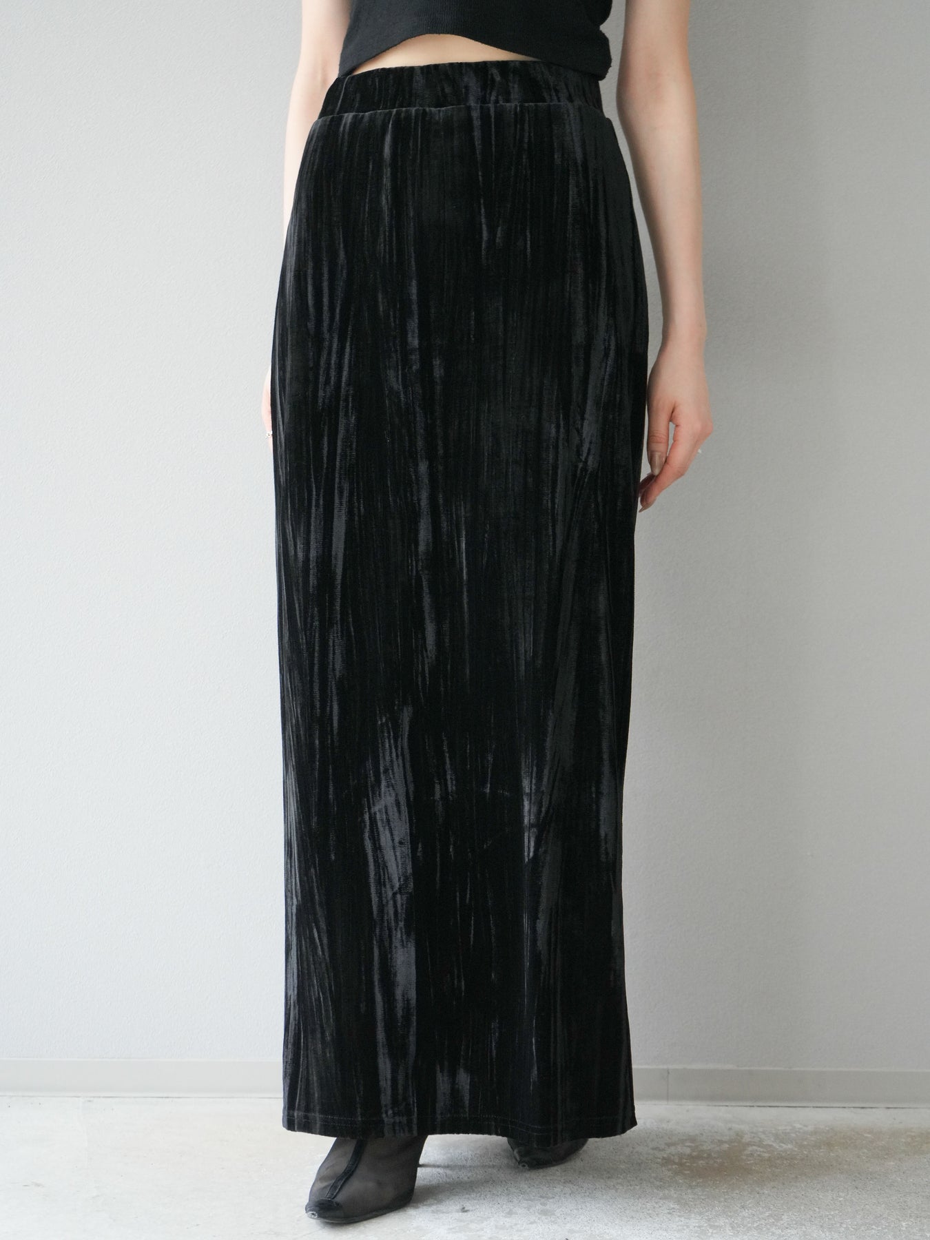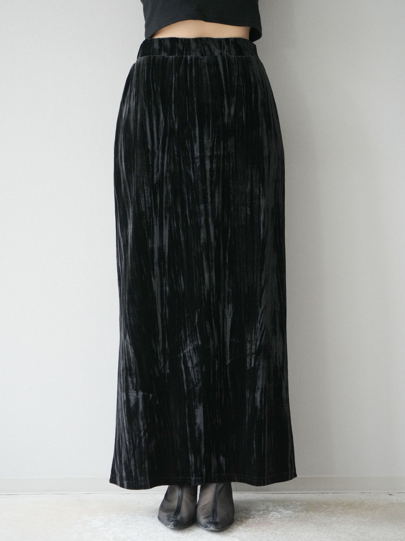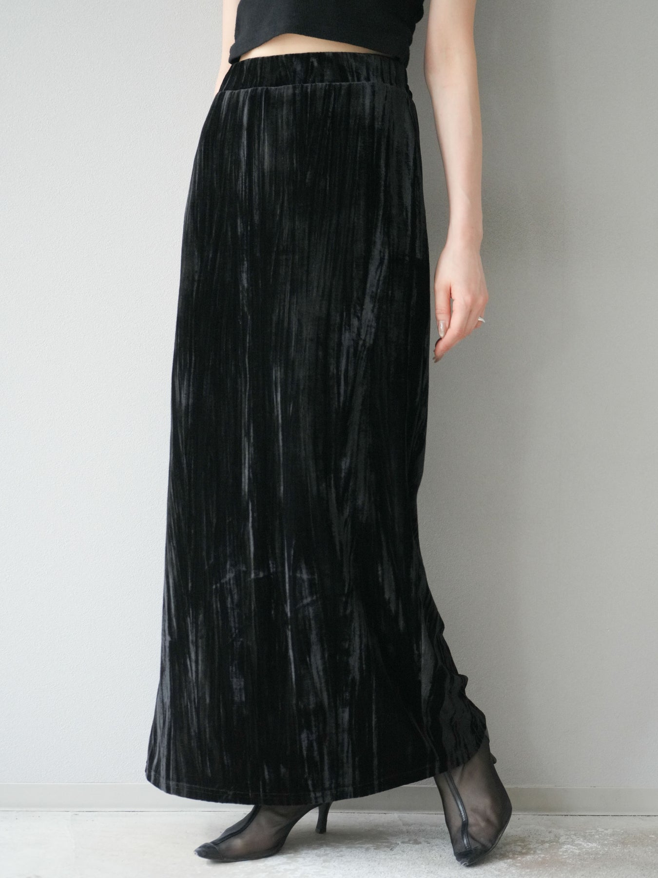光沢感のあるクラッシュベロア素材を使用したナロースカート。縦のラインを強調するすっきりとしたシルエットで、スタイルアップ効果が期待できます。シンプルながら存在感があり、カジュアルからきれいめまで幅広く取り入れられるアイテムです。