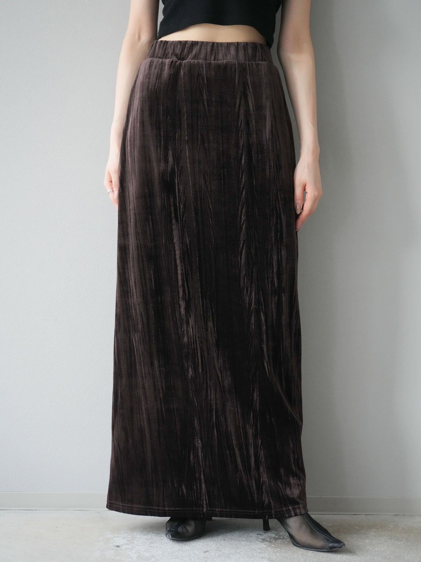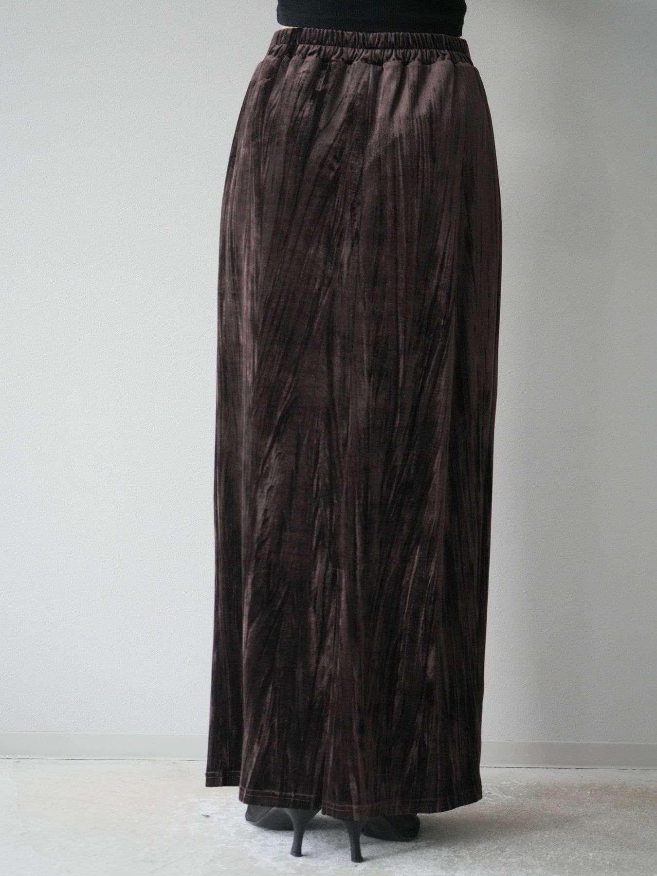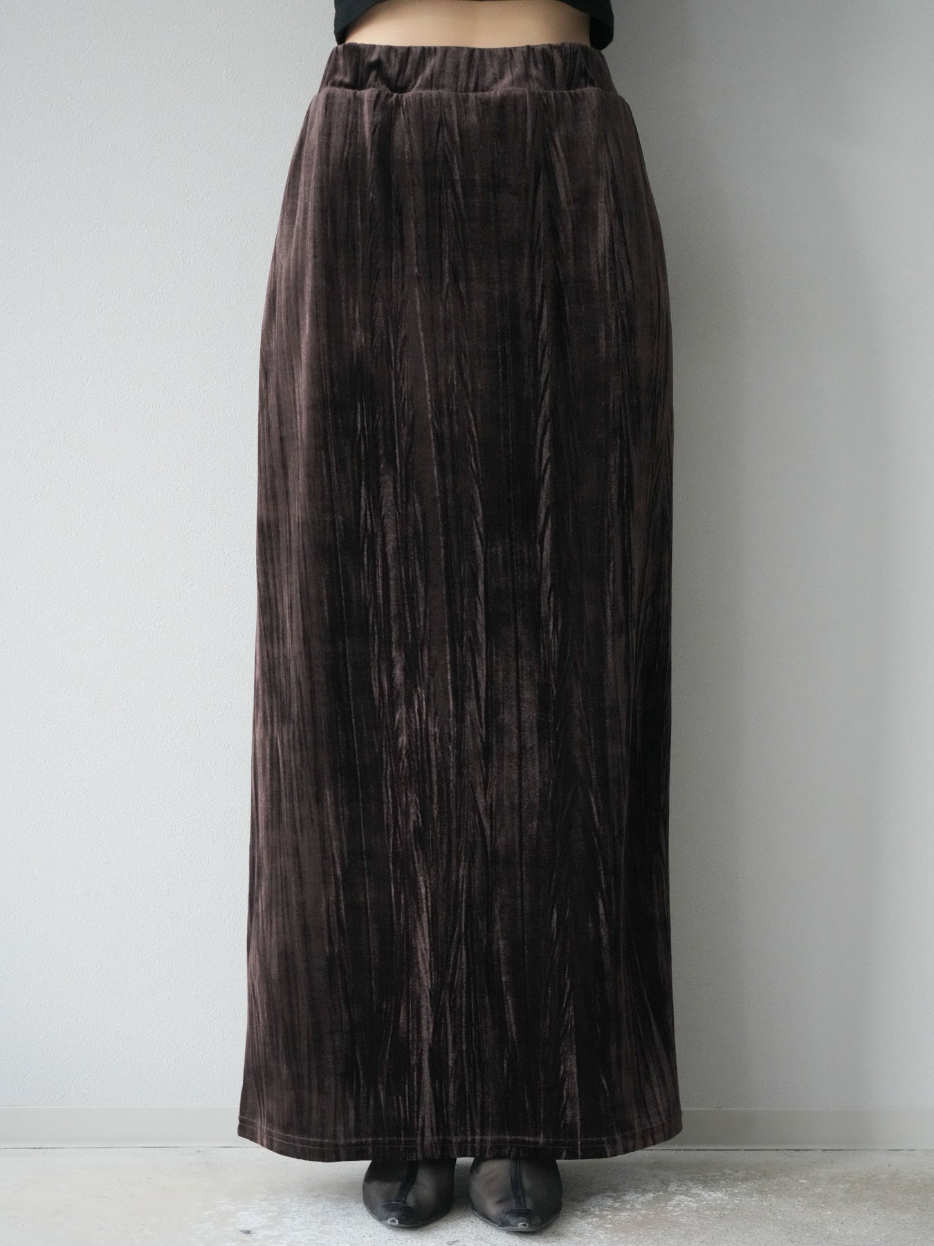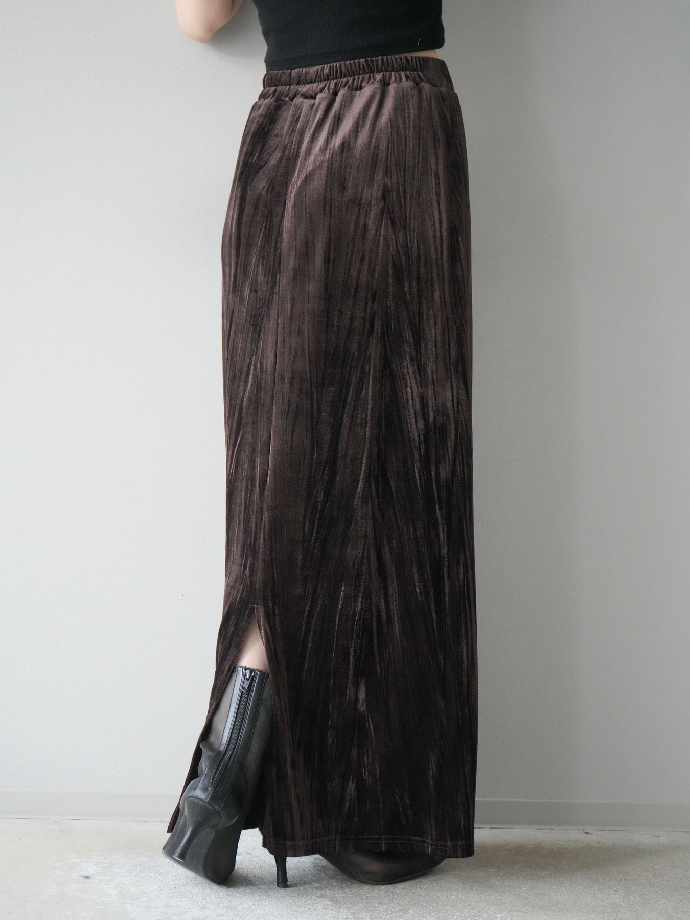 光沢感のあるクラッシュベロア素材を使用したナロースカート。縦のラインを強調するすっきりとしたシルエットで、スタイルアップ効果が期待できます。シンプルながら存在感があり、カジュアルからきれいめまで幅広く取り入れられるアイテムです。