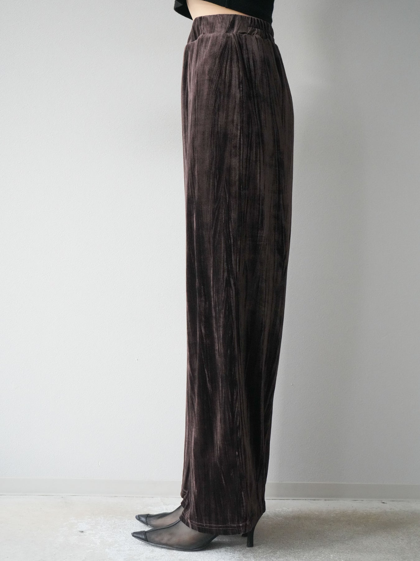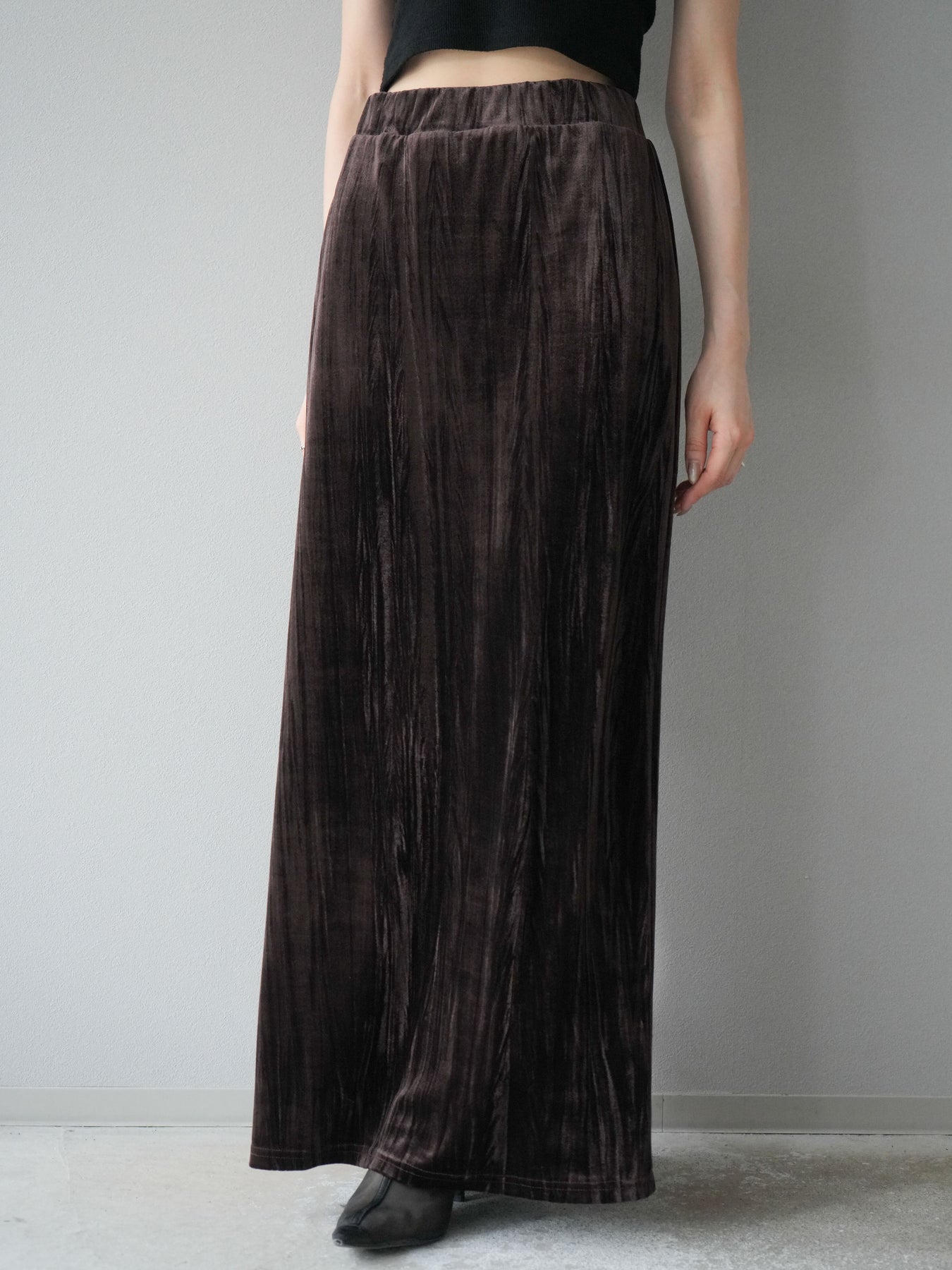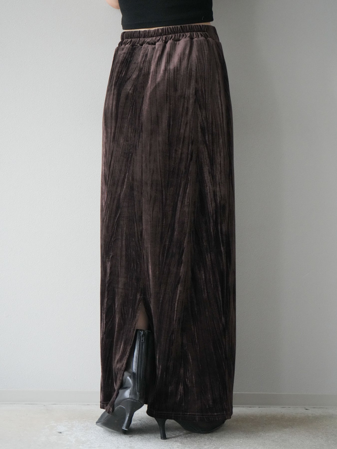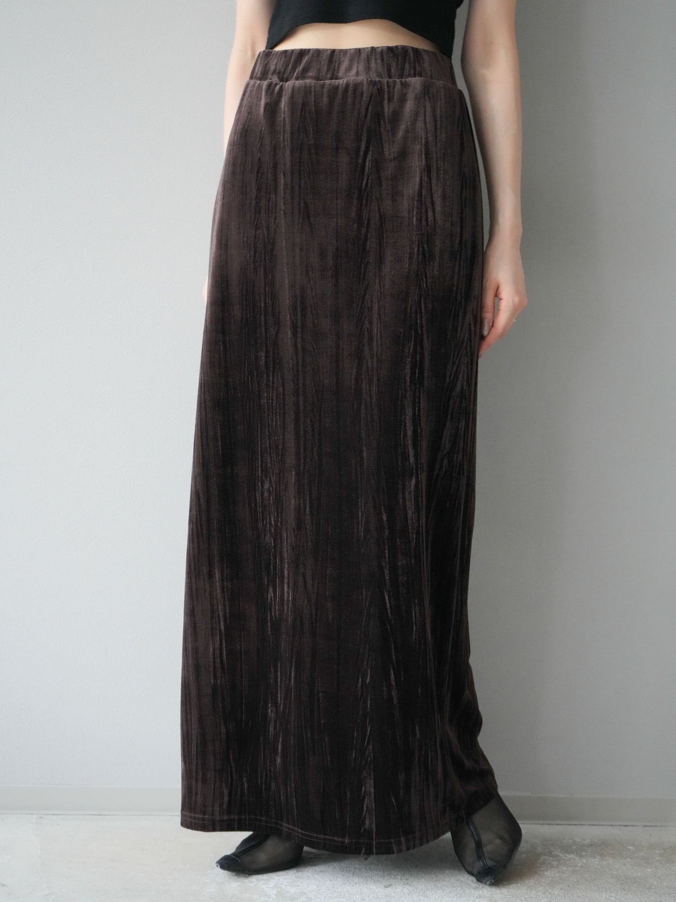 光沢感のあるクラッシュベロア素材を使用したナロースカート。縦のラインを強調するすっきりとしたシルエットで、スタイルアップ効果が期待できます。シンプルながら存在感があり、カジュアルからきれいめまで幅広く取り入れられるアイテムです。