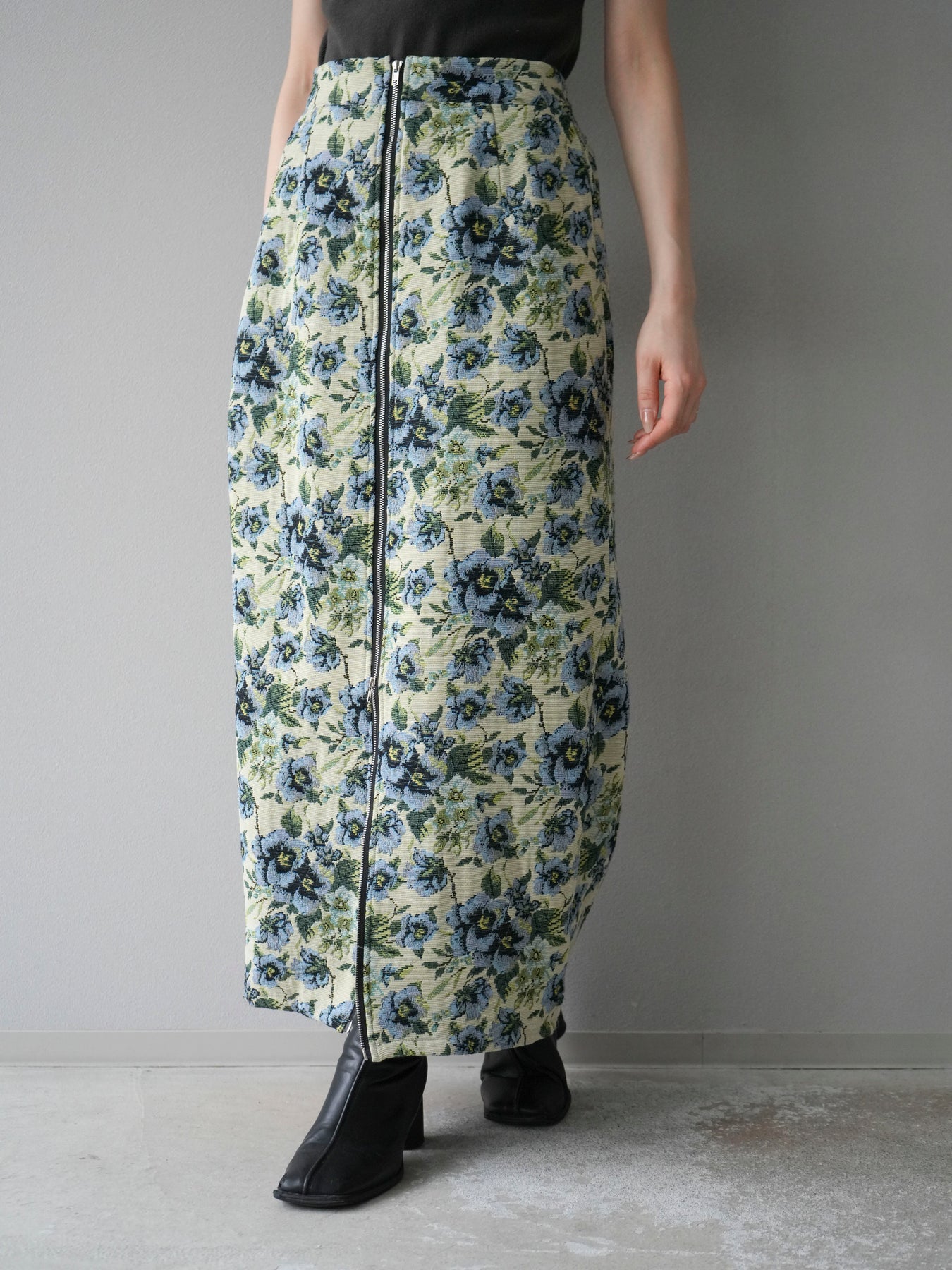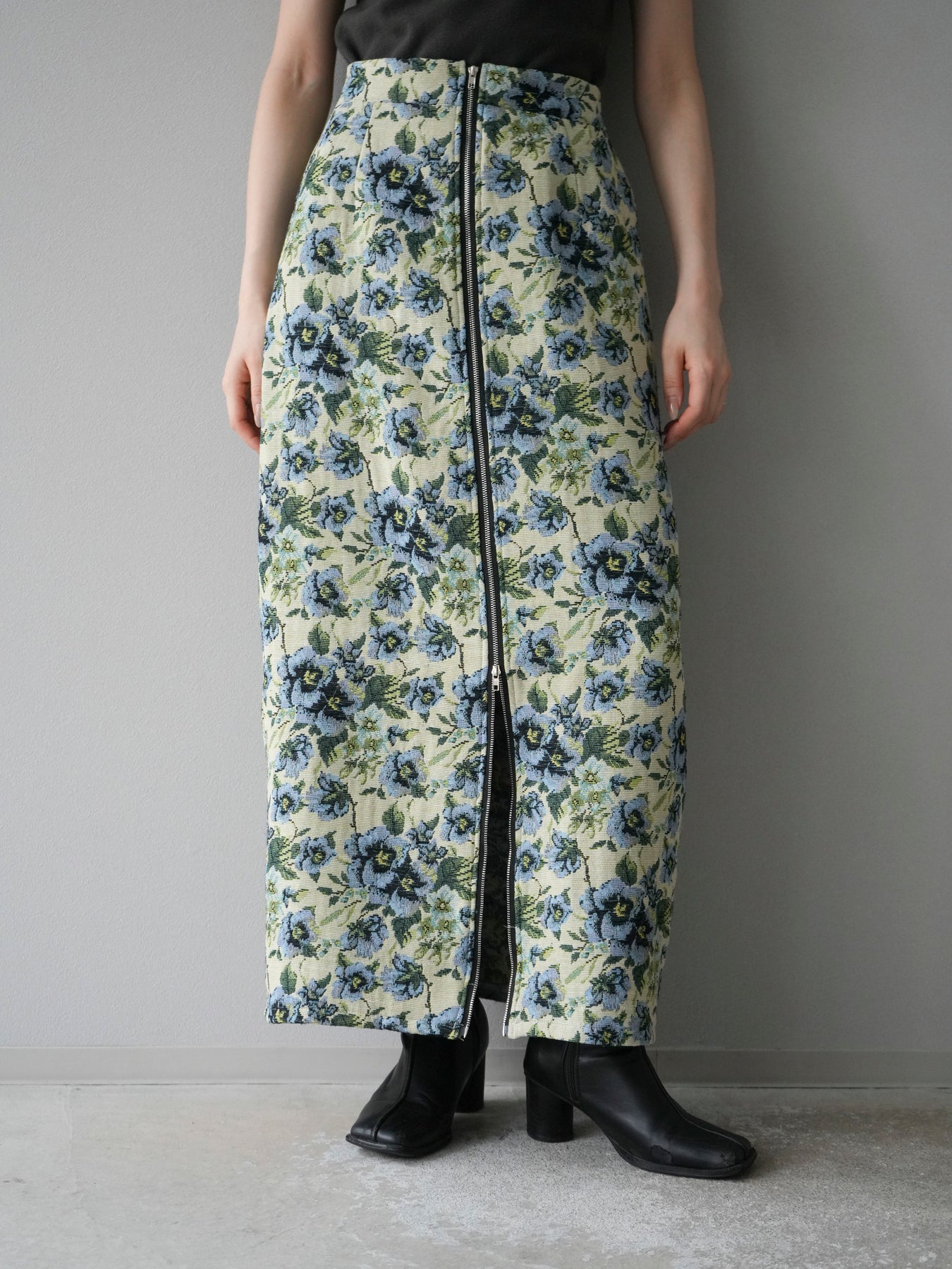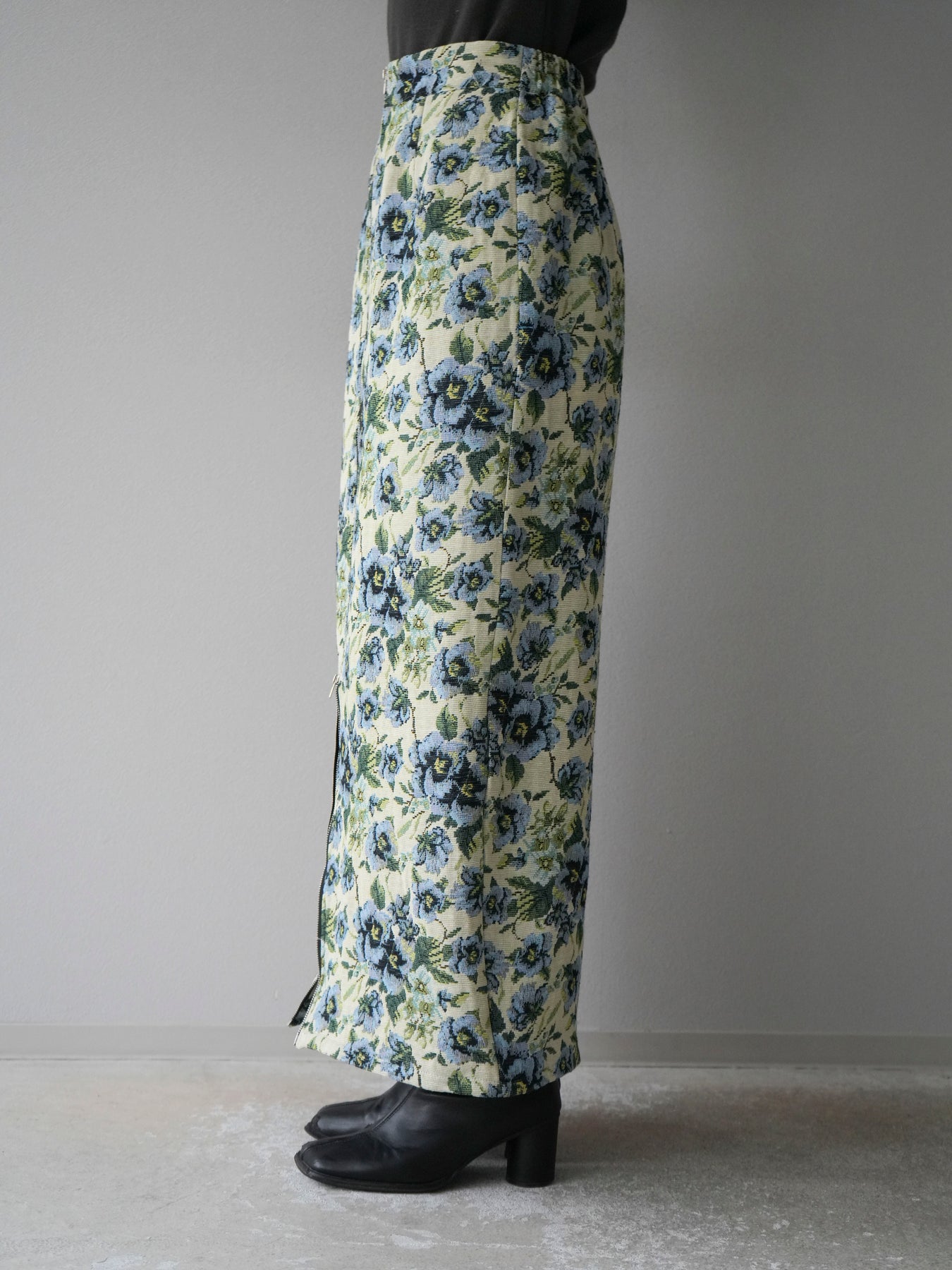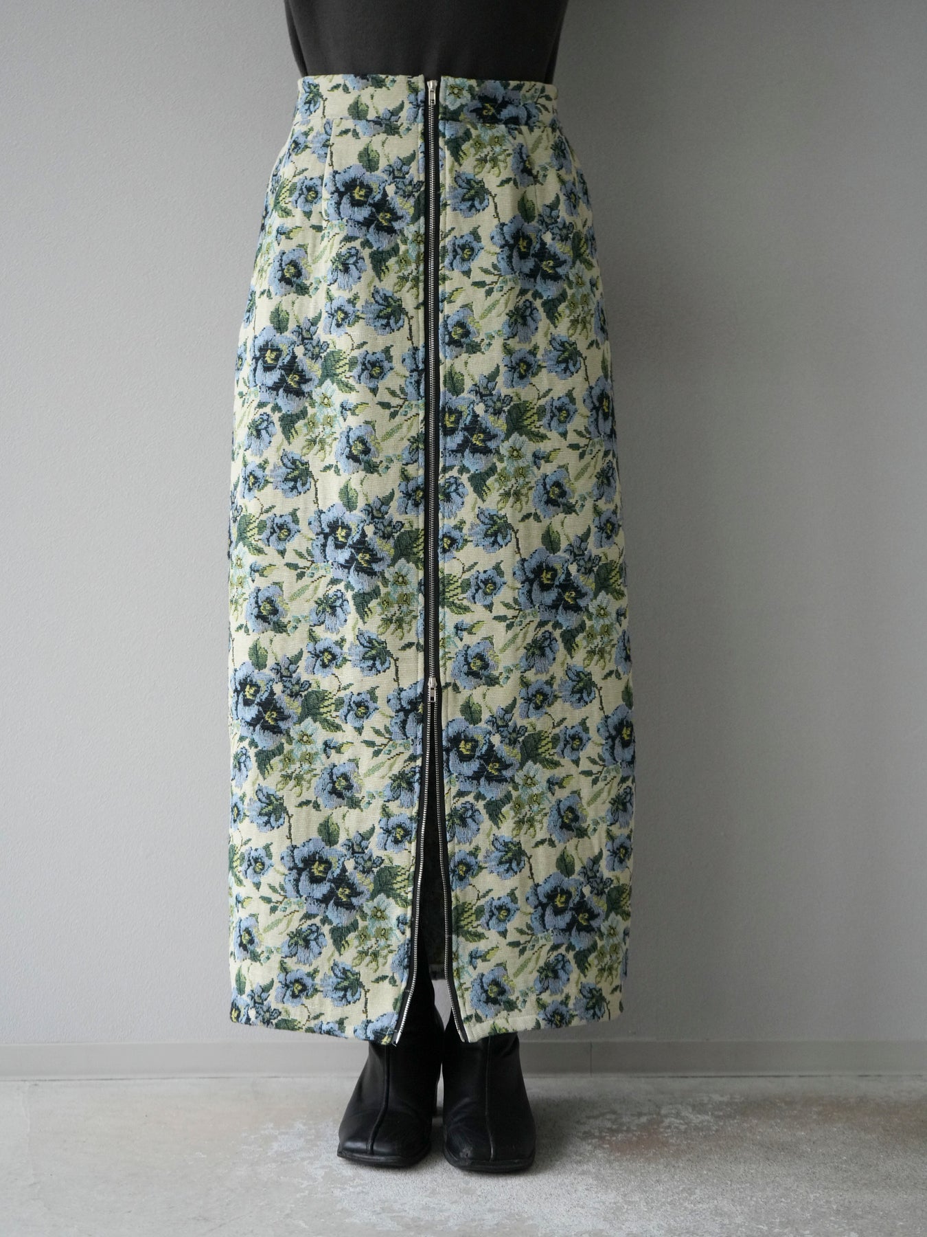 重厚感のあるゴブラン織りで仕立てたフロントジップタイトスカート。クラシカルなフラワーパターンが存在感を放ち、スタイリングに華やかさとヴィンテージライクな雰囲気をプラスします。フロントに施したジップディテールがモードなアクセントとなり、スリットの開き具合を調整して抜け感を演出できるのも魅力。タイトなシルエットながらも程よいストレッチ性があり、動きやすさと美しいラインを両立しています。シンプルなトップスを合わせるだけでコーディネートが完成する、主役級の一枚です。