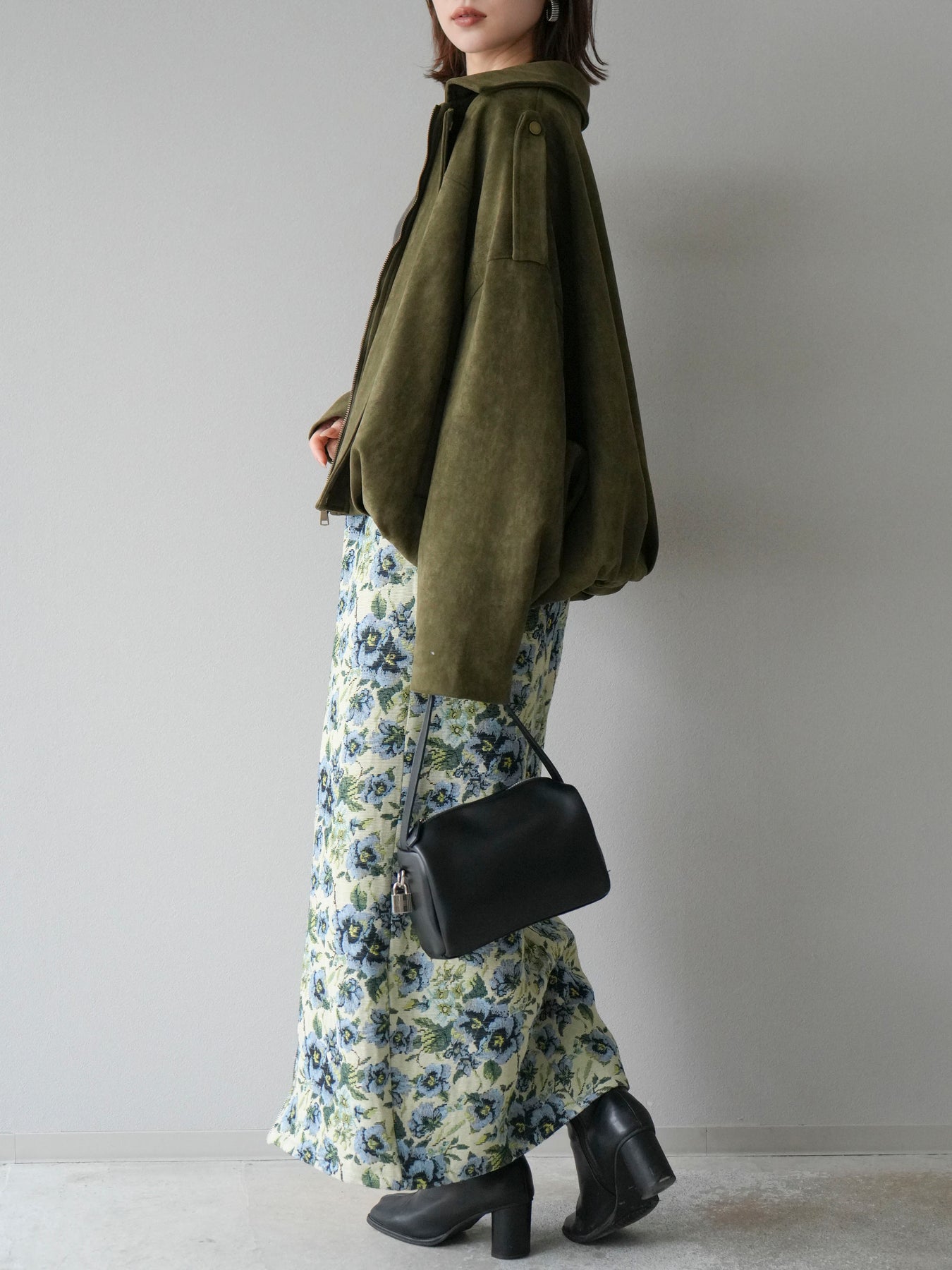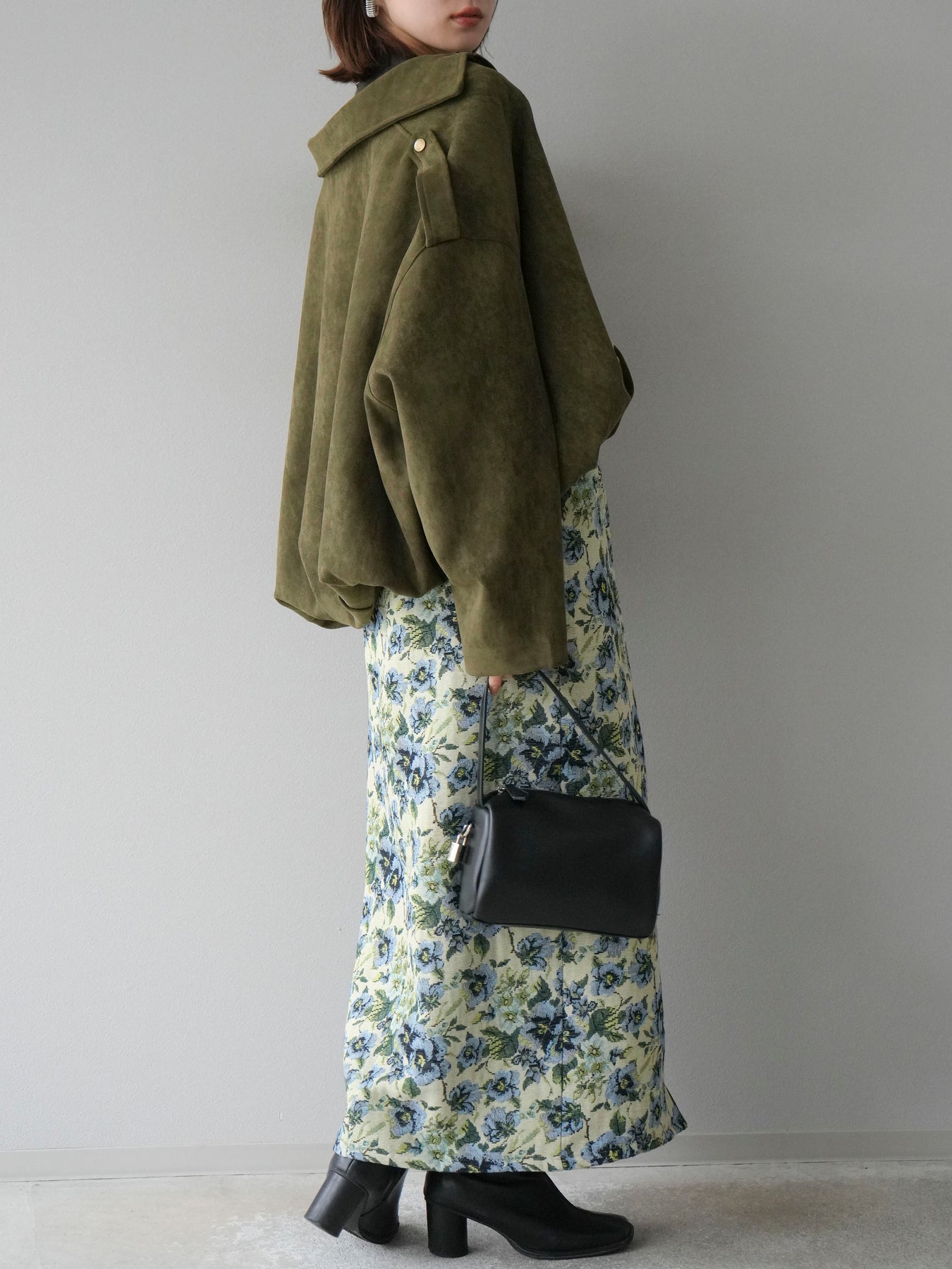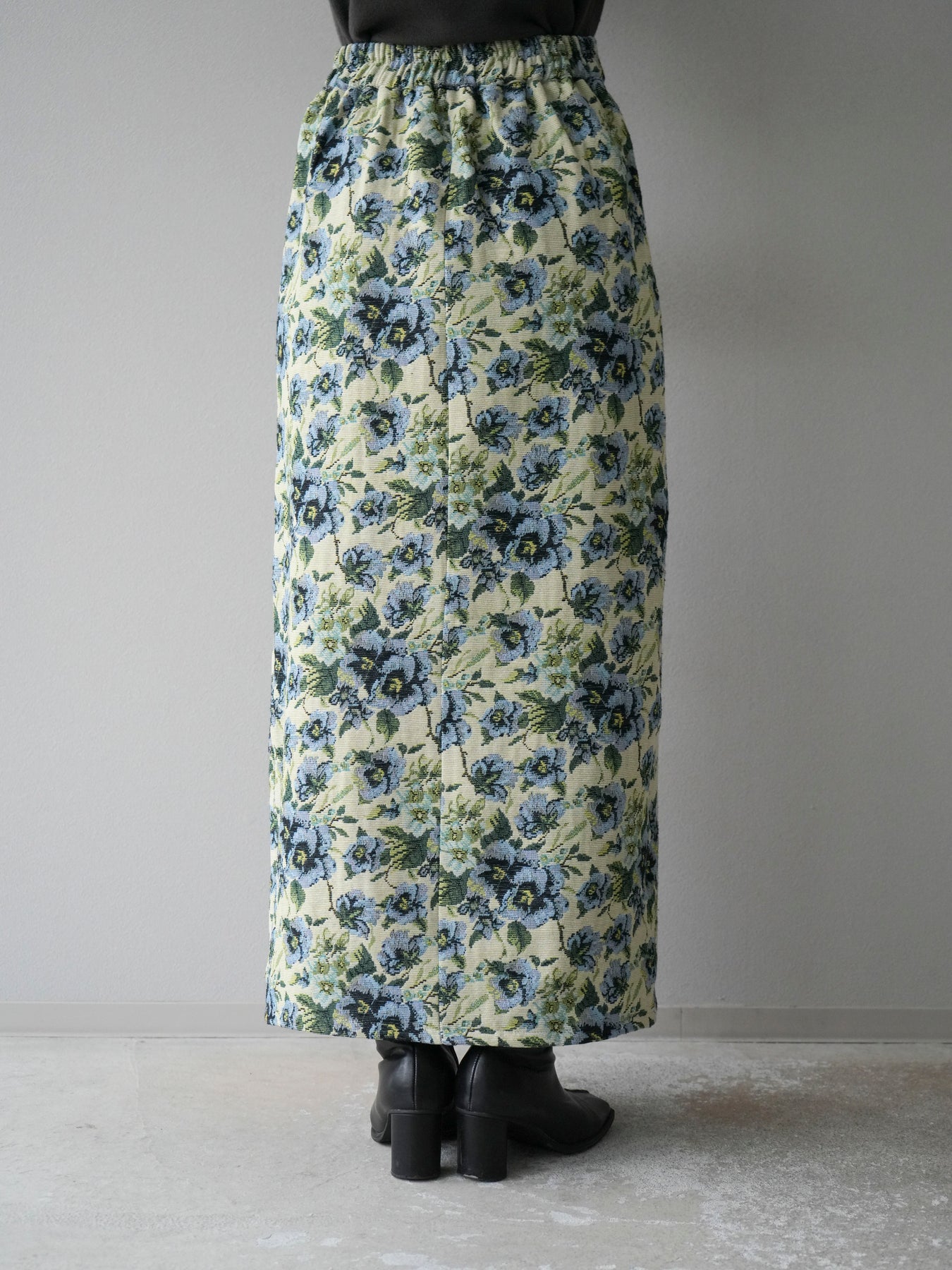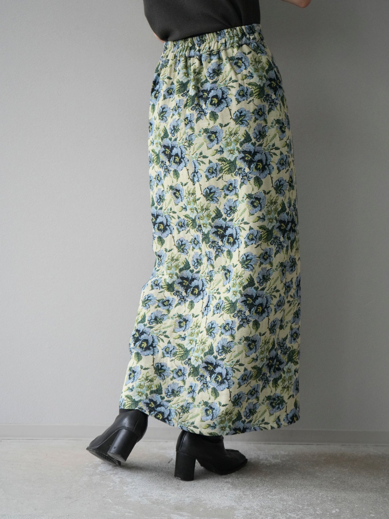 重厚感のあるゴブラン織りで仕立てたフロントジップタイトスカート。クラシカルなフラワーパターンが存在感を放ち、スタイリングに華やかさとヴィンテージライクな雰囲気をプラスします。フロントに施したジップディテールがモードなアクセントとなり、スリットの開き具合を調整して抜け感を演出できるのも魅力。タイトなシルエットながらも程よいストレッチ性があり、動きやすさと美しいラインを両立しています。シンプルなトップスを合わせるだけでコーディネートが完成する、主役級の一枚です。
